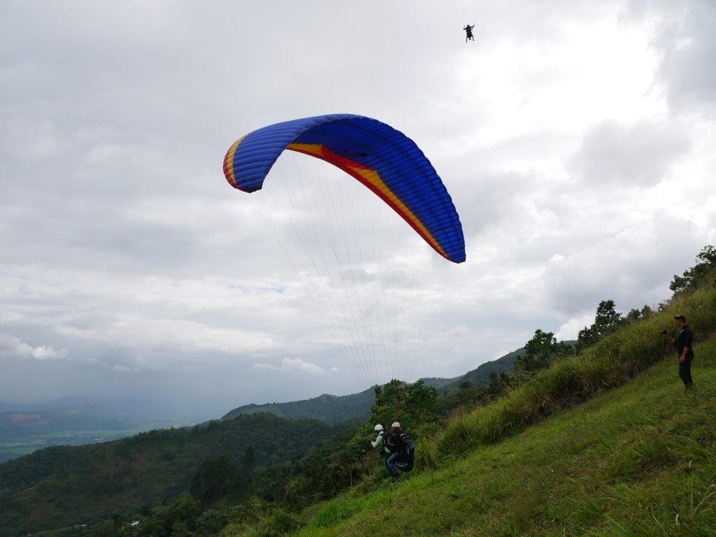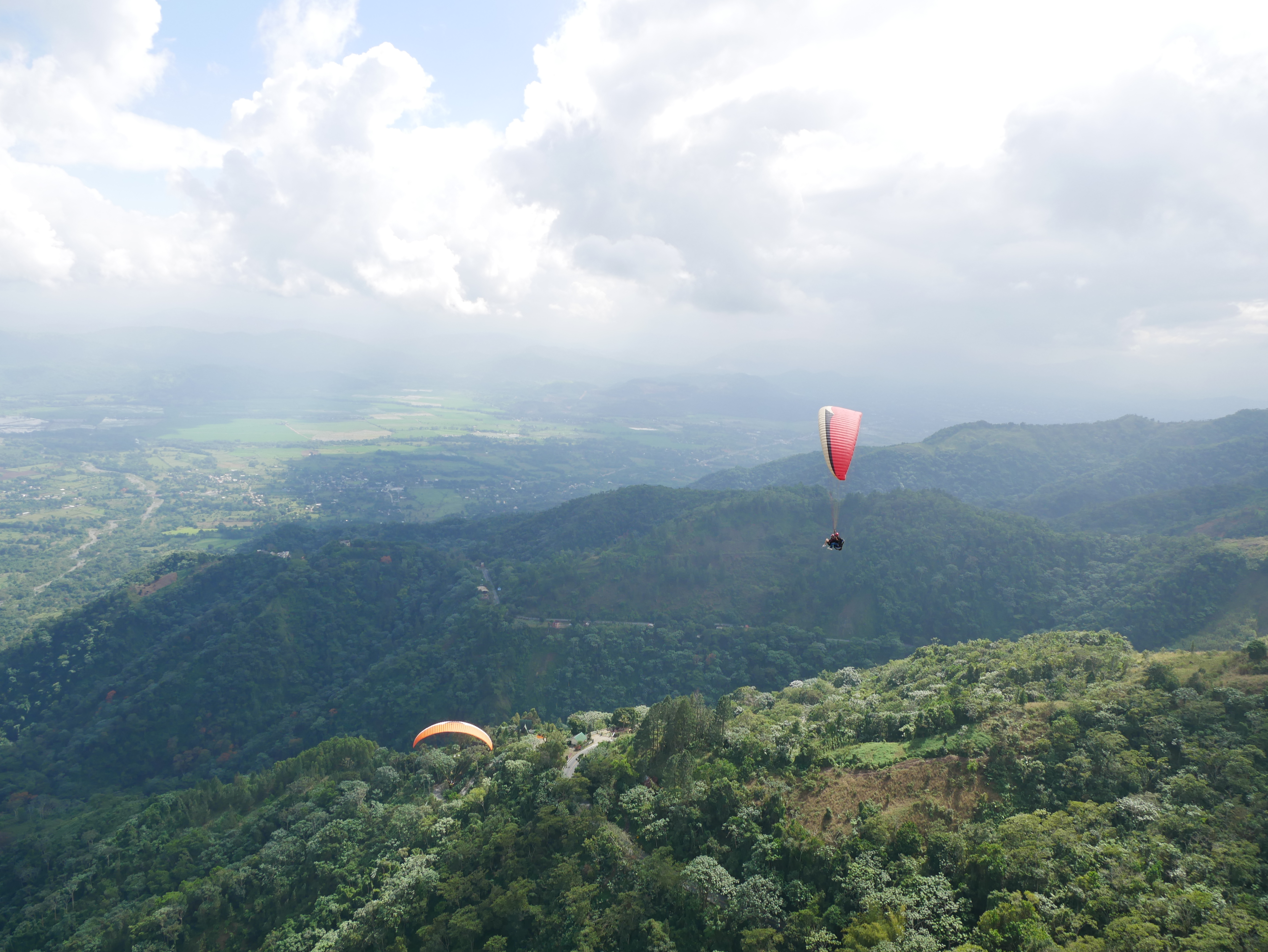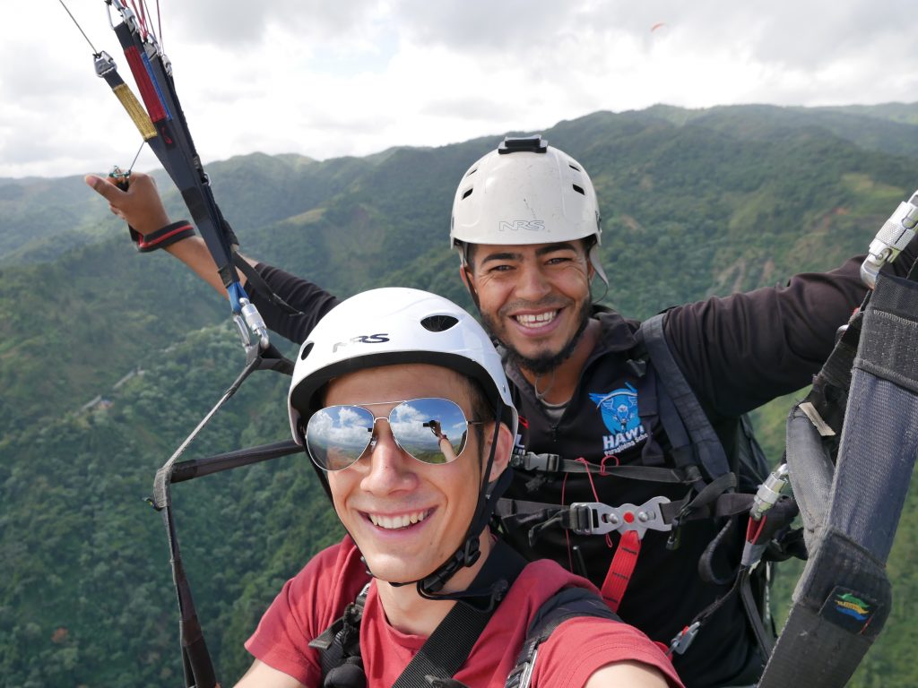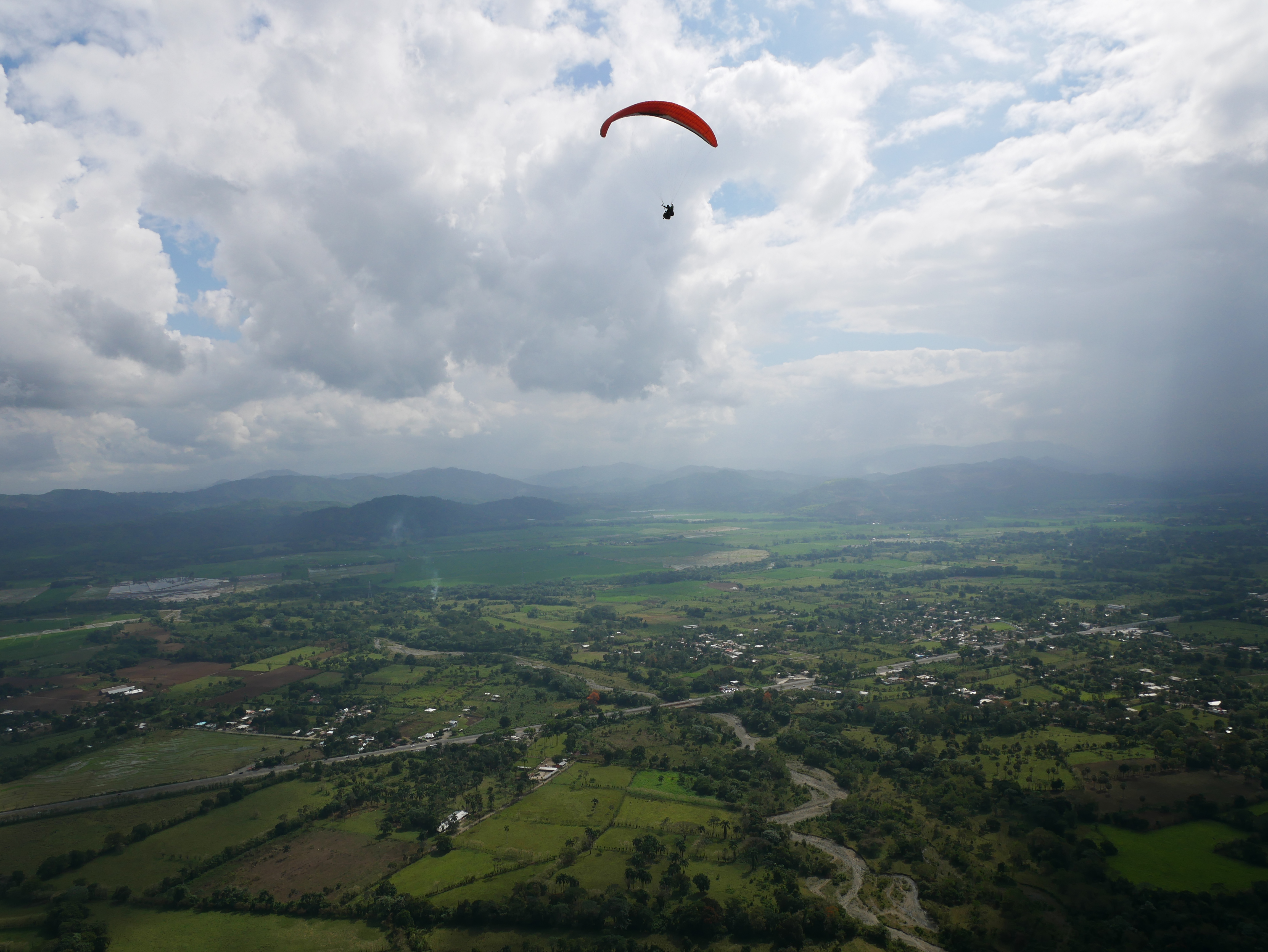 Heute waren wir in den Bergen Paragliden. Für nur 60 US-Dollar kann man in Jarabacoa einen Tandemflug buchen. Das war eine sehr spannende Erfahrung für mich. Schon allein das Starten war aufregend. Man rennt einfach einen sehr steilen Hang hinab, und schon nach wenigen Metern wird man vom Gleitschirm in die Höhe gehoben. Wir sind ein paar Minuten lang in einem Tal gekreist, vom Aufwind immer wieder in die Höhe gezogen, und danach dem Tal folgend ins Flachland geflogen, um zu landen.