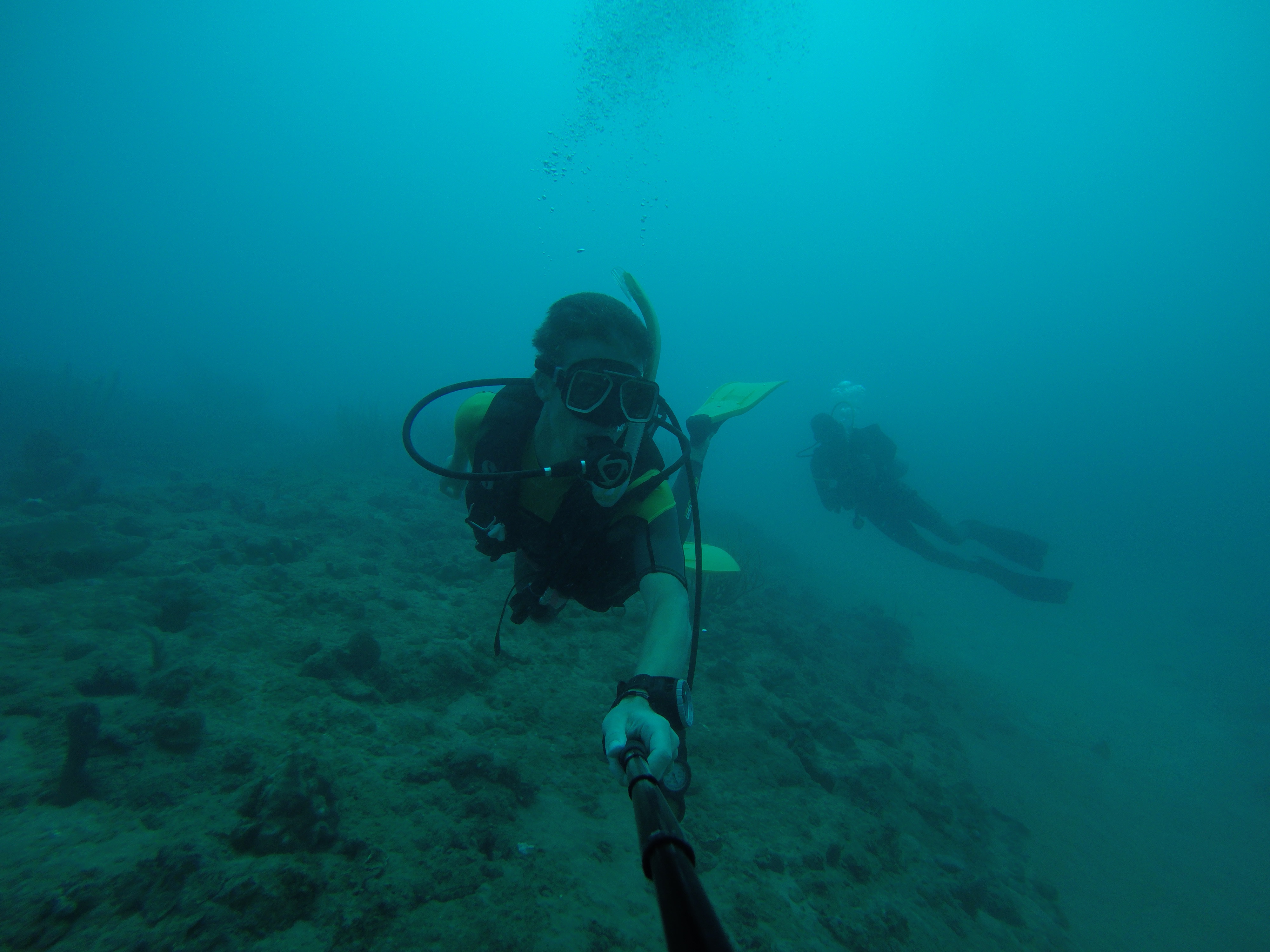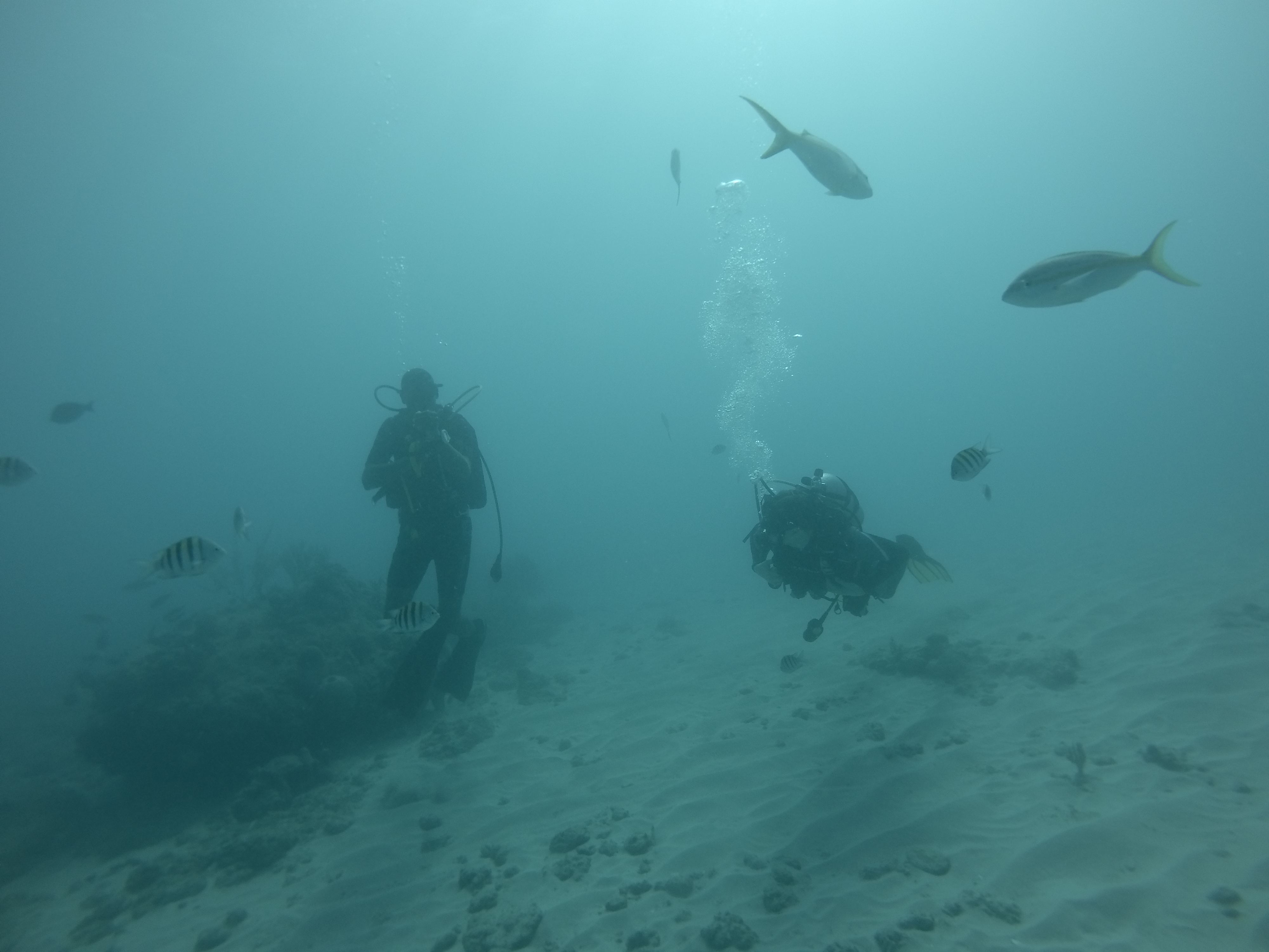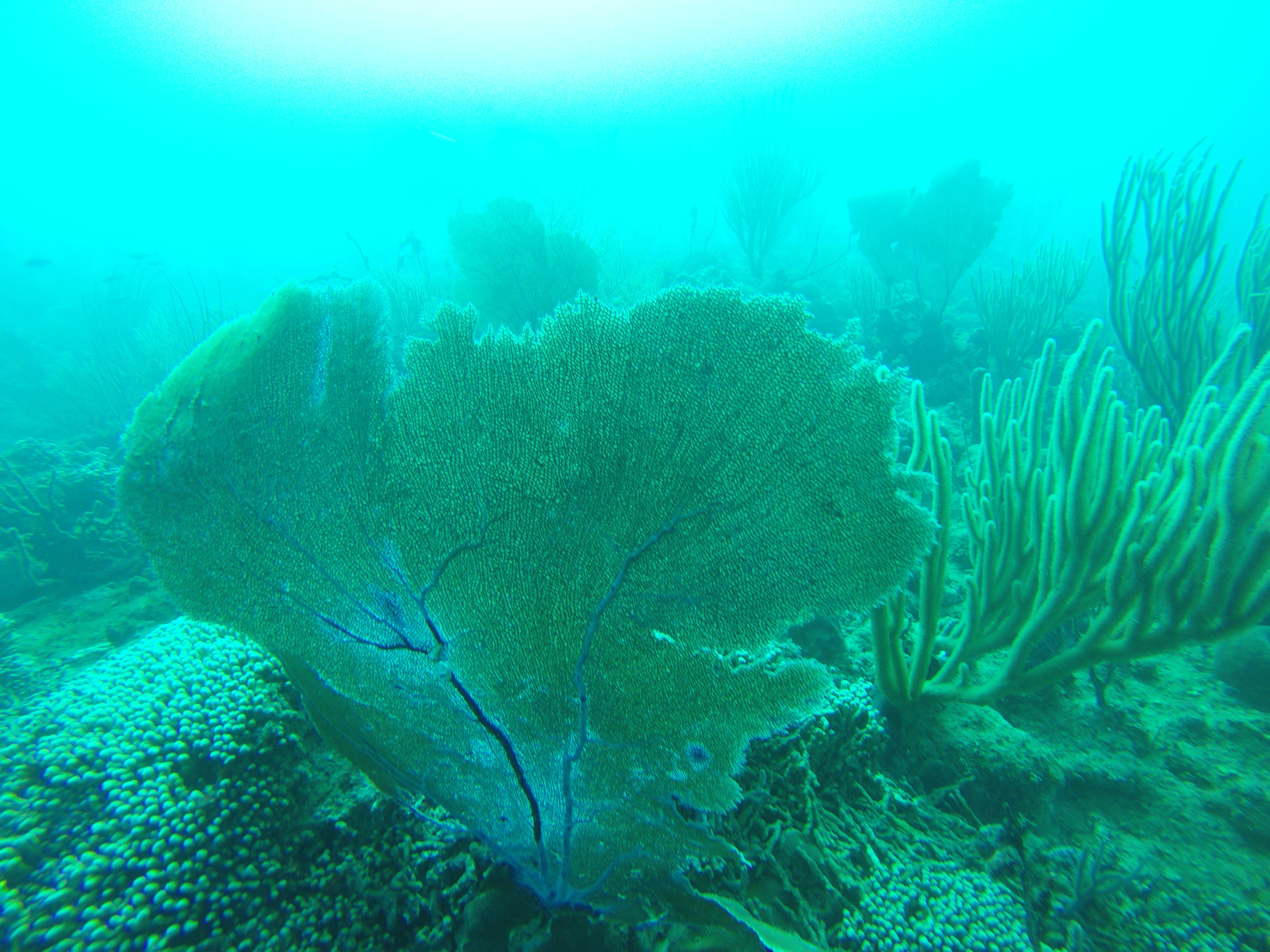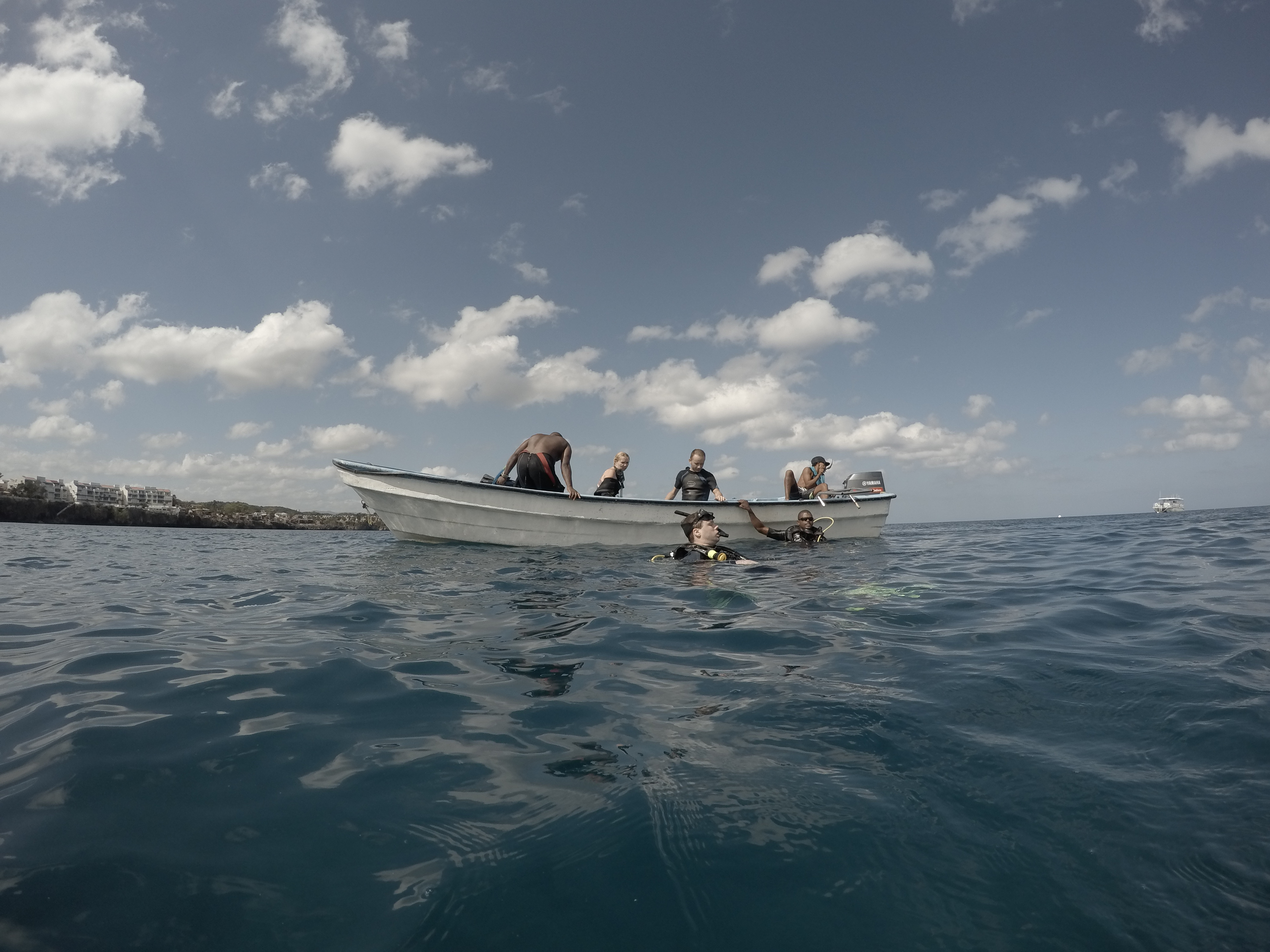 Mein Hauptgrund, nach Puerto Plata zu gehen, waren nicht die Wasserfälle, sondern das Tauchen. Bei einer ortsansässigen Tauchschule habe ich den PADI Advanced Open Water Diver absolviert. Dieser Kurs vertieft noch viele wichtige Fähigkeiten, und baut damit direkt auf dem PADI Open Water Diver auf, den ich in Exmouth in Australien abgeschlossen habe. Vorgegebene Schwerpunkte sind Deep Diving, um die Tauchtiefe von 18 Meter auf 40 Meter zu steigern, sowie Unterwassernavigation. Weitere Schwerpunkte kann man sich selbst setzen. Ich habe diesbezüglich noch Training zum Ausgleich des Auftriebs (Buoyancy) erhalten, verschiedenes über Fischbeobachtung und -einordnung gelernt (Fishidentification) und außerdem Tauchen bei Nacht (Night Dive) trainiert. Mit diesen fünf Schwerpunkten sind wir drei Tage in Folge von Puerto Plata nach Sosua gefahren, um dort zu tauchen. Die karibische Unterwasserwelt hat mir sehr gefallen. Es gab sehr viele bunte Fische, die ich teilweise schon aus Australien kannte, aber auch eine Menge sehr interessante, für mich neue Arten. Es gibt nicht so viele Korallen, aber dafür sehr viele schöne Wasserpflanzen und Schwämme.
