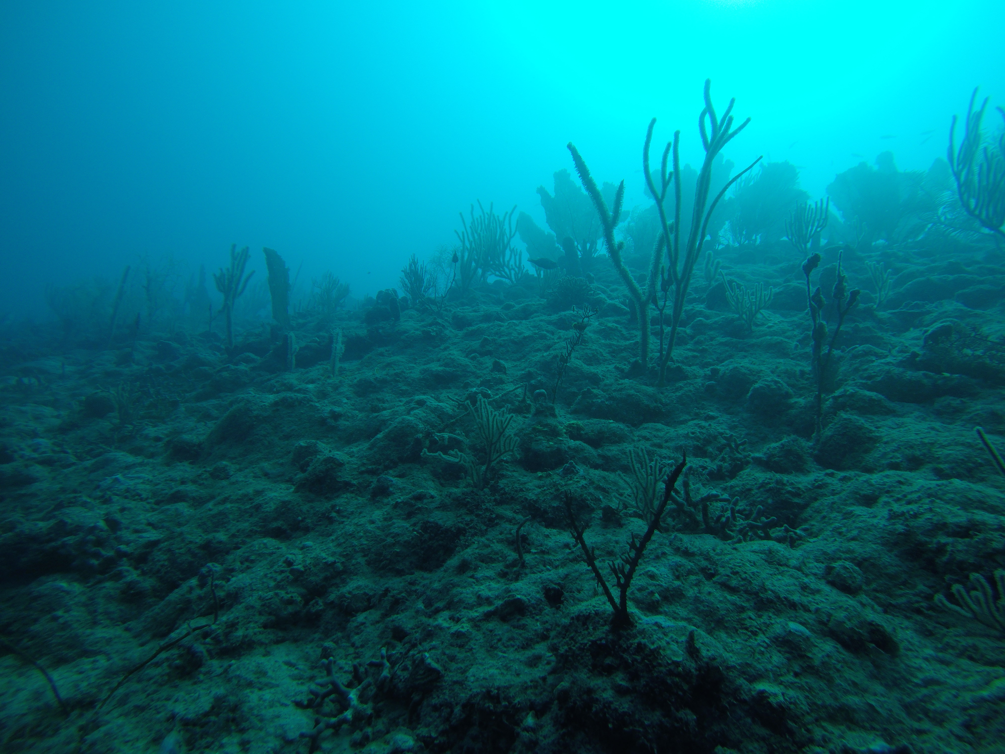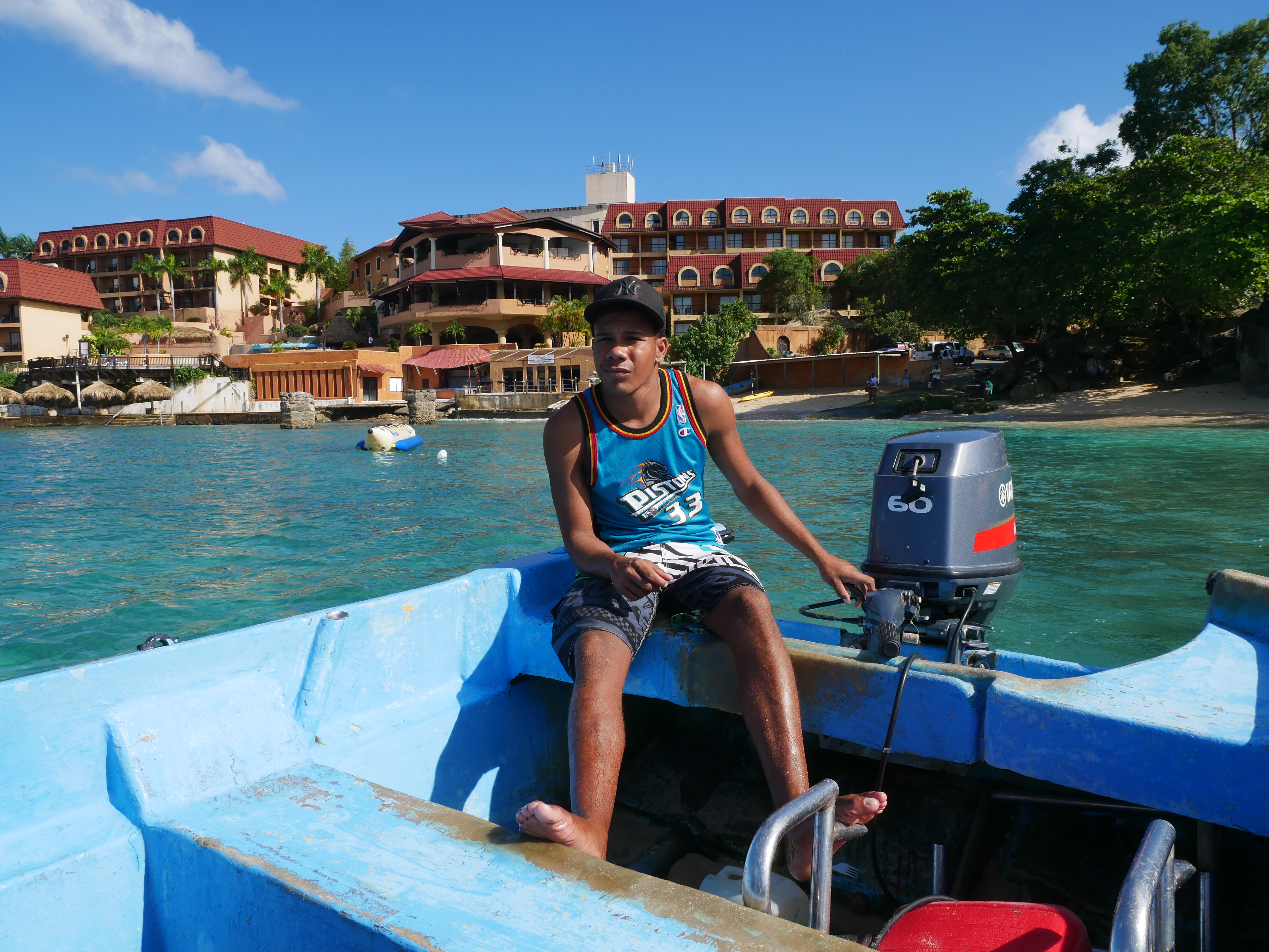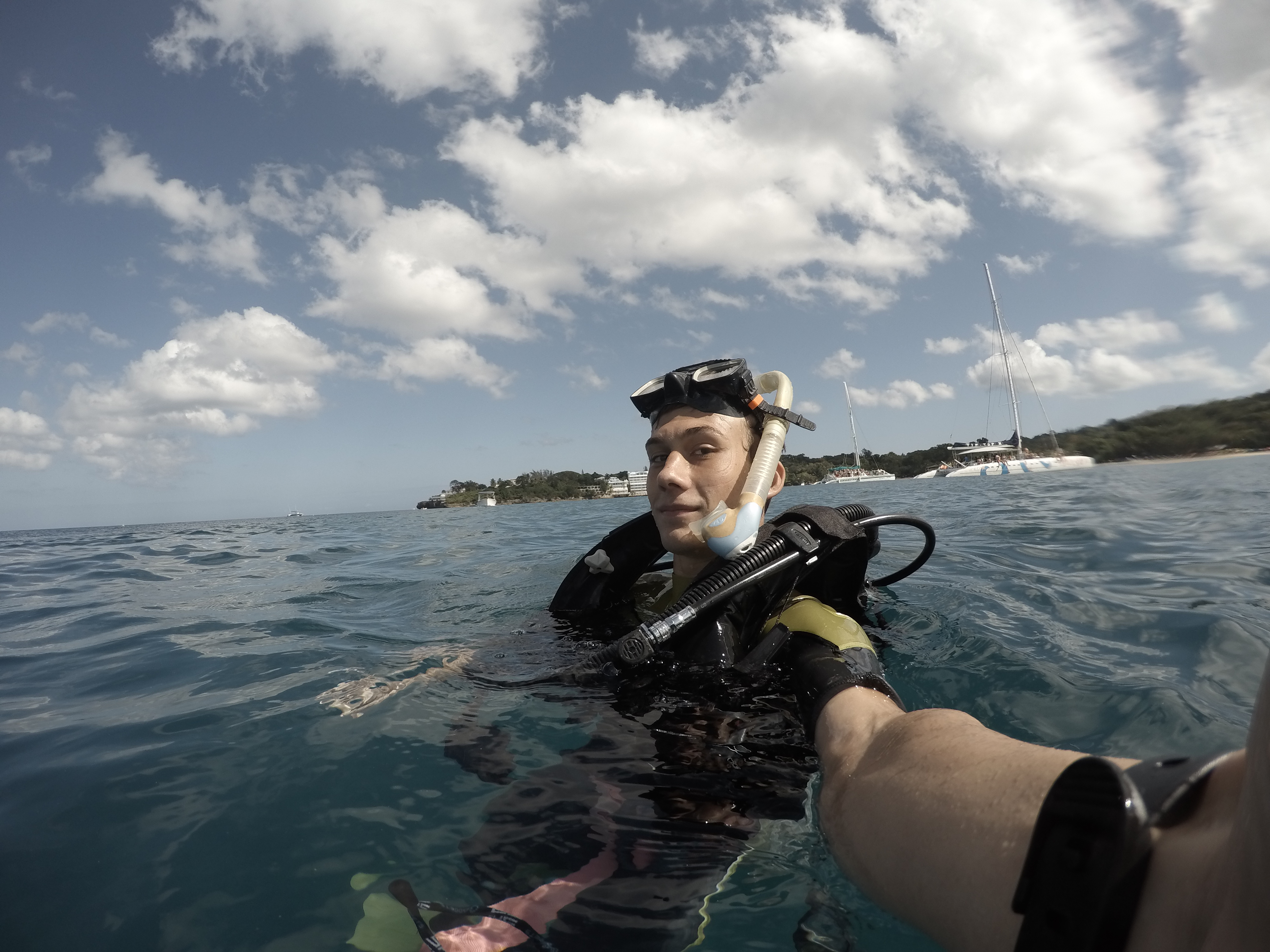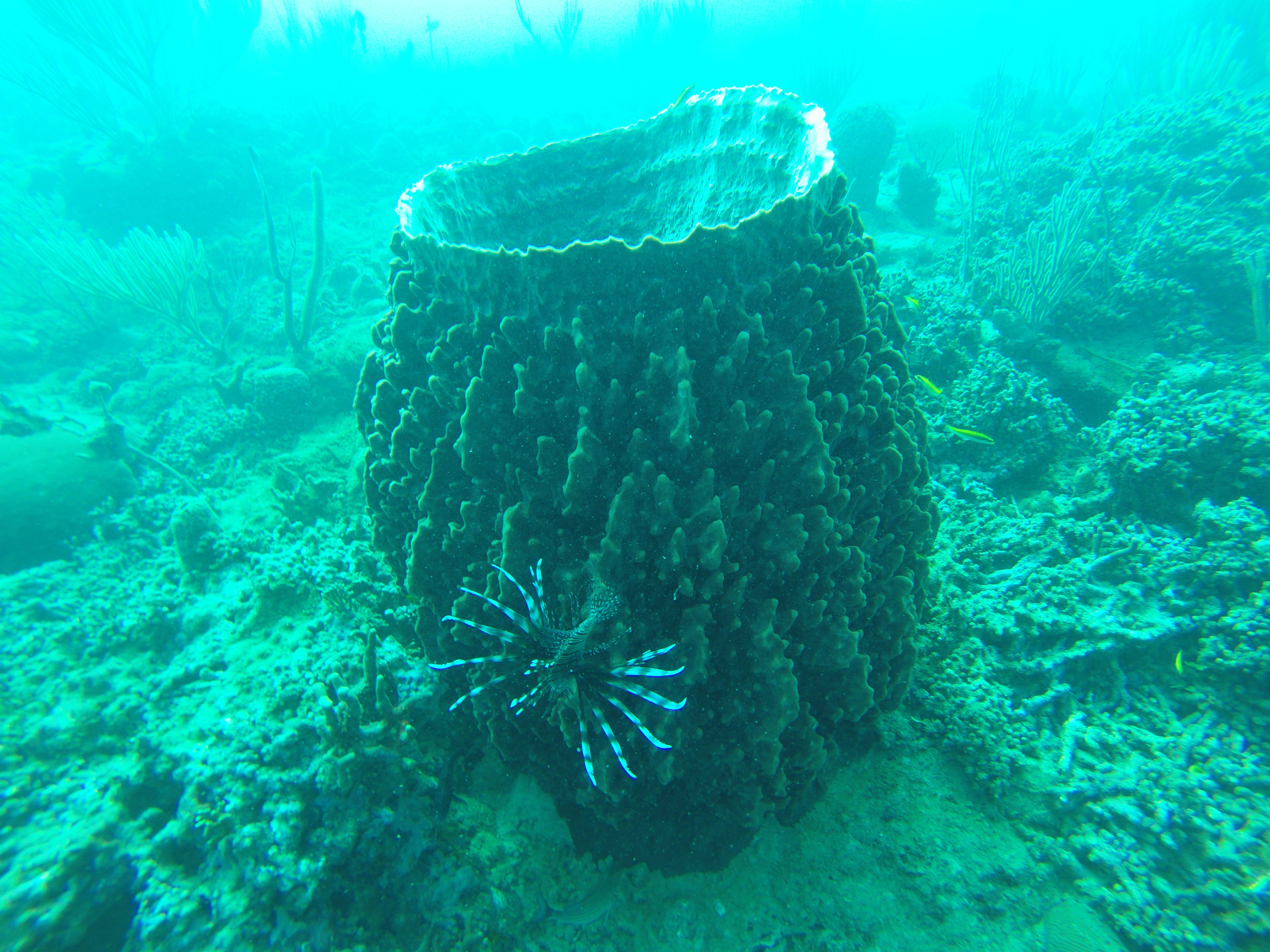 Mein Hauptgrund, nach Puerto Plata zu gehen, waren nicht die Wasserfälle, sondern das Tauchen. Bei einer ortsansässigen Tauchschule habe ich den PADI Advanced Open Water Diver absolviert. Dieser Kurs vertieft noch viele wichtige Fähigkeiten, und baut damit direkt auf dem PADI Open Water Diver auf, den ich in Exmouth in Australien abgeschlossen habe. Vorgegebene Schwerpunkte sind Deep Diving, um die Tauchtiefe von 18 Meter auf 40 Meter zu steigern, sowie Unterwassernavigation. Weitere Schwerpunkte kann man sich selbst setzen. Ich habe diesbezüglich noch Training zum Ausgleich des Auftriebs (Buoyancy) erhalten, verschiedenes über Fischbeobachtung und -einordnung gelernt (Fishidentification) und außerdem Tauchen bei Nacht (Night Dive) trainiert. Mit diesen fünf Schwerpunkten sind wir drei Tage in Folge von Puerto Plata nach Sosua gefahren, um dort zu tauchen. Die karibische Unterwasserwelt hat mir sehr gefallen. Es gab sehr viele bunte Fische, die ich teilweise schon aus Australien kannte, aber auch eine Menge sehr interessante, für mich neue Arten. Es gibt nicht so viele Korallen, aber dafür sehr viele schöne Wasserpflanzen und Schwämme.