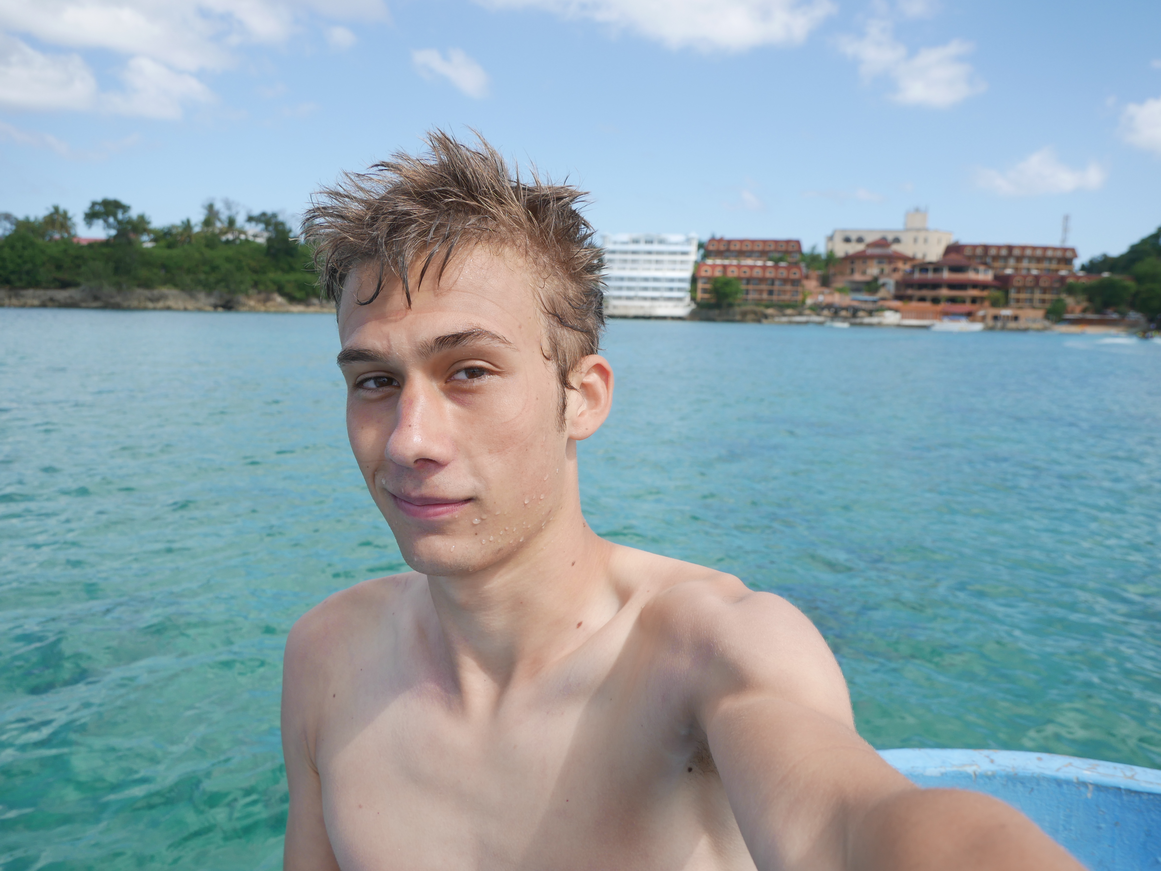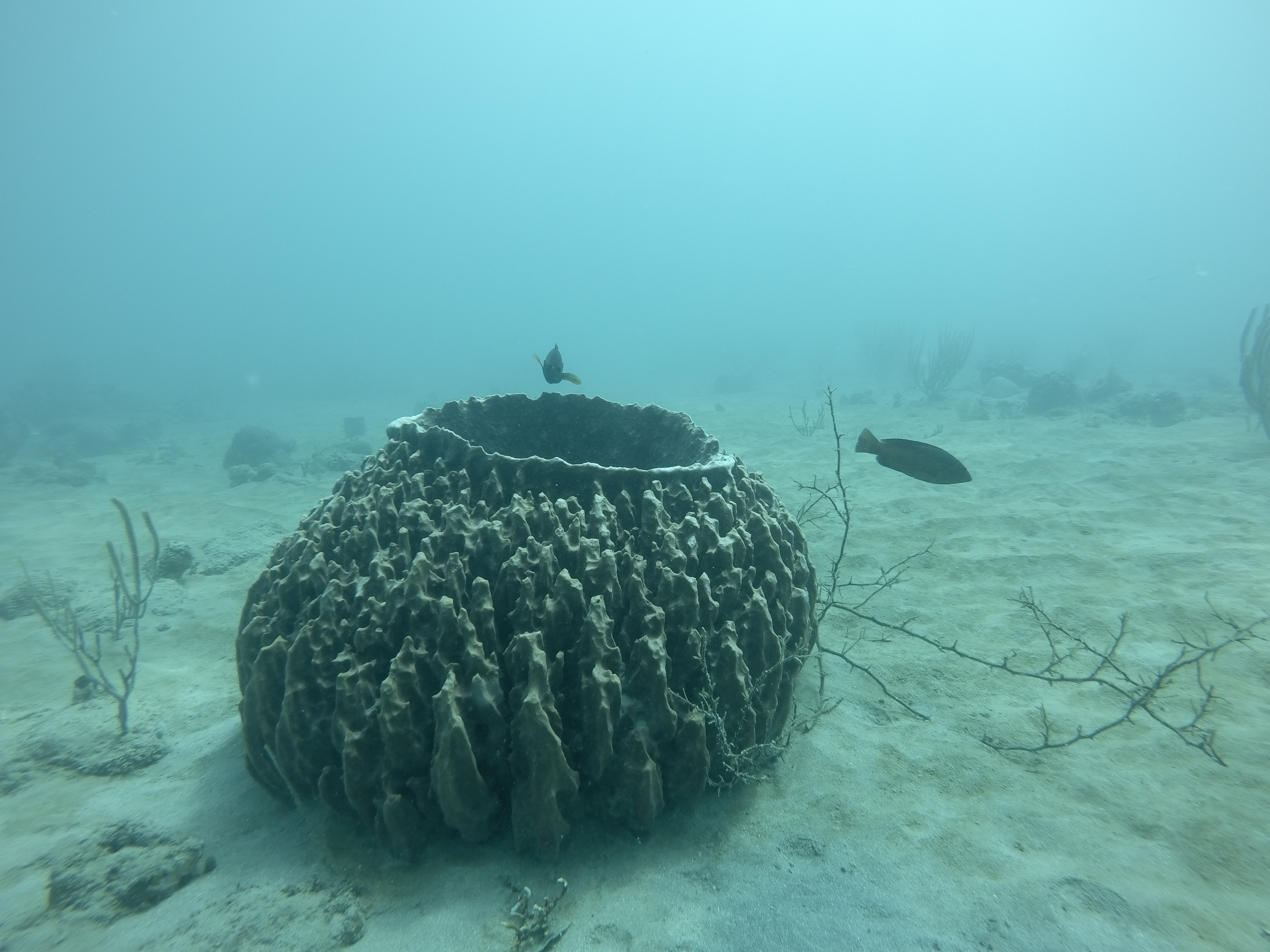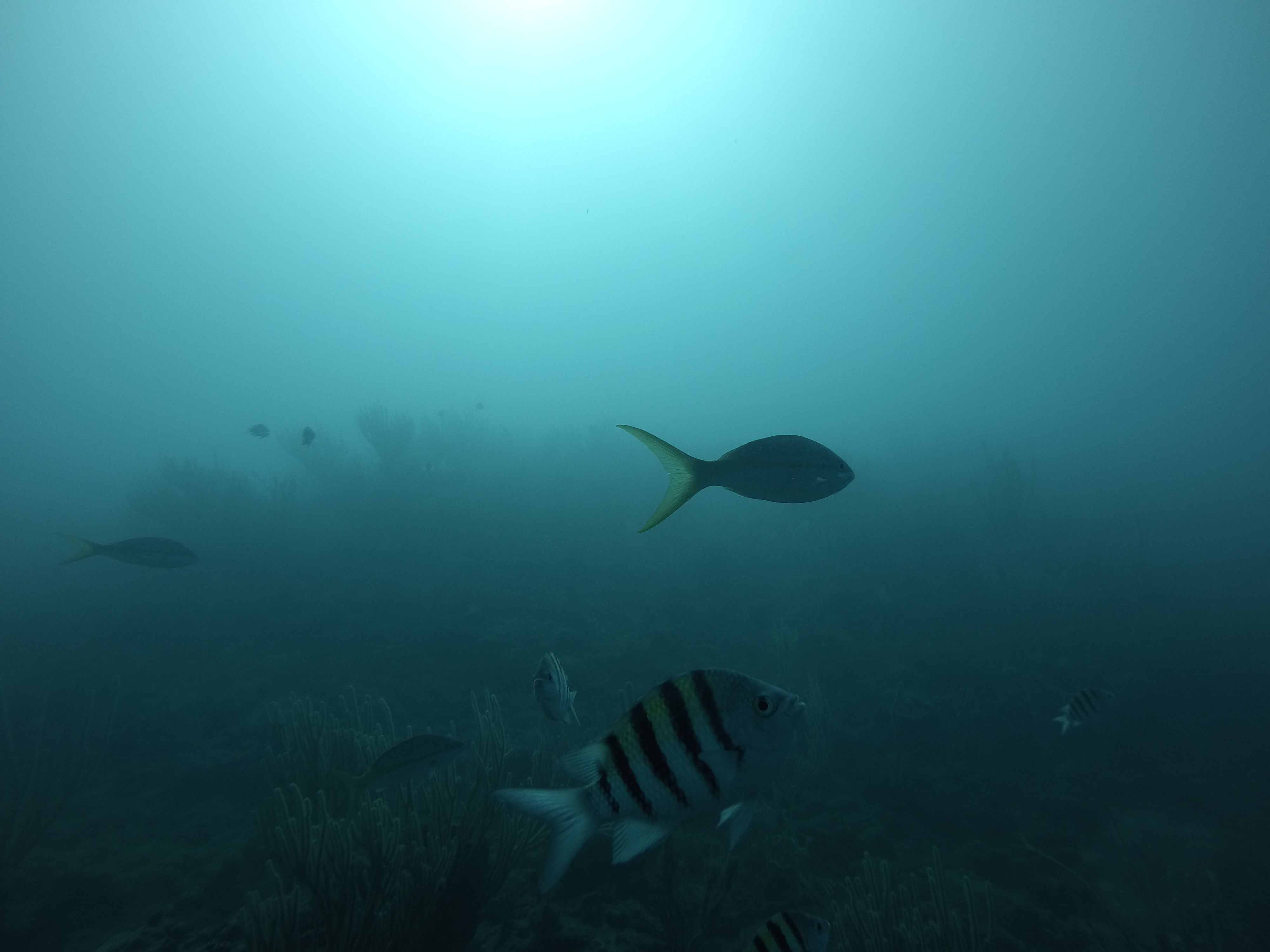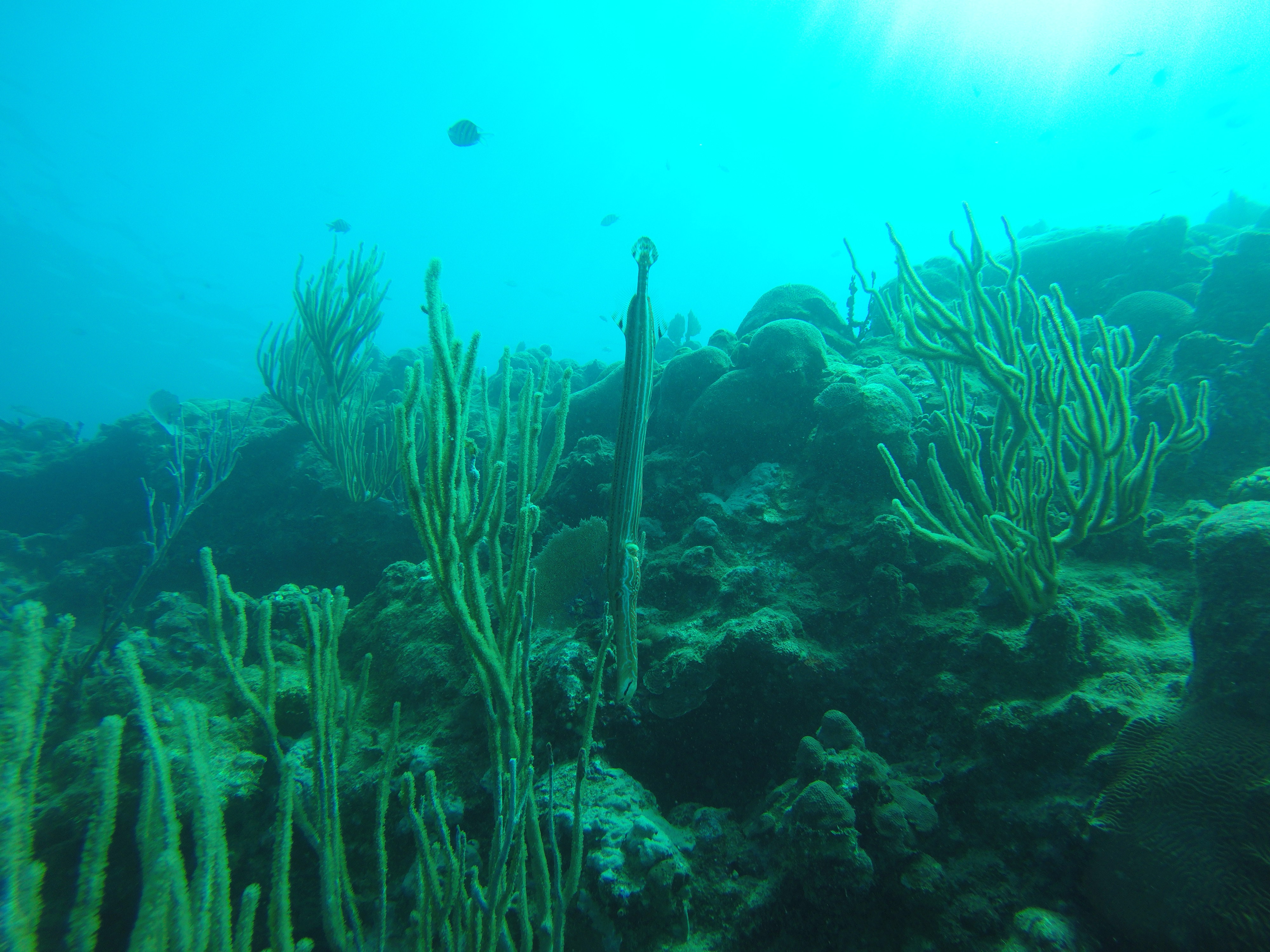 Mein Hauptgrund, nach Puerto Plata zu gehen, waren nicht die Wasserfälle, sondern das Tauchen. Bei einer ortsansässigen Tauchschule habe ich den PADI Advanced Open Water Diver absolviert. Dieser Kurs vertieft noch viele wichtige Fähigkeiten, und baut damit direkt auf dem PADI Open Water Diver auf, den ich in Exmouth in Australien abgeschlossen habe. Vorgegebene Schwerpunkte sind Deep Diving, um die Tauchtiefe von 18 Meter auf 40 Meter zu steigern, sowie Unterwassernavigation. Weitere Schwerpunkte kann man sich selbst setzen. Ich habe diesbezüglich noch Training zum Ausgleich des Auftriebs (Buoyancy) erhalten, verschiedenes über Fischbeobachtung und -einordnung gelernt (Fishidentification) und außerdem Tauchen bei Nacht (Night Dive) trainiert. Mit diesen fünf Schwerpunkten sind wir drei Tage in Folge von Puerto Plata nach Sosua gefahren, um dort zu tauchen. Die karibische Unterwasserwelt hat mir sehr gefallen. Es gab sehr viele bunte Fische, die ich teilweise schon aus Australien kannte, aber auch eine Menge sehr interessante, für mich neue Arten. Es gibt nicht so viele Korallen, aber dafür sehr viele schöne Wasserpflanzen und Schwämme.