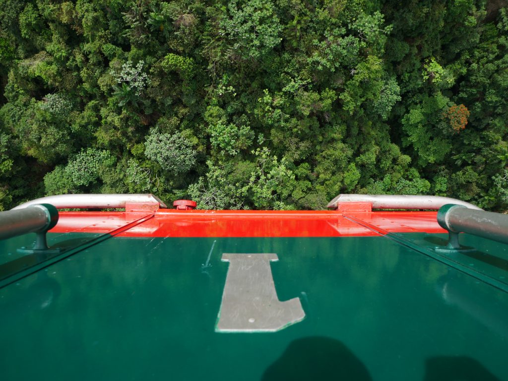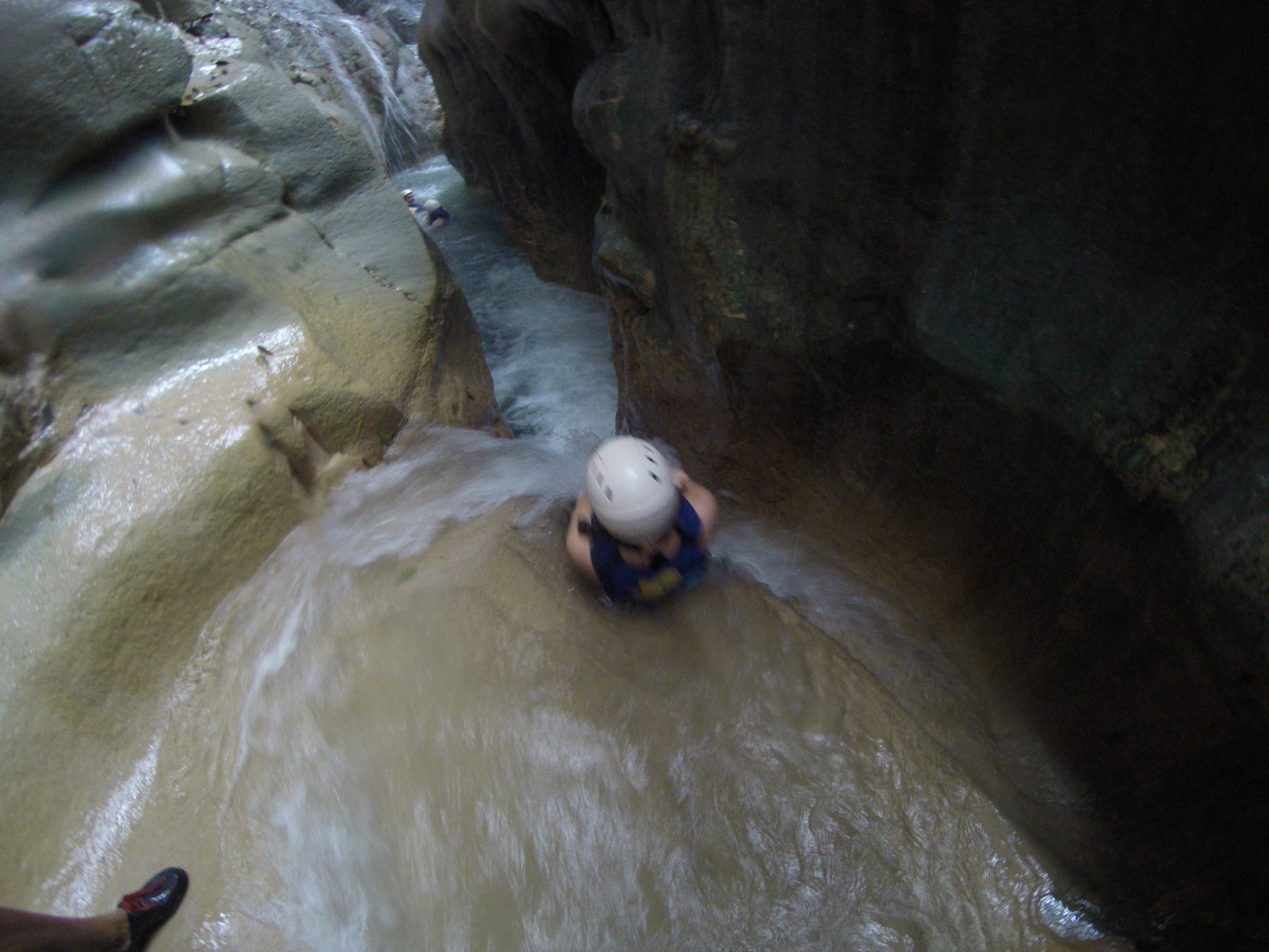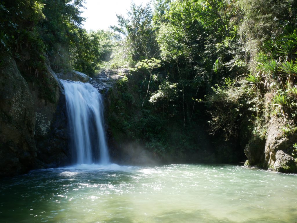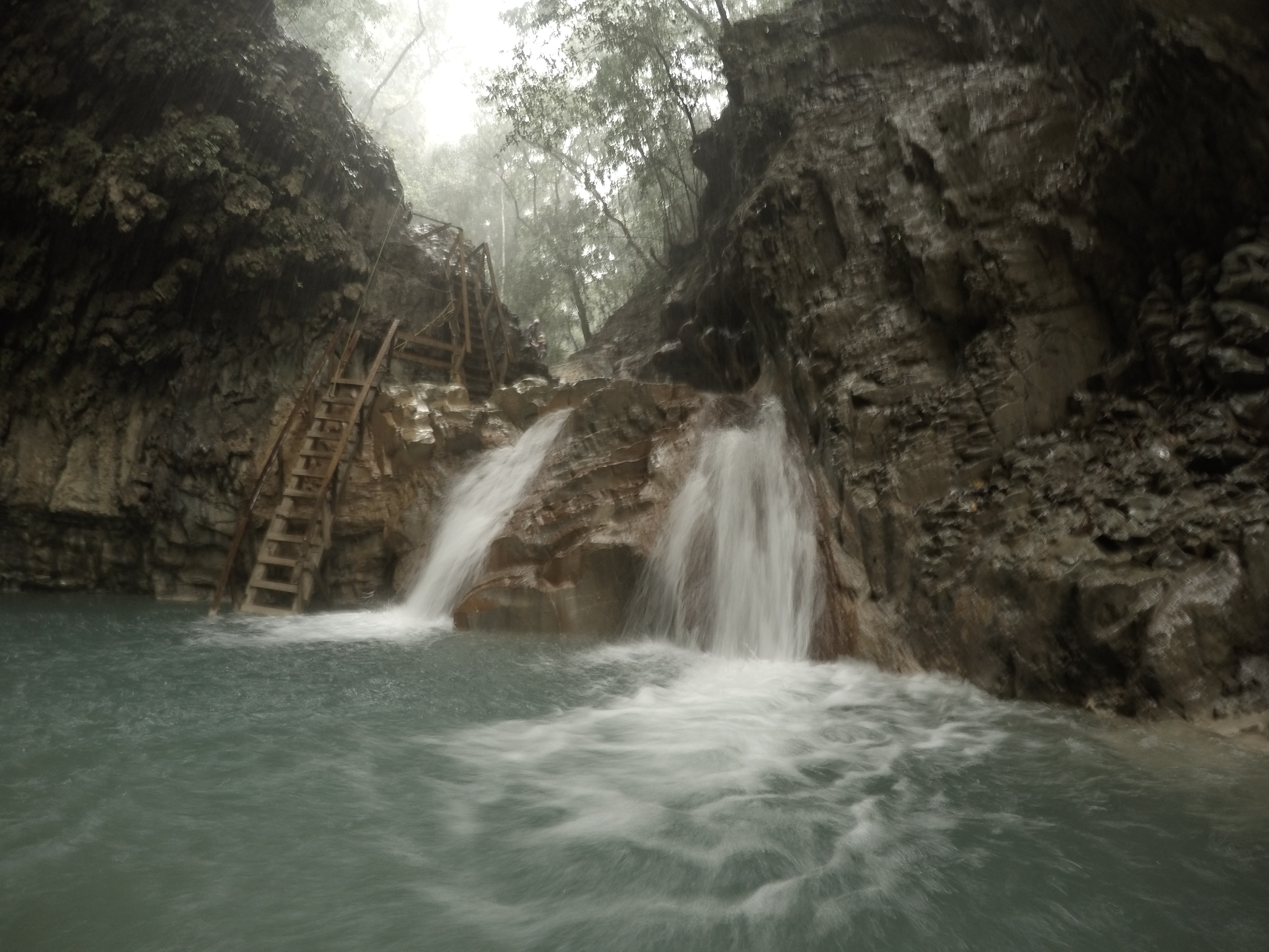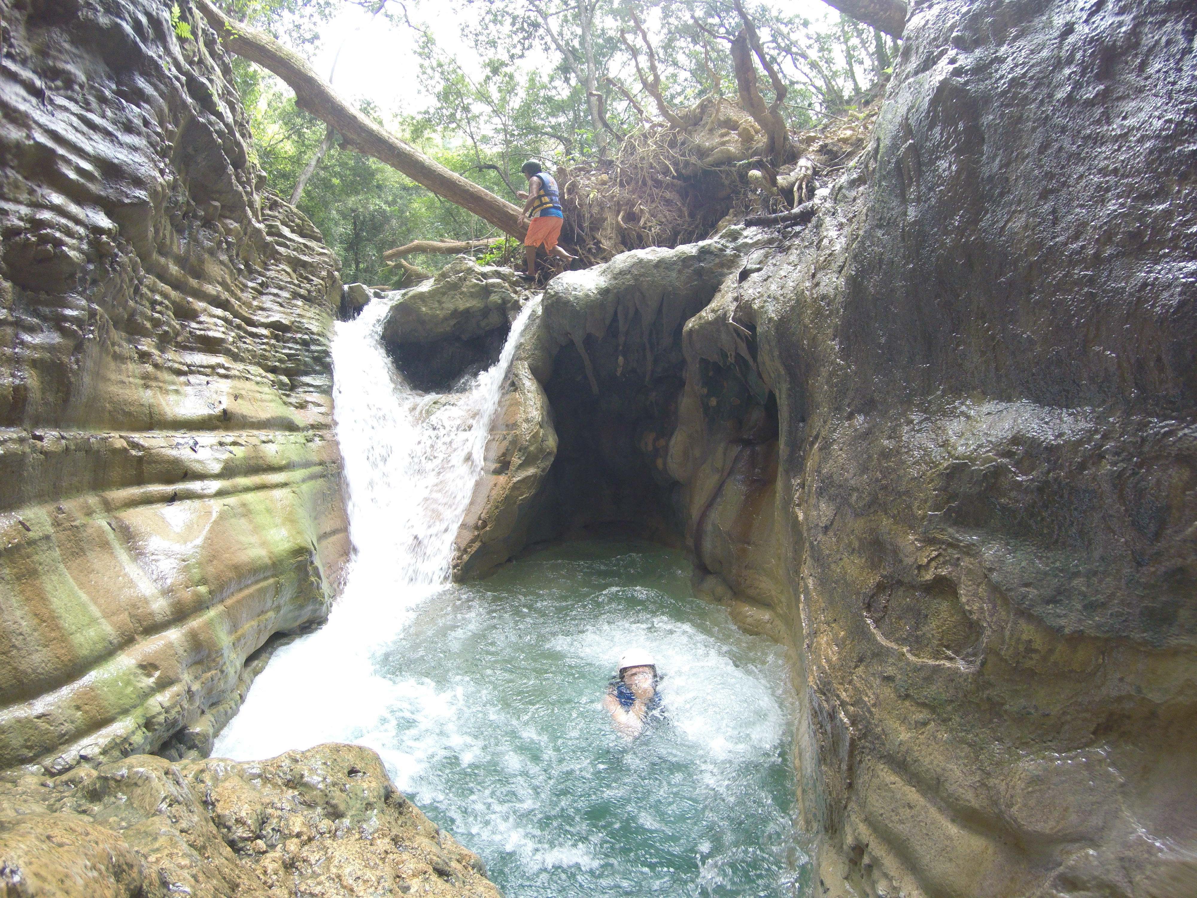 Diesen Dschungel haben wir dann auch wenige Tage später betreten, bei einem Ausflug zu den vielbeworbenen „27 Waterfalls“. Ein eigentlich kleiner Fluss hat einen tiefen Canyon in den Fels geschnitten und dabei viele Wasserfälle gebildet. Mit einem Guide kann man am oberen Ende des Canyons starten, und im Flussbett wandernd und schwimmend hinabgelangen. Höhepunkte sind die Wasserfälle, die man entweder hinunterrutscht oder -springt. Das hat auf jeden Fall großen Spaß gemacht, vielleicht umso mehr, weil es dabei auch noch strömend geregnet hat. Nur leider waren es viel weniger Wasserfälle als angekündigt (keine 27), und die Tour war unerwartet schnell vorbei. Vermutlich haben die Betreiber hier wirklich jede kleine Stromschnelle mitgezählt, um noch mehr Leute anzulocken. Aber für die wenigen Wasserfälle, die es dann wirklich gab, war der Eintritt eigentlich viel zu teuer. Trotzdem, es war eine spannende Erfahrung.