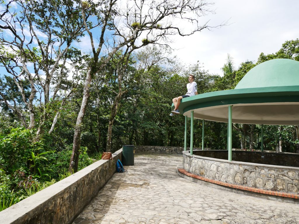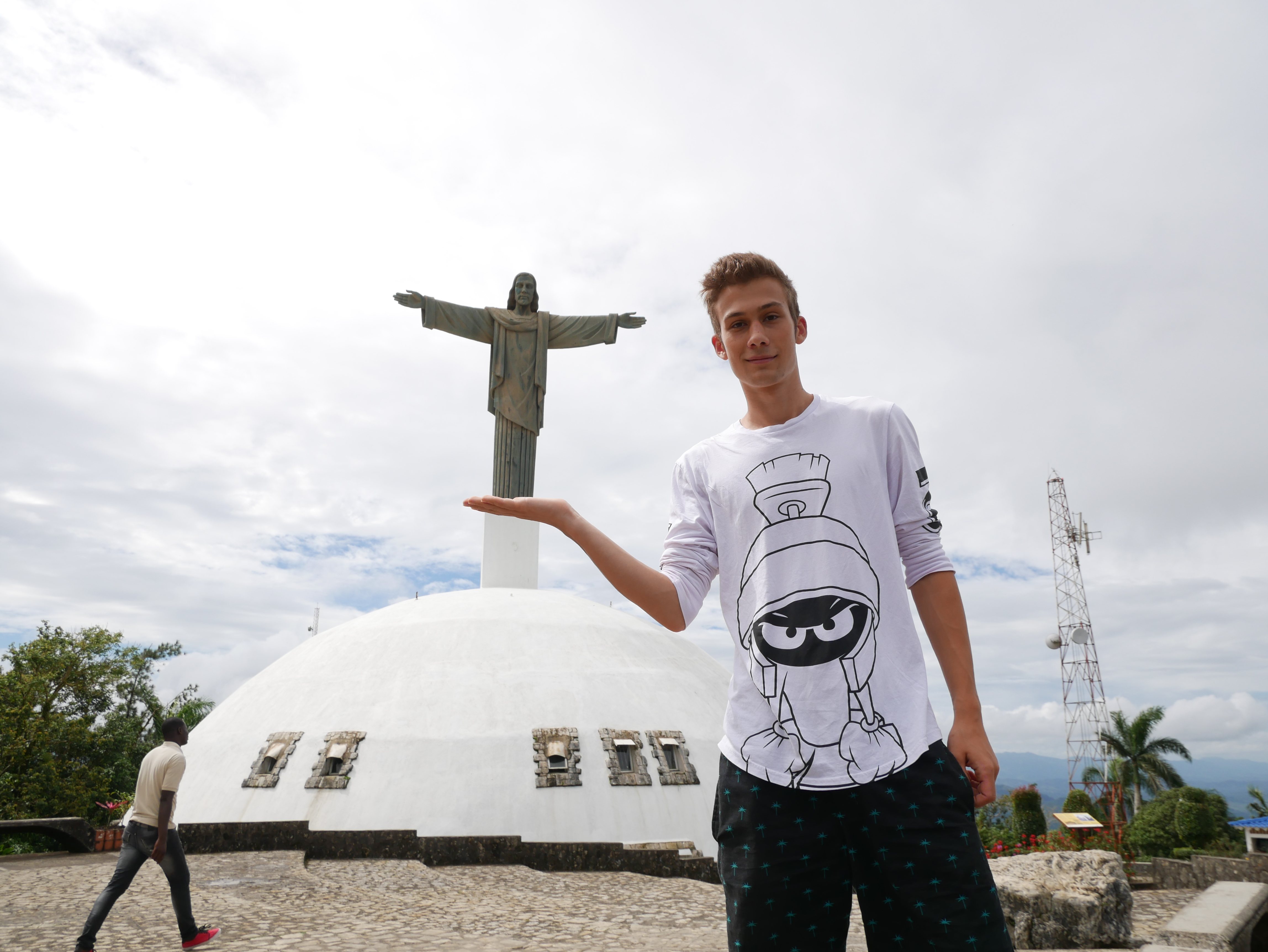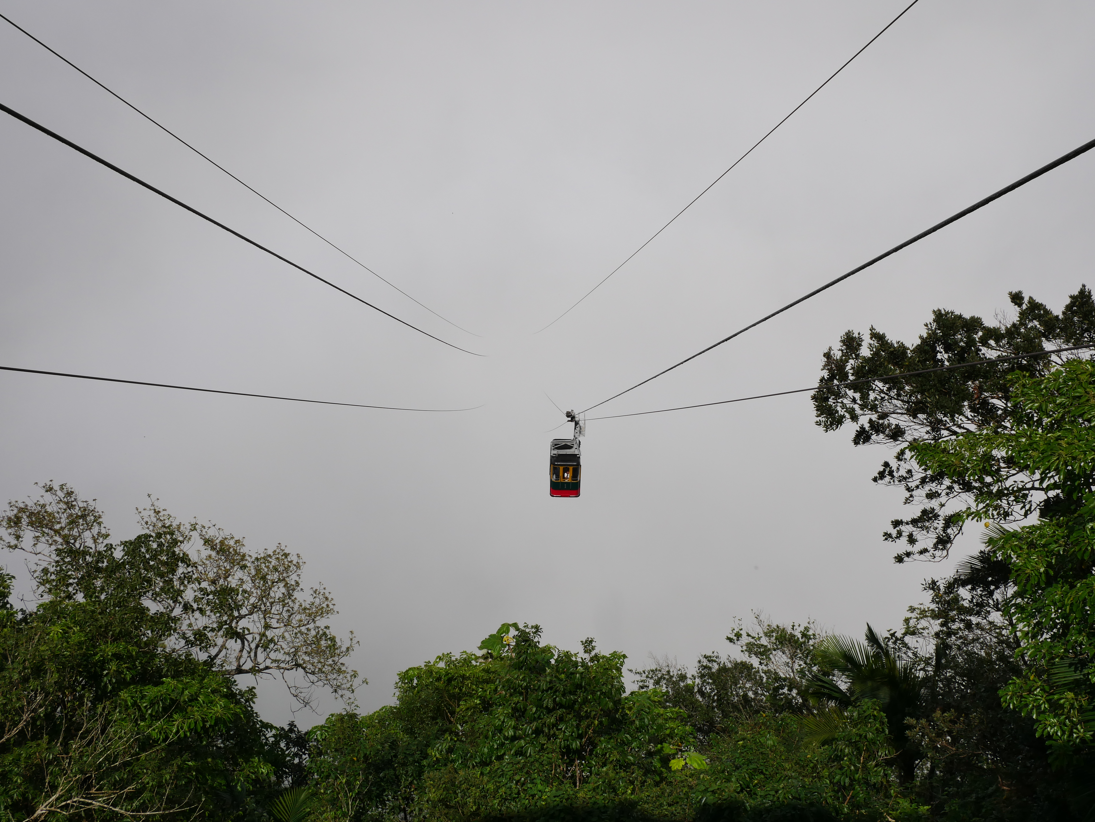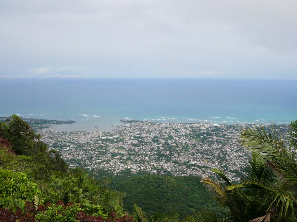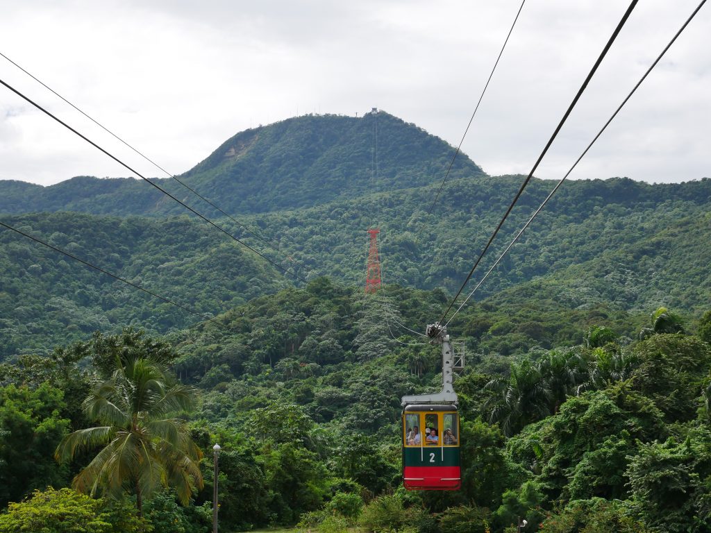 Unsere Freizeit haben wir eher in der Umgebung verbracht. Ein Muss für alle Besucher hier ist die Seilbahn. Sie fährt zum Gipfel eines 800 Meter hohen Berges. Es ist die einzige Seilbahn im kompletten Karibikraum. Zwei kleine Gondeln pendeln zwischen Stadt und Gipfel hin und her. Oben angekommen findet man sich zuerst zu Füßen einer kleinen Christusstatue wieder, die von den Einheimischen gern mit der in Rio de Janeiro verglichen wird. Mit ausgebreiteten Armen steht Christus auf dem Berg und wacht hoffentlich über die Stadt, die von oben betrachtet wunderschön aussieht. Bei einem Spaziergang um den Gipfel sieht man außerdem ins Landesinnere, und hat einen beeindruckenden Blick über beinahe dschungelartige Wälder. Am Nachmittag zog Nebel auf, und wir fuhren durch die Wolken zurück.