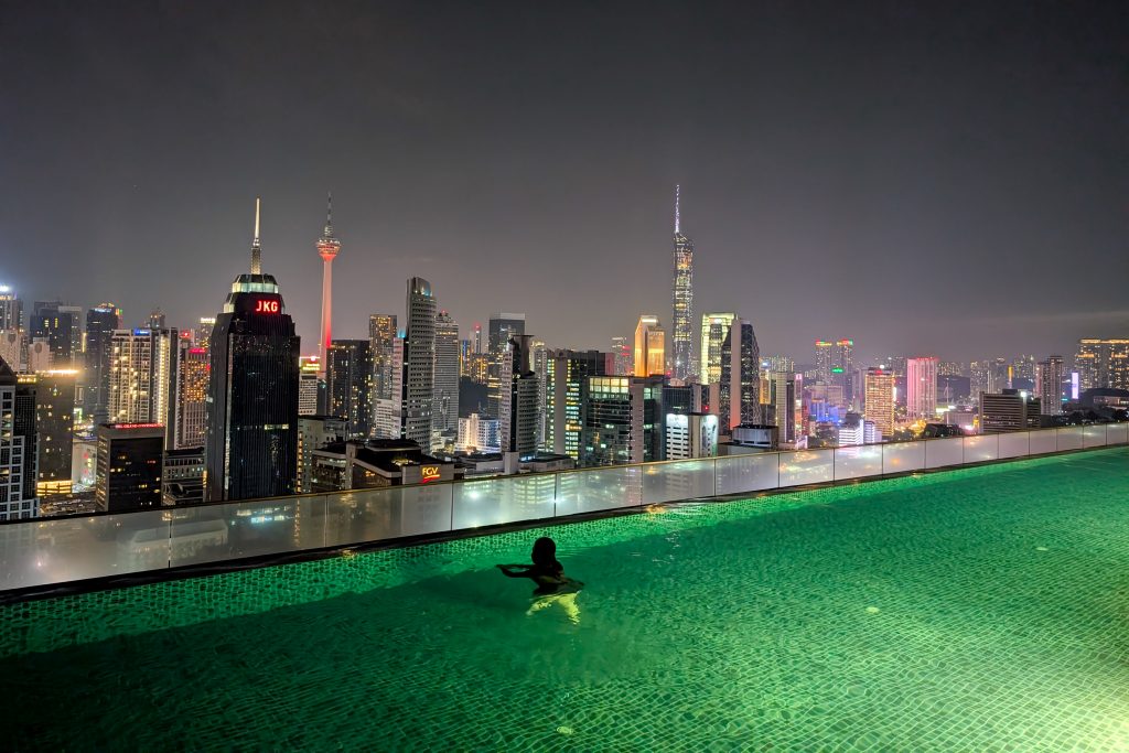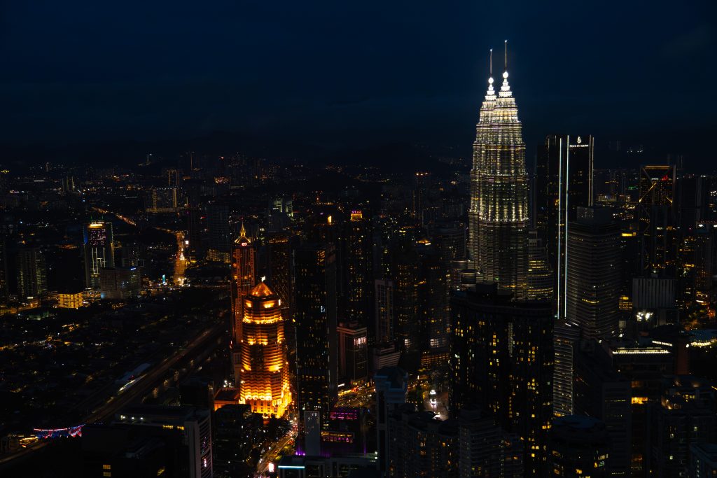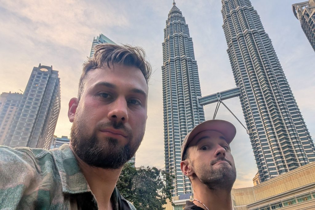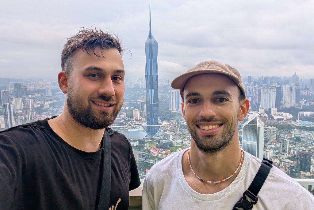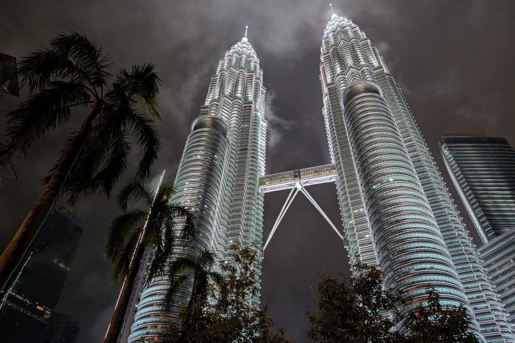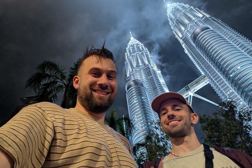 Per Taxi ging es zu Eric. Er wohnt in einem riesigen Hochhaus am Rande des Zentrums von Kuala Lumpur. Seit einigen Wochen arbeitet er für eine deutsche Produktionsfirma und dreht Filme in Südostasien, hauptsächlich für Galileo. Kurz nach meiner Ankunft gingen wir draußen essen. Und weil wir beide noch Energie hatten, wanderten wir bei Nacht durch die Stadt. Ich bekam einen ersten Eindruck von der gewaltigen Metropole. Dutzende hell erleuchtete Wolkenkratzer strecken sich in den dunklen Nachthimmel. Ikonisch sind die Petronas Twin Towers. Die detailreichen Glasriesen sind die höchsten Zwillingstürme der Welt. Und nicht weit entfernt steht das Hochhaus Merdeka 118, das zweithöchste Gebäude der Welt. Kuala Lumpur bei Nacht ist eine beeindruckende Kulisse voller greller Lichter.