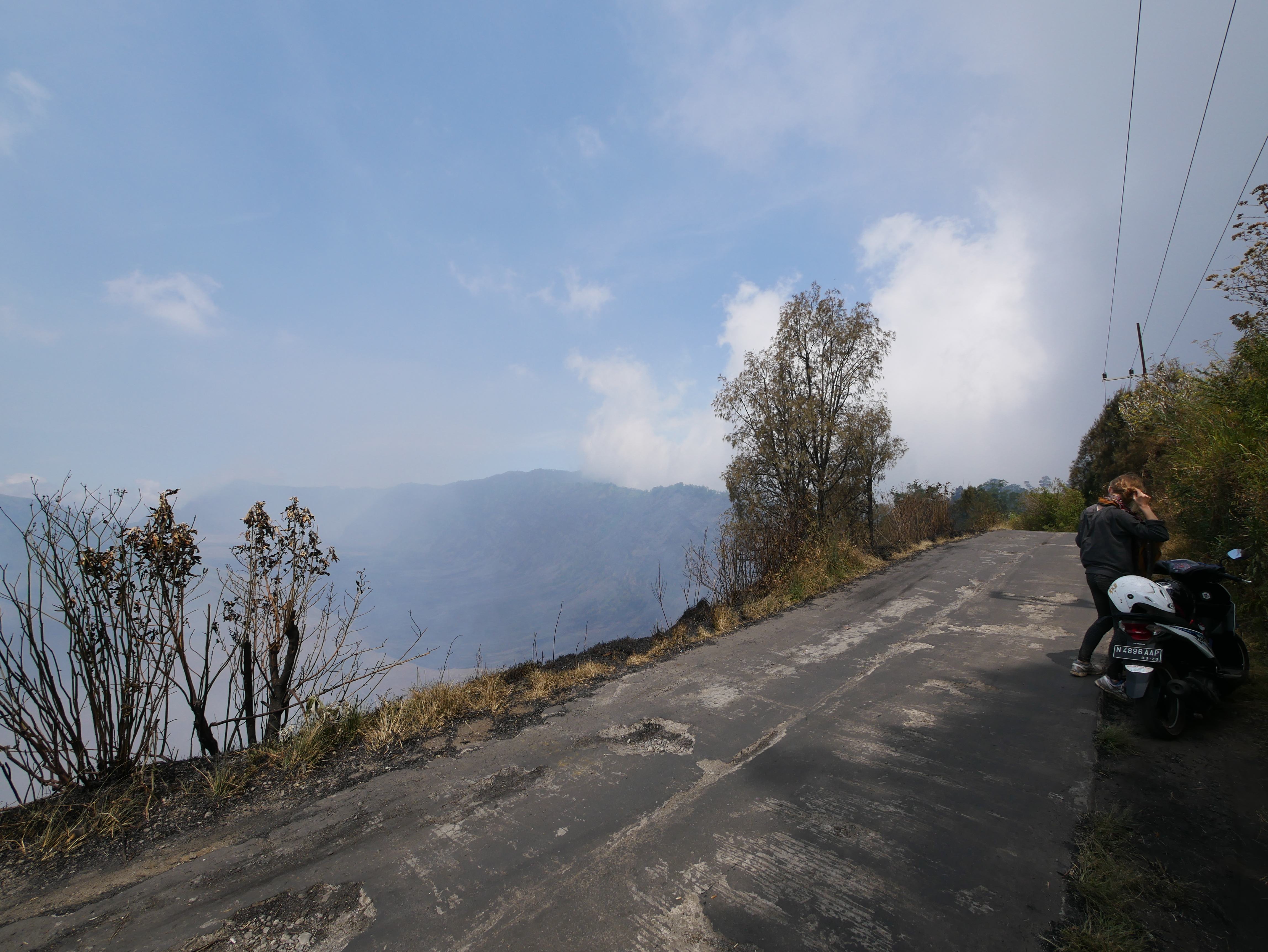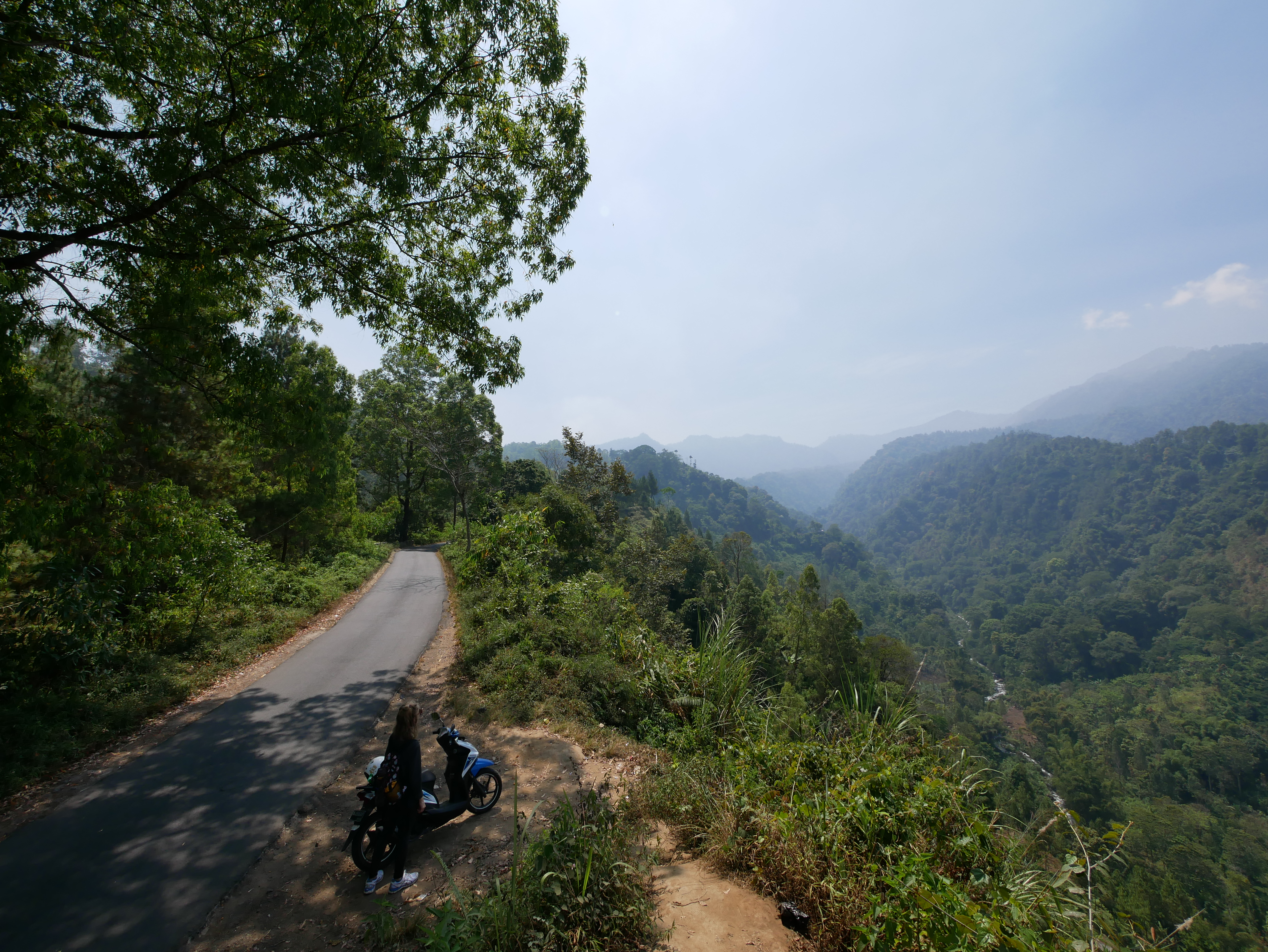 Malang liegt am Fuße mehrerer Vulkane. Direkt hinter der Stadt erhebt sich ein mächtiges Gebirge auf bis zu 2.400 Meter Höhe. Wir hatten uns über die Gegend informiert, und gesehen, dass es einen schönen Wasserfall sowie drei Vulkane gibt. Einer der Vulkane, der Bromo, ist sogar noch aktiv. Als sparsame Backpacker haben wir uns einfach zu zweit einen Scooter gemietet, und los ging es in die Berge. Auf kurzer Strecke haben wir sehr viele Höhenmeter zurückgelegt. Es ging immer weiter hinauf, bis wir auf einmal durch die niedrige Wolkendecke fuhren. Etwas weiter oben hatte man dann wunderschöne Aussichten über die vielen Täler, den Regenwald und die Felder der Bauern.