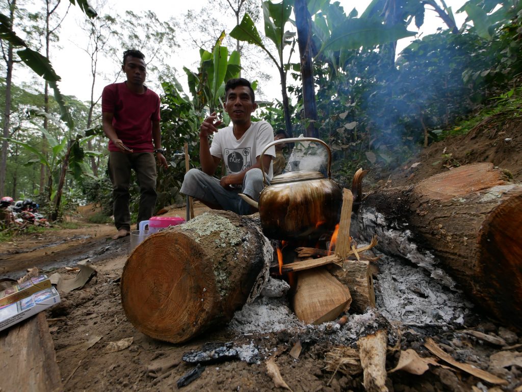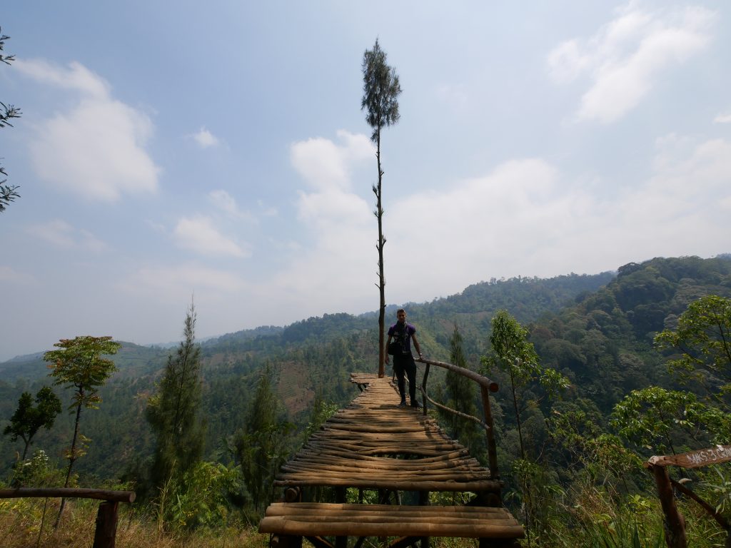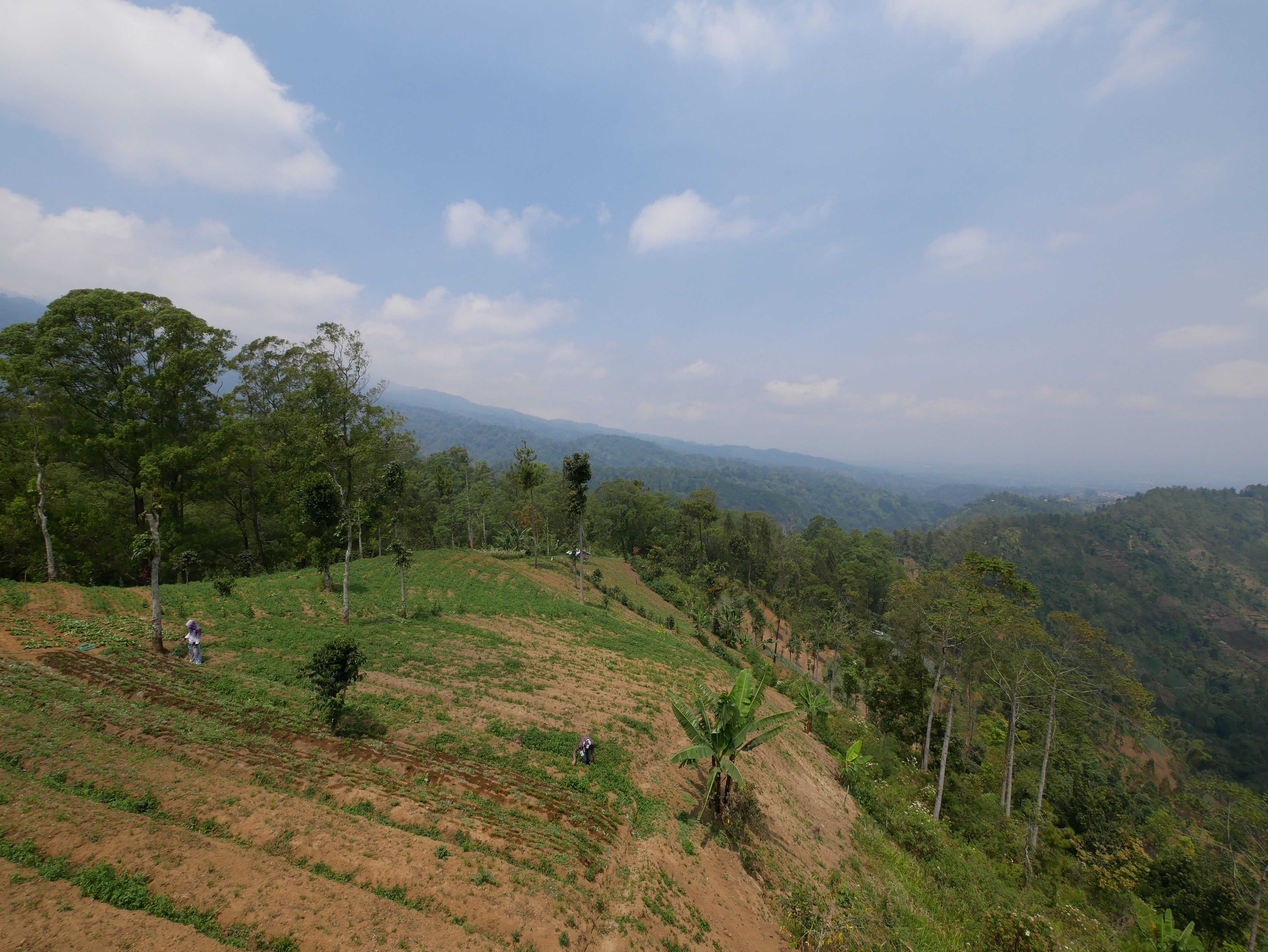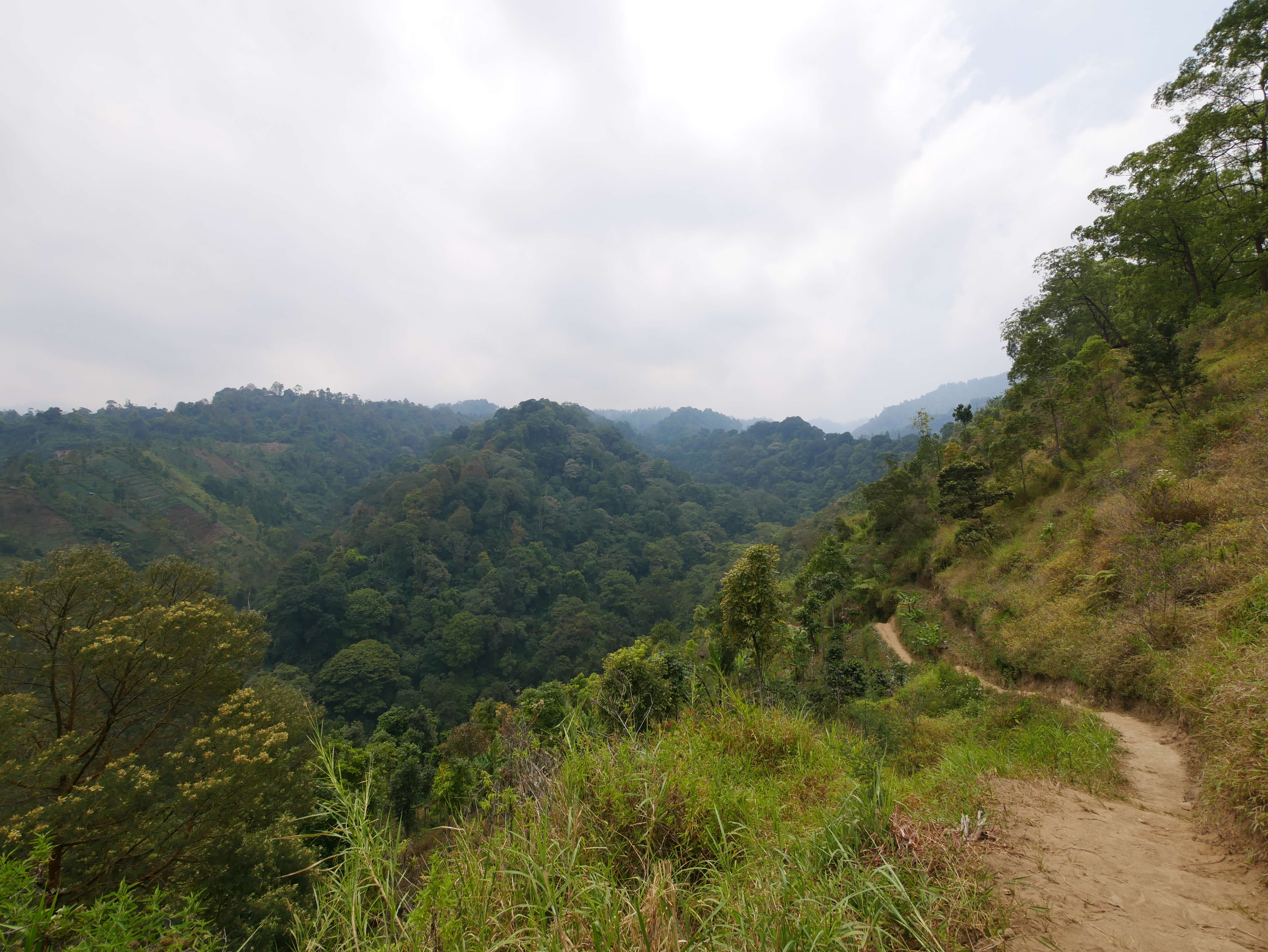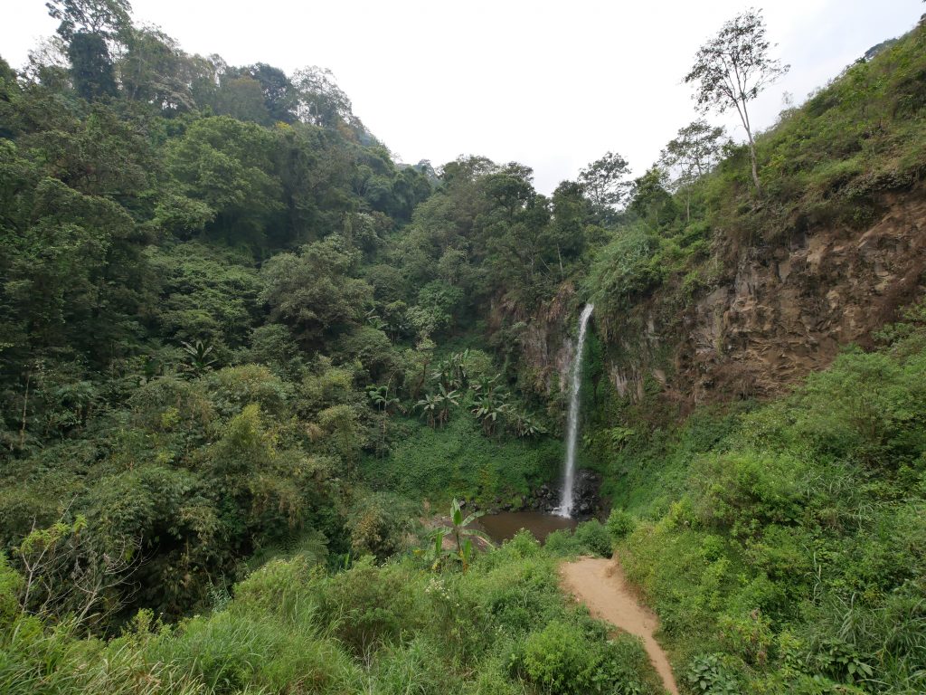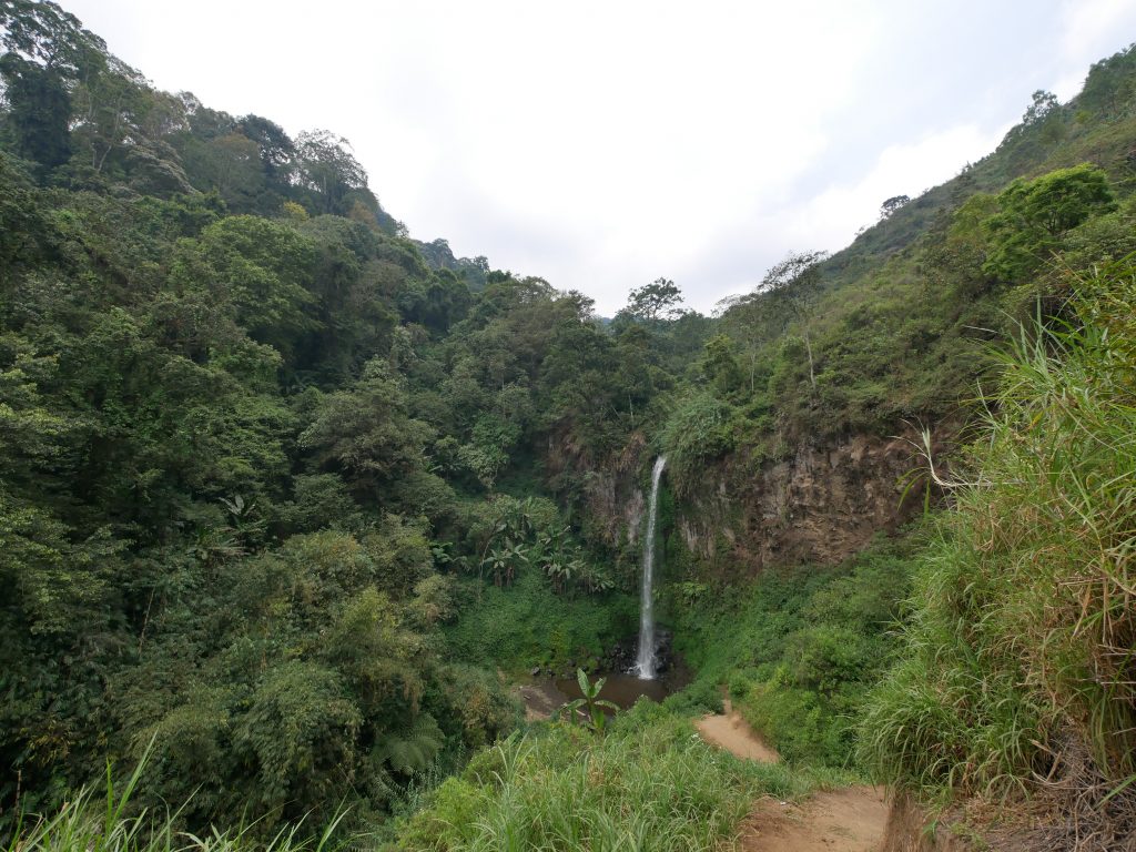 Nach unzähligen Serpentinen auf einer sehr schlechten Straße, erreichten wir den Parkplatz zum Wasserfall. Hier waren keine Touristen außer uns. Nur ein paar indonesische Bauern, die die nahen Felder bewirtschafteten und im Moment den Wanderweg sanieren, waren hier versammelt. Sie luden uns zum Kaffee am Lagerfeuer ein, und obwohl wir einander nicht verstehen konnten, war es eine angenehme Runde. Über einen steilen, sandigen Pfad sind wir dann in ein Tal hinabgestiegen, und kamen irgendwann an einem schönen Wasserfall heraus.