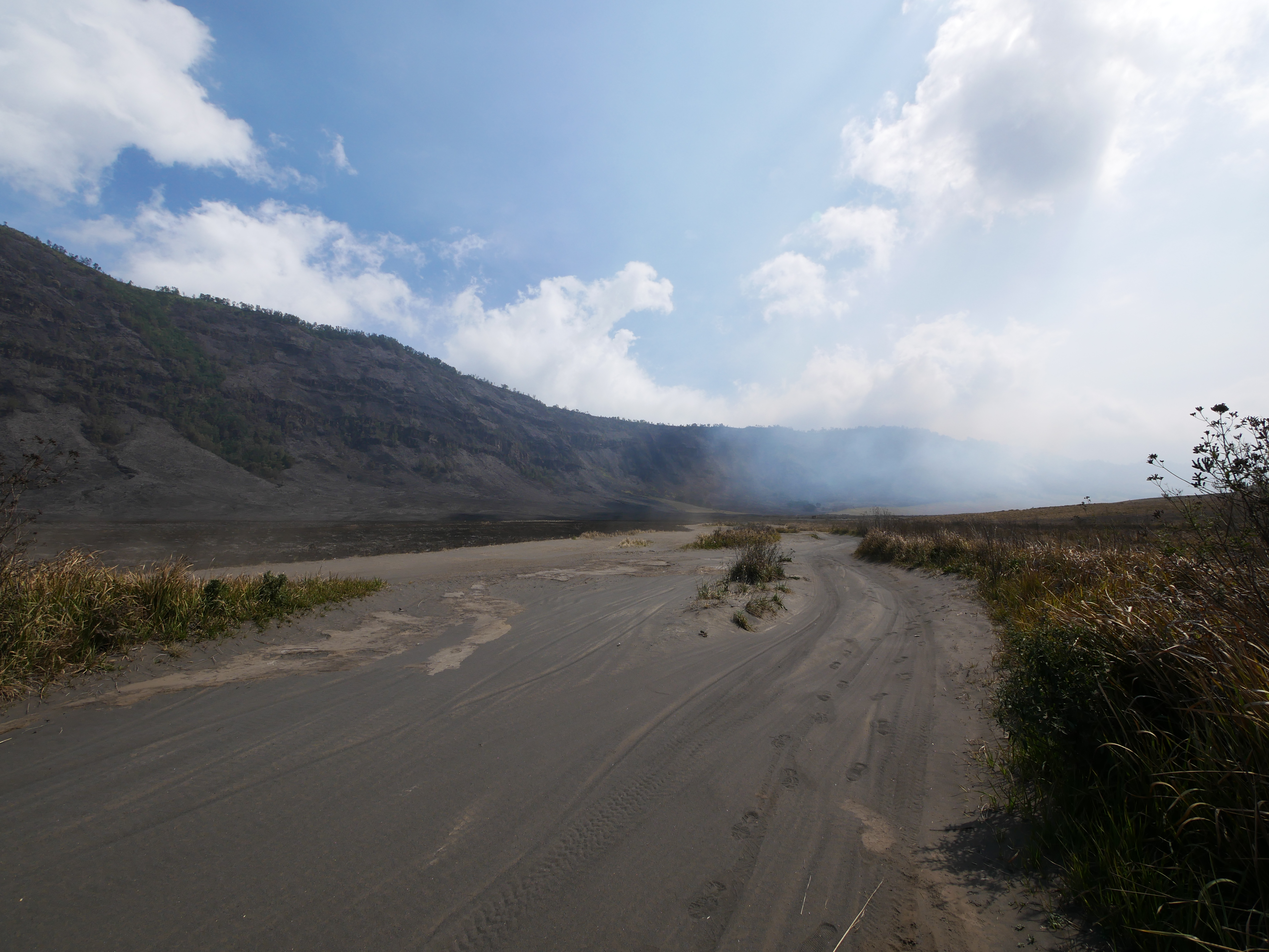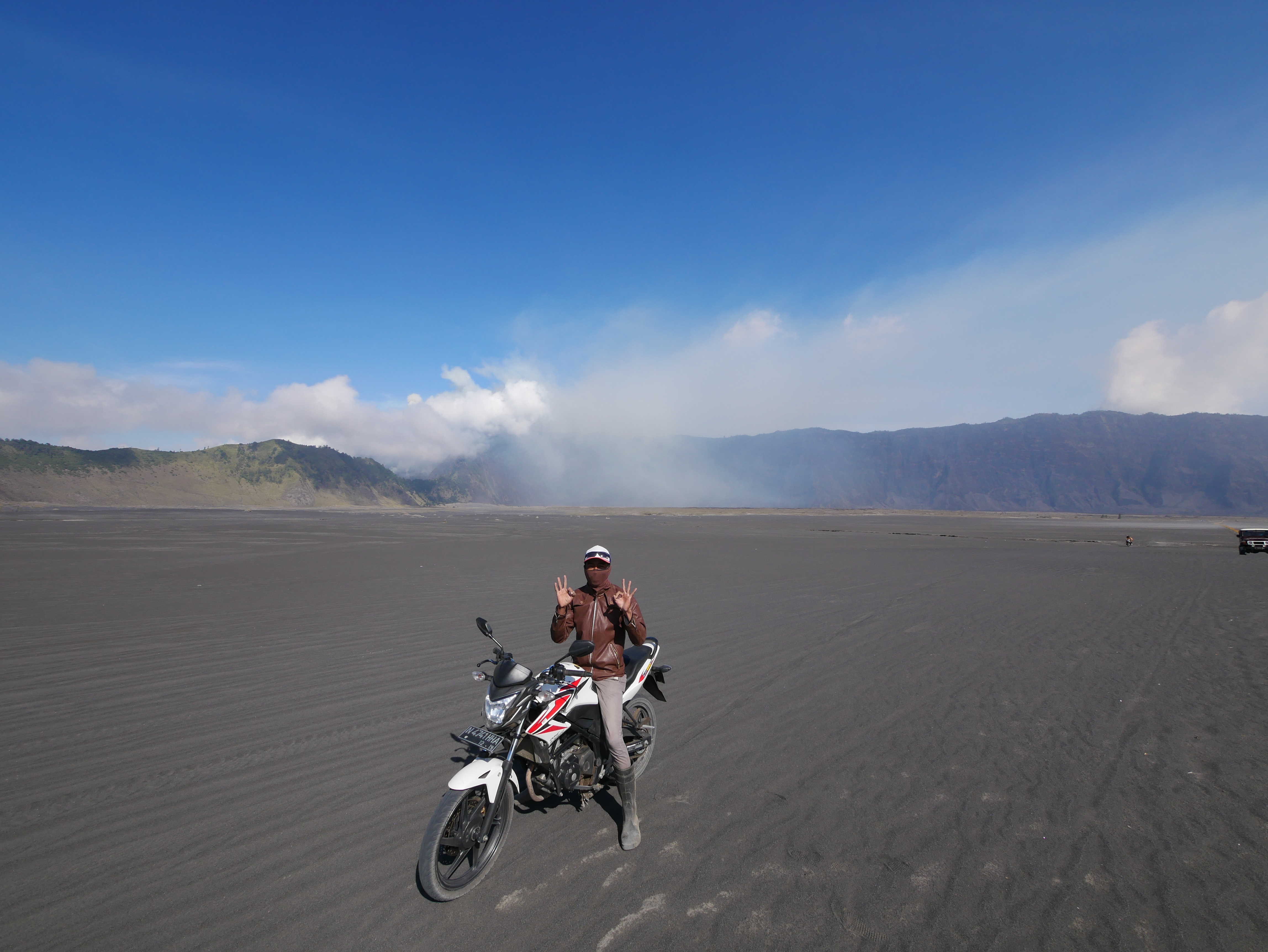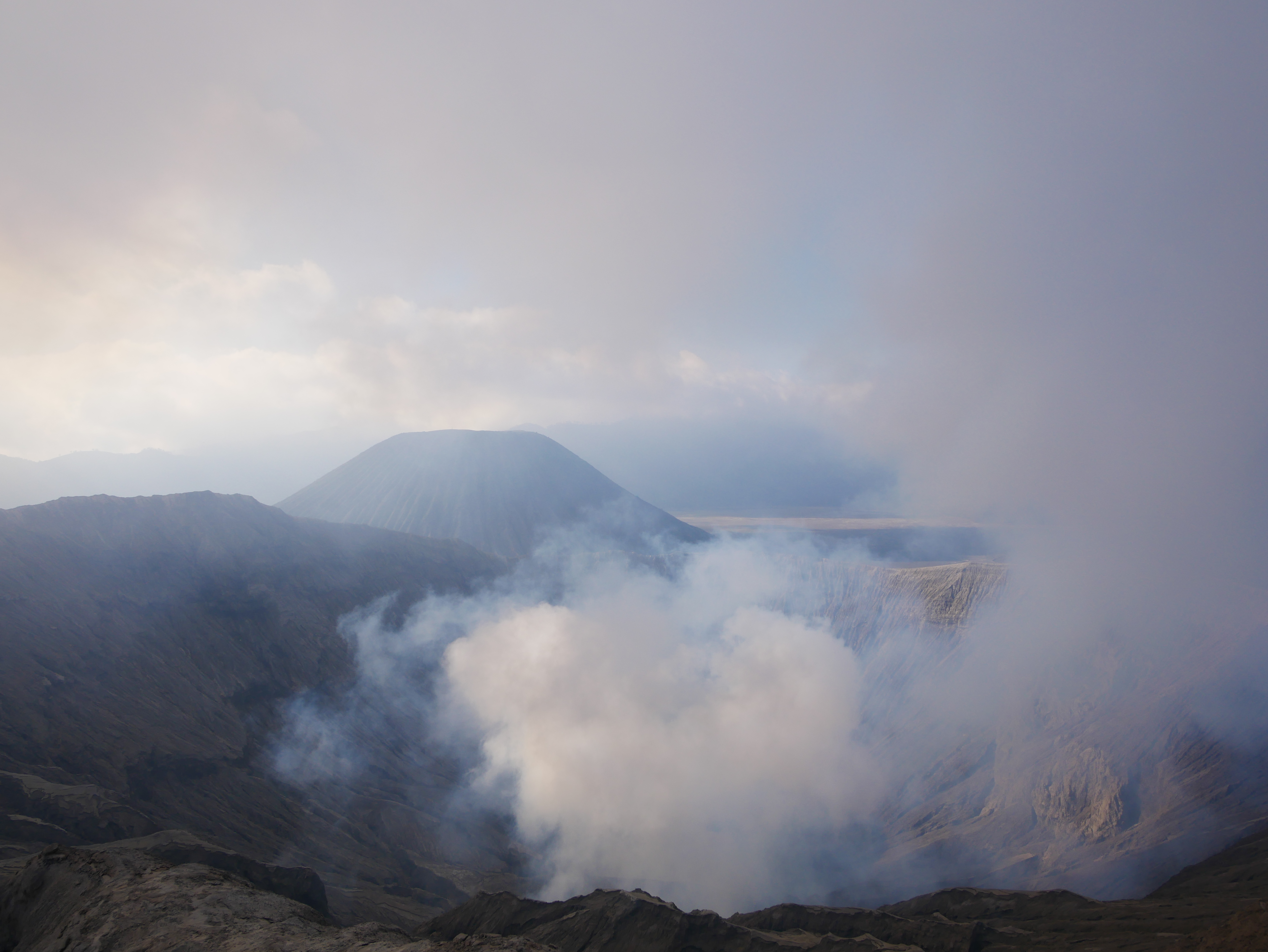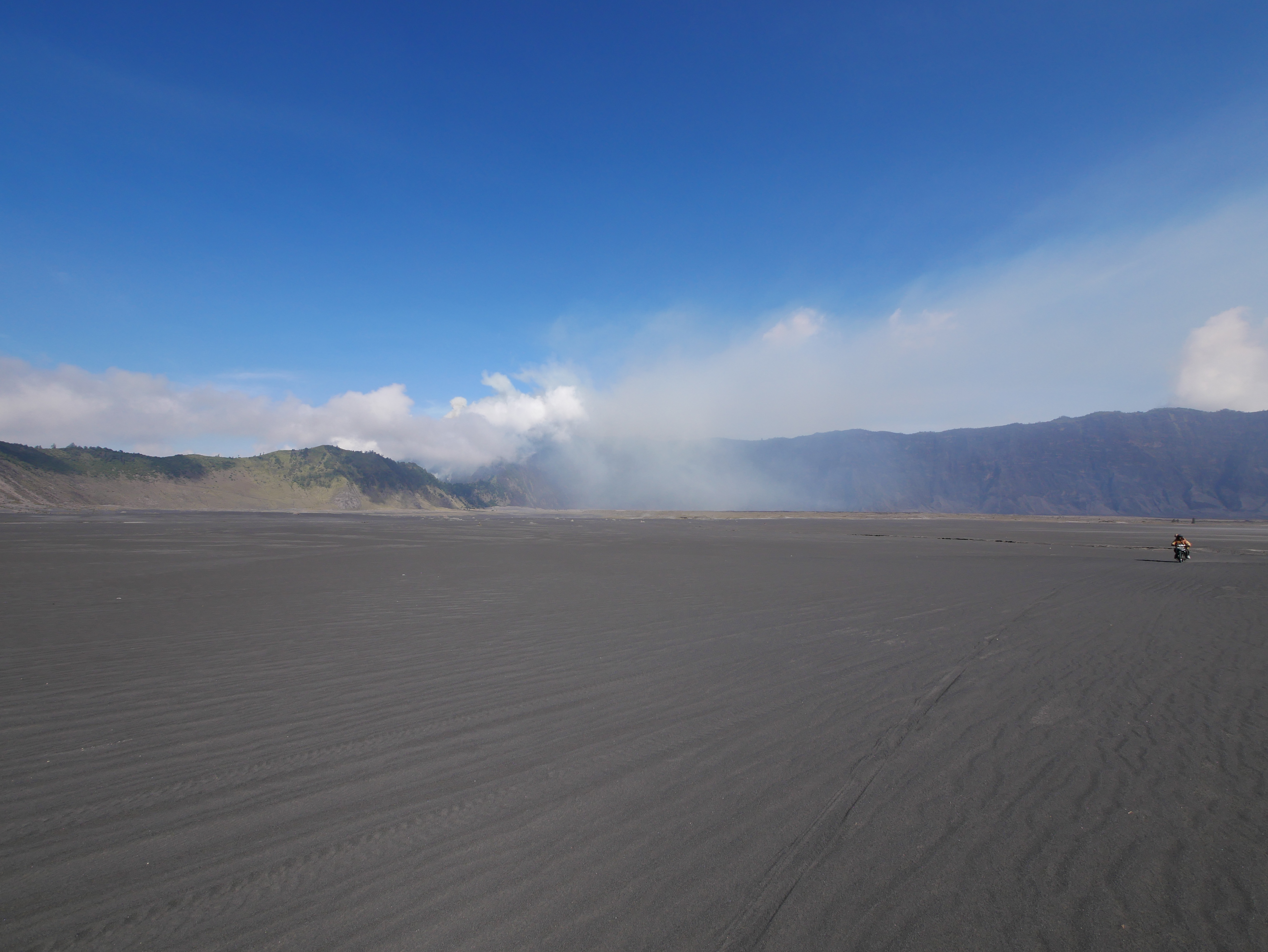 Nachdem wir den Parkplatz und unseren Scooter wieder erreicht hatten, fuhren wir die schmale Bergstraße weiter Richtung Bromo. Es ging noch sehr lange bergauf, bis wir irgendwann ganz oben angekommen waren. Direkt neben der Straße fiel der Hang steil ab, und gab einen wunderbaren Blick auf ein großes, flaches Tal frei. In der Mitte des Tales sahen wir schon von weitem die drei Vulkane aufragen. Die Straße führte hinab in das Tal und wurde irgendwann zum Sandweg. Je weiter wir fuhren, desto staubiger wurde die Straße. Nach einer Weile verschwand die Straße komplett, vor uns lag nur noch kilometerweit der schwarze Sand, den die Vulkane abgelagert hatten. Vereinzelt zogen sich Motorrad- oder Jeepspuren hindurch. Mit unserem kleinen Scooter waren wir jedoch chancenlos und mussten umdrehen. Nach einem Kilometer kamen wir wieder an einer Art Parkplatz vorbei, und hier waren ein paar Bauarbeiter anwesend, die eine Hütte bauten. Sie waren schnell bereit, uns zu helfen. Für ein kleines Trinkgeld stellten wir unser Motorrad unter ihre Aufsicht, und zwei von ihnen starteten ihre Crossmotorräder. Die beiden hatten offensichtlich sehr viel Erfahrung in diesem Gelände. Zumindest hoffte ich das, als wir mit einer Geschwindigkeit von 100 km/h (!) durch die Sandwüste fuhren. Ein paar Mal haben die Motorräder gefährlich geschaukelt, der knietiefe Sand ist schon ein herausforderndes Terrain. Schon nach zehn Minuten hatten wir den Fuß des Bromo erreicht. Der Krater ragte steil aus der Wüste heraus, schon von unten war das laute Grollen hörbar. Es gab einen kleinen Pfad, der nach oben führte. Der Kraterrand war sehr schmal, und auf einem Weg konnte man den Krater umrunden. Es gab meist keinen Zaun, und es ging nach links und rechts ziemlich steil hinab. Der Vulkankrater gehört zu den beeindruckendsten Dingen, die ich jemals gesehen habe. Mit sehr lautem Donnern bahnten sich große Rauchwolken ihren Weg aus dem Schlot. Hier oben stank die Luft stark nach verbranntem Schwefel. Interessant waren auch die noch sichtbaren versteinerten Lavaströme am Kraterrand.