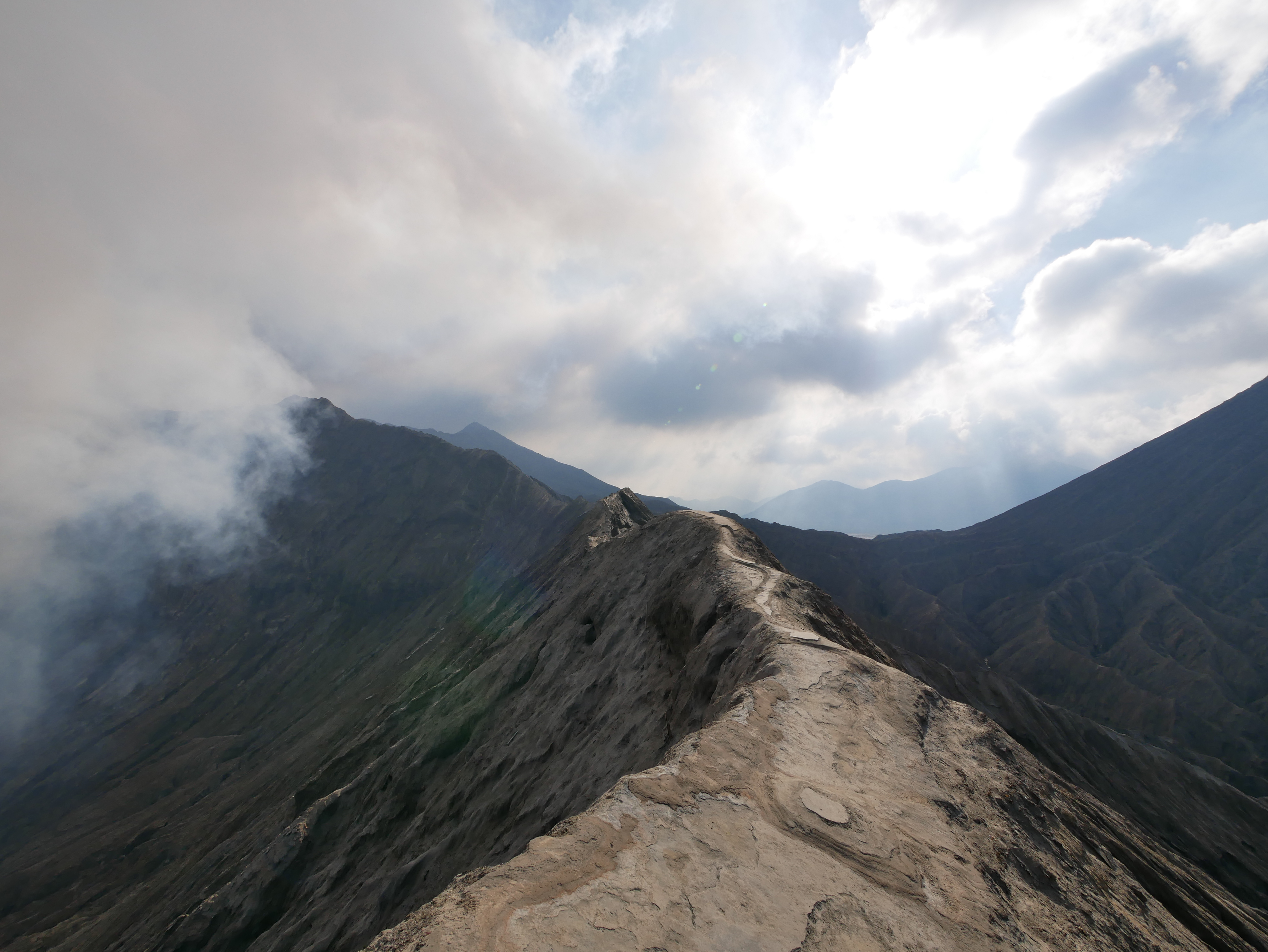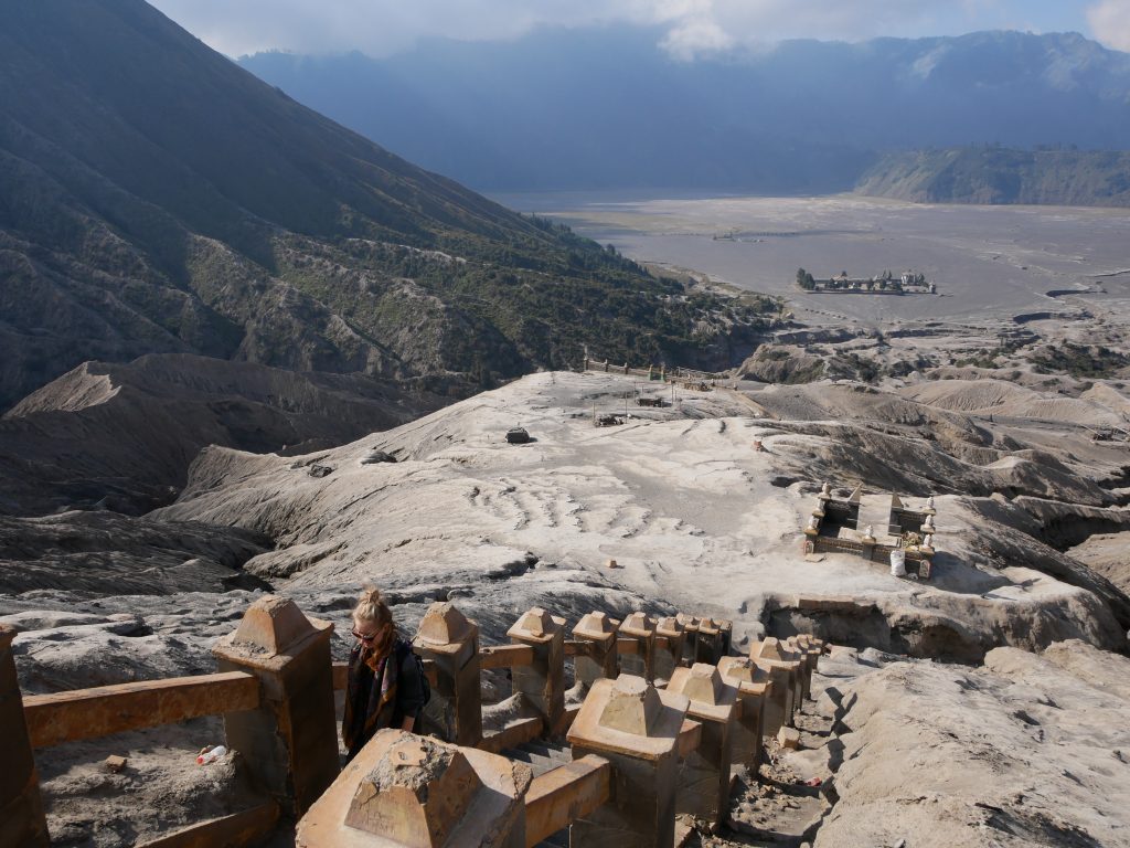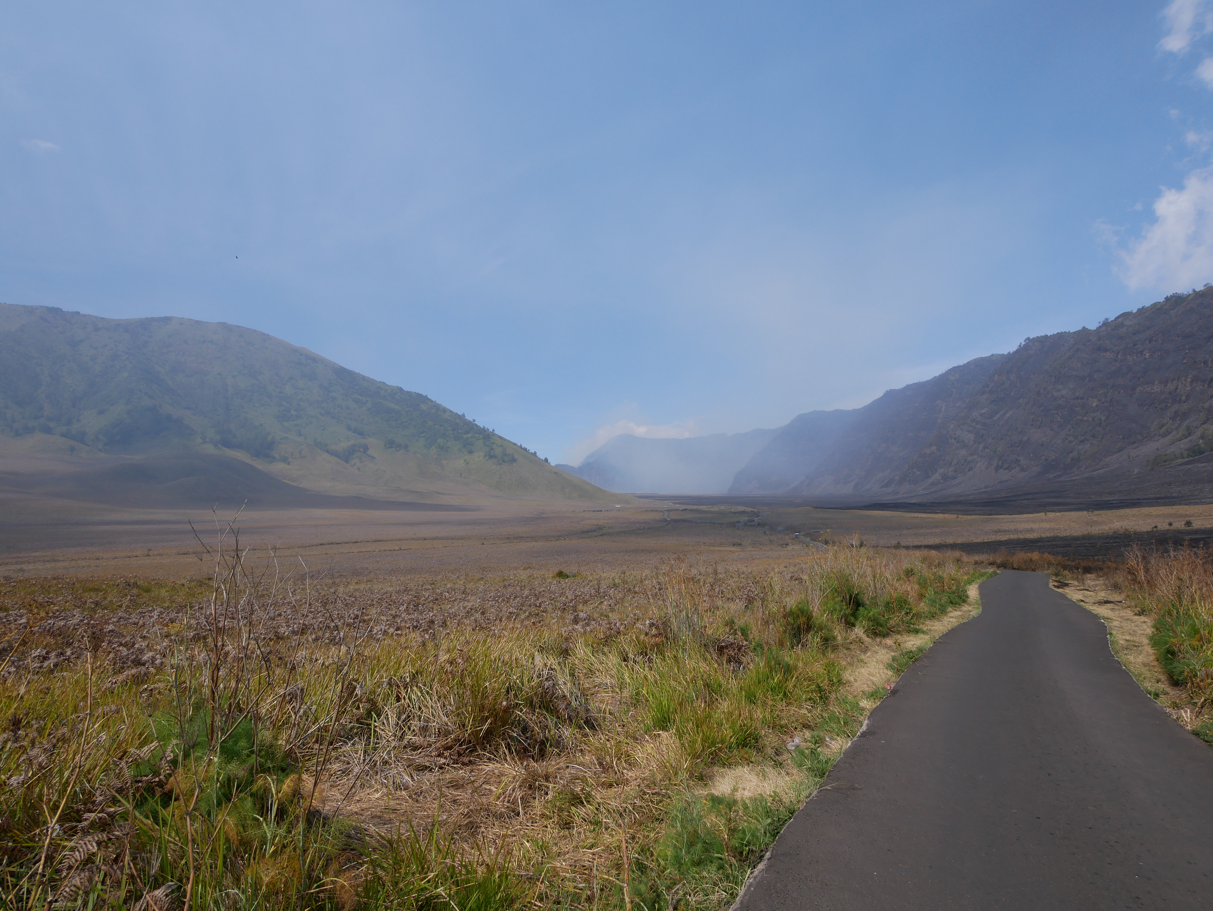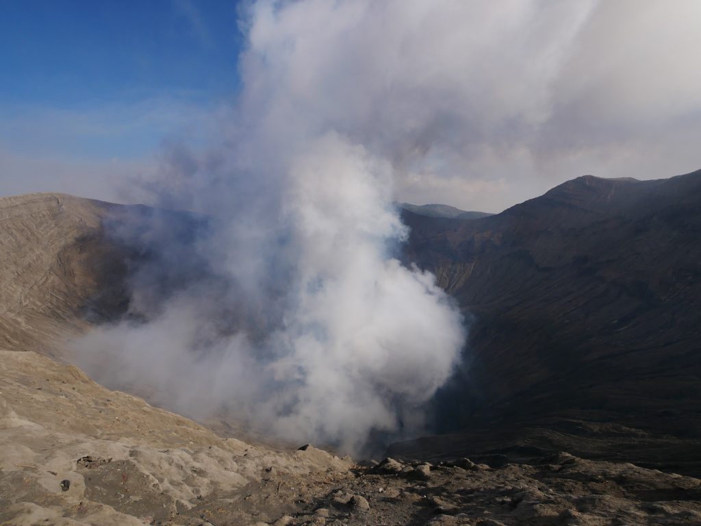 Nachdem wir den Parkplatz und unseren Scooter wieder erreicht hatten, fuhren wir die schmale Bergstraße weiter Richtung Bromo. Es ging noch sehr lange bergauf, bis wir irgendwann ganz oben angekommen waren. Direkt neben der Straße fiel der Hang steil ab, und gab einen wunderbaren Blick auf ein großes, flaches Tal frei. In der Mitte des Tales sahen wir schon von weitem die drei Vulkane aufragen. Die Straße führte hinab in das Tal und wurde irgendwann zum Sandweg. Je weiter wir fuhren, desto staubiger wurde die Straße. Nach einer Weile verschwand die Straße komplett, vor uns lag nur noch kilometerweit der schwarze Sand, den die Vulkane abgelagert hatten. Vereinzelt zogen sich Motorrad- oder Jeepspuren hindurch. Mit unserem kleinen Scooter waren wir jedoch chancenlos und mussten umdrehen. Nach einem Kilometer kamen wir wieder an einer Art Parkplatz vorbei, und hier waren ein paar Bauarbeiter anwesend, die eine Hütte bauten. Sie waren schnell bereit, uns zu helfen. Für ein kleines Trinkgeld stellten wir unser Motorrad unter ihre Aufsicht, und zwei von ihnen starteten ihre Crossmotorräder. Die beiden hatten offensichtlich sehr viel Erfahrung in diesem Gelände. Zumindest hoffte ich das, als wir mit einer Geschwindigkeit von 100 km/h (!) durch die Sandwüste fuhren. Ein paar Mal haben die Motorräder gefährlich geschaukelt, der knietiefe Sand ist schon ein herausforderndes Terrain. Schon nach zehn Minuten hatten wir den Fuß des Bromo erreicht. Der Krater ragte steil aus der Wüste heraus, schon von unten war das laute Grollen hörbar. Es gab einen kleinen Pfad, der nach oben führte. Der Kraterrand war sehr schmal, und auf einem Weg konnte man den Krater umrunden. Es gab meist keinen Zaun, und es ging nach links und rechts ziemlich steil hinab. Der Vulkankrater gehört zu den beeindruckendsten Dingen, die ich jemals gesehen habe. Mit sehr lautem Donnern bahnten sich große Rauchwolken ihren Weg aus dem Schlot. Hier oben stank die Luft stark nach verbranntem Schwefel. Interessant waren auch die noch sichtbaren versteinerten Lavaströme am Kraterrand.