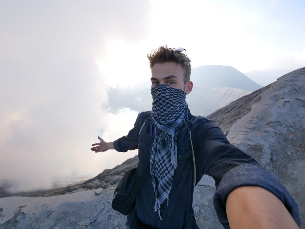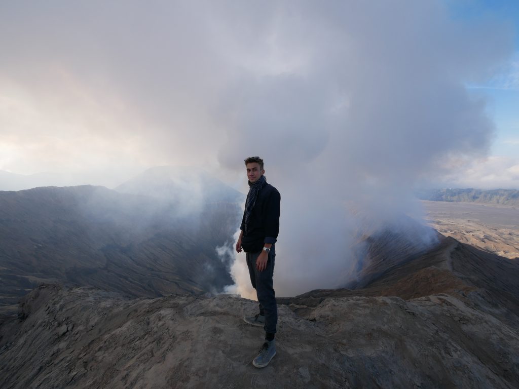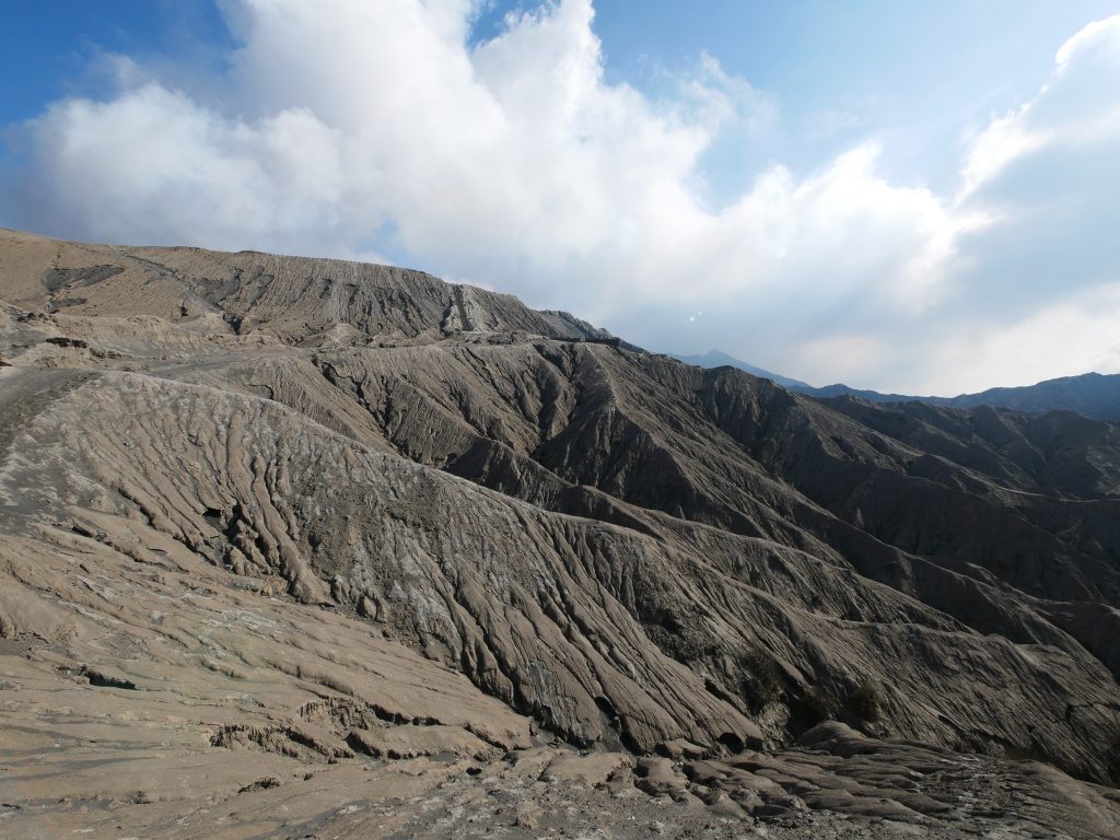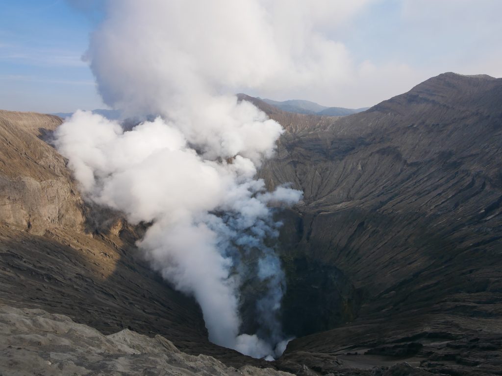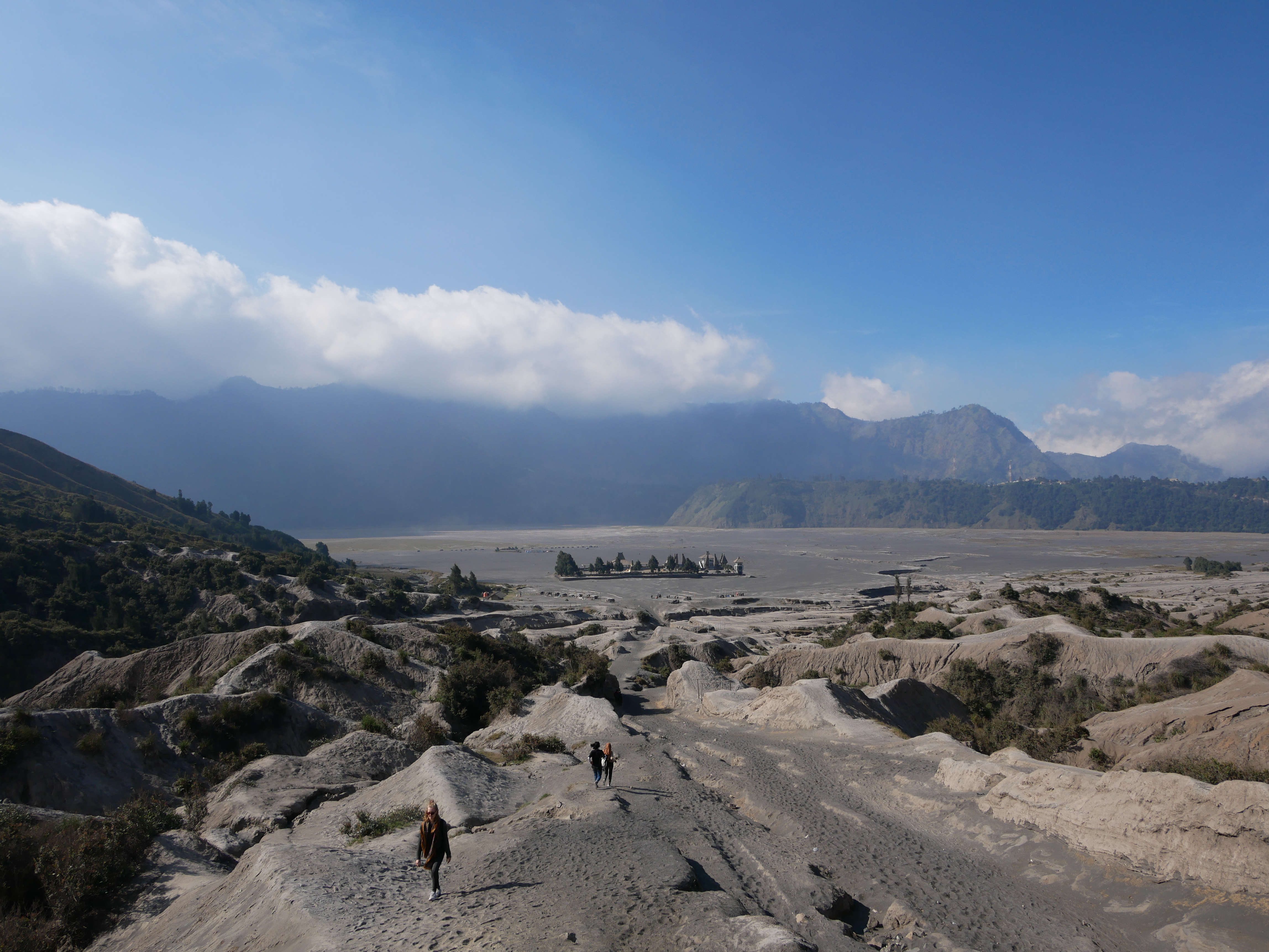 Nachdem wir den Parkplatz und unseren Scooter wieder erreicht hatten, fuhren wir die schmale Bergstraße weiter Richtung Bromo. Es ging noch sehr lange bergauf, bis wir irgendwann ganz oben angekommen waren. Direkt neben der Straße fiel der Hang steil ab, und gab einen wunderbaren Blick auf ein großes, flaches Tal frei. In der Mitte des Tales sahen wir schon von weitem die drei Vulkane aufragen. Die Straße führte hinab in das Tal und wurde irgendwann zum Sandweg. Je weiter wir fuhren, desto staubiger wurde die Straße. Nach einer Weile verschwand die Straße komplett, vor uns lag nur noch kilometerweit der schwarze Sand, den die Vulkane abgelagert hatten. Vereinzelt zogen sich Motorrad- oder Jeepspuren hindurch. Mit unserem kleinen Scooter waren wir jedoch chancenlos und mussten umdrehen. Nach einem Kilometer kamen wir wieder an einer Art Parkplatz vorbei, und hier waren ein paar Bauarbeiter anwesend, die eine Hütte bauten. Sie waren schnell bereit, uns zu helfen. Für ein kleines Trinkgeld stellten wir unser Motorrad unter ihre Aufsicht, und zwei von ihnen starteten ihre Crossmotorräder. Die beiden hatten offensichtlich sehr viel Erfahrung in diesem Gelände. Zumindest hoffte ich das, als wir mit einer Geschwindigkeit von 100 km/h (!) durch die Sandwüste fuhren. Ein paar Mal haben die Motorräder gefährlich geschaukelt, der knietiefe Sand ist schon ein herausforderndes Terrain. Schon nach zehn Minuten hatten wir den Fuß des Bromo erreicht. Der Krater ragte steil aus der Wüste heraus, schon von unten war das laute Grollen hörbar. Es gab einen kleinen Pfad, der nach oben führte. Der Kraterrand war sehr schmal, und auf einem Weg konnte man den Krater umrunden. Es gab meist keinen Zaun, und es ging nach links und rechts ziemlich steil hinab. Der Vulkankrater gehört zu den beeindruckendsten Dingen, die ich jemals gesehen habe. Mit sehr lautem Donnern bahnten sich große Rauchwolken ihren Weg aus dem Schlot. Hier oben stank die Luft stark nach verbranntem Schwefel. Interessant waren auch die noch sichtbaren versteinerten Lavaströme am Kraterrand.
