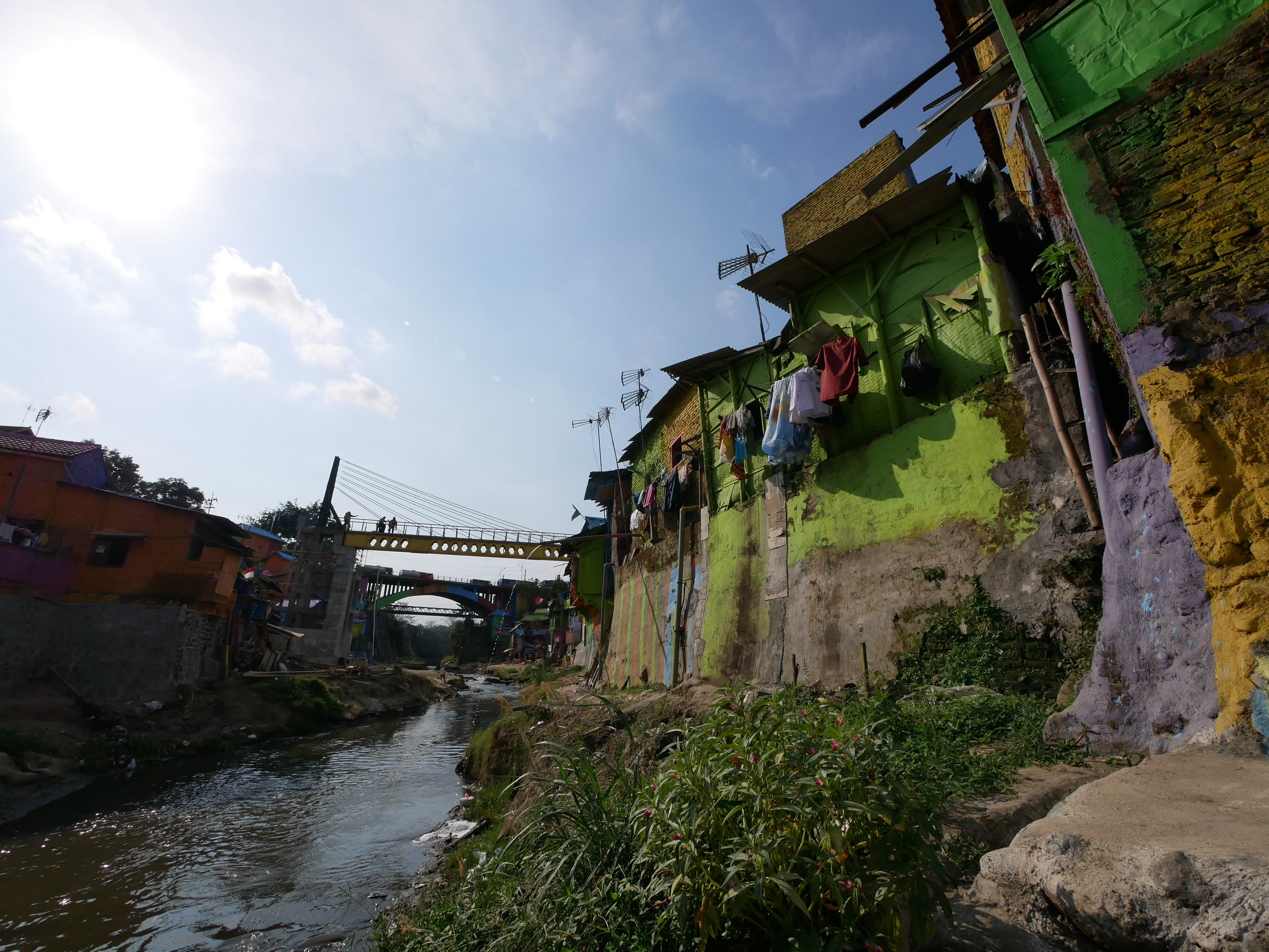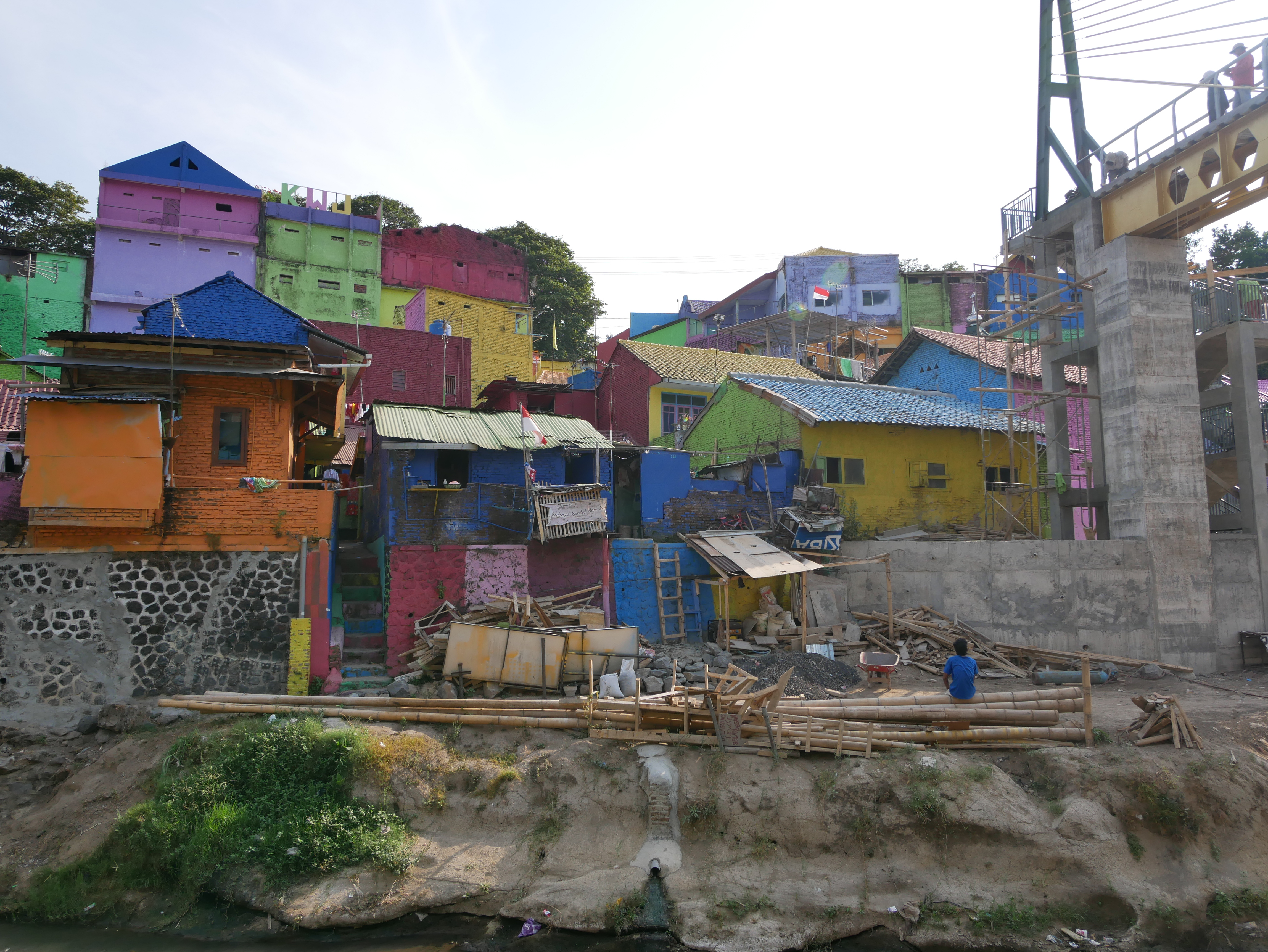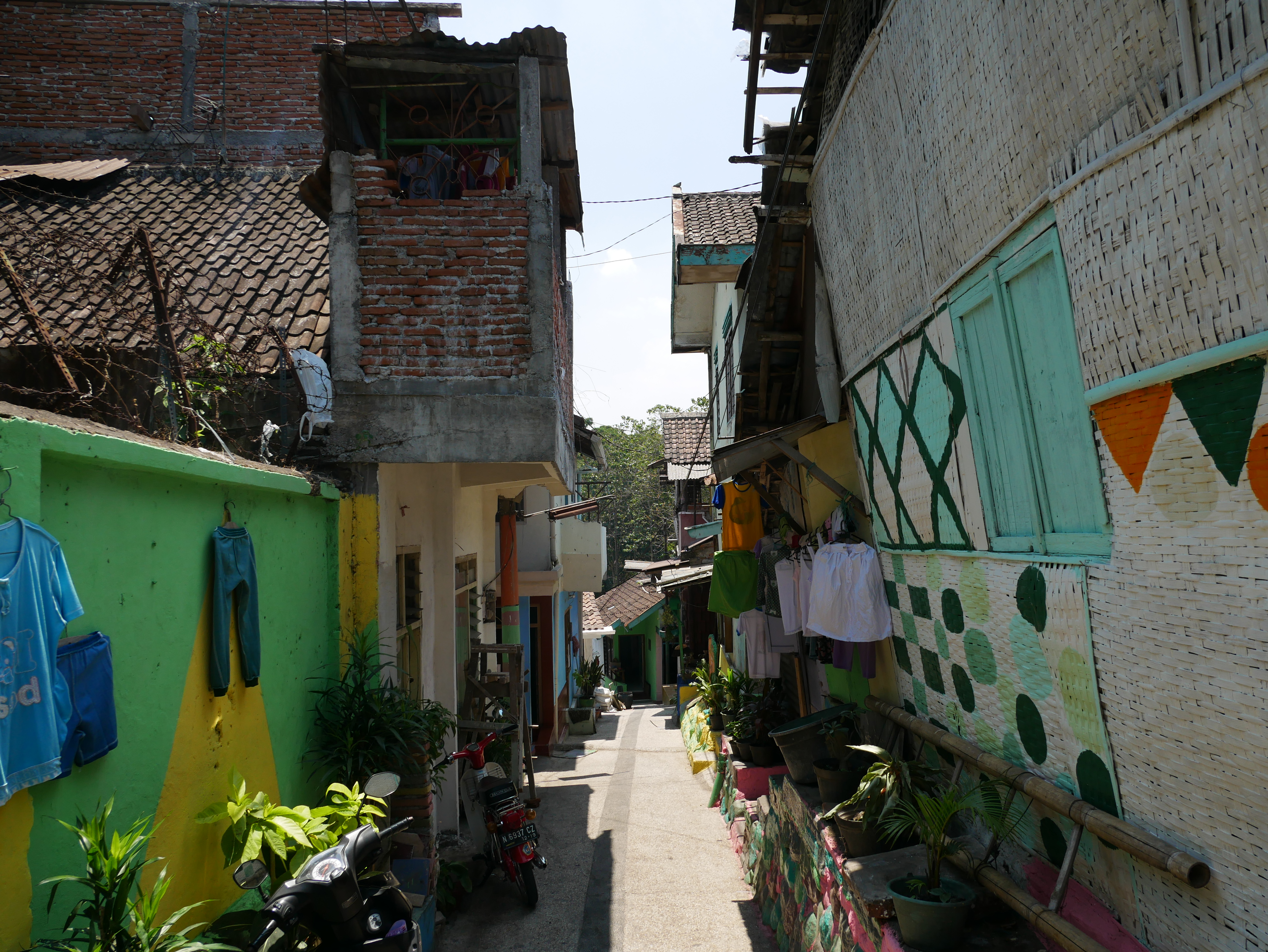 Am folgenden Tag brauchten wir erstmal eine Pause. Wir haben ausführlich die Stadt erkundet. Sie ist kleiner als Jakarta und Yogyakarta. Es gibt einige sehr schöne Ecken hier. Zum Beispiel einen Stadtteil am Fluss, in dem die Bewohner ihre kleinen Hütten sehr bunt angemalt haben. Hier schauten wir auch einem Sprayer bei der Arbeit zu und wurden von den Anwohnern mit Kaffee und Frühlingsrollen bewirtet.