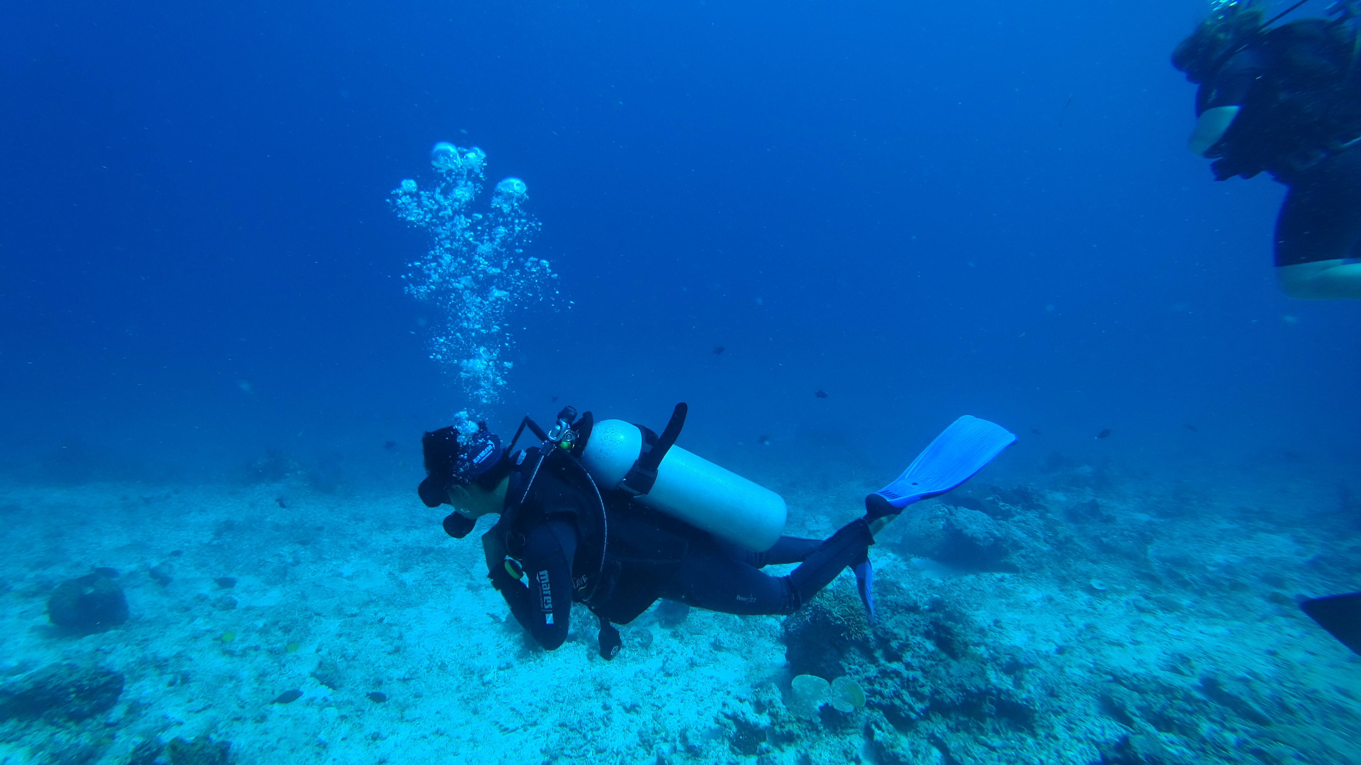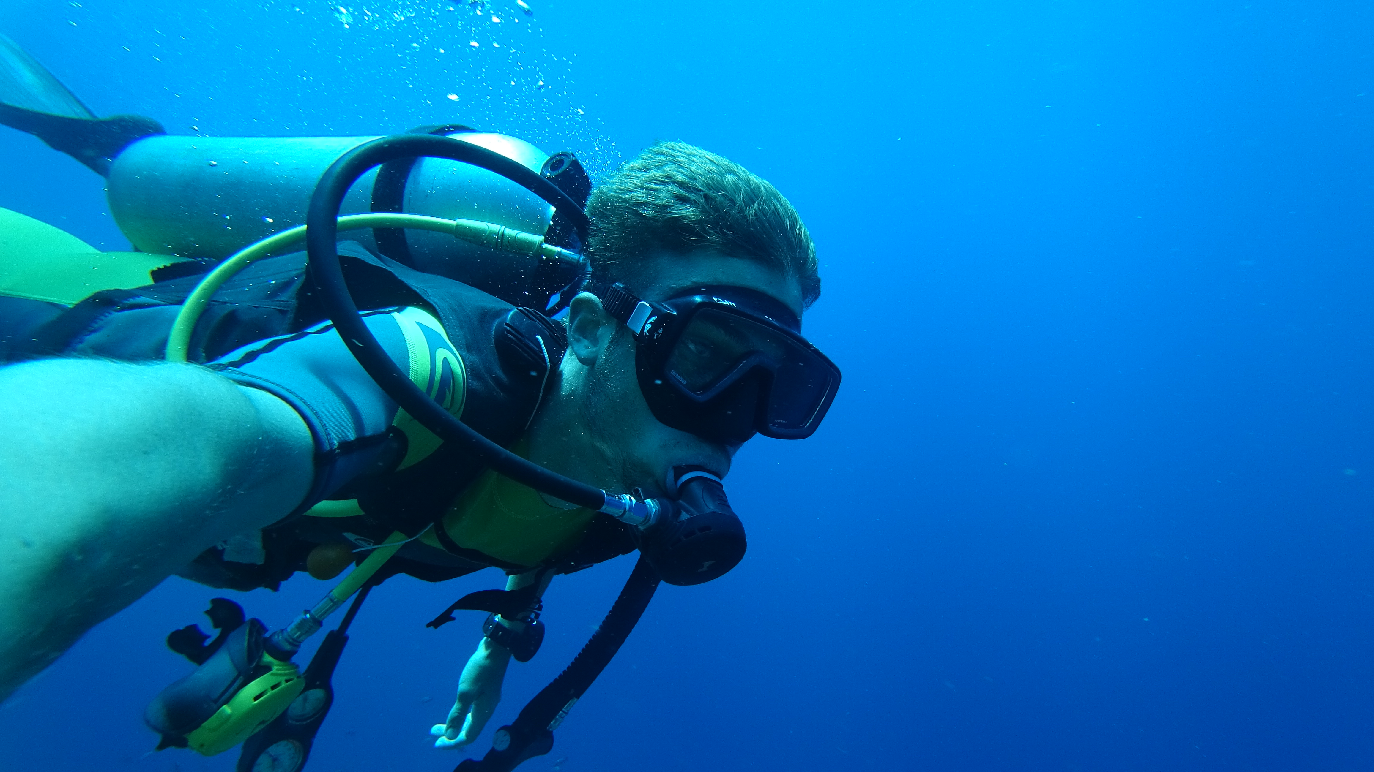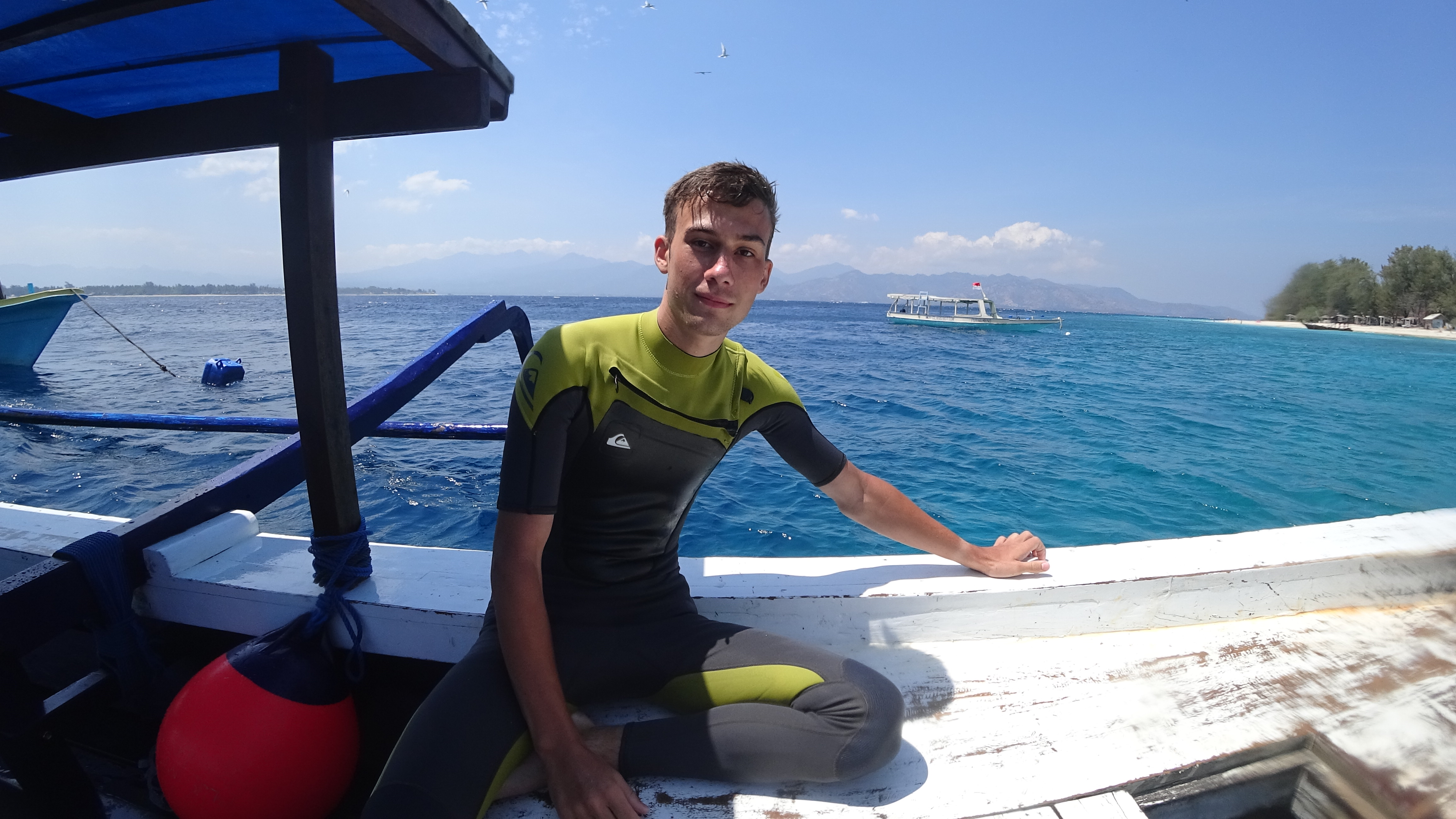 Am nächsten Morgen habe ich sogar einen Tauchgang gemacht, den ersten seit ungefähr sechs Monaten. Hier auf Meno gibt es eine sehr gute Tauchschule: Blue Marlin Dive. Hier kostet der Tauchgang circa 30 Euro. Mit dem Boot sind wir früh am Morgen Richtung Gili T gefahren, und waren dann zu viert für ungefähr eine Stunde unter Wasser. Auch hier waren die Korallen ähnlich bleich, aber unter Wasser gab es trotzdem viel zu sehen: Fischschwärme, Schildkröten, kleine Riffhaie und Oktopusse. Ich konnte endlich mal meine neue Kamera – die Sony X3000 – unter Wasser testen. Ich habe nur sehr wenig Fotos gemacht, und hauptsächlich Videos.