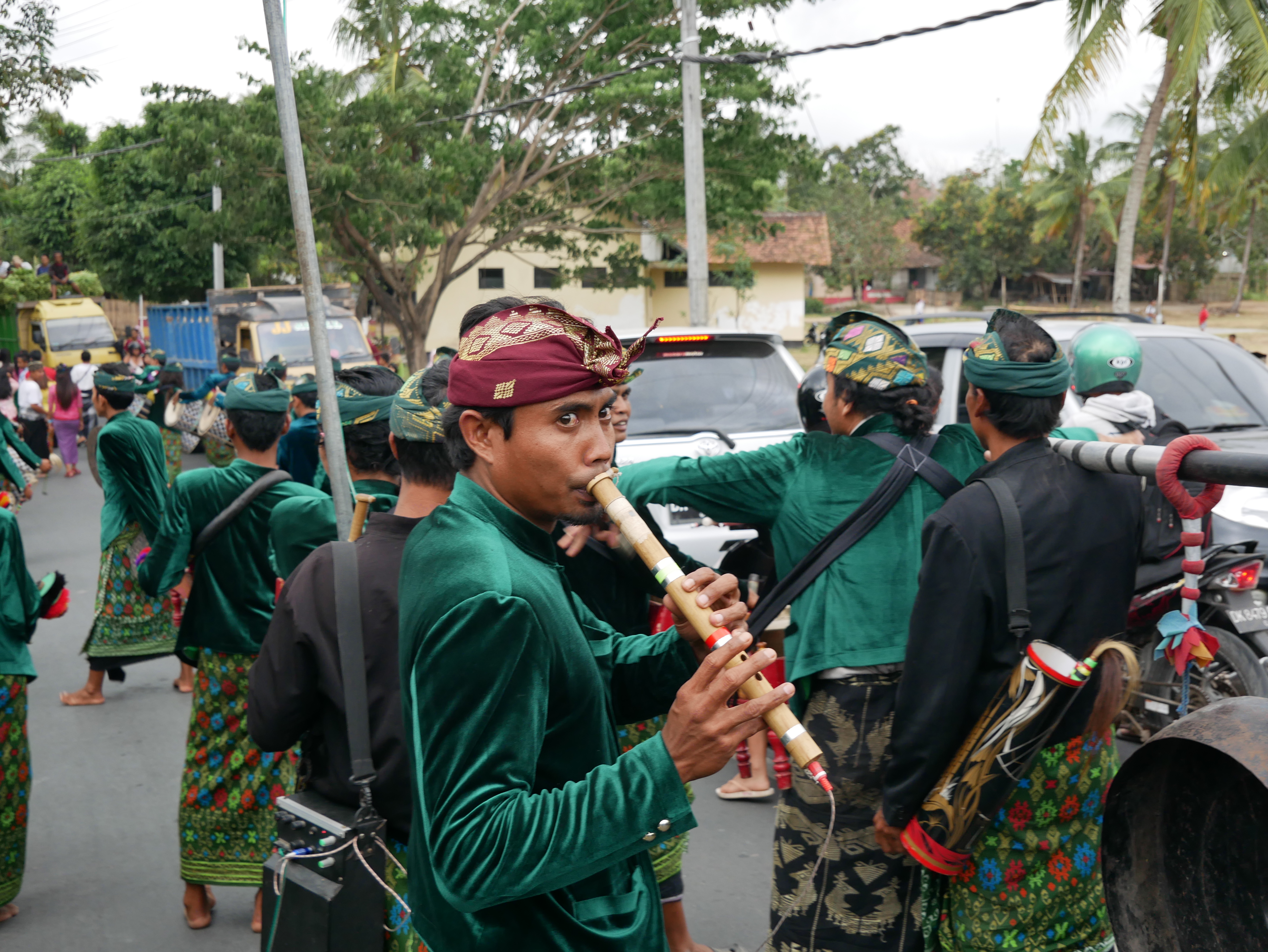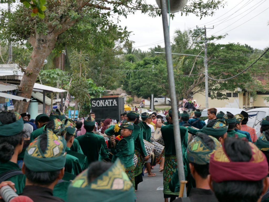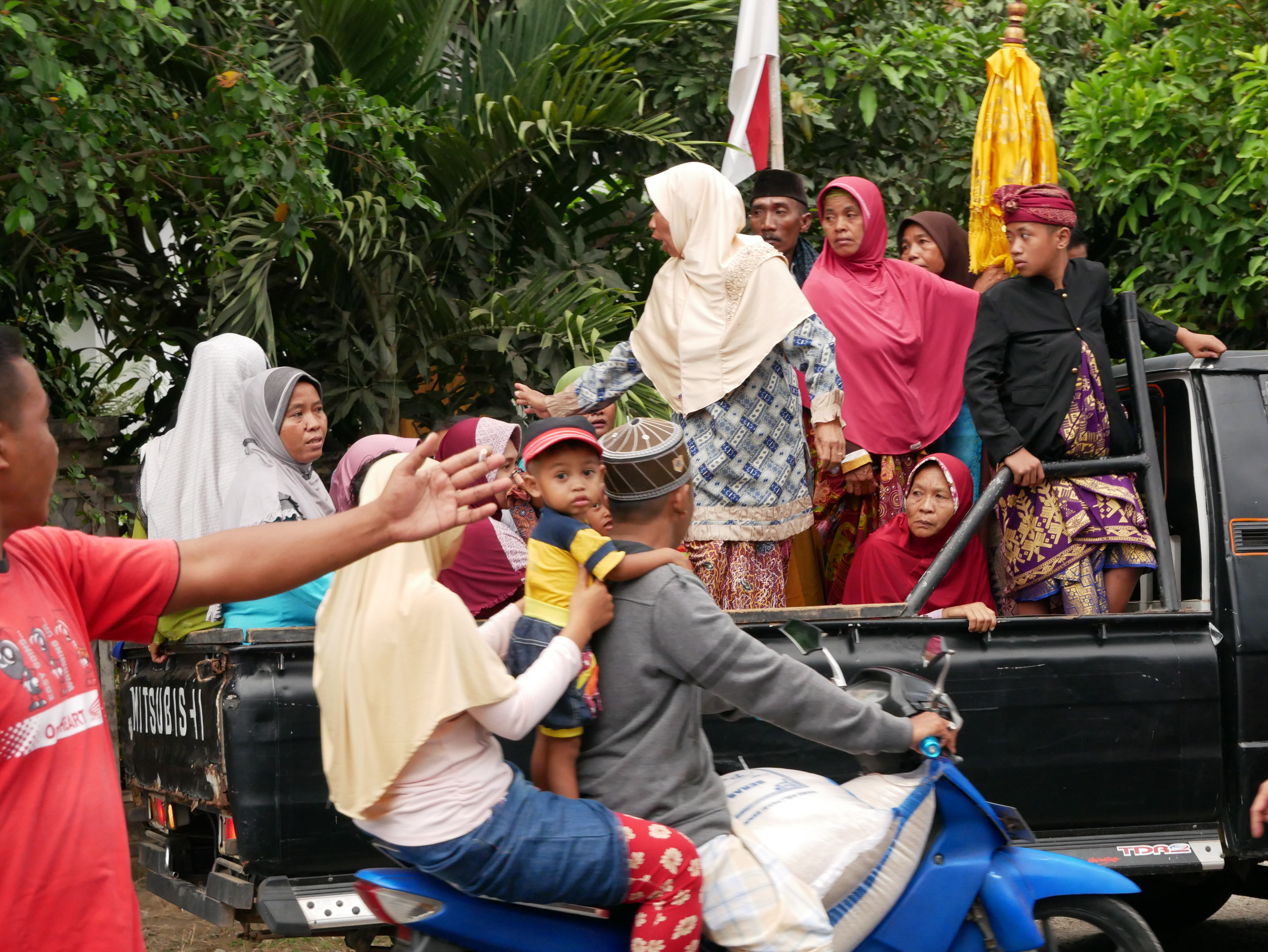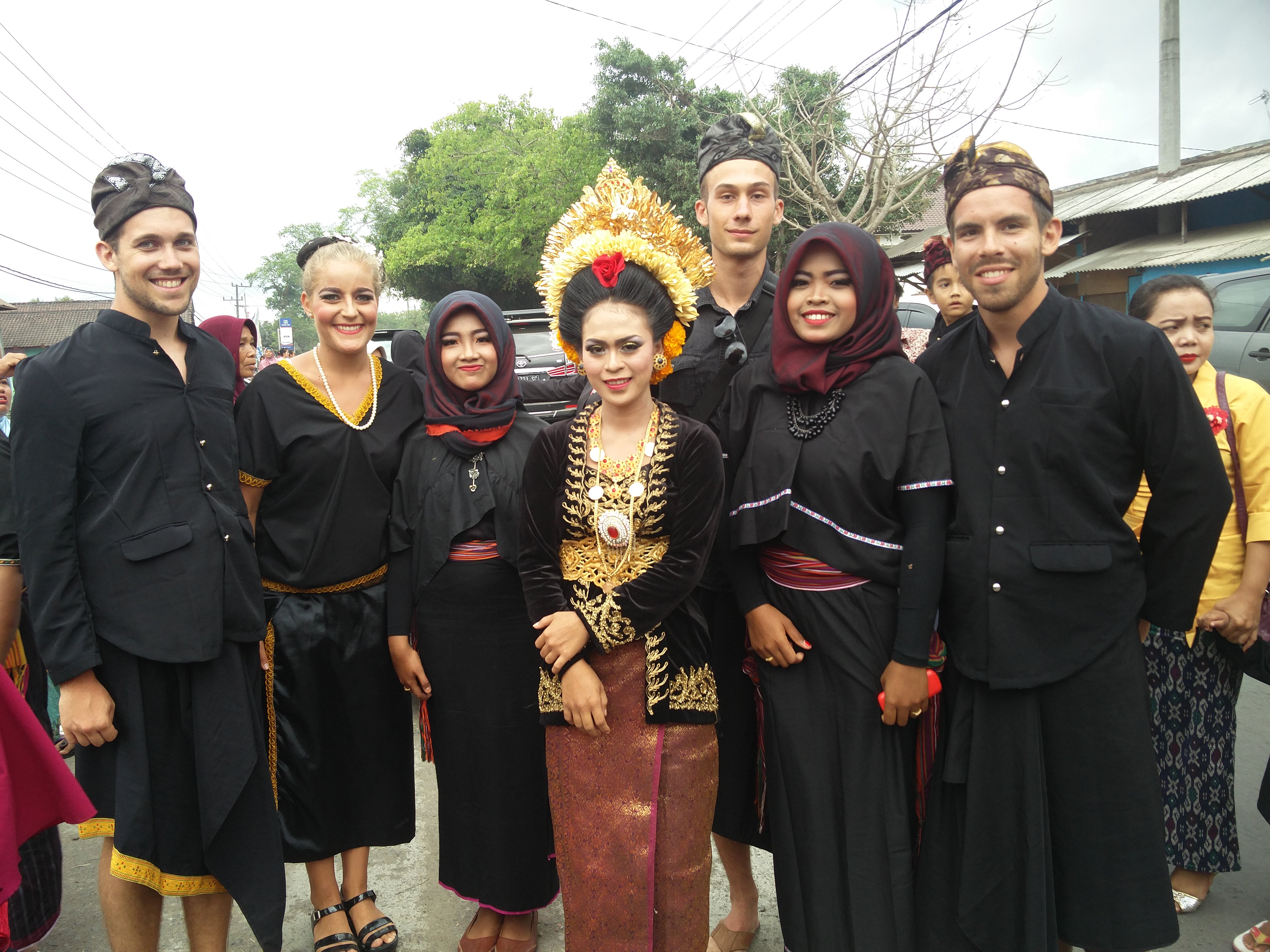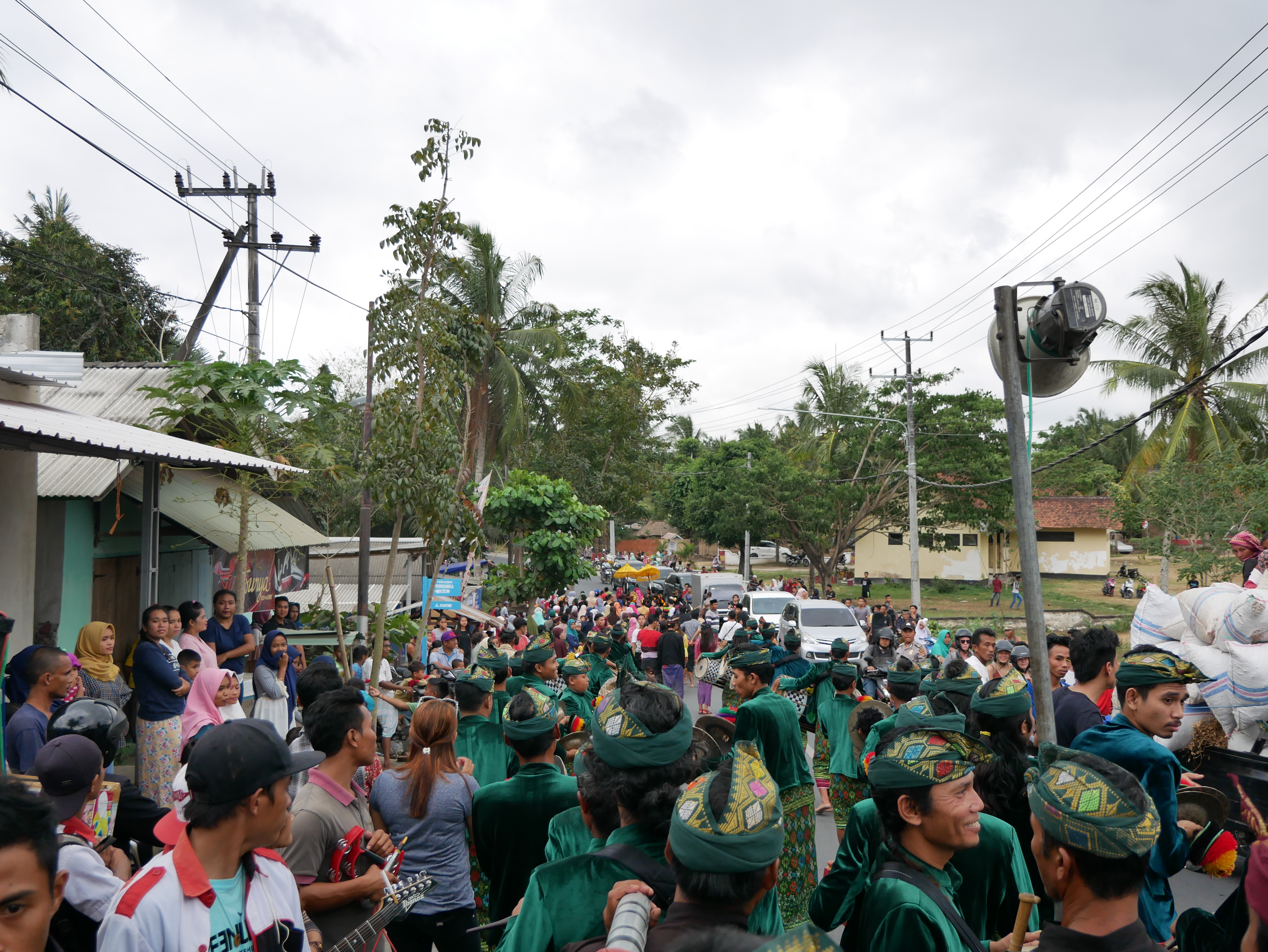 Wir sind mit ungefähr 200 Gästen durch die Stadt gezogen. Vorne laufen traditionell die Frauen und die Braut. Dann folgt eine Gruppe von Musikern und dahinter kommen der Bräutigam und die männlichen Gäste. Wir wurden von eifrigen Verwandten in die erste Reihe geschoben, damit man uns möglichst auf allen Fotos sieht. Ob das auch der Wunsch des Bräutigams war, der uns natürlich weder kannte noch erwartet hatte, ist mir unklar. Aber weder er noch wir konnten etwas einwenden. Die Polizei hatte für diesen Umzug extra ein paar Straßen gesperrt, und sowohl die indonesischen Autofahrer als auch die Bewohner der Stadt verzogen fröhlich erstaunt die Gesichter, wenn wir vorbeizogen. Alle Gäste waren sehr freundlich und haben uns nett aufgenommen.