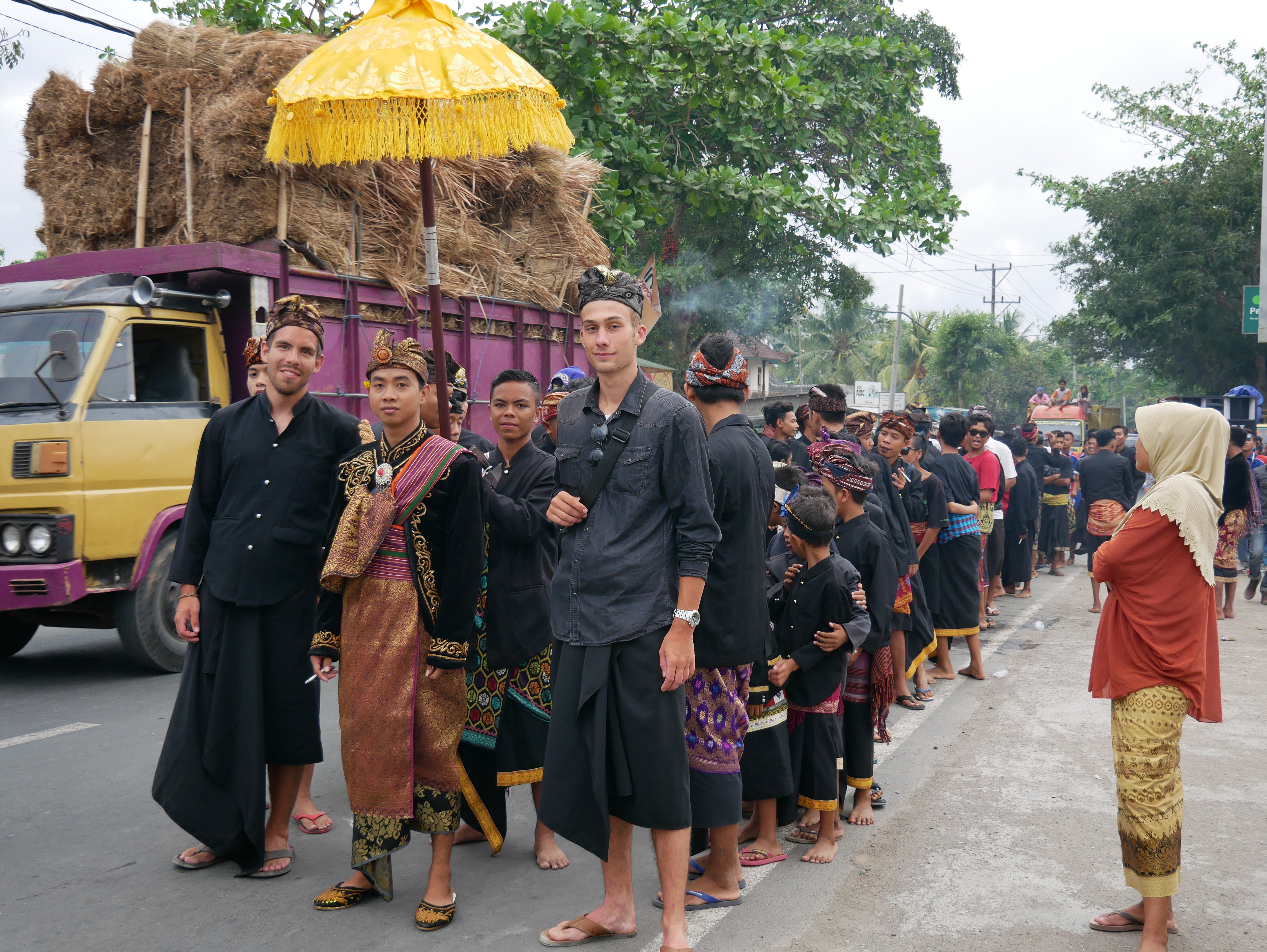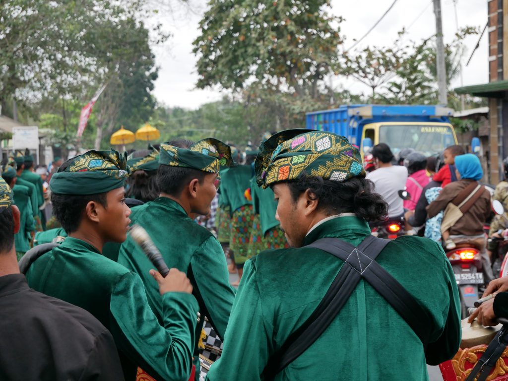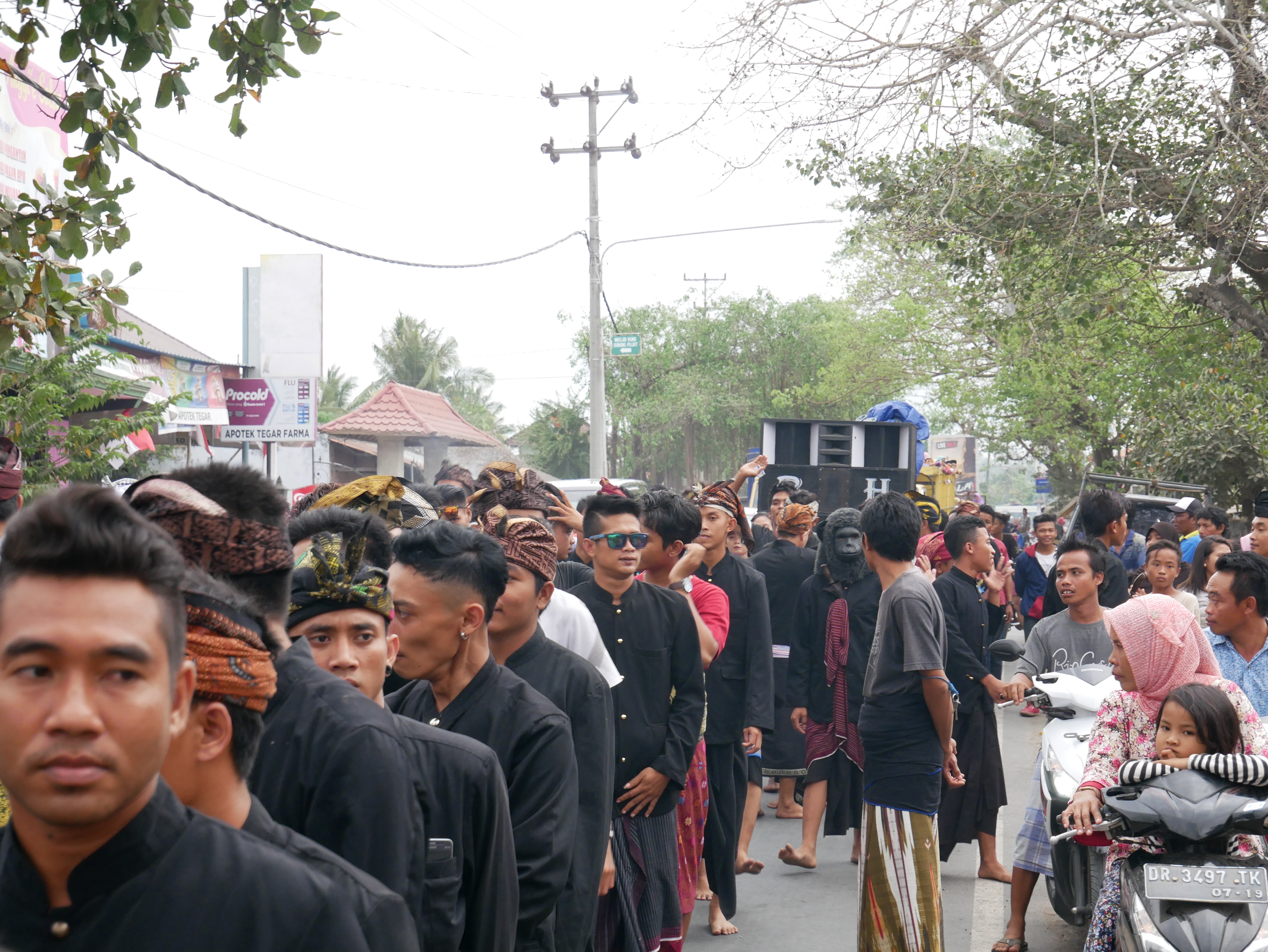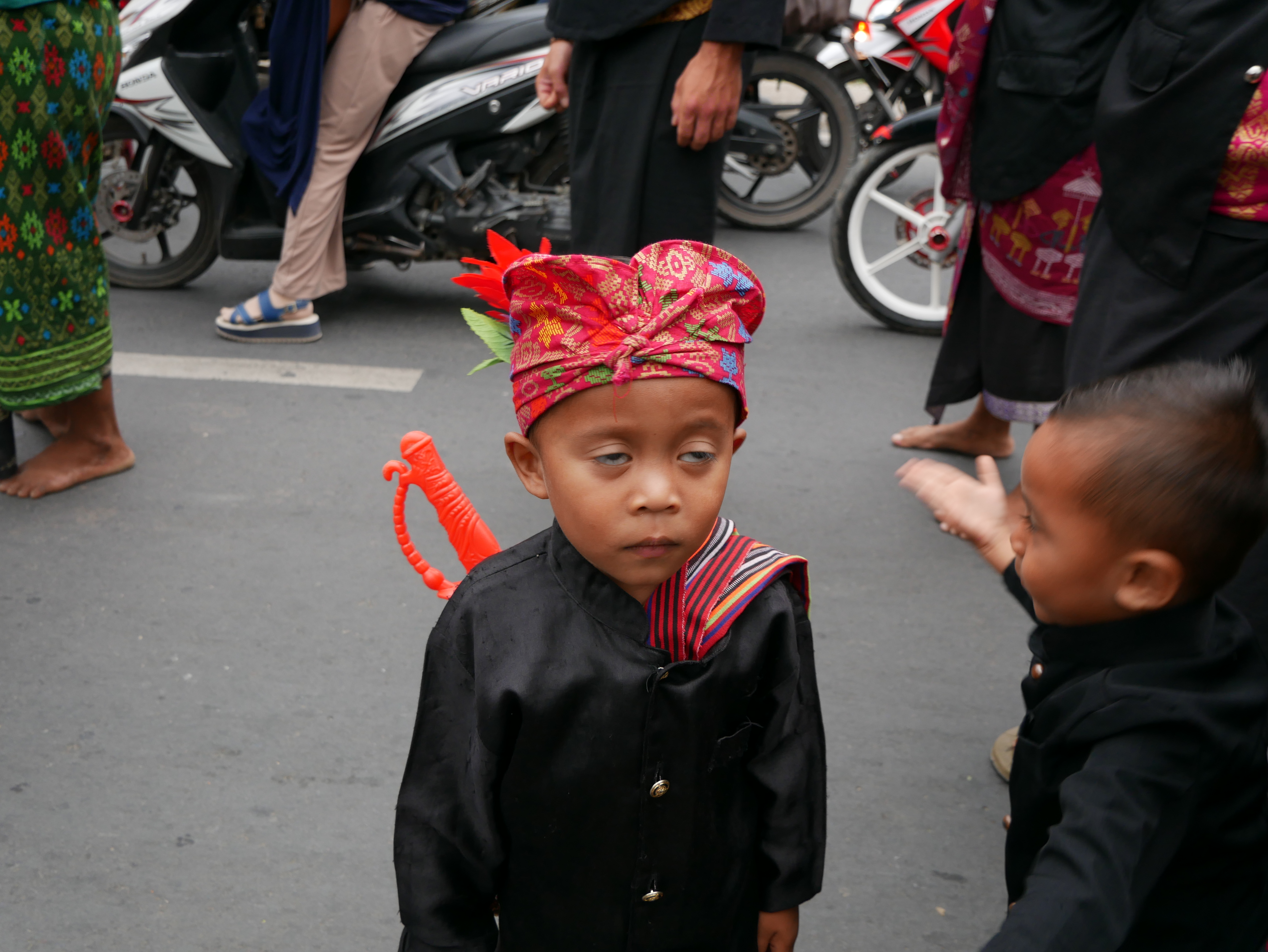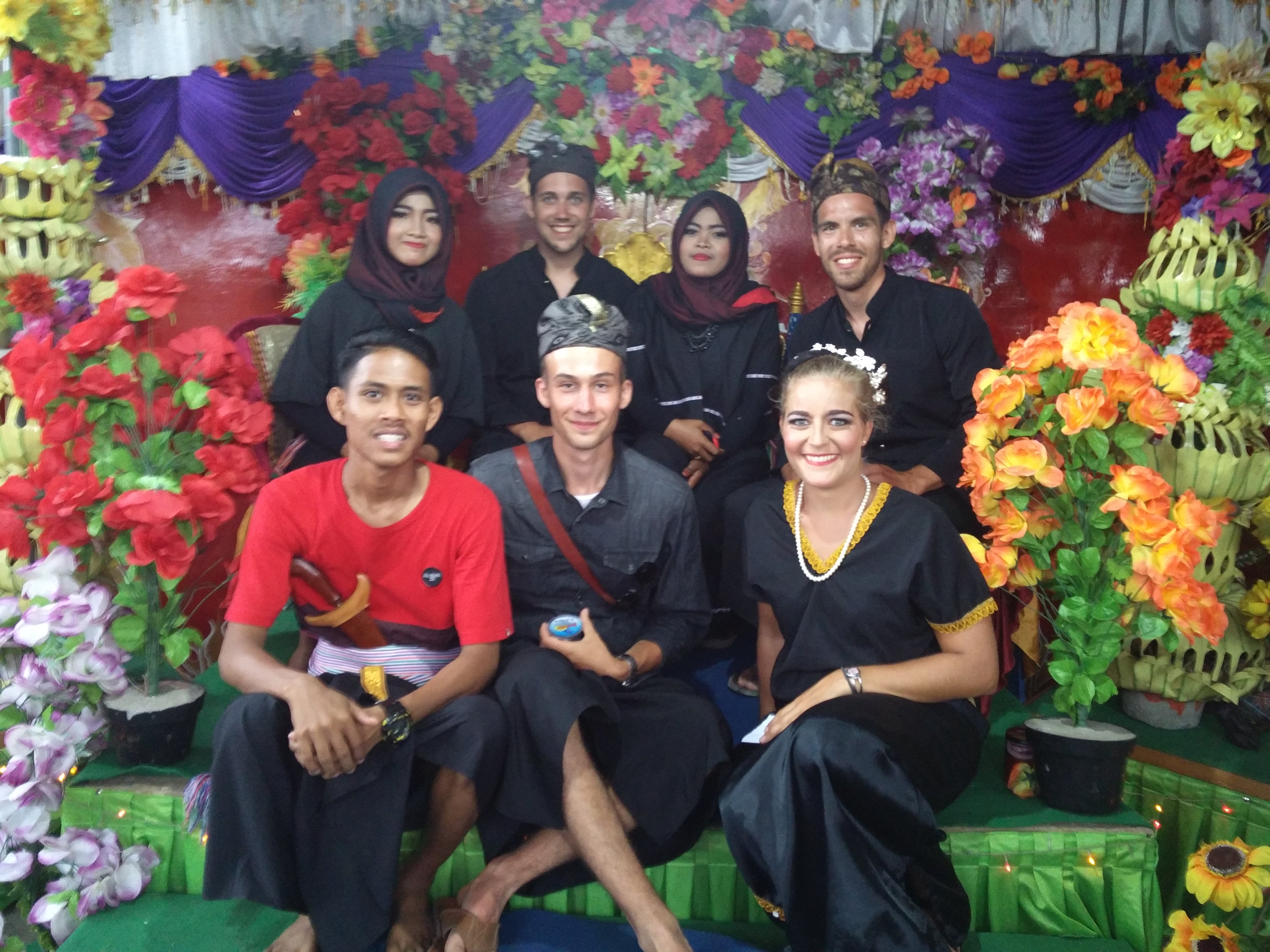 Wir sind mit ungefähr 200 Gästen durch die Stadt gezogen. Vorne laufen traditionell die Frauen und die Braut. Dann folgt eine Gruppe von Musikern und dahinter kommen der Bräutigam und die männlichen Gäste. Wir wurden von eifrigen Verwandten in die erste Reihe geschoben, damit man uns möglichst auf allen Fotos sieht. Ob das auch der Wunsch des Bräutigams war, der uns natürlich weder kannte noch erwartet hatte, ist mir unklar. Aber weder er noch wir konnten etwas einwenden. Die Polizei hatte für diesen Umzug extra ein paar Straßen gesperrt, und sowohl die indonesischen Autofahrer als auch die Bewohner der Stadt verzogen fröhlich erstaunt die Gesichter, wenn wir vorbeizogen. Alle Gäste waren sehr freundlich und haben uns nett aufgenommen.