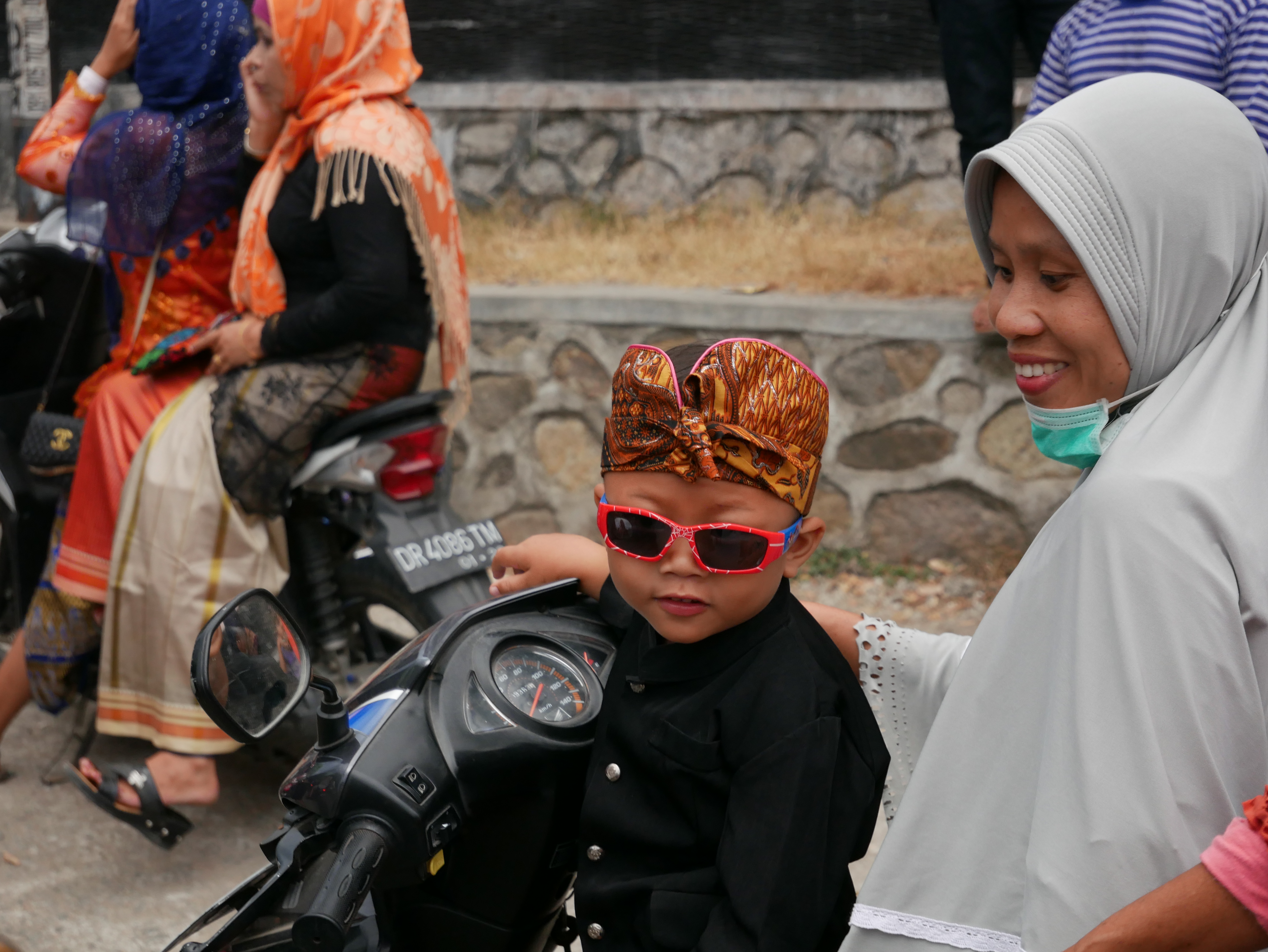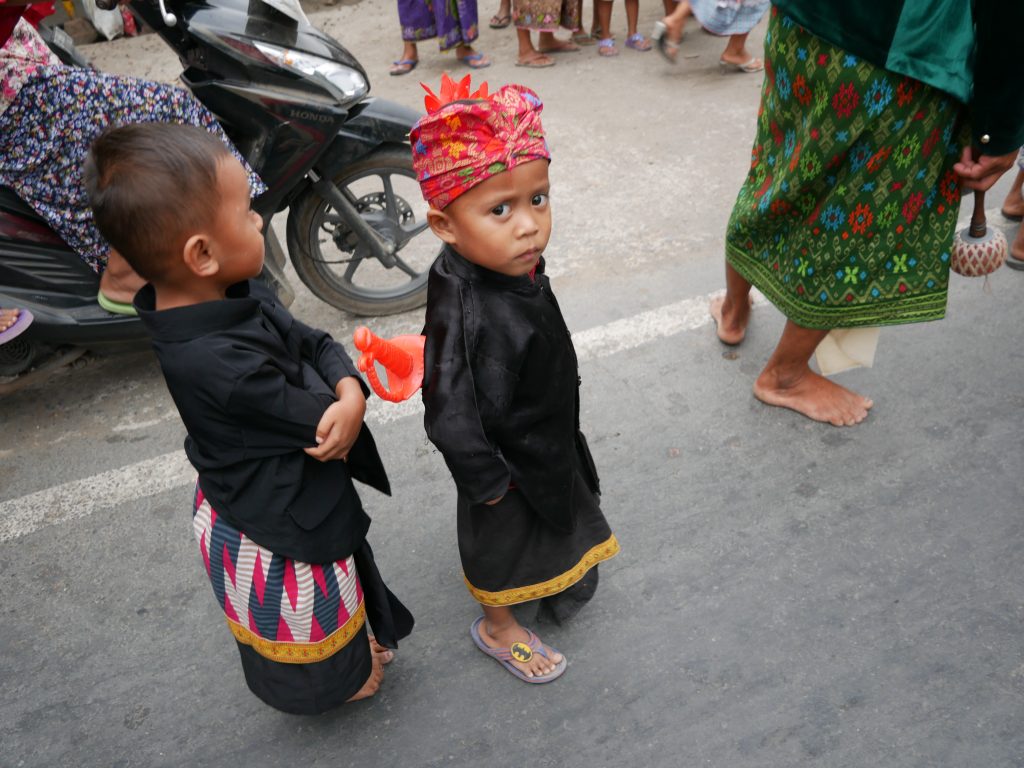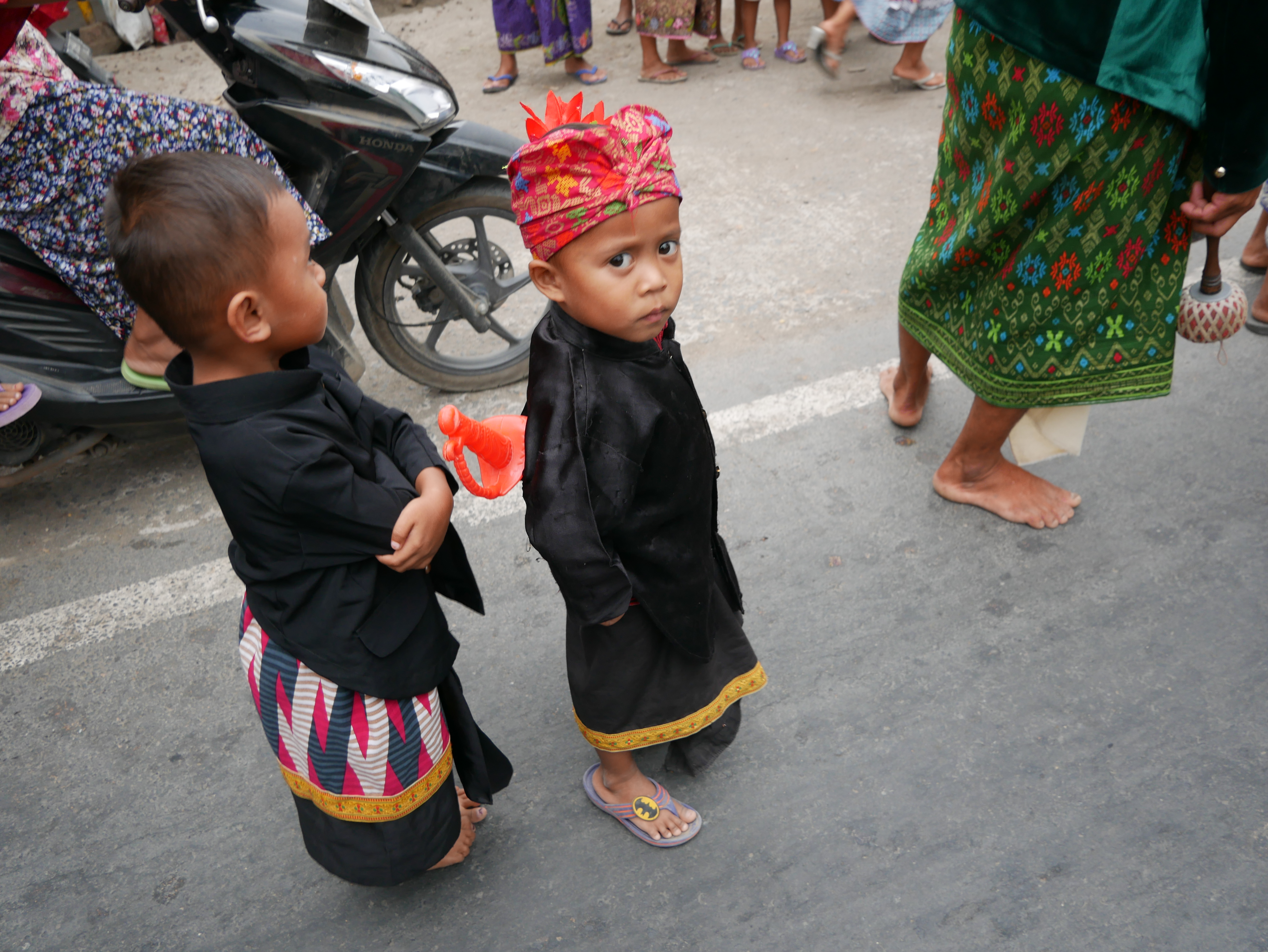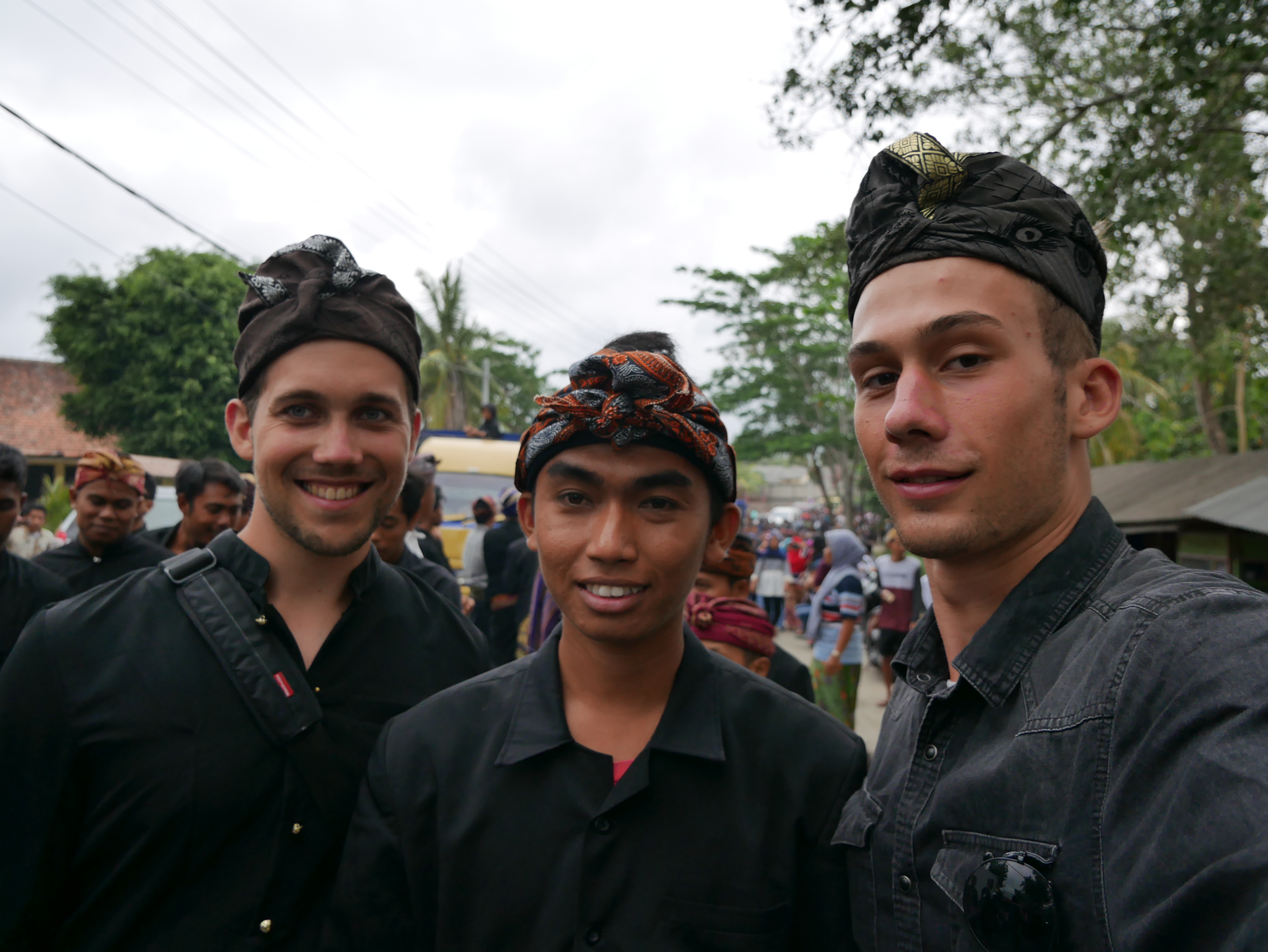 Wir sind mit ungefähr 200 Gästen durch die Stadt gezogen. Vorne laufen traditionell die Frauen und die Braut. Dann folgt eine Gruppe von Musikern und dahinter kommen der Bräutigam und die männlichen Gäste. Wir wurden von eifrigen Verwandten in die erste Reihe geschoben, damit man uns möglichst auf allen Fotos sieht. Ob das auch der Wunsch des Bräutigams war, der uns natürlich weder kannte noch erwartet hatte, ist mir unklar. Aber weder er noch wir konnten etwas einwenden. Die Polizei hatte für diesen Umzug extra ein paar Straßen gesperrt, und sowohl die indonesischen Autofahrer als auch die Bewohner der Stadt verzogen fröhlich erstaunt die Gesichter, wenn wir vorbeizogen. Alle Gäste waren sehr freundlich und haben uns nett aufgenommen.