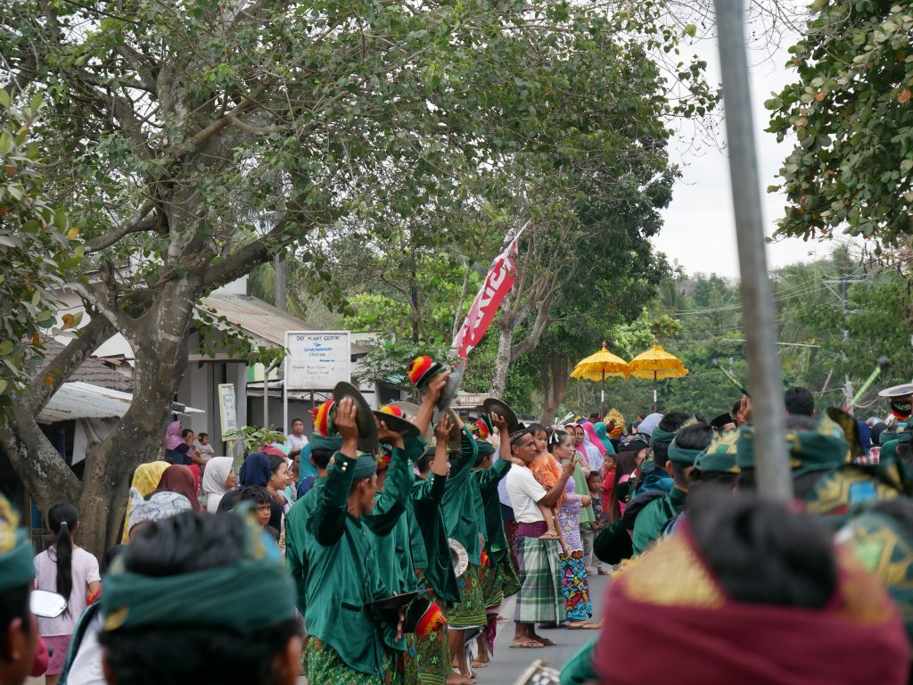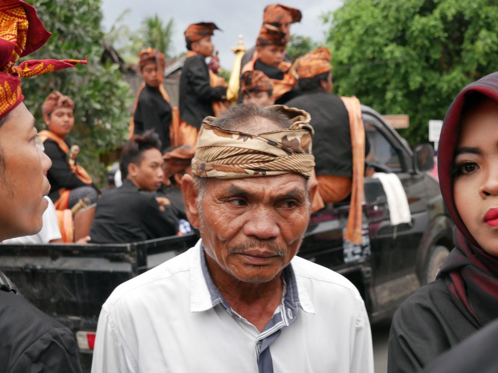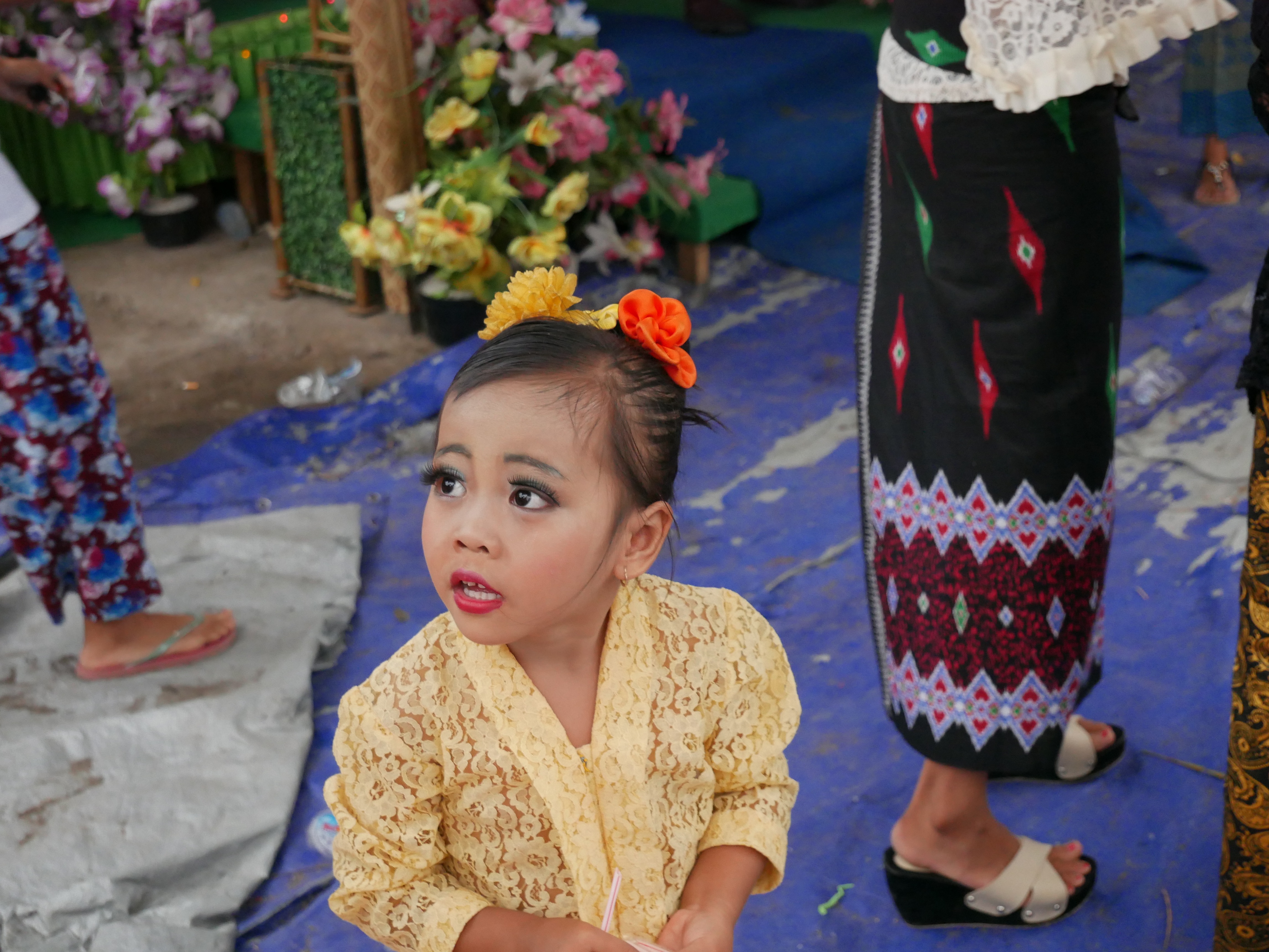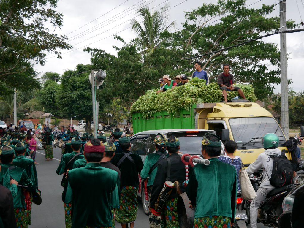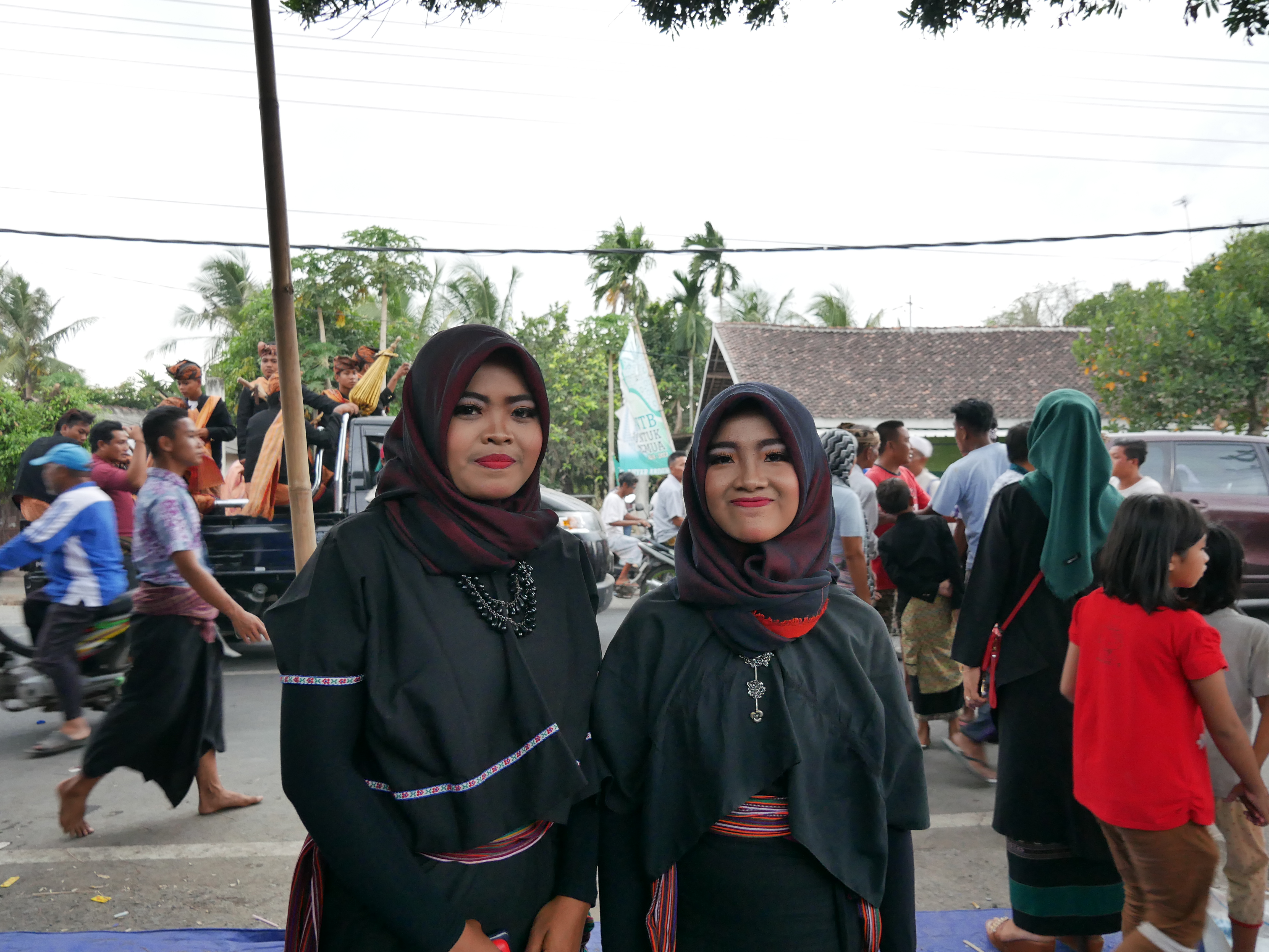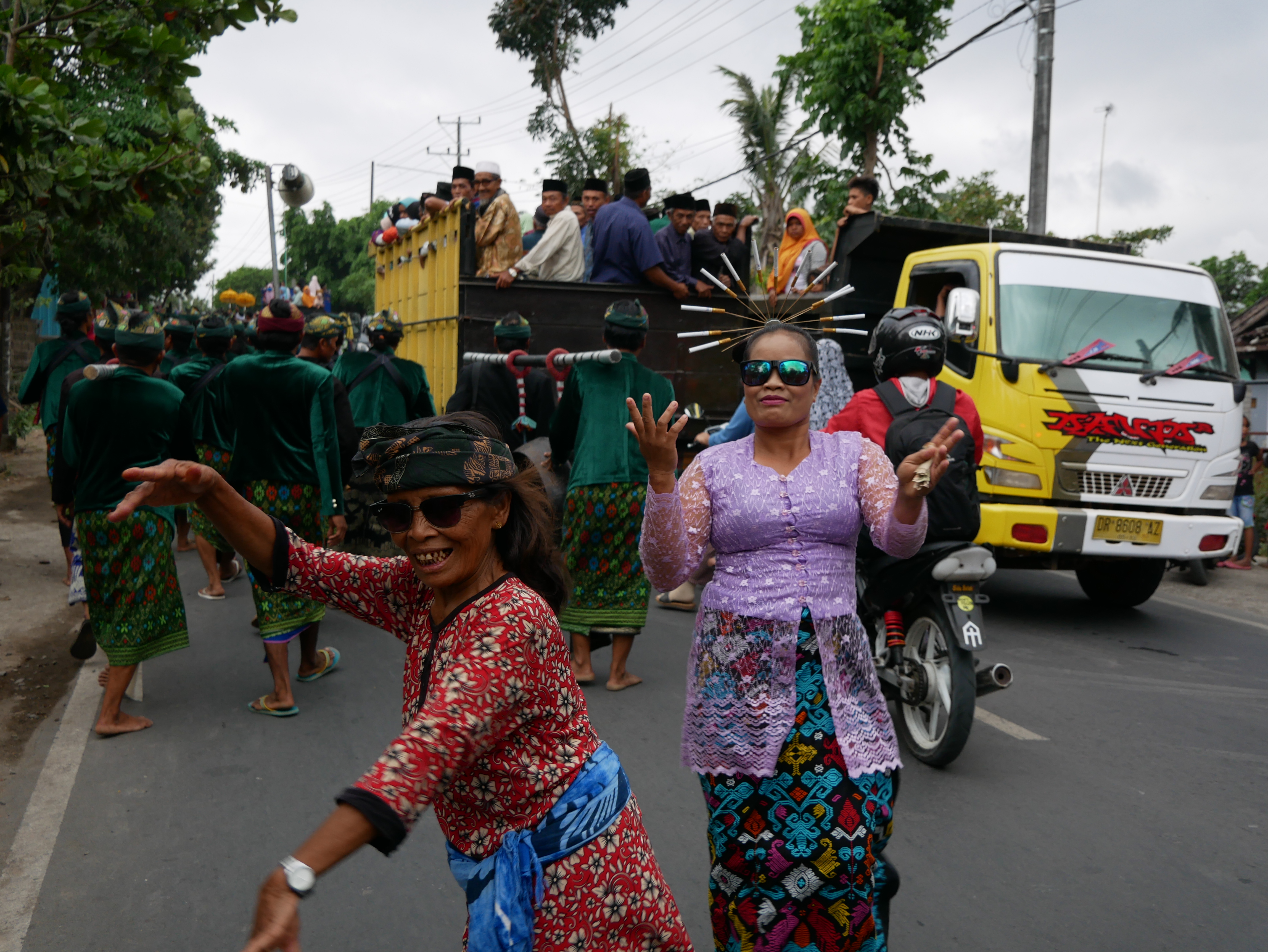Wir sind mit ungefähr 200 Gästen durch die Stadt gezogen. Vorne laufen traditionell die Frauen und die Braut. Dann folgt eine Gruppe von Musikern und dahinter kommen der Bräutigam und die männlichen Gäste. Wir wurden von eifrigen Verwandten in die erste Reihe geschoben, damit man uns möglichst auf allen Fotos sieht. Ob das auch der Wunsch des Bräutigams war, der uns natürlich weder kannte noch erwartet hatte, ist mir unklar. Aber weder er noch wir konnten etwas einwenden. Die Polizei hatte für diesen Umzug extra ein paar Straßen gesperrt, und sowohl die indonesischen Autofahrer als auch die Bewohner der Stadt verzogen fröhlich erstaunt die Gesichter, wenn wir vorbeizogen. Alle Gäste waren sehr freundlich und haben uns nett aufgenommen.