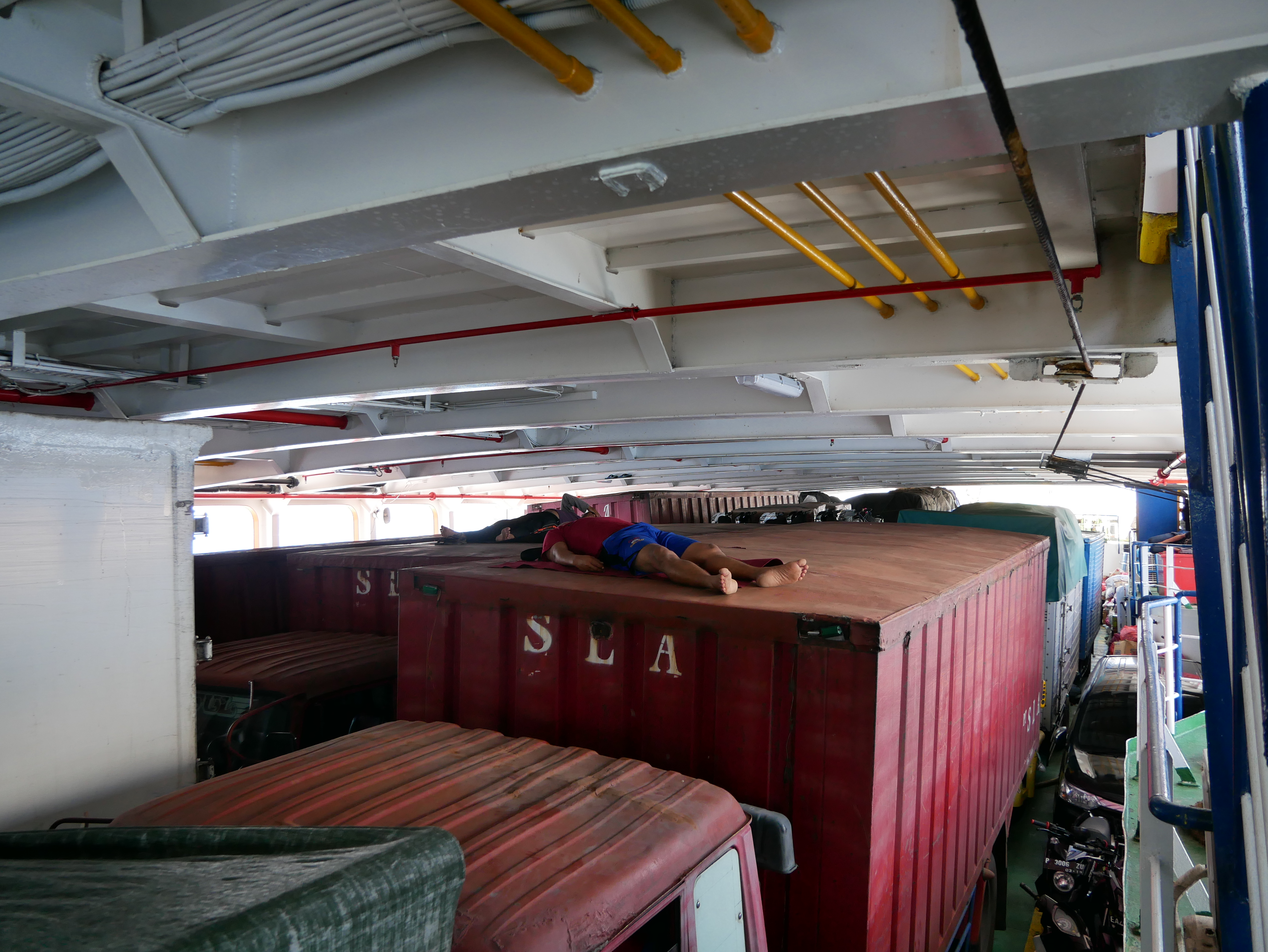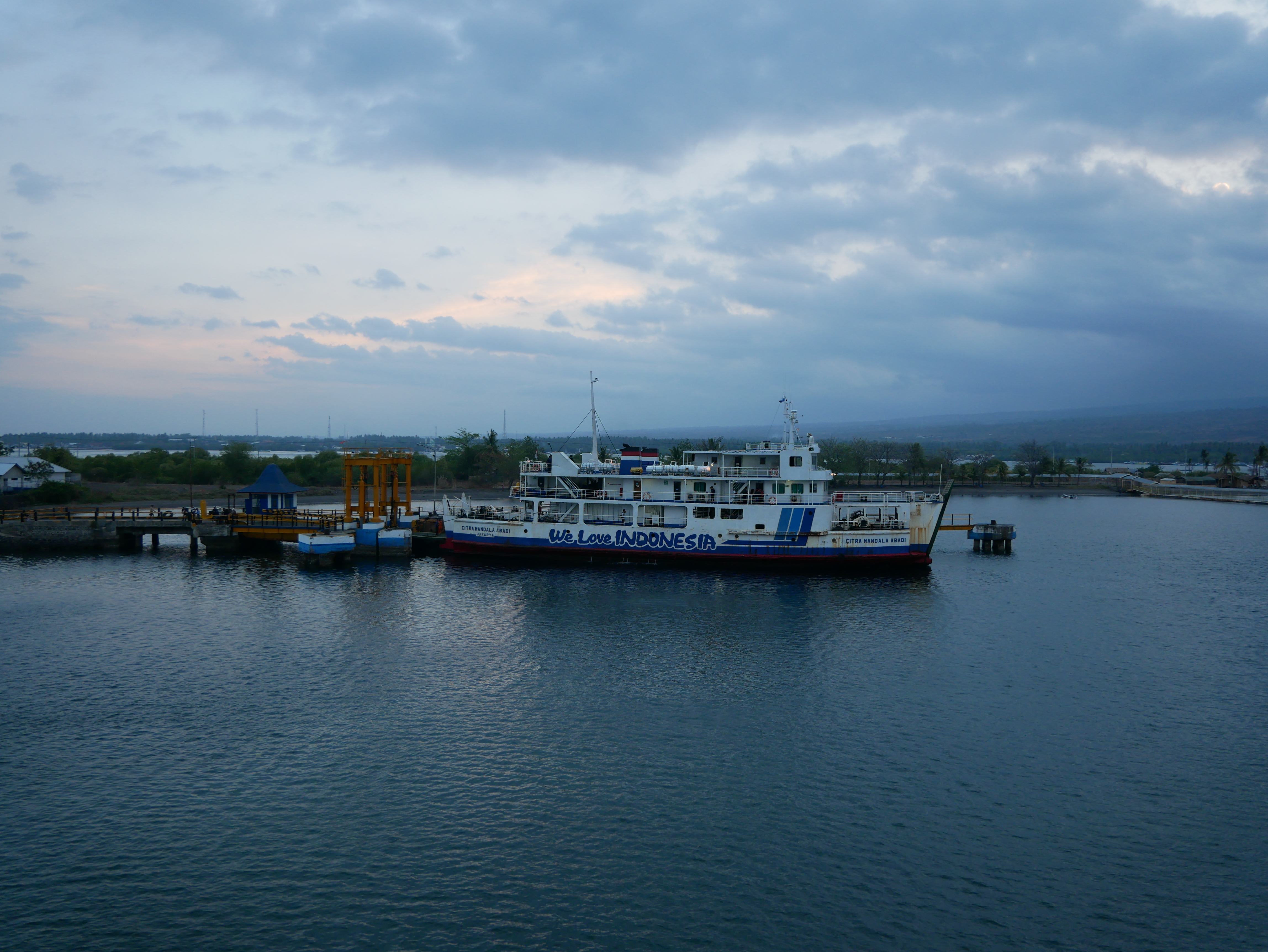 Am Montagmorgen bin ich wieder nach Mataram gefahren, denn ich hatte gehört, dass man von dort aus auf die 500 Kilometer entfernte Insel Flores gelangen kann. Im Busbahnhof der Stadt habe ich tatsächlich sehr günstige Tickets für eine 26-stündige Reise erwerben können. Enthalten waren zwei Bus- und zwei Fährfahrten. Am Montag um 15 Uhr ging es mit dem Bus los. Wir durchquerten Lombok und fuhren dann mit der Autofähre auf die Insel Tenggara. Ein zweiter Bus transportierte uns zum anderen Ende der Insel, von dort brachte uns eine zweite Fähre nach Labuhan Bajo auf Flores. Die letzte Fährfahrt hat übrigens fast sieben Stunden gedauert. Begleitet wurde unser Boot von einer Gruppe Delfinen. Außerdem sind wir am Komodo-Nationalpark vorbeigefahren, meinem nächsten Ziel zum Wandern und Tauchen.