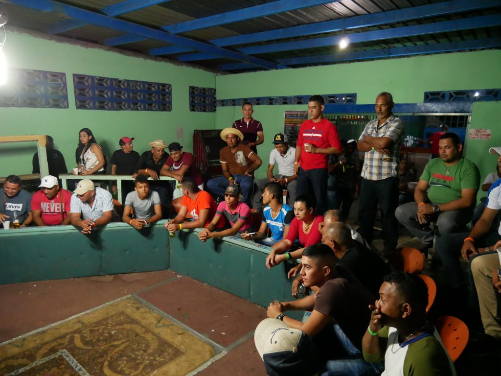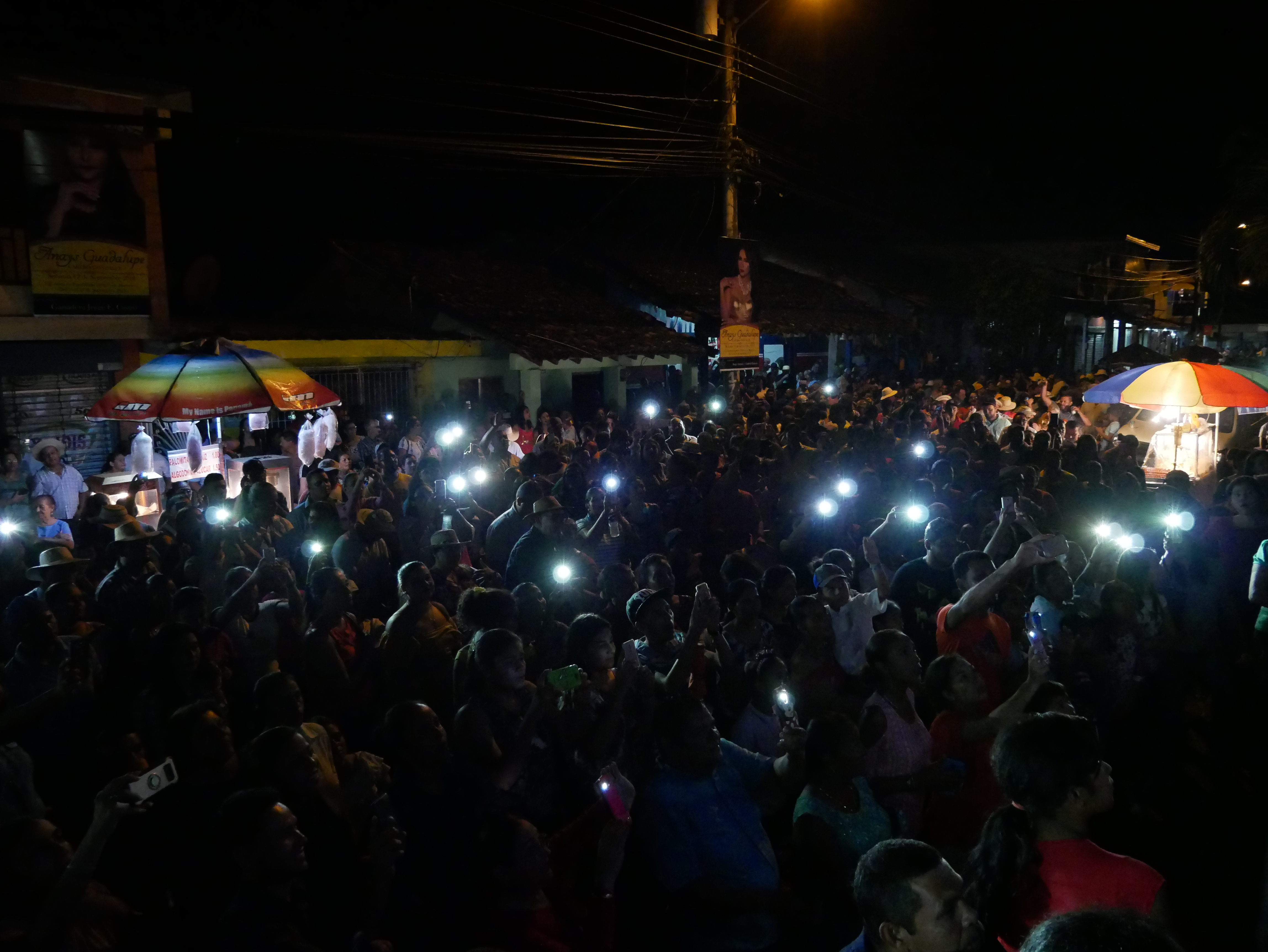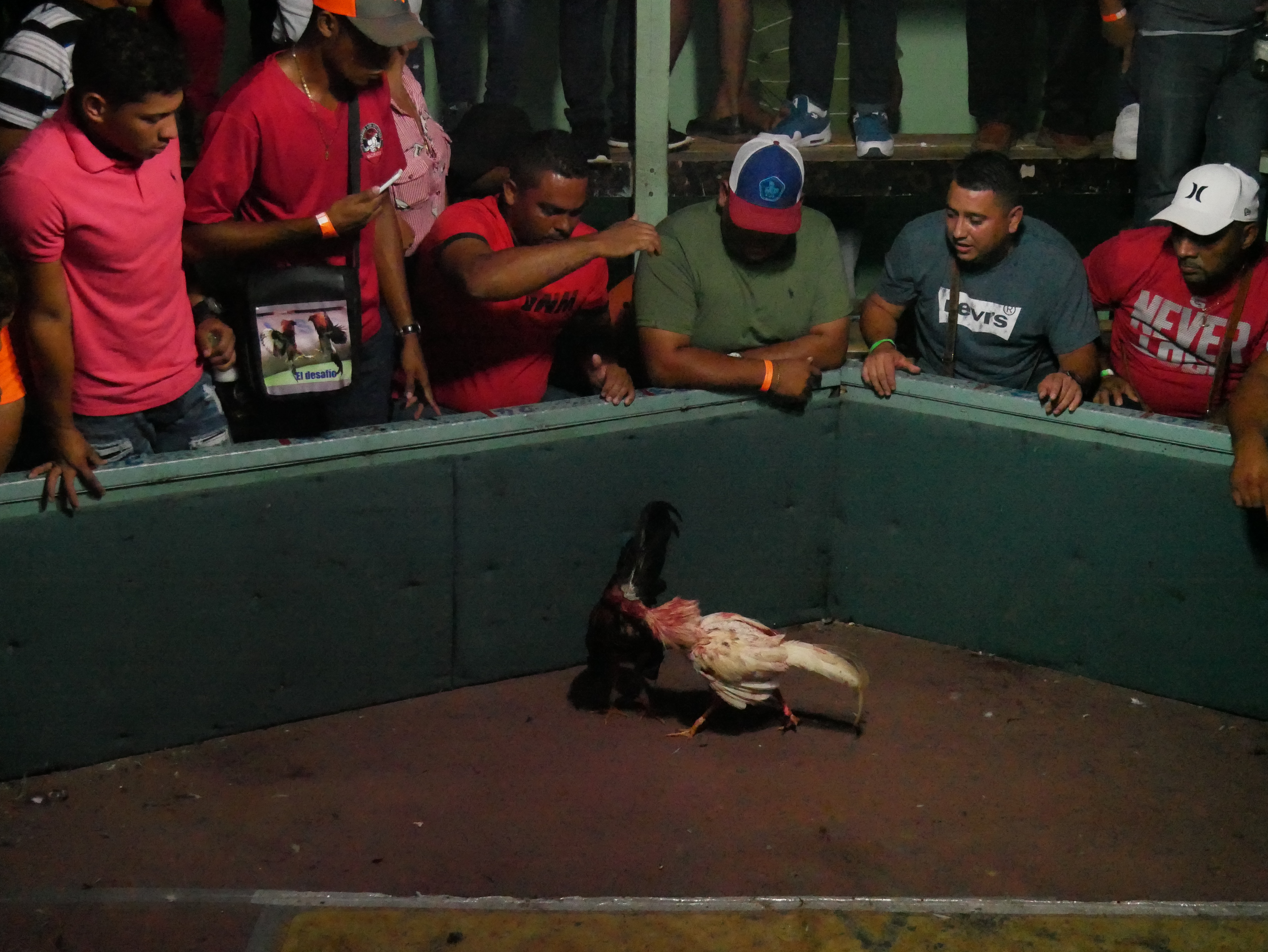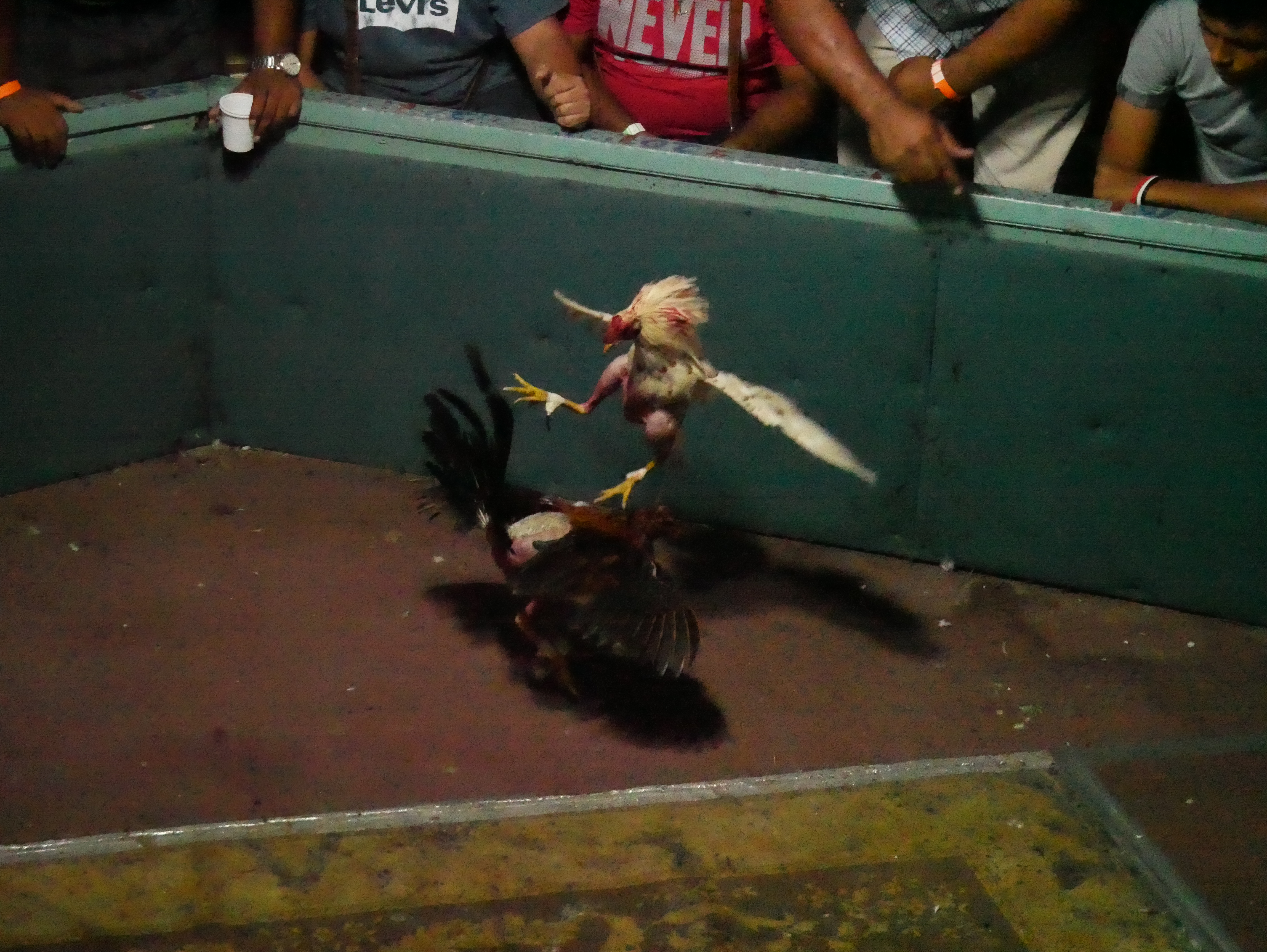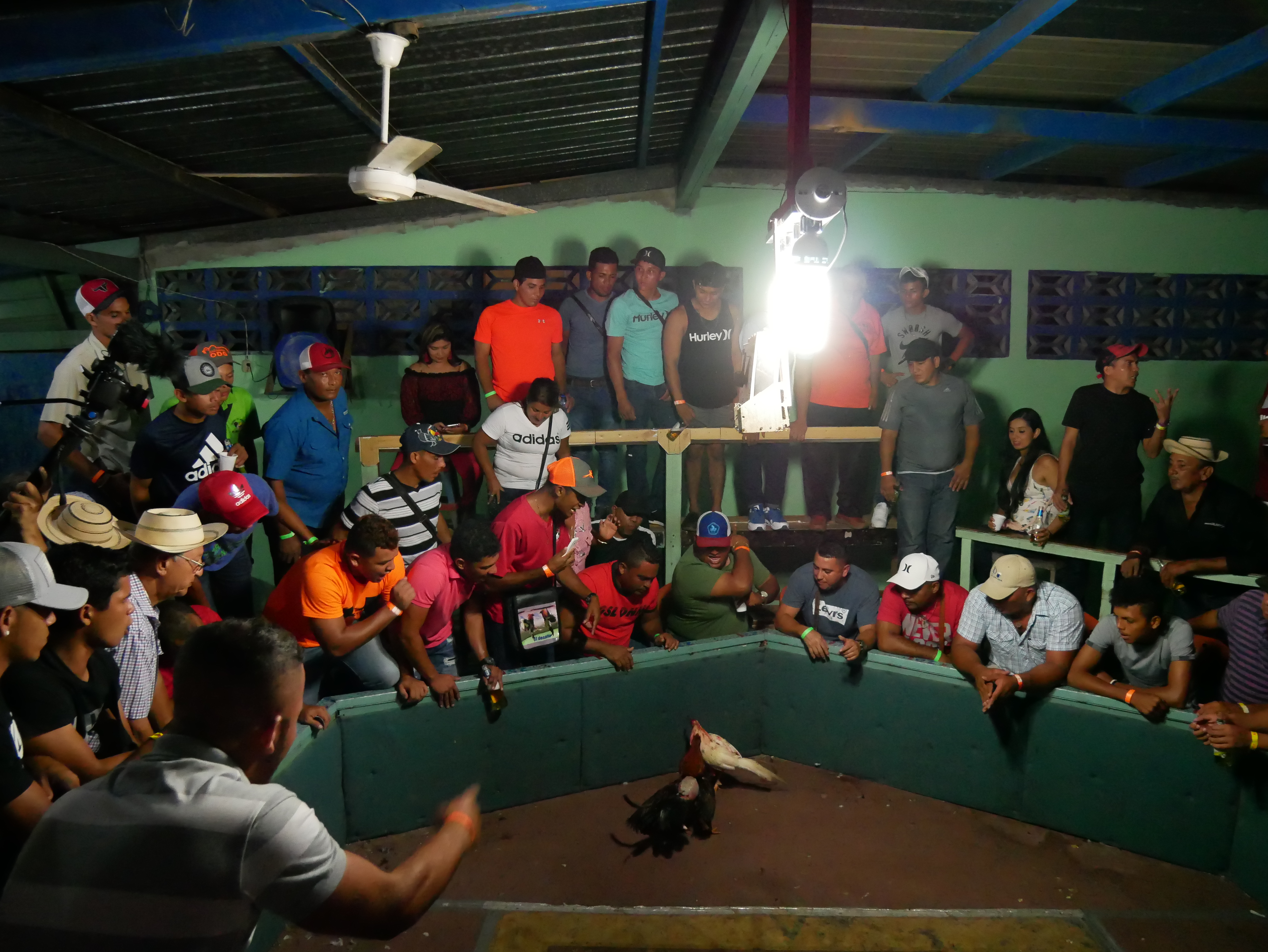 Ich versuche das kurz zu entwirren: Als wir am Freitag ankamen, haben wir anfangs ein Konzert vorgefunden und sofort begonnen, es zu filmen. Alle Bewohner des Dorfes waren vor der Bühne versammelt und haben einer Band zugehört, die im weiteren Sinne lateinamerikanische Volksmusik vorgeführt hat. Über den Abend verteilt sind auch immer mehr Menschen auf die Bühne geklettert, und somit waren die Band und die Bühne einfach Teil einer großen, bunten, tanzenden Meute. Nach dreistündiger Dreharbeit haben wir uns ein bisschen in die Nebenstraßen begeben und sind dort „als wichtiges Fernsehteam“ kostenlos in eine Hahnenkampfarena hineingebeten worden. Hier hatte man in einem Raum eine kleine Arena gebaut, und ungefähr 50 Hähne warteten in Käfigen auf ihren Einsatz. Sie wurden zuerst gewogen und in Gewichtsklassen eingeteilt. Im Anschluss haben die Schaulustigen ihre Wetten abgeschlossen und dann ging es los. Jeweils zwei Hähne wurden zur selben Zeit in die Arena gesetzt und sind dann, verstört durch den Lärm der wütenden Masse, brutal aufeinander losgegangen. Meine Fotos sind aufgrund der Dunkelheit und der schnellen Bewegungen leider nicht die besten. Aber der Ablauf der Kämpfe lässt sich leicht beschreiben. Zwei schöne Vögel mit glänzenden Federn werden aufeinander angesetzt. Sie beginnen, sich zu hacken, mit den Krallen zu packen und zu schneiden, bis sich ihr Federkleid rot färbt. Die Besitzer hatten ihren Kampfhähnen Dornen an die Füße geklebt, sodass die Krallen große Verletzungen anrichteten. Die Zuschauermasse war rasend, hat geschrien und getobt. Ein solcher Kampf endet in der Regel mit dem Tod eines Kontrahenten. Falls nach 20 Minuten noch beide Tiere am Leben sind, ist es ein Unentschieden. Die überlebenden Gewinner sind aber, so vermute ich, auch nicht mehr zu retten. Ein Züchter hat uns stolz seinen Hahn hingehalten, der am ganzen Körper aufgeschnitten war und dem beide Augen fehlten.