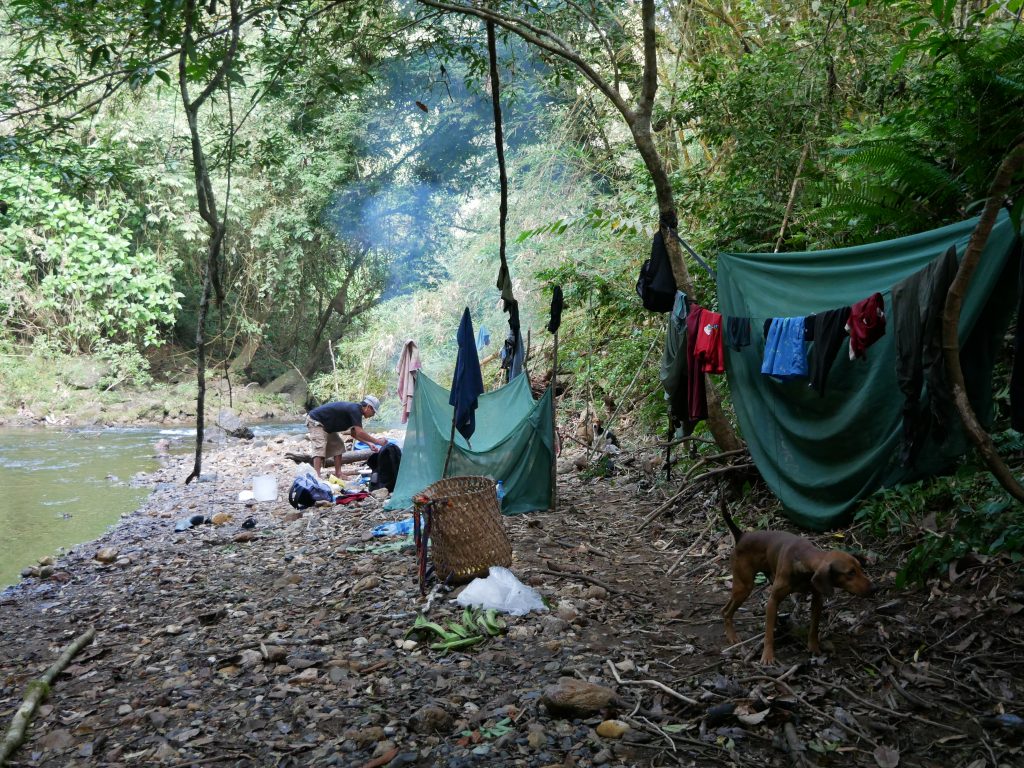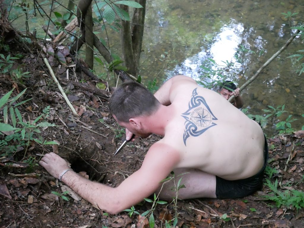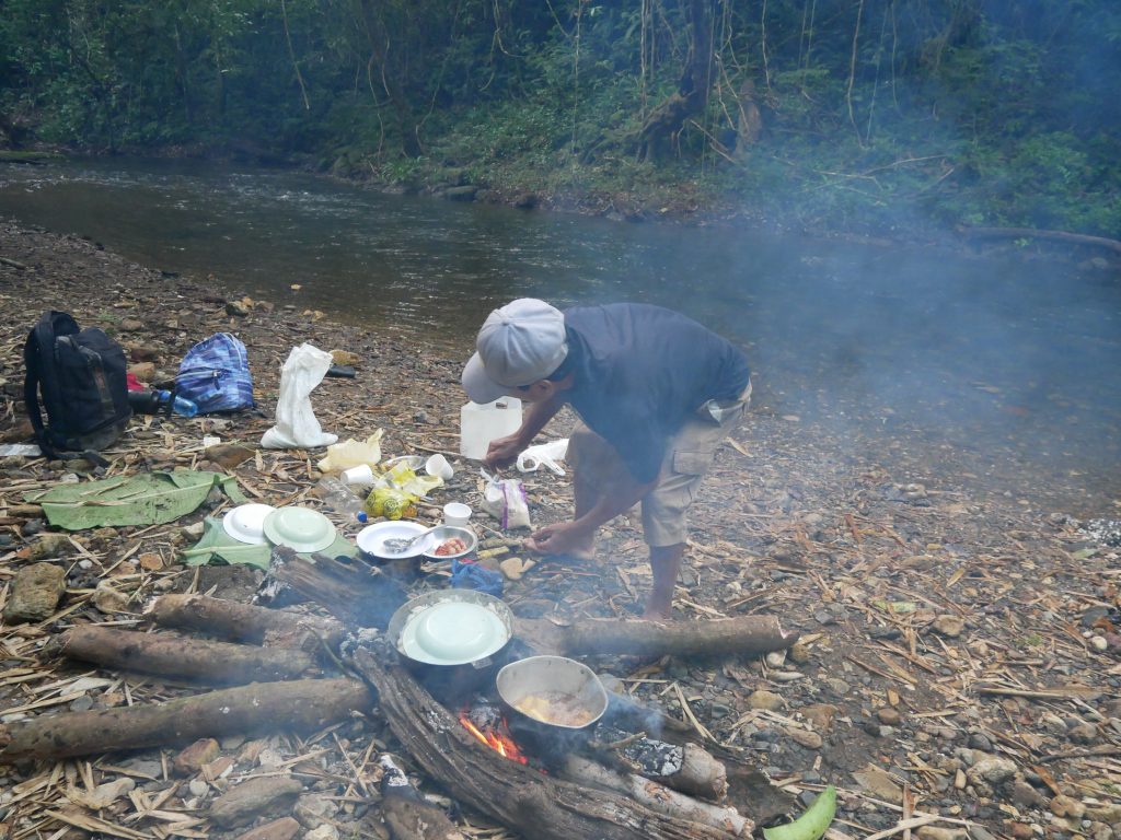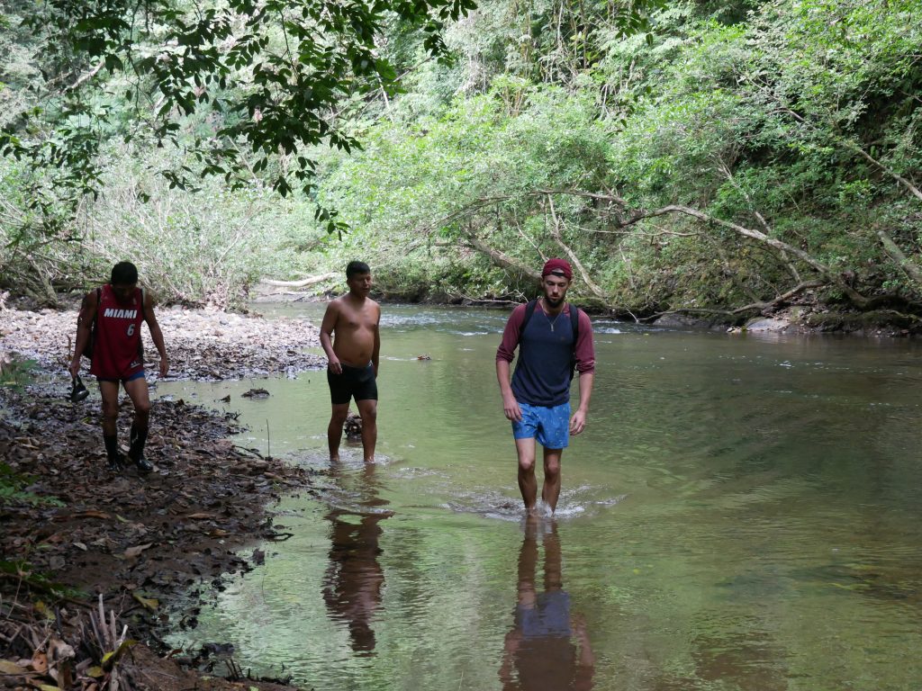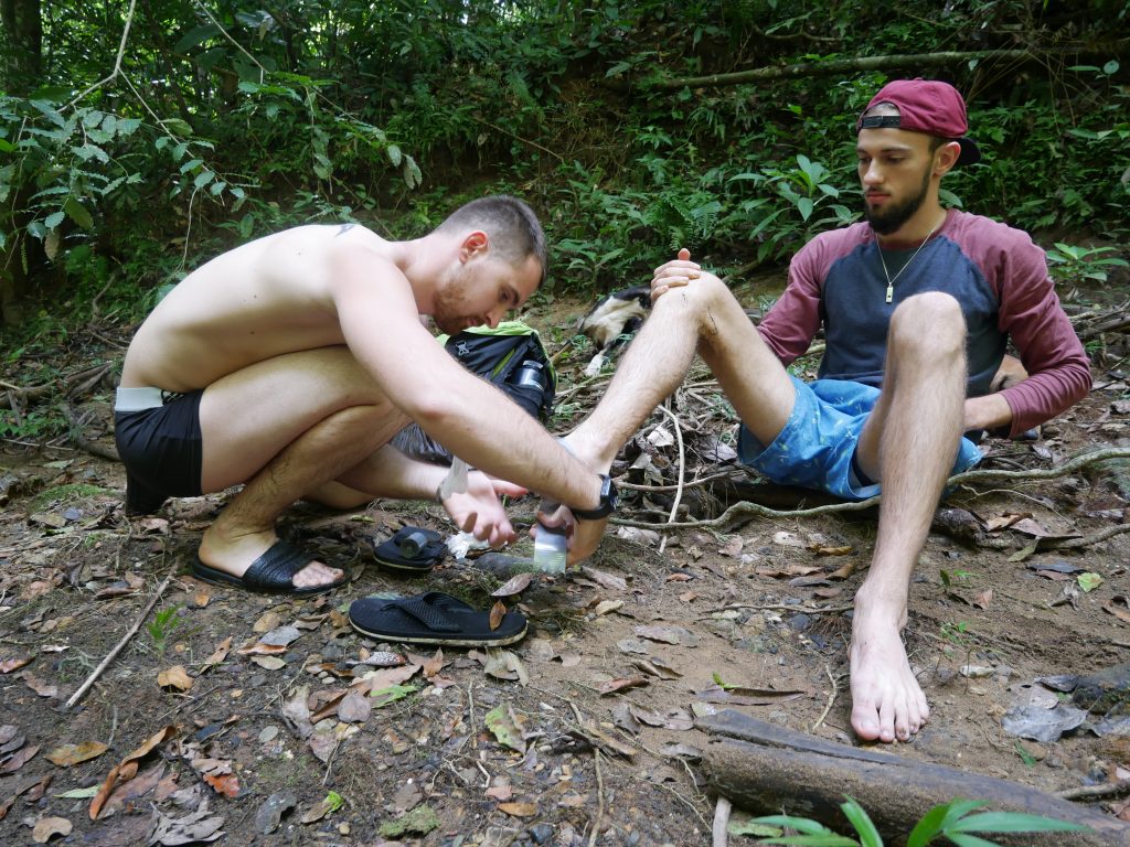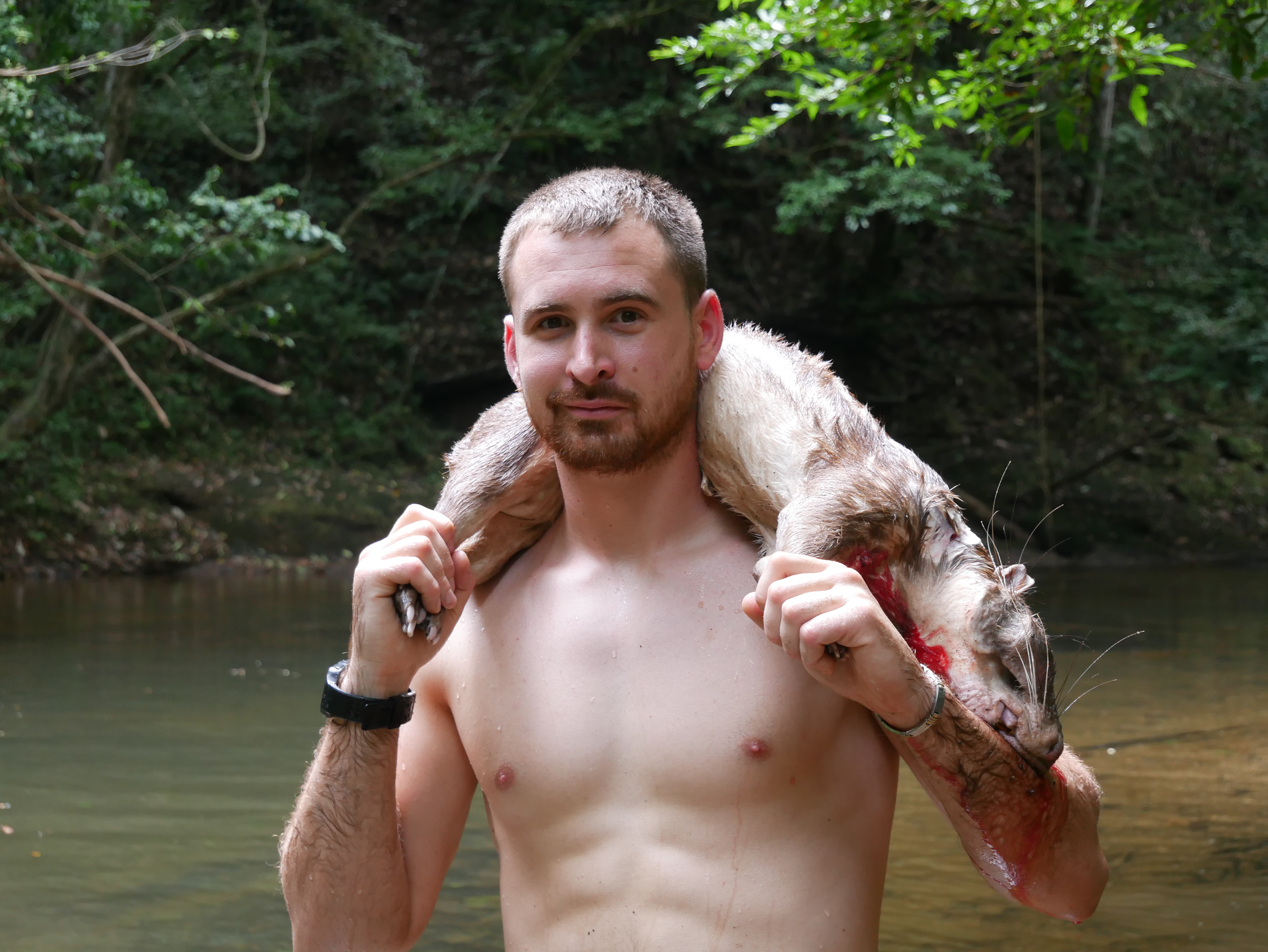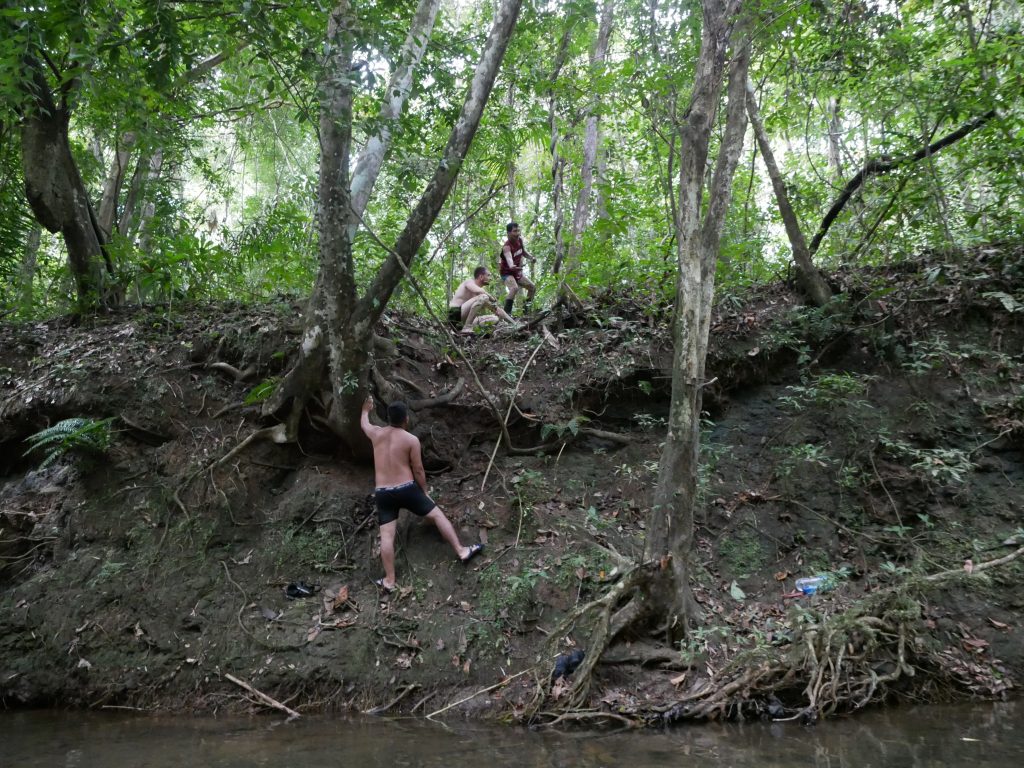 Abgesehen von diesem normalen, für mich aber außergewöhnlichen Dorfleben haben wir auch einige Ausflüge mit Rutillo unternommen. Wir waren zwei Tage lang im Regenwald wandern und haben in der Nacht ein kleines Lager an einem Fluss errichtet. Auf dieser Expedition haben wir gelernt, uns wie die Dorfbewohner im Wald mit Nahrung zu versorgen. Mit kleinen Speeren haben wir in einem kristallklaren Fluss Fische und Krebse geschossen. Und einmal haben wir ein Wasserschwein erlegt. Der Jagdhund hatte den Eingang eines Tunnels am Flussufer gefunden, und kroch mutig hinein, um das Tier zu stellen. Es folgte eine absurde Szene. Aus dem Boden tönte dumpf das Bellen des Hundes, der das Wasserschwein in einiger Entfernung vom Ufer in die Enge getrieben hatte. Die Männer begannen, mit Stöcken den Boden aufzugraben, bis wir tatsächlich den Rücken des Tieres sahen. Sie versuchten, das Wasserschwein mit dem Speer zu erlegen, doch sie trafen es nicht richtig. Erschrocken raste das Tier durch den Tunnel Richtung Wasser und biss in seiner Panik dem Hund dermaßen ins Gesicht, dass seine Schnauze durchlöchert war. Ein paar Tage lang konnte er nichts essen, weil die Nahrung einfach aus seinem Mund herausfiel. Als sich das Wasserschwein mit einem Sprung in den Fluss retten wollte, wurde es von einer scharfen Klinge getroffen. Denn am Ausgang des Tunnels wartete Willy. Der Franzose war vor Kurzem im Dorf eingetroffen. Er ist Ex-Soldat und Survival-Experte und begeisterter Jäger. Für seine Reise in den Dschungel hatte er ein Messer mitgebracht, mit dem er der Beute nun den Todesstoß versetzte. Er war es auch, der Eric verarztete, als er im Fluss auf einen Ast trat, der ein entsprechendes Loch zwischen seine Zehen bohrte. Die Buschwanderung war sehr, sehr anstrengend. Nicht nur, weil es sehr bergig war. Wir mussten auch viele Flüsse durchqueren. Hinzu kam, dass die Wege verwildert waren und erstmal mit der Machete „freigeschlagen“ werden mussten.