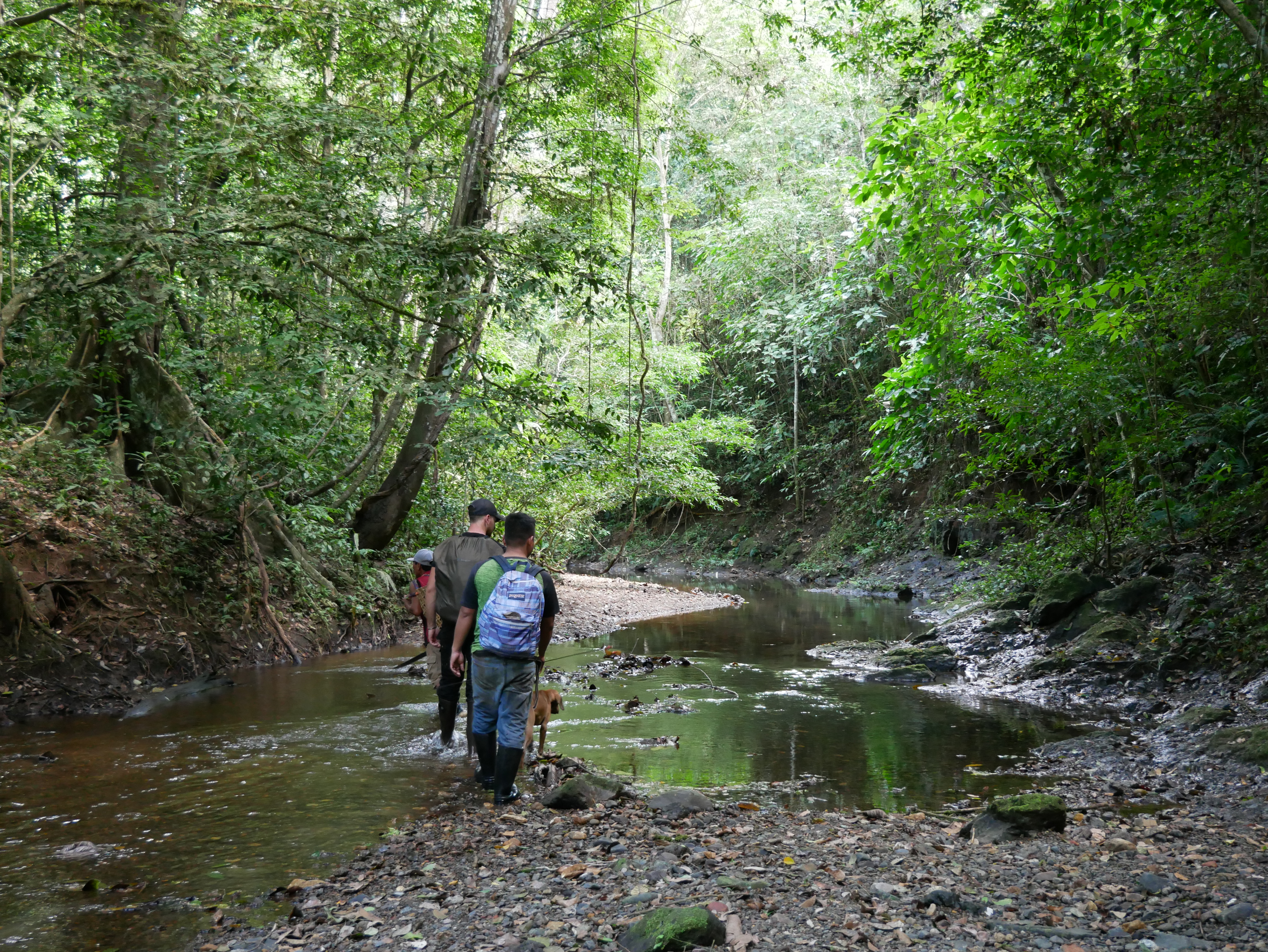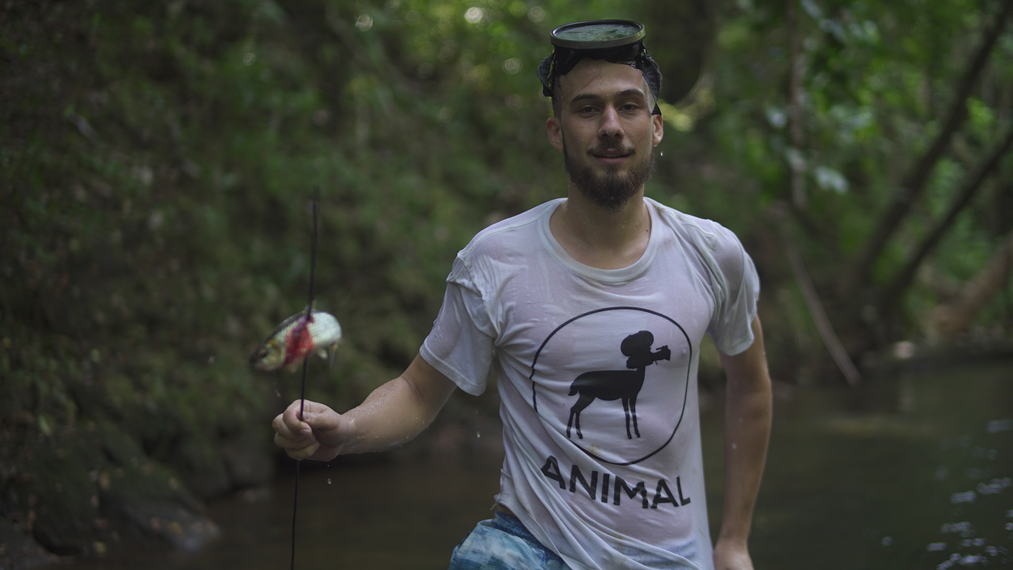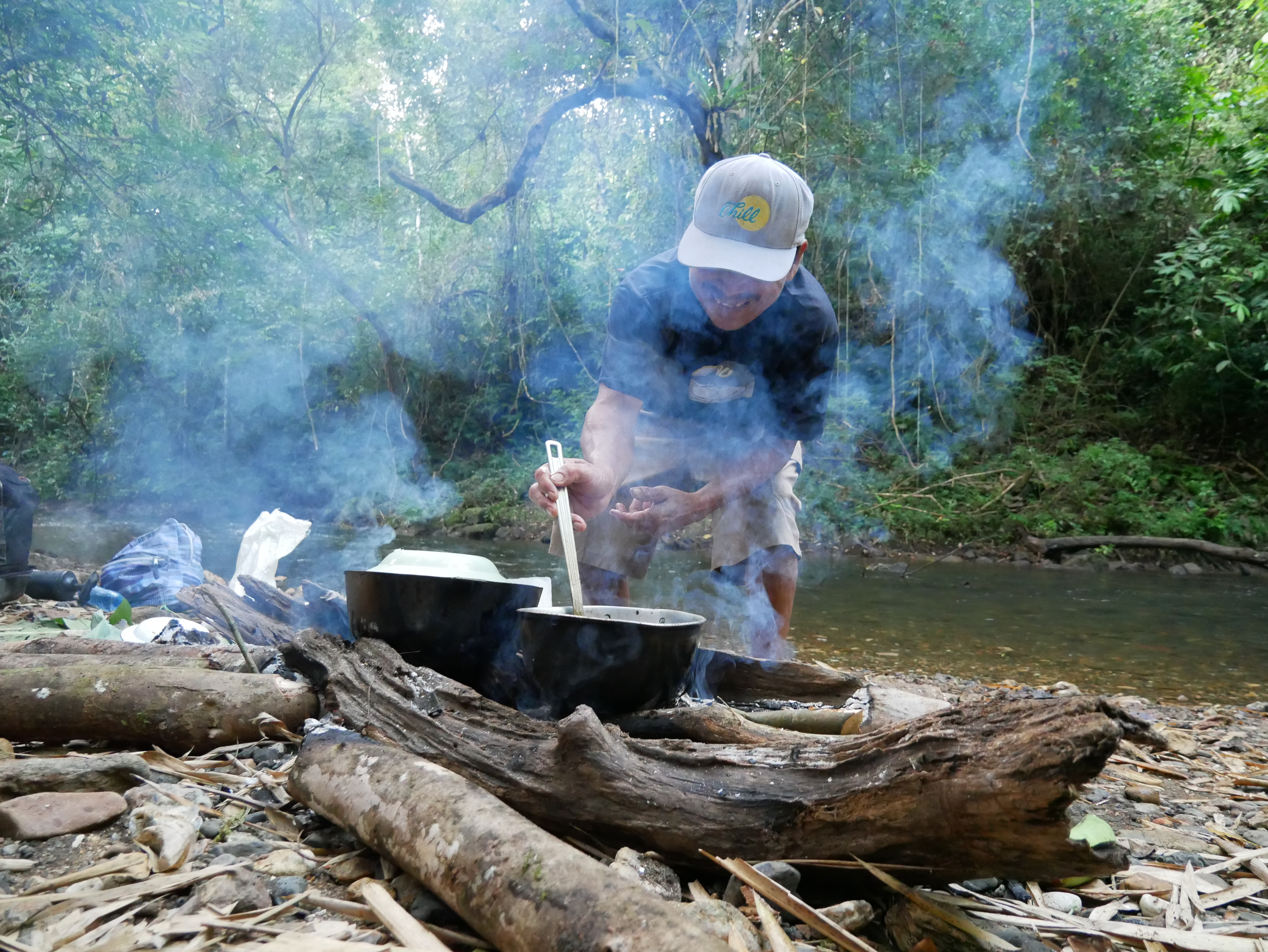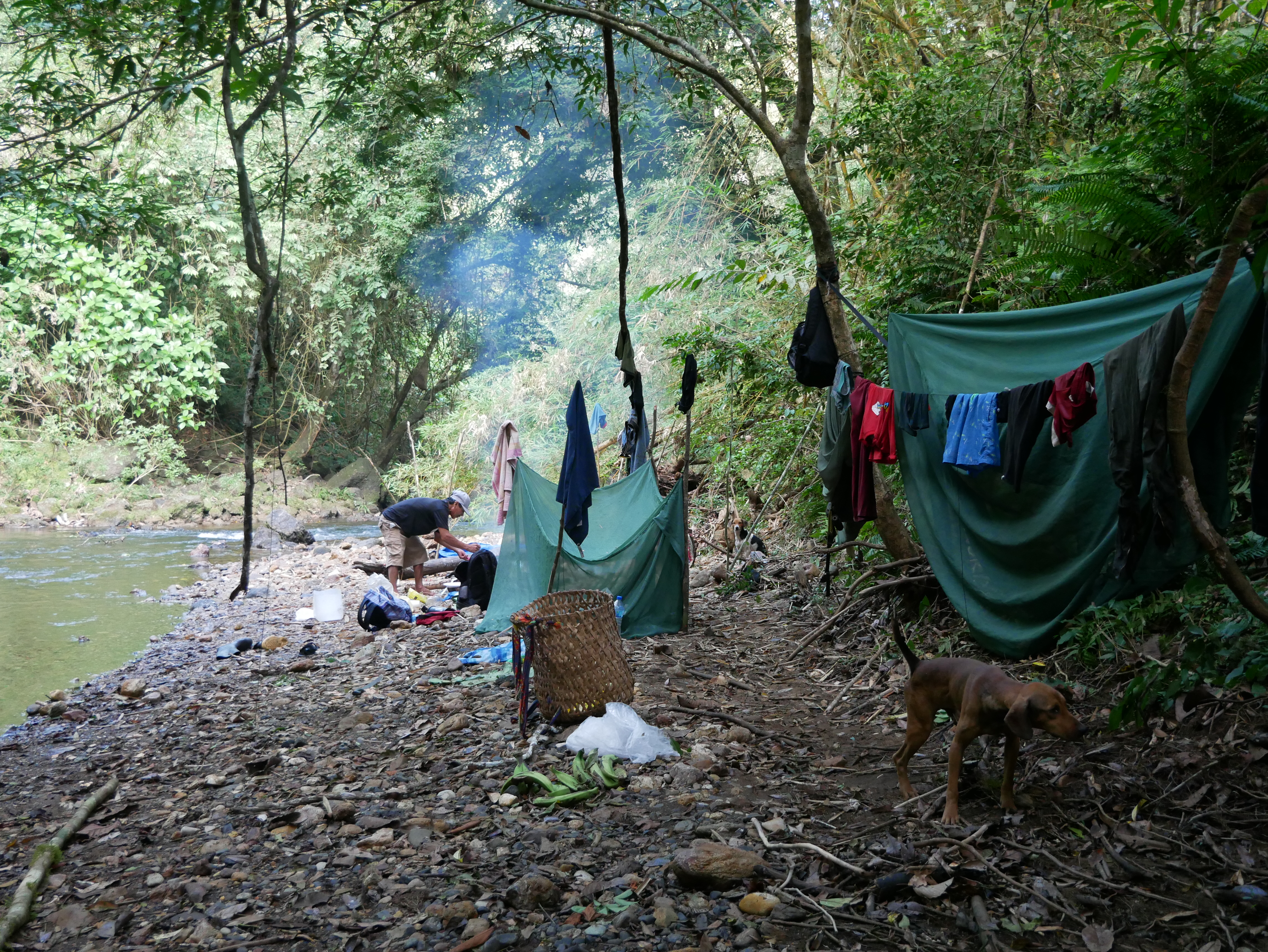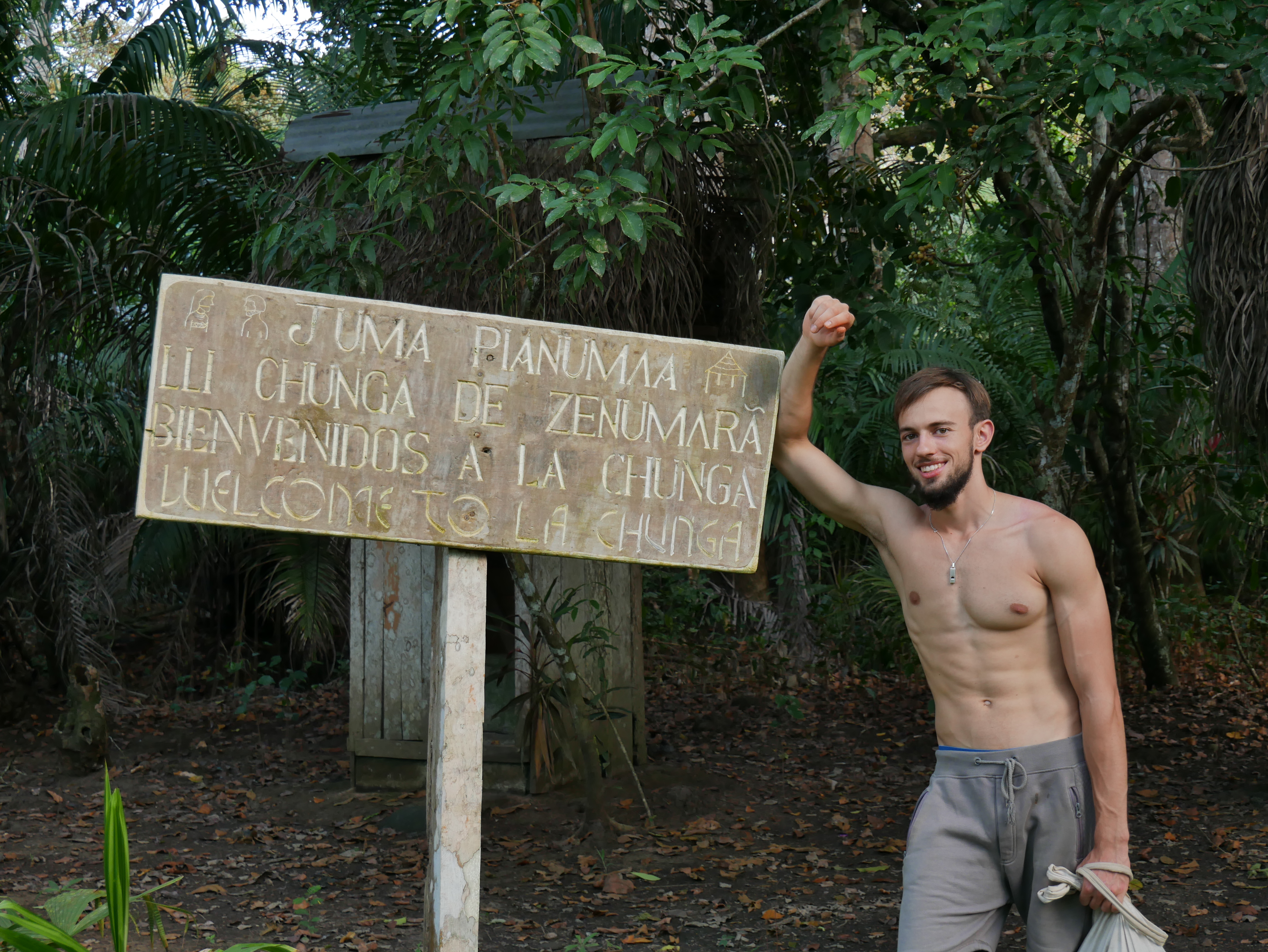 Abgesehen von diesem normalen, für mich aber außergewöhnlichen Dorfleben haben wir auch einige Ausflüge mit Rutillo unternommen. Wir waren zwei Tage lang im Regenwald wandern und haben in der Nacht ein kleines Lager an einem Fluss errichtet. Auf dieser Expedition haben wir gelernt, uns wie die Dorfbewohner im Wald mit Nahrung zu versorgen. Mit kleinen Speeren haben wir in einem kristallklaren Fluss Fische und Krebse geschossen. Und einmal haben wir ein Wasserschwein erlegt. Der Jagdhund hatte den Eingang eines Tunnels am Flussufer gefunden, und kroch mutig hinein, um das Tier zu stellen. Es folgte eine absurde Szene. Aus dem Boden tönte dumpf das Bellen des Hundes, der das Wasserschwein in einiger Entfernung vom Ufer in die Enge getrieben hatte. Die Männer begannen, mit Stöcken den Boden aufzugraben, bis wir tatsächlich den Rücken des Tieres sahen. Sie versuchten, das Wasserschwein mit dem Speer zu erlegen, doch sie trafen es nicht richtig. Erschrocken raste das Tier durch den Tunnel Richtung Wasser und biss in seiner Panik dem Hund dermaßen ins Gesicht, dass seine Schnauze durchlöchert war. Ein paar Tage lang konnte er nichts essen, weil die Nahrung einfach aus seinem Mund herausfiel. Als sich das Wasserschwein mit einem Sprung in den Fluss retten wollte, wurde es von einer scharfen Klinge getroffen. Denn am Ausgang des Tunnels wartete Willy. Der Franzose war vor Kurzem im Dorf eingetroffen. Er ist Ex-Soldat und Survival-Experte und begeisterter Jäger. Für seine Reise in den Dschungel hatte er ein Messer mitgebracht, mit dem er der Beute nun den Todesstoß versetzte. Er war es auch, der Eric verarztete, als er im Fluss auf einen Ast trat, der ein entsprechendes Loch zwischen seine Zehen bohrte. Die Buschwanderung war sehr, sehr anstrengend. Nicht nur, weil es sehr bergig war. Wir mussten auch viele Flüsse durchqueren. Hinzu kam, dass die Wege verwildert waren und erstmal mit der Machete „freigeschlagen“ werden mussten.