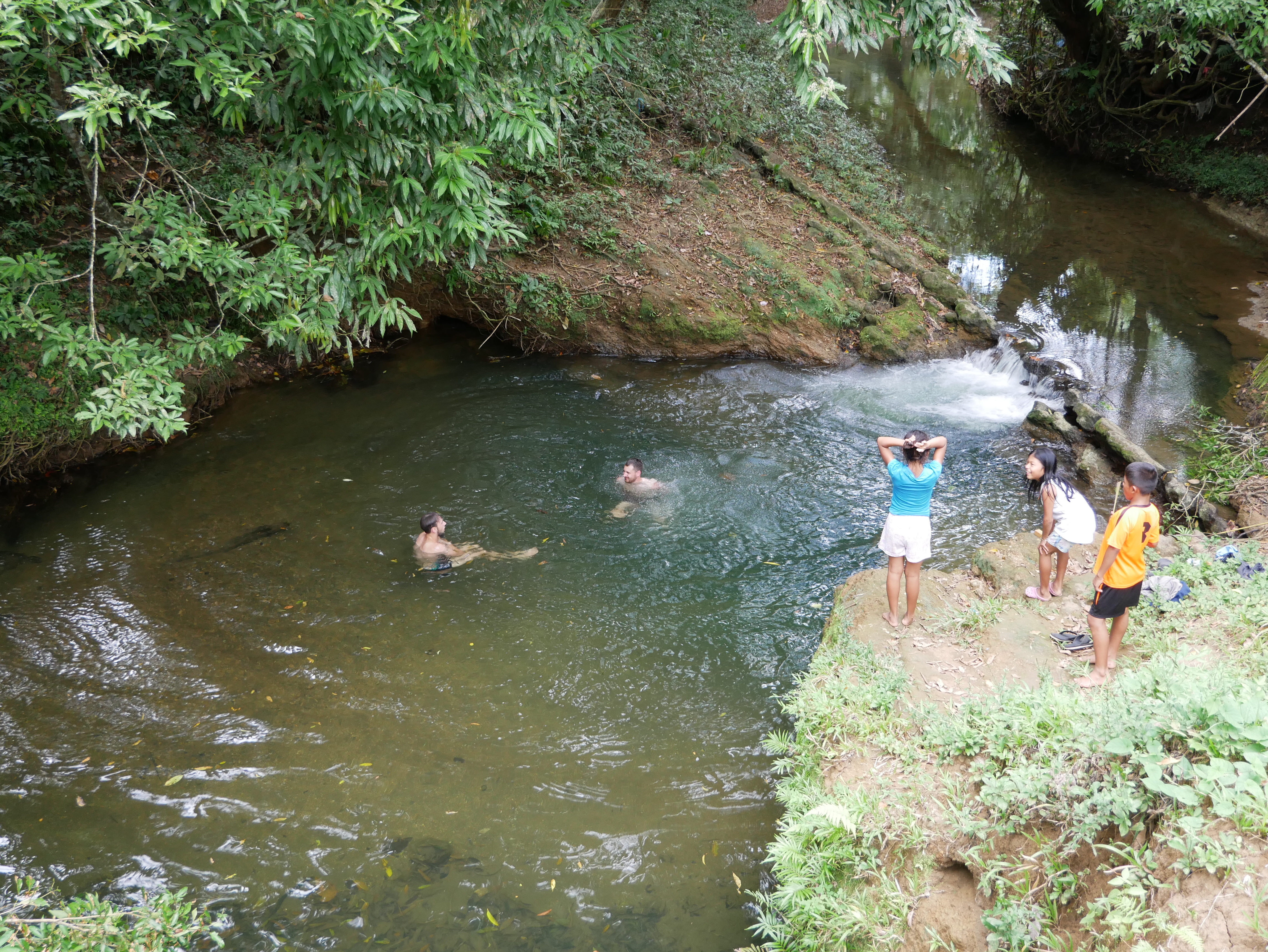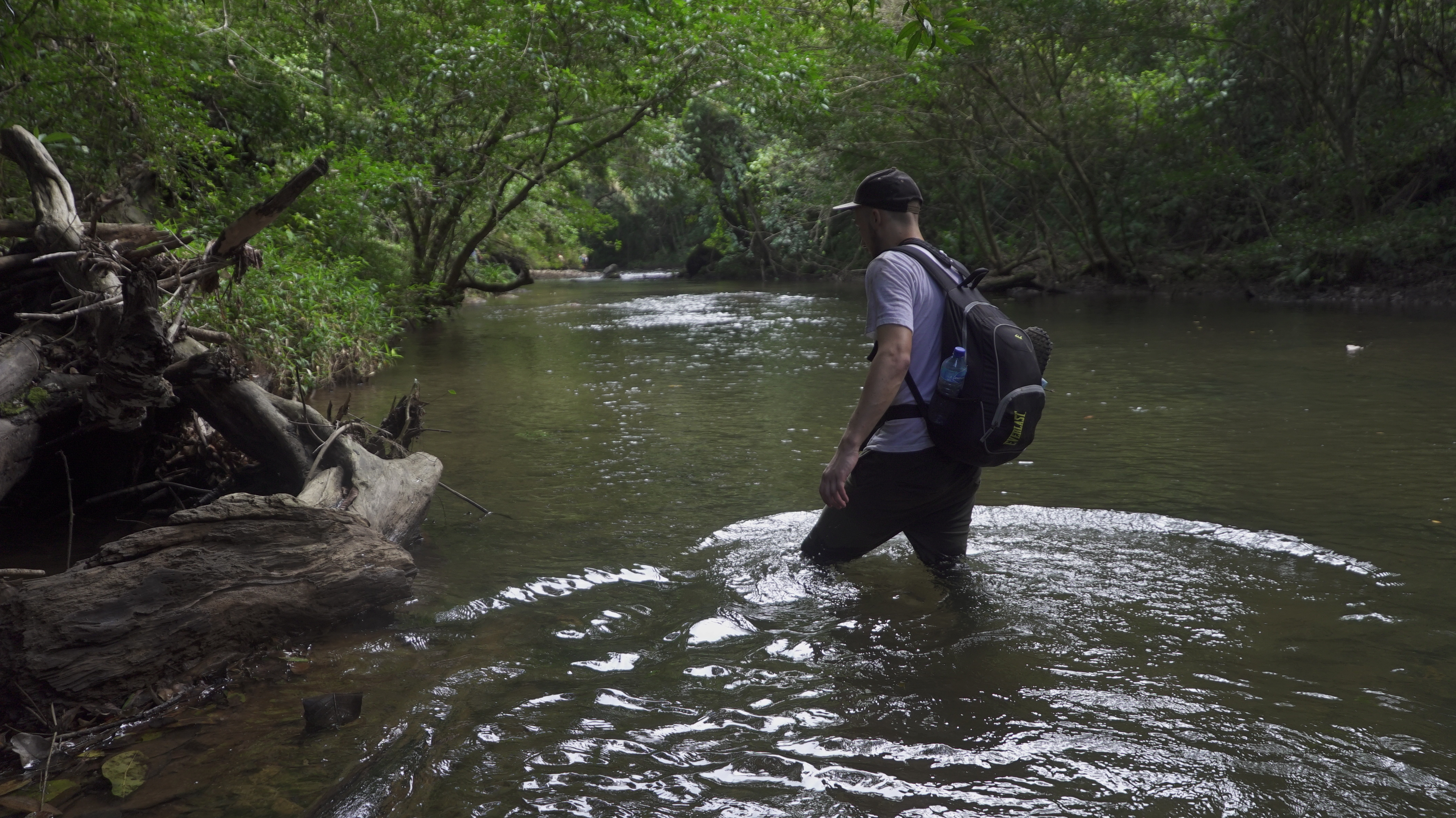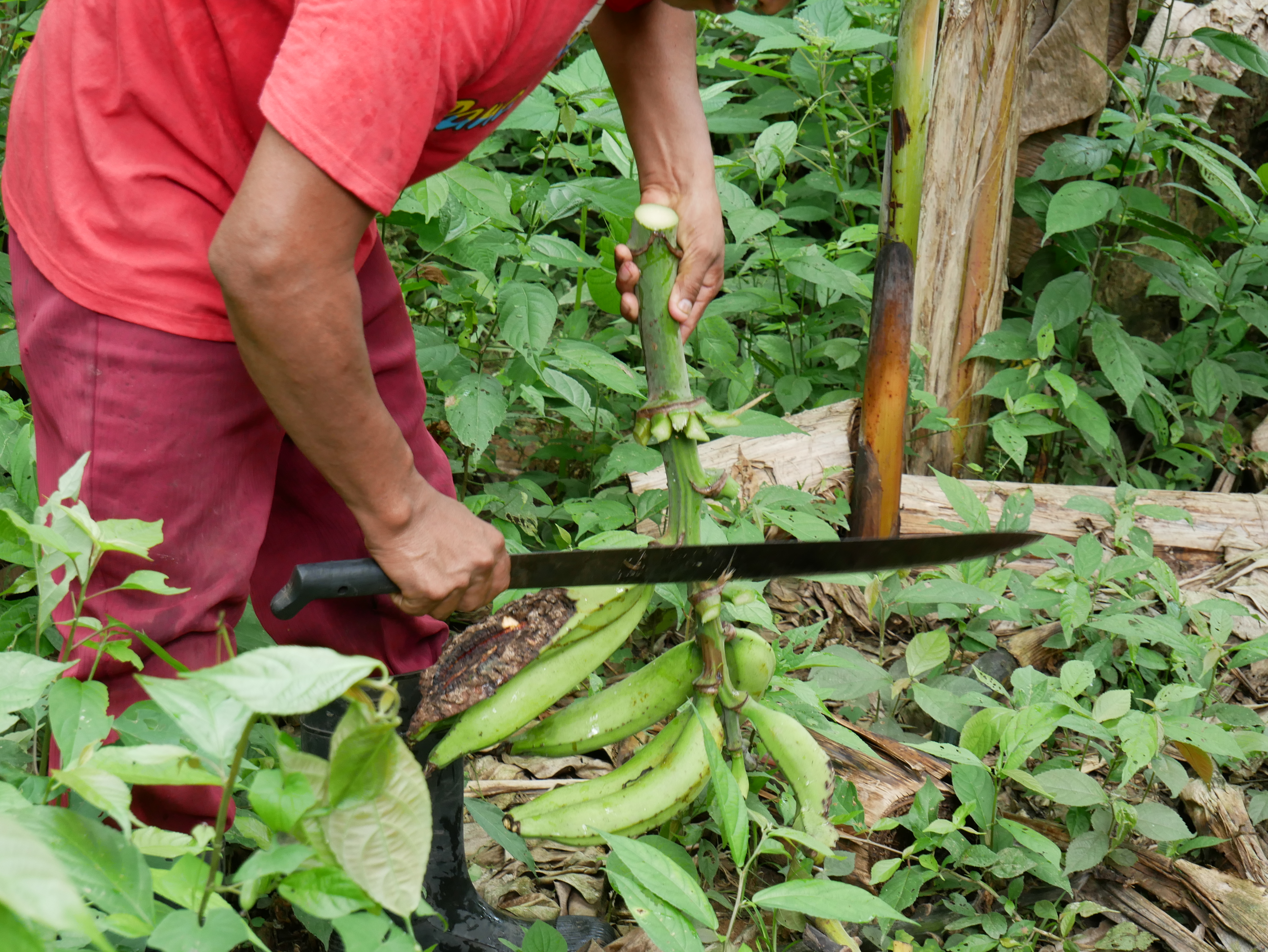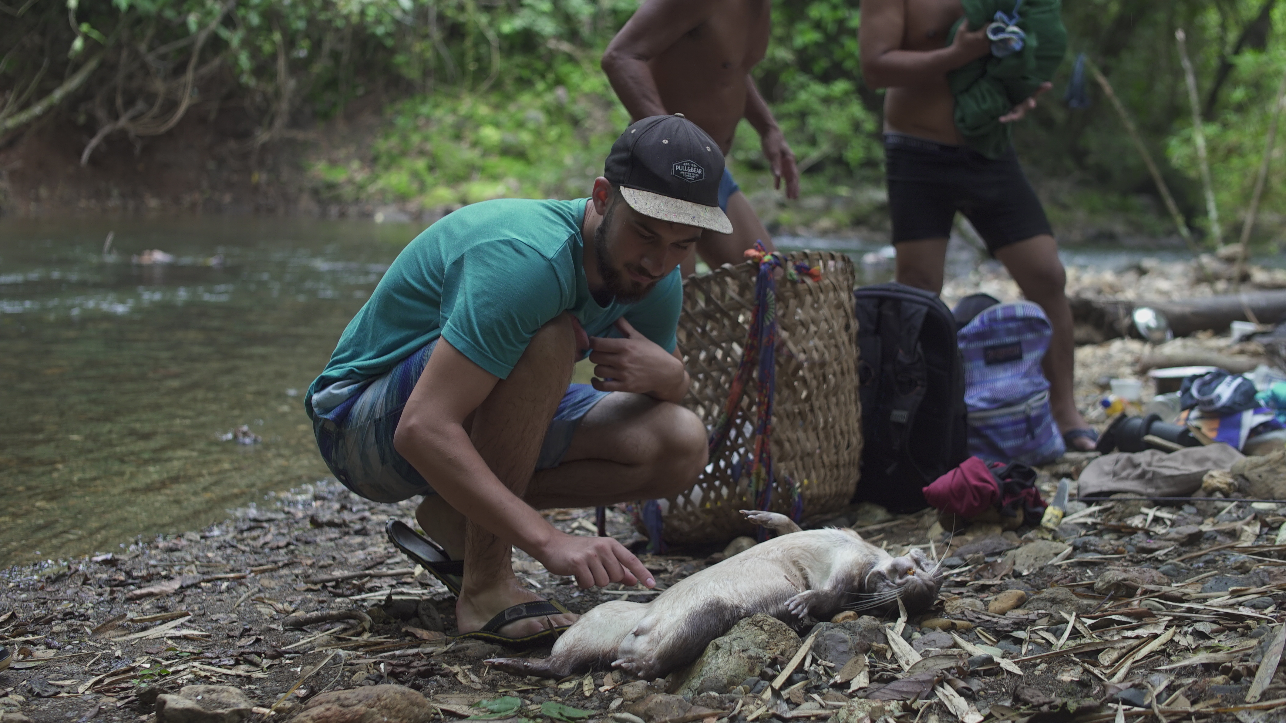 Abgesehen von diesem normalen, für mich aber außergewöhnlichen Dorfleben haben wir auch einige Ausflüge mit Rutillo unternommen. Wir waren zwei Tage lang im Regenwald wandern und haben in der Nacht ein kleines Lager an einem Fluss errichtet. Auf dieser Expedition haben wir gelernt, uns wie die Dorfbewohner im Wald mit Nahrung zu versorgen. Mit kleinen Speeren haben wir in einem kristallklaren Fluss Fische und Krebse geschossen. Und einmal haben wir ein Wasserschwein erlegt. Der Jagdhund hatte den Eingang eines Tunnels am Flussufer gefunden, und kroch mutig hinein, um das Tier zu stellen. Es folgte eine absurde Szene. Aus dem Boden tönte dumpf das Bellen des Hundes, der das Wasserschwein in einiger Entfernung vom Ufer in die Enge getrieben hatte. Die Männer begannen, mit Stöcken den Boden aufzugraben, bis wir tatsächlich den Rücken des Tieres sahen. Sie versuchten, das Wasserschwein mit dem Speer zu erlegen, doch sie trafen es nicht richtig. Erschrocken raste das Tier durch den Tunnel Richtung Wasser und biss in seiner Panik dem Hund dermaßen ins Gesicht, dass seine Schnauze durchlöchert war. Ein paar Tage lang konnte er nichts essen, weil die Nahrung einfach aus seinem Mund herausfiel. Als sich das Wasserschwein mit einem Sprung in den Fluss retten wollte, wurde es von einer scharfen Klinge getroffen. Denn am Ausgang des Tunnels wartete Willy. Der Franzose war vor Kurzem im Dorf eingetroffen. Er ist Ex-Soldat und Survival-Experte und begeisterter Jäger. Für seine Reise in den Dschungel hatte er ein Messer mitgebracht, mit dem er der Beute nun den Todesstoß versetzte. Er war es auch, der Eric verarztete, als er im Fluss auf einen Ast trat, der ein entsprechendes Loch zwischen seine Zehen bohrte. Die Buschwanderung war sehr, sehr anstrengend. Nicht nur, weil es sehr bergig war. Wir mussten auch viele Flüsse durchqueren. Hinzu kam, dass die Wege verwildert waren und erstmal mit der Machete „freigeschlagen“ werden mussten.