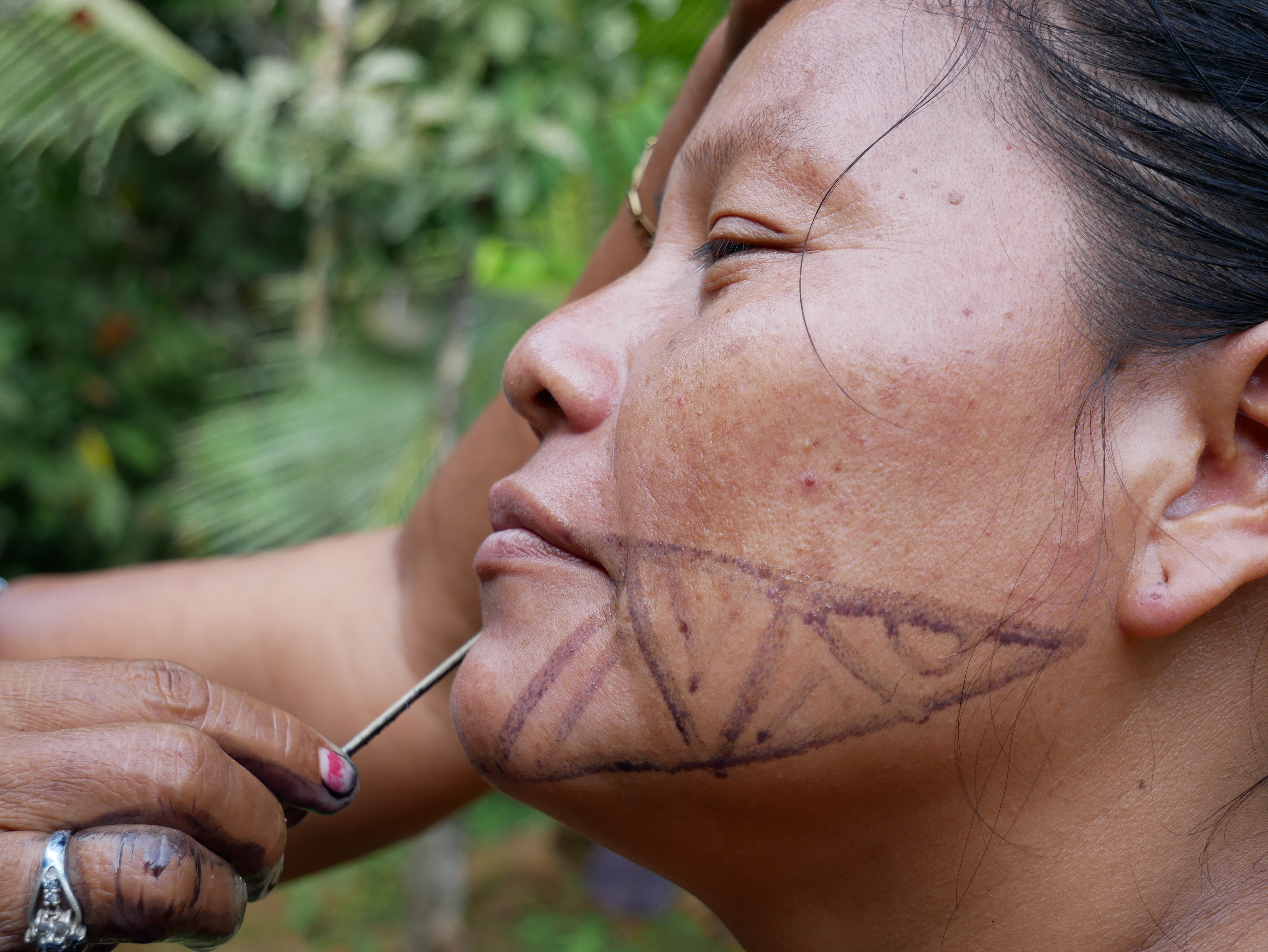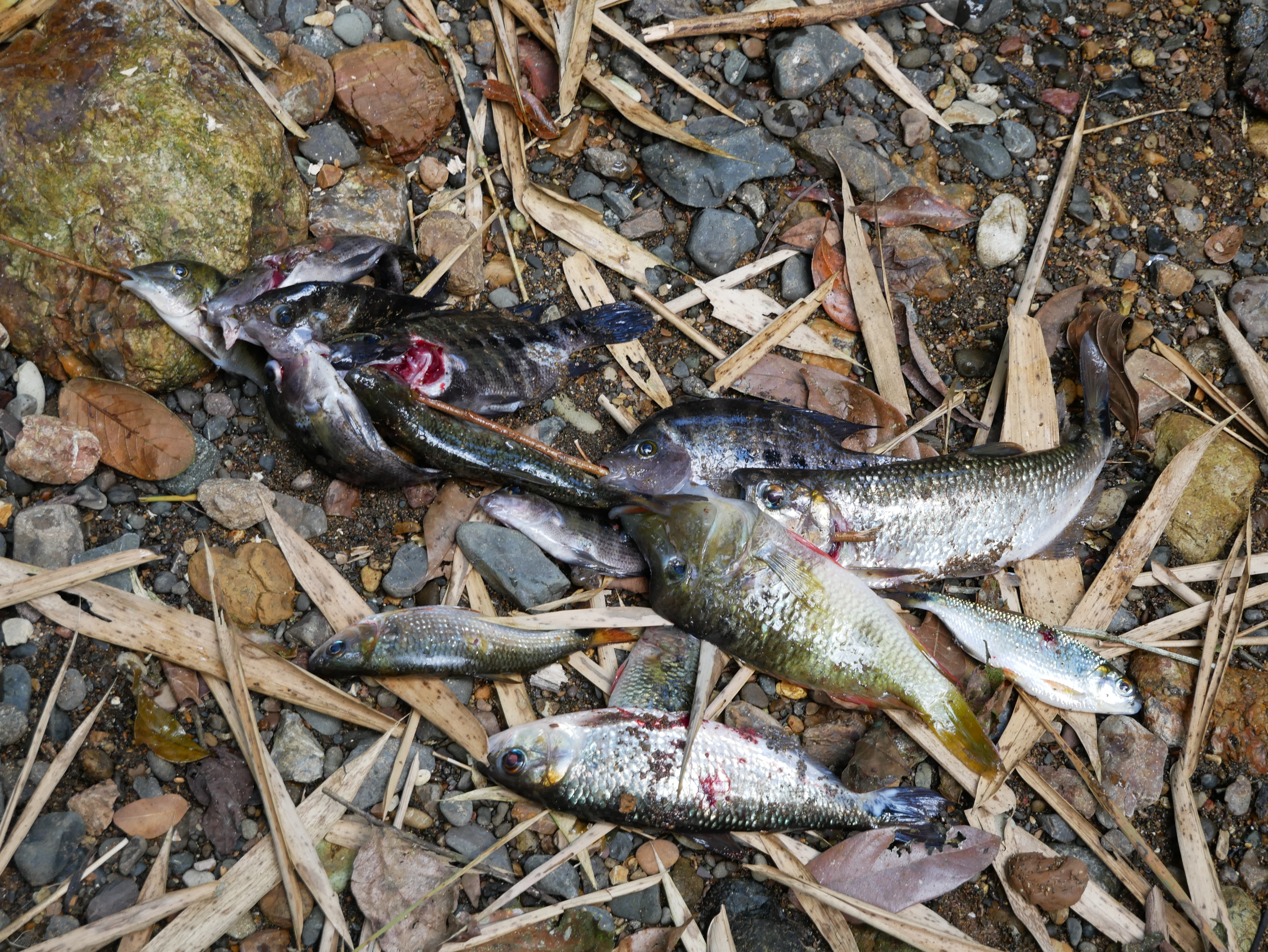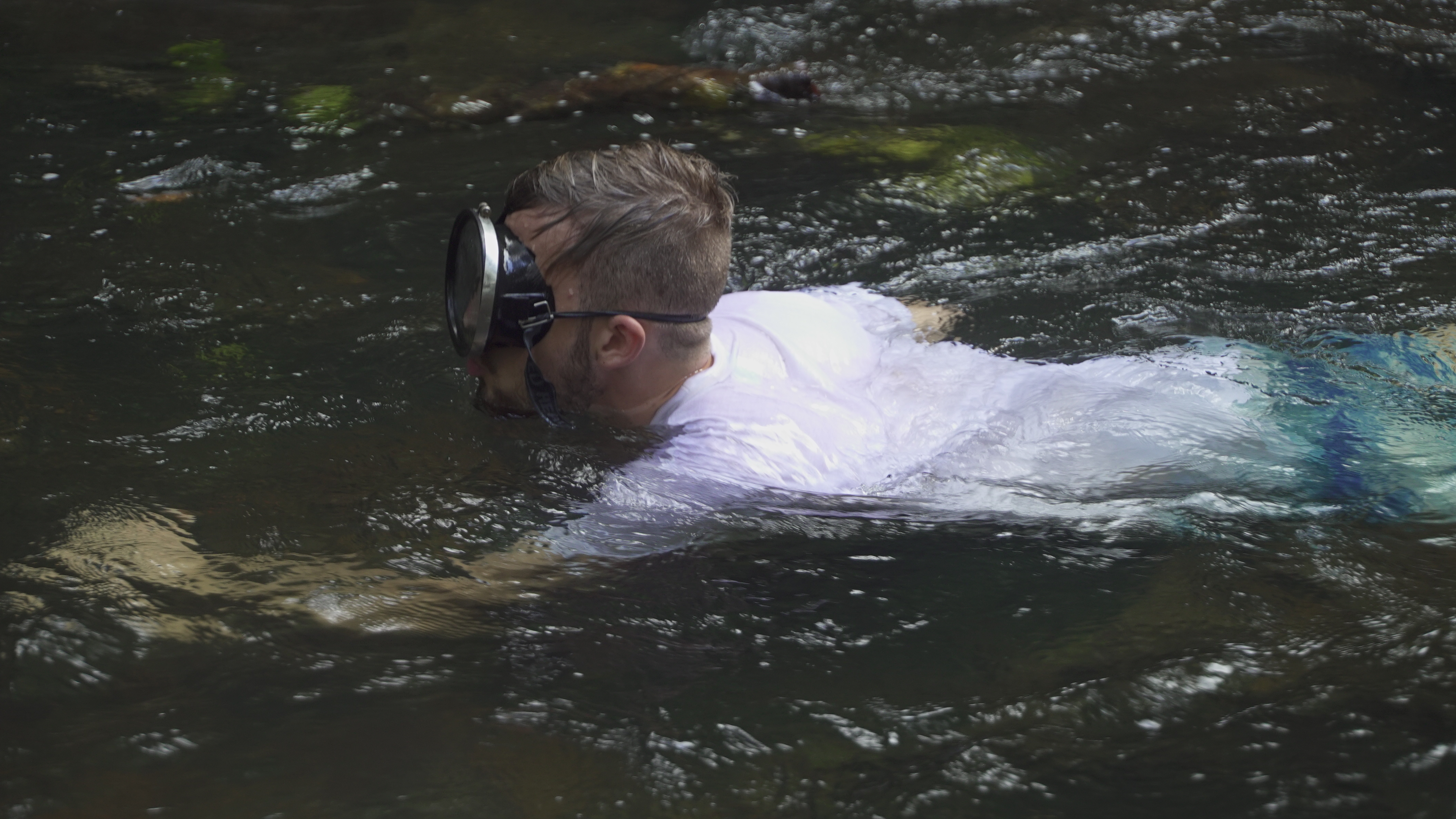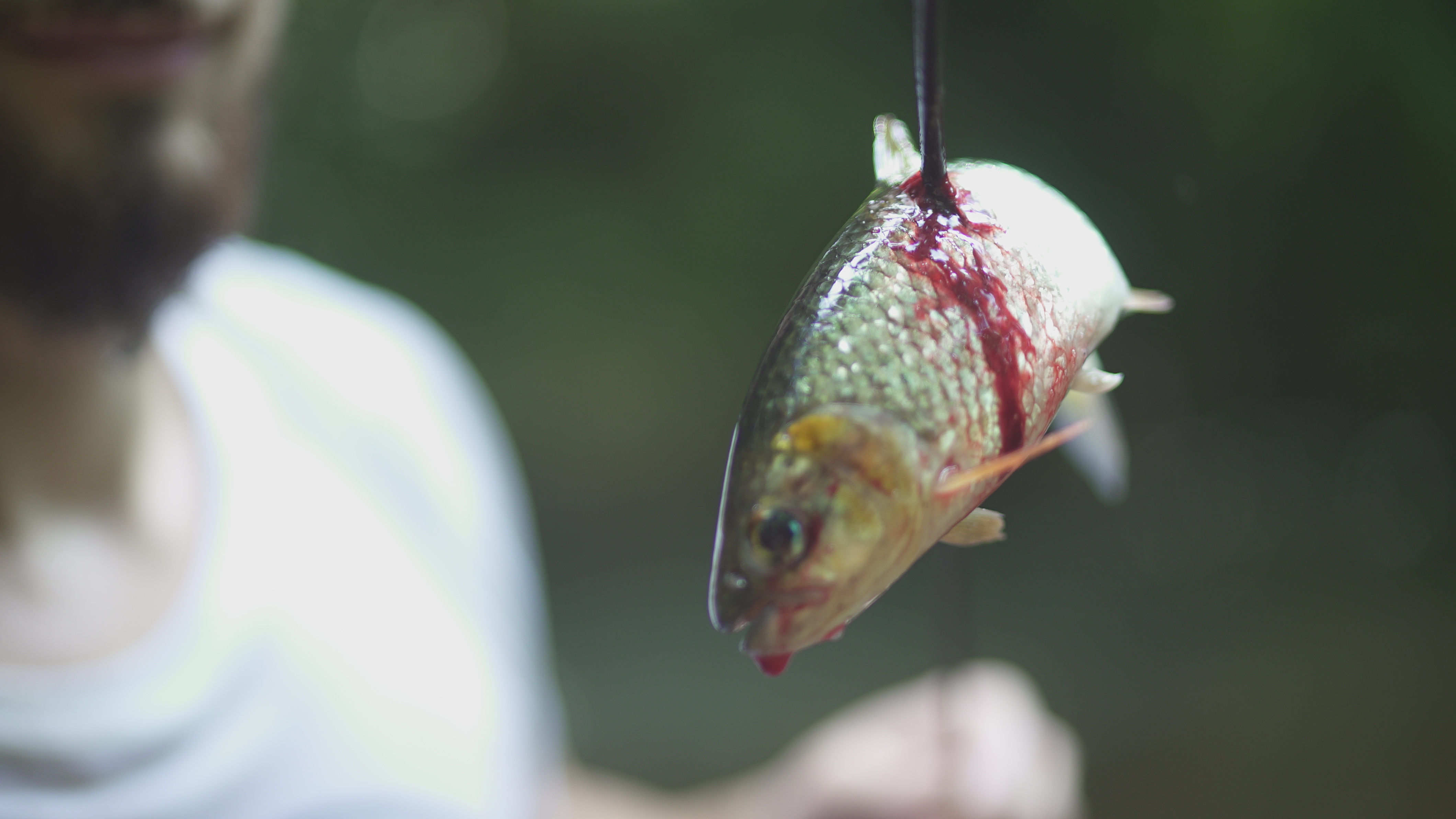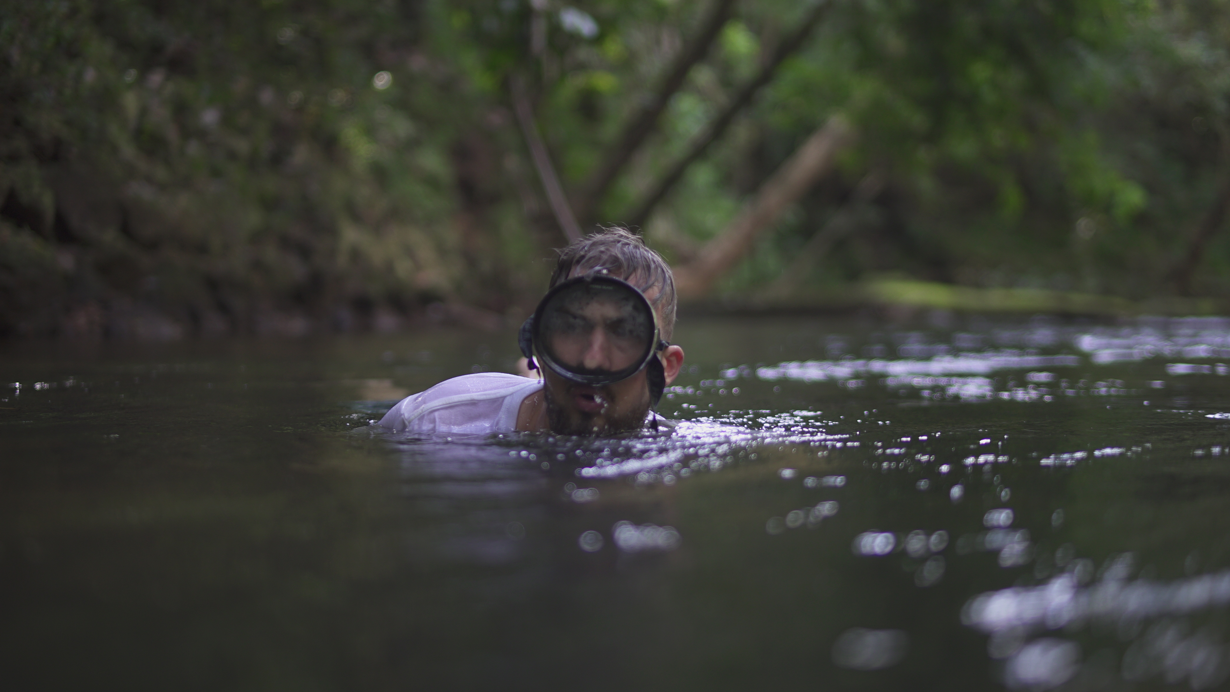 Abgesehen von diesem normalen, für mich aber außergewöhnlichen Dorfleben haben wir auch einige Ausflüge mit Rutillo unternommen. Wir waren zwei Tage lang im Regenwald wandern und haben in der Nacht ein kleines Lager an einem Fluss errichtet. Auf dieser Expedition haben wir gelernt, uns wie die Dorfbewohner im Wald mit Nahrung zu versorgen. Mit kleinen Speeren haben wir in einem kristallklaren Fluss Fische und Krebse geschossen. Und einmal haben wir ein Wasserschwein erlegt. Der Jagdhund hatte den Eingang eines Tunnels am Flussufer gefunden, und kroch mutig hinein, um das Tier zu stellen. Es folgte eine absurde Szene. Aus dem Boden tönte dumpf das Bellen des Hundes, der das Wasserschwein in einiger Entfernung vom Ufer in die Enge getrieben hatte. Die Männer begannen, mit Stöcken den Boden aufzugraben, bis wir tatsächlich den Rücken des Tieres sahen. Sie versuchten, das Wasserschwein mit dem Speer zu erlegen, doch sie trafen es nicht richtig. Erschrocken raste das Tier durch den Tunnel Richtung Wasser und biss in seiner Panik dem Hund dermaßen ins Gesicht, dass seine Schnauze durchlöchert war. Ein paar Tage lang konnte er nichts essen, weil die Nahrung einfach aus seinem Mund herausfiel. Als sich das Wasserschwein mit einem Sprung in den Fluss retten wollte, wurde es von einer scharfen Klinge getroffen. Denn am Ausgang des Tunnels wartete Willy. Der Franzose war vor Kurzem im Dorf eingetroffen. Er ist Ex-Soldat und Survival-Experte und begeisterter Jäger. Für seine Reise in den Dschungel hatte er ein Messer mitgebracht, mit dem er der Beute nun den Todesstoß versetzte. Er war es auch, der Eric verarztete, als er im Fluss auf einen Ast trat, der ein entsprechendes Loch zwischen seine Zehen bohrte. Die Buschwanderung war sehr, sehr anstrengend. Nicht nur, weil es sehr bergig war. Wir mussten auch viele Flüsse durchqueren. Hinzu kam, dass die Wege verwildert waren und erstmal mit der Machete „freigeschlagen“ werden mussten.