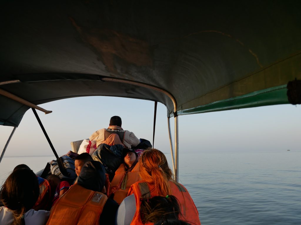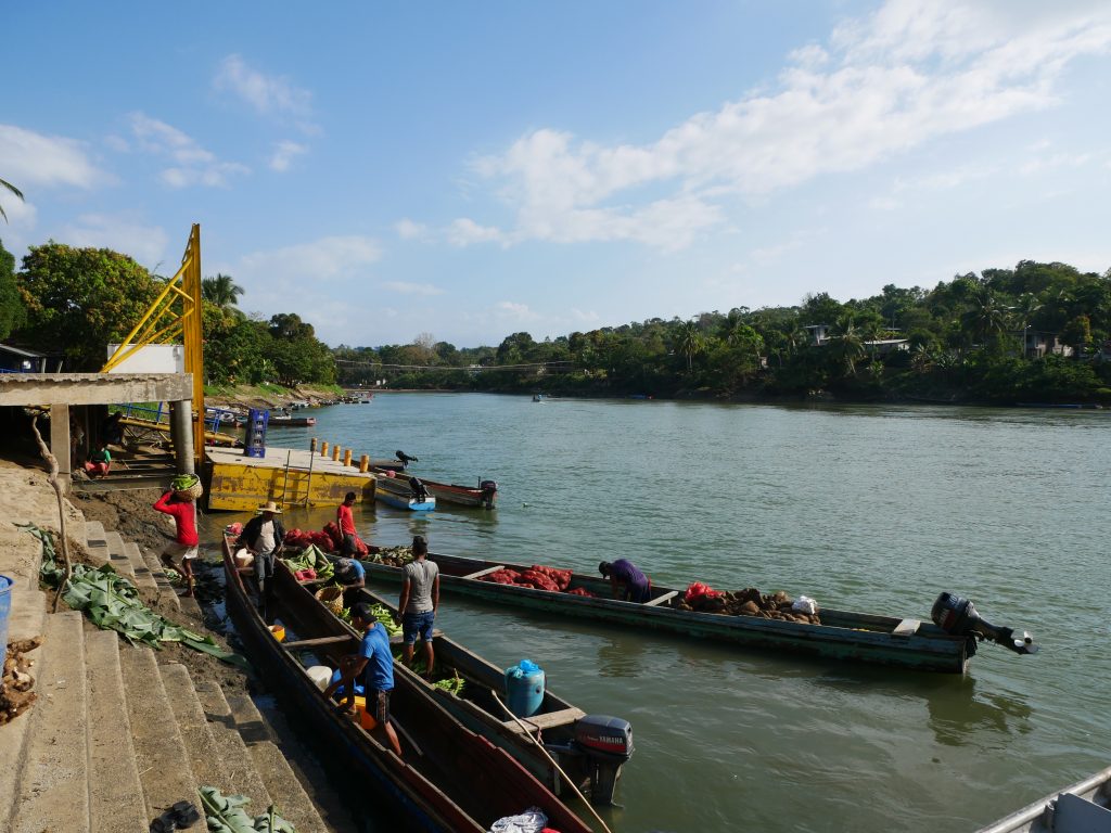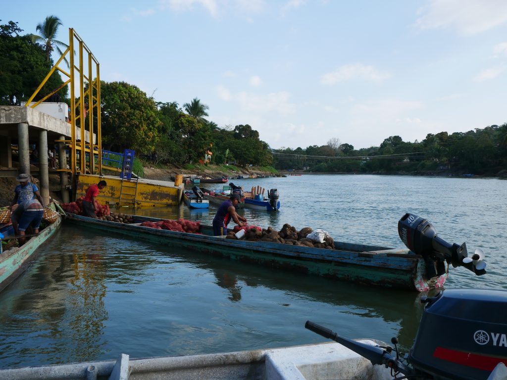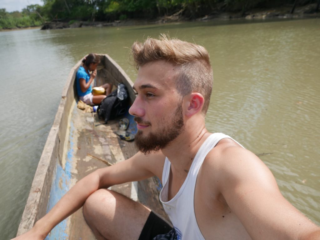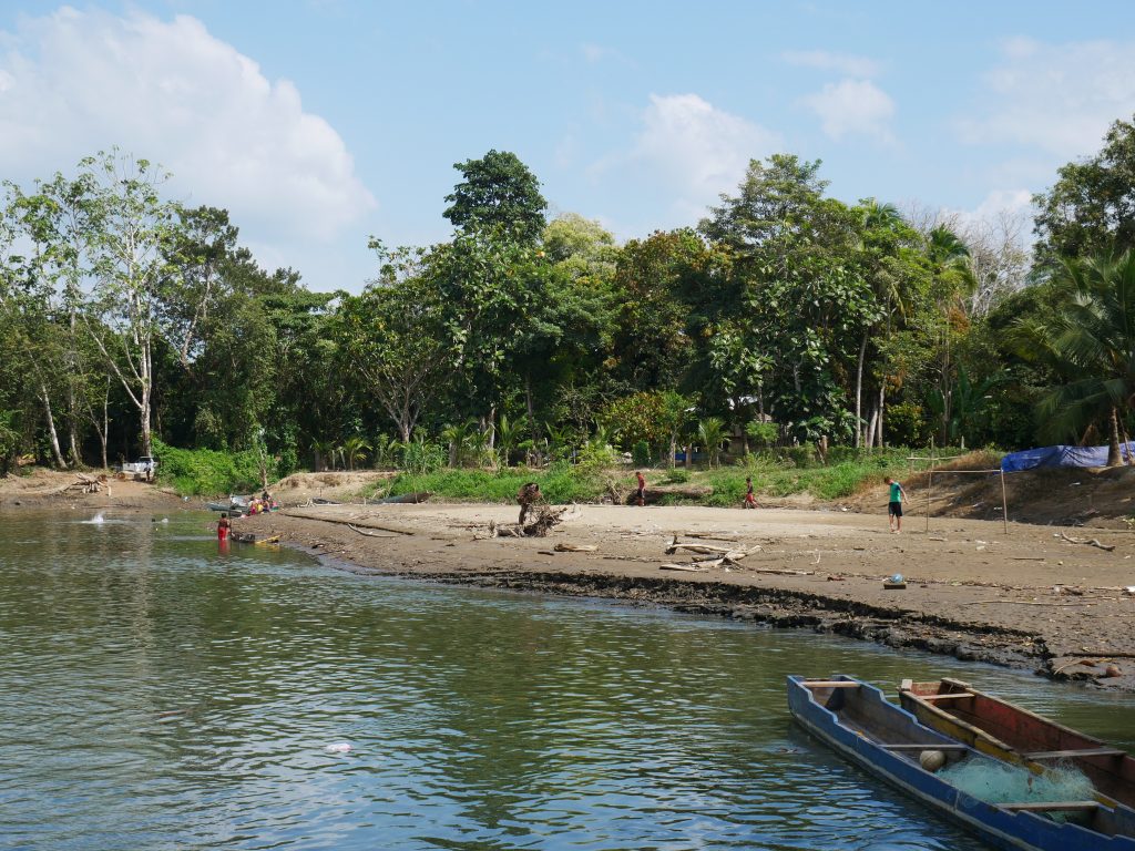 Am nächsten Morgen weckte uns die Hostelbetreiberin, als es draußen noch stockfinster war. Völlig verschlafen nahmen wir ein Frühstück, bestehend aus Kaffee, frittierten Bananen und Gebäck, zu uns. Sie hatte unsere Abreise organisiert und uns bereits bei der Senafront angemeldet, die am Steg wartete. Wir betraten ein kleines, überfülltes Boot, das uns nach La Chunga bringen sollte. Das Boot verkehrt eigentlich zwischen Puerto Quimba, der Kleinstadt La Palma und der sehr weit entlegenen Regenwaldstadt Sambú am Río Sambú. Uns hat man nach circa drei Stunden Fahrt am Ufer des Río Sambú herausgelassen, an der Stelle, wo sich offenbar das indigene Dorf befand. Solartes älterer Bruder Rutillo wartete auf dem Steg auf uns, und führte uns dann auf einem Holzweg durch die moorigen Wälder bis in das Dorf. Mit dem Schritt aus dem Boot begannen ein paar außergewöhnliche Tage, die für mich definitiv eine ganz besondere und neue Erfahrung waren.