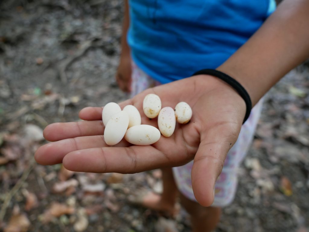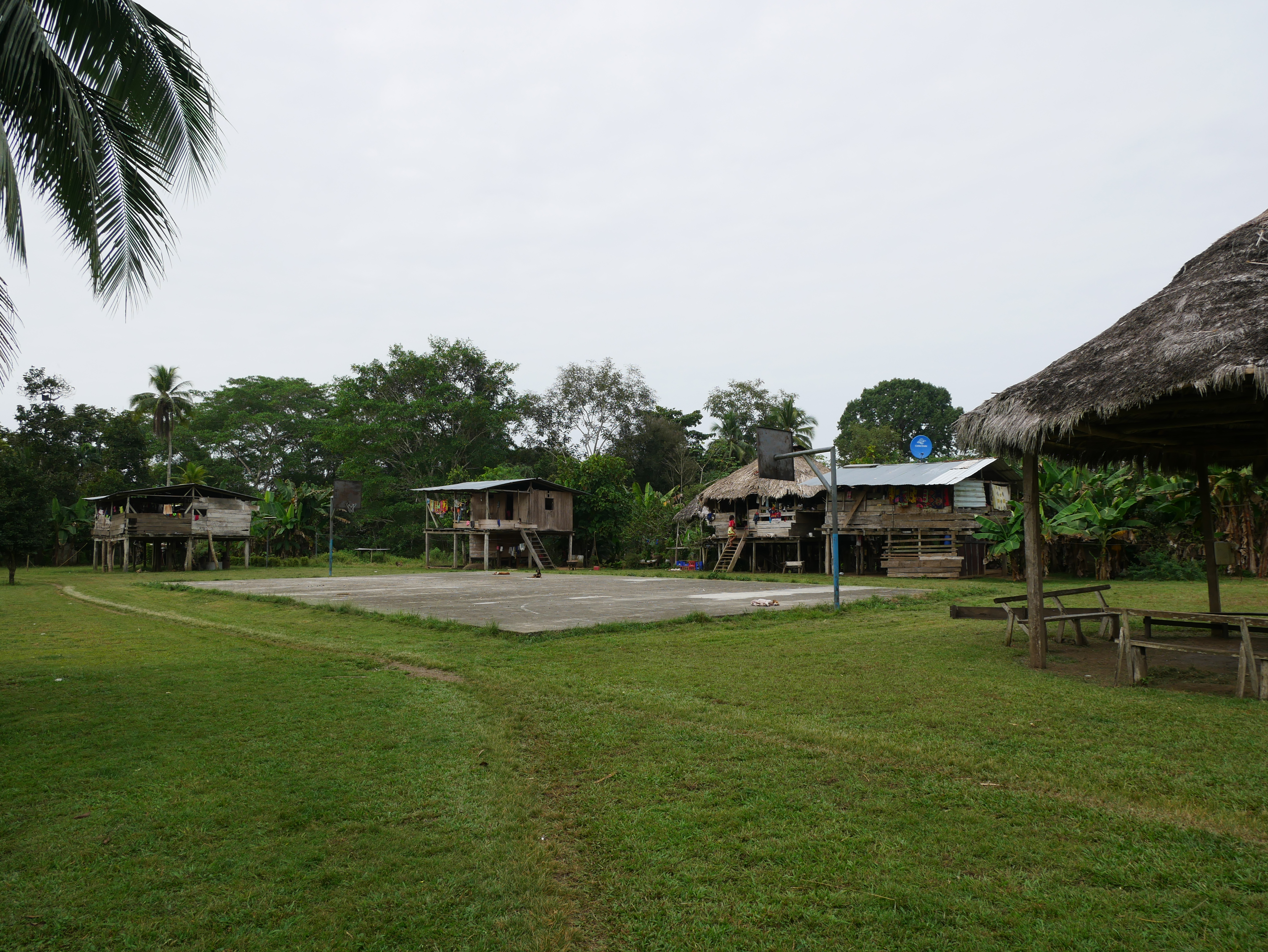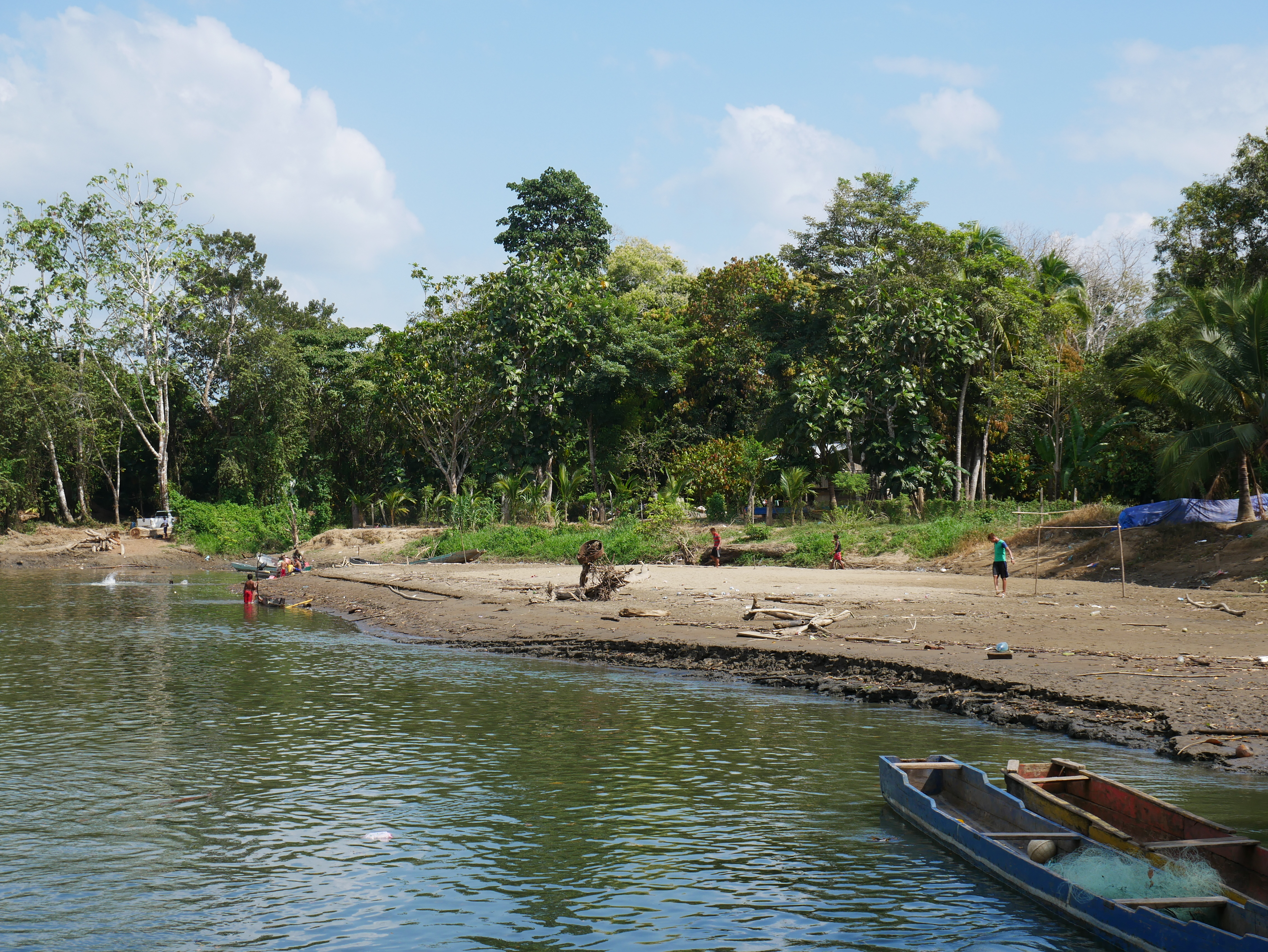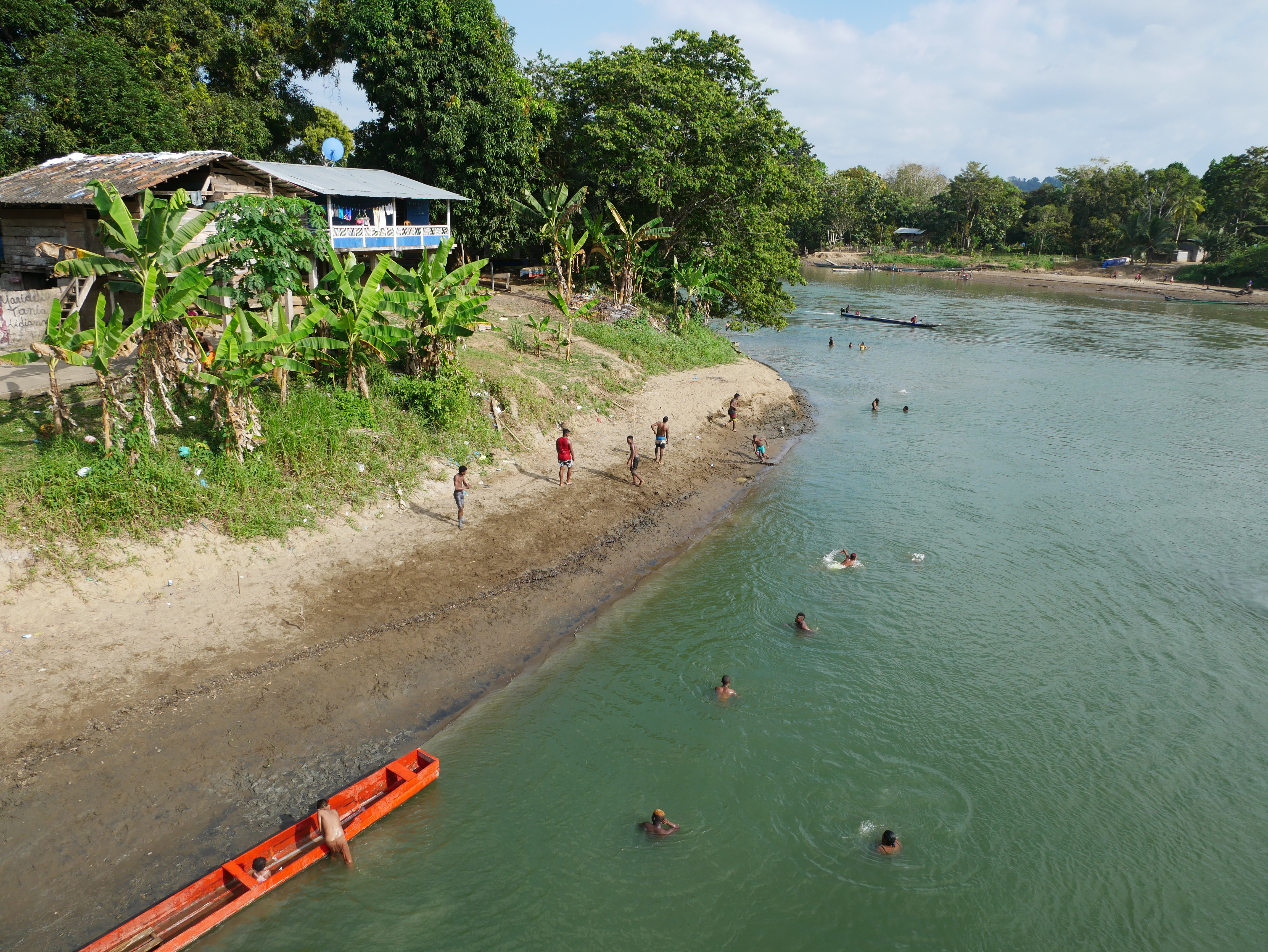 Rutillos Anwesen besteht aus seiner Hütte und einer offenen Küche, die auch von den Nachbarn genutzt wird. Daneben hat sein Bruder Solarte drei kleine überdachte Plattformen errichtet, auf denen Matratzen liegen. Für die Besucher gibt es sogar ein funktionierendes WC. Gegessen wurde in der Küche von Rutillo. Hier haben wir auch mit den Kindern Domino gespielt. Und ich habe ihnen viele Fotos von anderen Ländern gezeigt, die ich in alten Ausgaben der National Geographic mit mir führte. Mit den Kindern waren wir oft schwimmen, oder haben das Dorf erkundet. Besonders beeindruckt waren sie von meiner Drohne, mit der wir einen kleinen Rundflug wagten. Das Dorfleben war ruhig, entspannt und einfach schön. Man hat sich hier an die gelegentliche Anwesenheit der Reisenden gewöhnt, sodass man uns ohne Misstrauen aufnahm. Das zeigte sich auch bei der gemeinsamen Weihnachtsfeier. Das ganze Dorf hatte sich in der kleinen Kirche (ein Palmenblätterdach auf Stelzen) versammelt, um einem Weihnachtsgottesdienst zu lauschen. Danach gab es ein üppiges Festessen, das zum Hauptteil aus Muscheln bestand, die die Frauen vorher stundenlang im Sumpf gesammelt hatten. Bei dem großen gemeinschaftlichen Weihnachtsessen wurden wir ganz selbstverständlich und freundlich bewirtet.