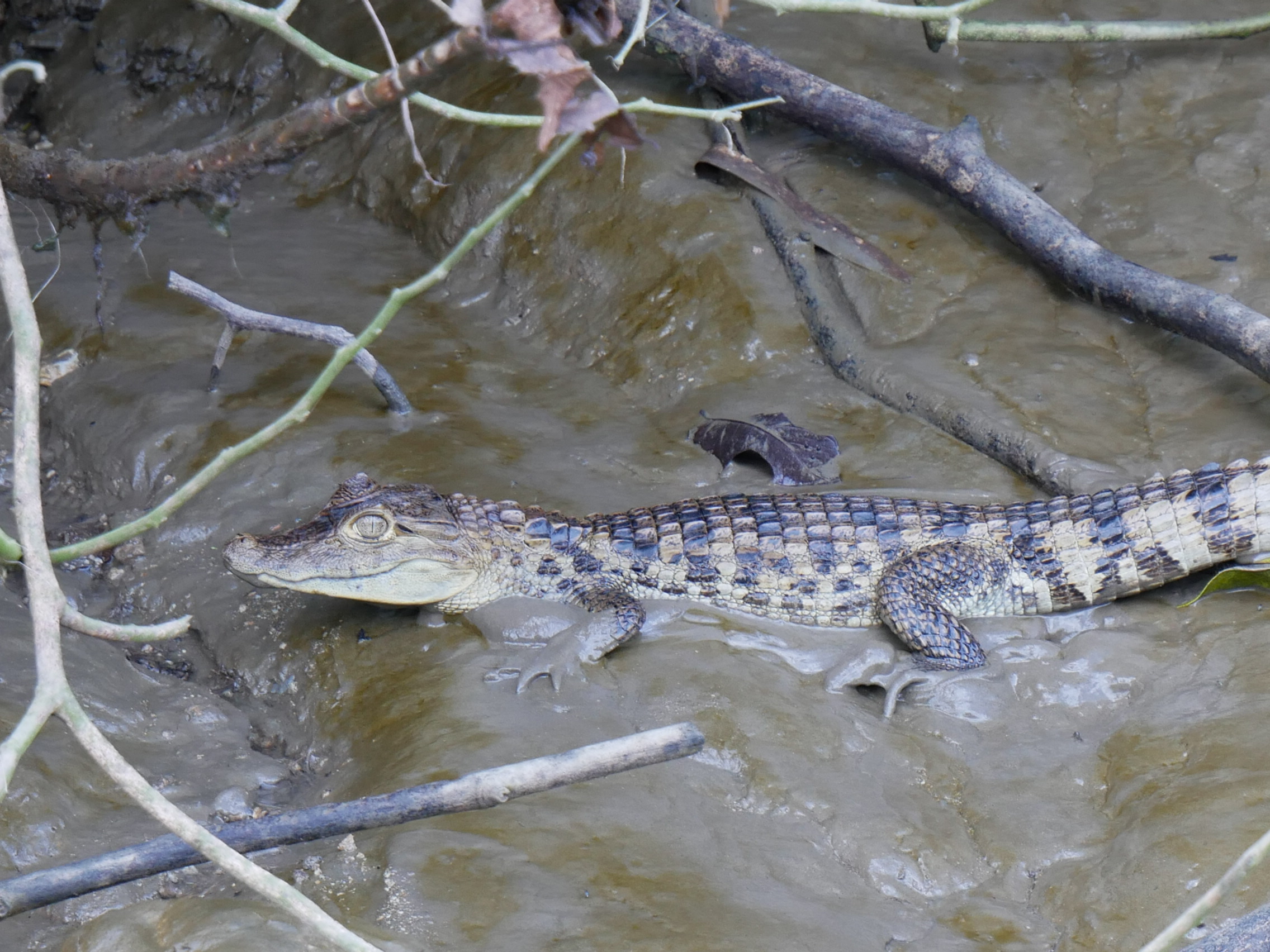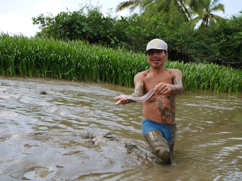 Mit Rutillo, Bernilda, Solarte und Willy war ich auch im Langboot fischen. Dazu hatten wir im Sumpf sehr viele Krabben gejagt und dann unsere Haken im Río Sambú ausgeworfen. Trotz dieser guten Köder haben wir nur einen Fisch gefangen. Im Anschluss sprang Rutillo dann noch in den tiefen Schlamm am Flussufer und schlug sich zu den Kokosnüssen durch, und das, obwohl wir im Krokodilgebiet unterwegs waren. Gesehen haben wir allerdings nur ihre großen Fußspuren und die Babys. Die großen Krokodile lagen wohl unter unserem Boot auf der Lauer.