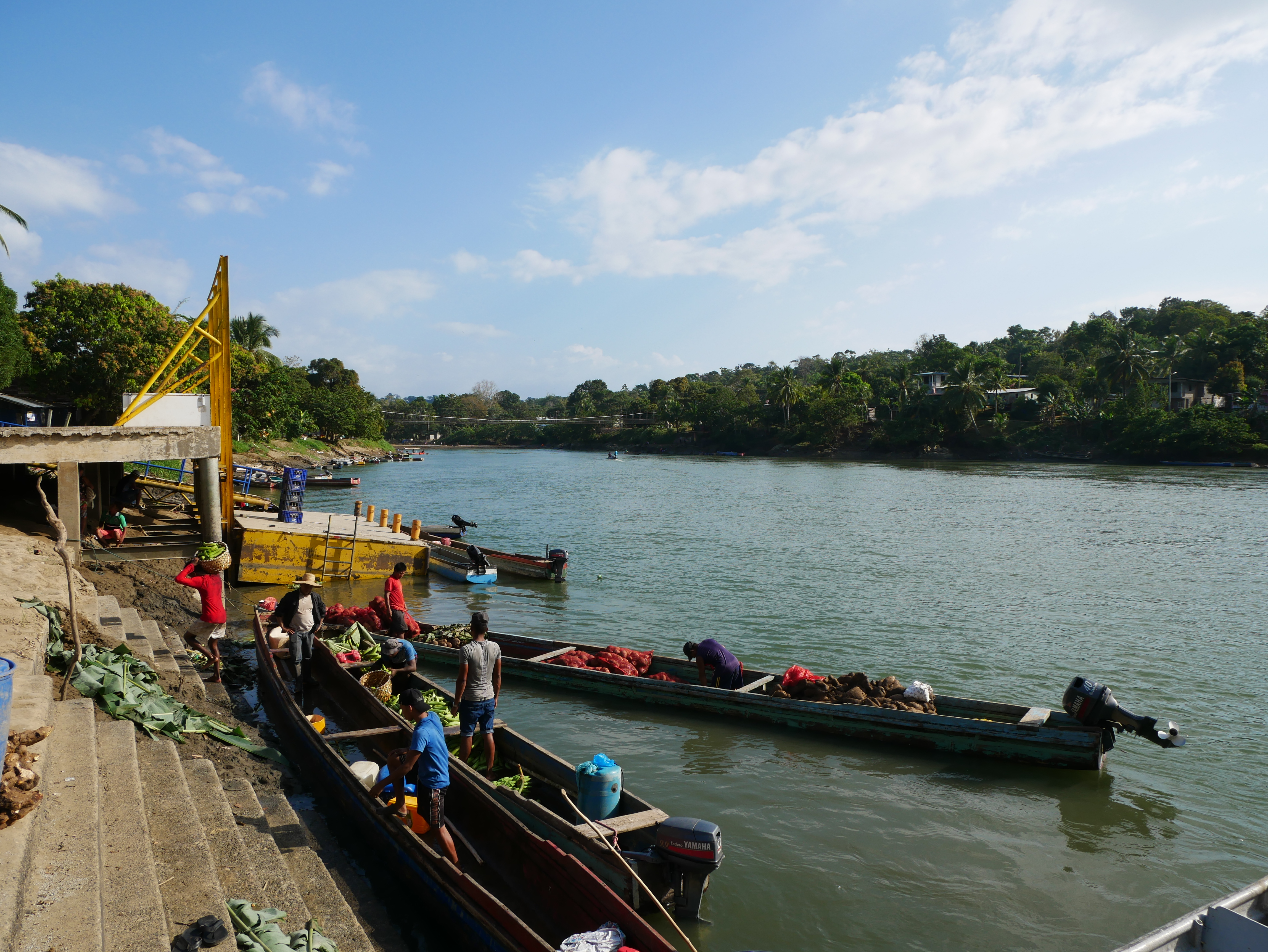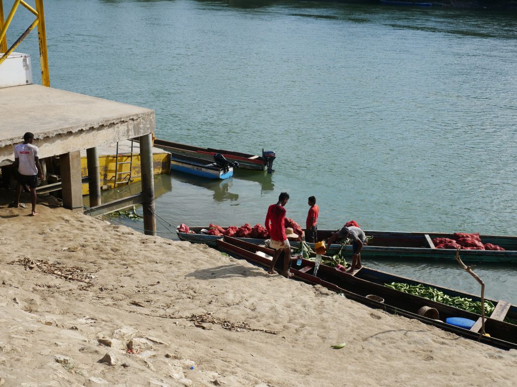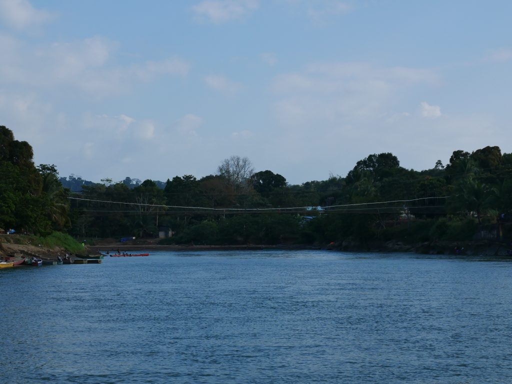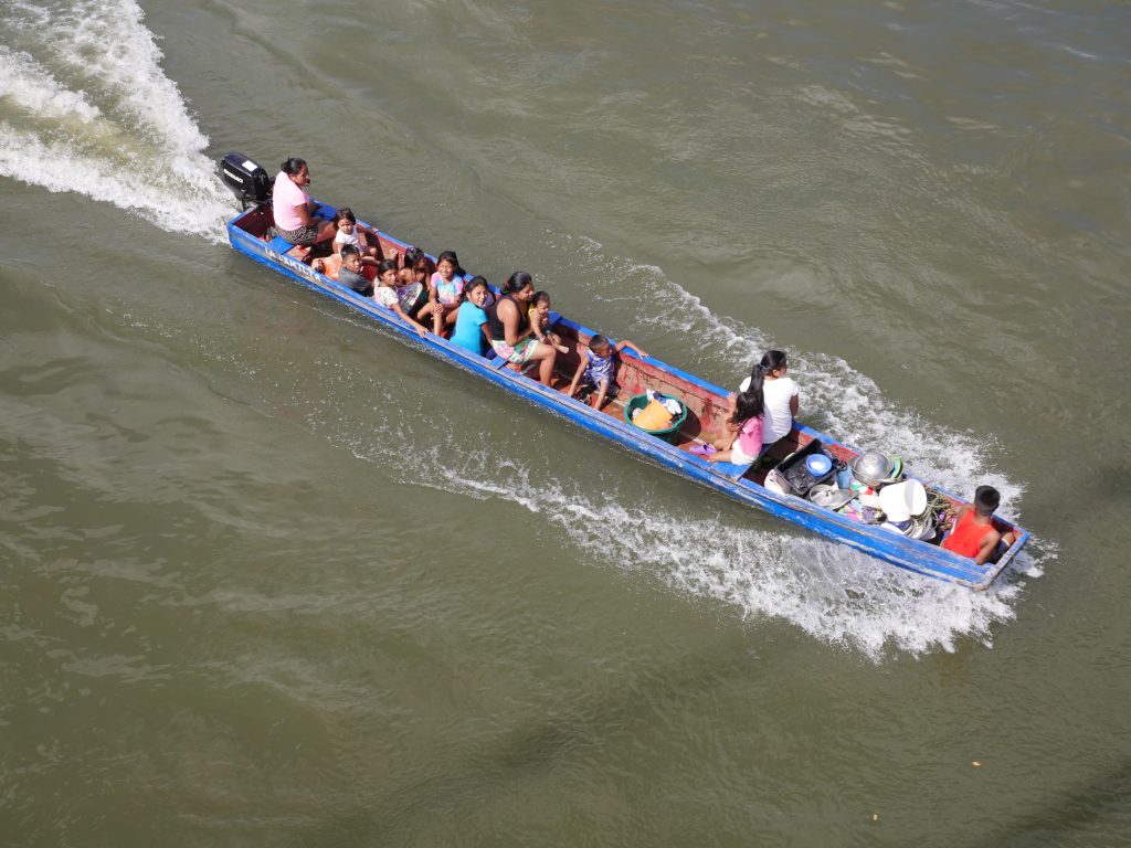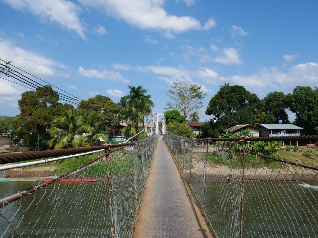 Gerne wäre ich in La Chunga länger geblieben. Sehr gerne würde ich wiederkommen. Aber unsere Zeit ist begrenzt, denn wir haben uns noch viele Reiseziele vorgenommen. Und so mussten wir schon am Freitag wieder in See stechen. In die stürmische See, wohlgemerkt. Der Golf war bei unserer Rückfahrt sehr unruhig. Wir hatten das Gepäck unter großen Planen versteckt, denn von vorne schlugen uns riesige Wellen ins Gesicht. Dazu regnete es, sodass alle Passagiere völlig durchnässt waren und sich frierend aneinander drängten. Trotzdem haben wir Puerto Quimba erreicht, ohne zu kentern, und sind dann mit mehreren kleinen Bussen nach Yaviza gefahren. Da wir unsere Rückreise um drei Uhr morgens begonnen hatten, waren wir bereits um elf Uhr in Yaviza. Dort hatte ich eine Unterkunft für eine Nacht gebucht, so blieb uns also ein halber Tag, um die Stadt zu erkunden. Die Stadt hat eine sonderbare Atmosphäre, soviel steht wohl fest. Es gibt im Prinzip nur eine große Hauptstraße, auf der sich das wichtigste Geschehen abspielt, und ein paar Nebensträßchen mit einfachen, kleinen Häusern. Besonders auf der anderen Flussseite, die über eine Hängebrücke erreicht werden kann, sind die Hütten inzwischen ziemlich baufällig. Überall herrscht geschäftiges Treiben. Im Prinzip ist die wichtigste Funktion dieser Stadt, eine Verbindung zwischen Dschungeldörfern und dem Rest Panamas zu bieten. Obst und Gemüse, das per Langboot von Indigenen aus dem Regenwald herangebracht wird, wird hier auf Transporter geladen. Anwesend sind auch die Soldaten der Senafront, die natürlich genau wissen, dass auch andere Dinge in Yaviza verladen werden. Die Rede ist von Drogen, die von Schmugglern aus Kolumbien durch den Wald transportiert werden. Für mich wirkte die Stadt angespannt – und irgendwie unfertig, so als ob es noch nicht geglückt ist, die geplante Heimat im dichten Wald zu errichten. Es wirkt, als würde die abgelegene Stadt vom Rest des Landes mehr oder weniger vergessen. Für mich war Yaviza ein eindrucksvoller Ort, der durchaus einen kurzen Besuch wert ist.