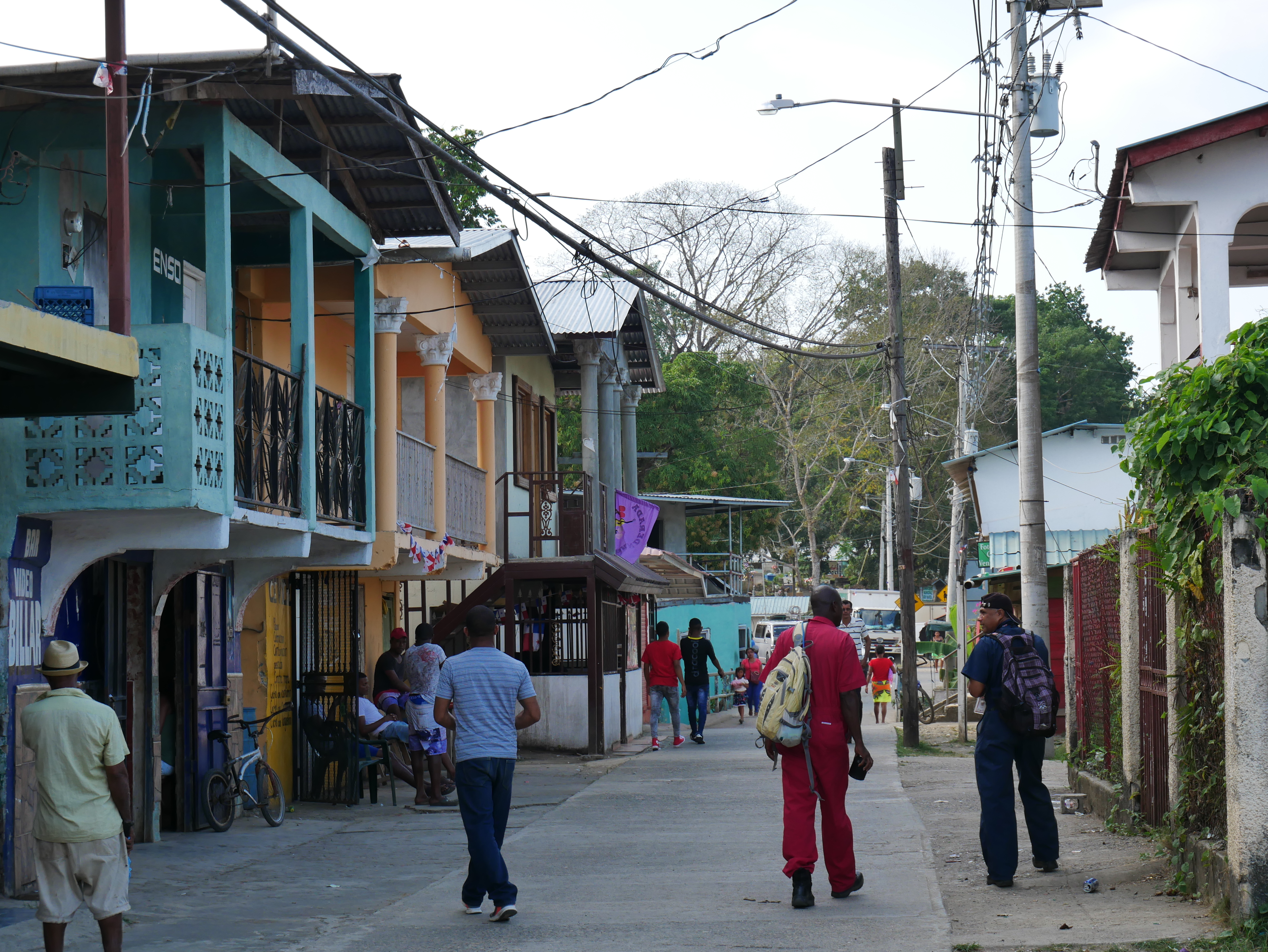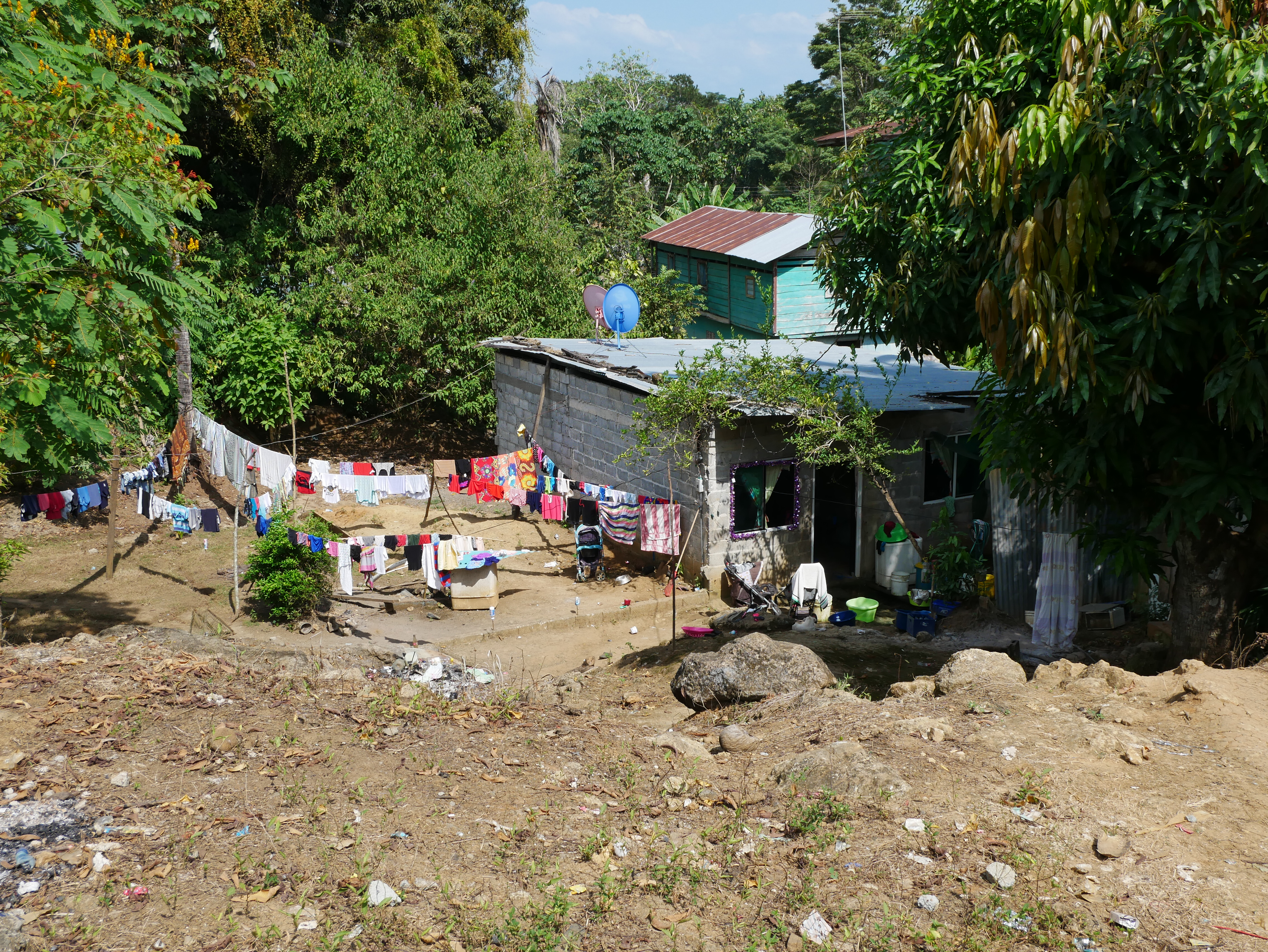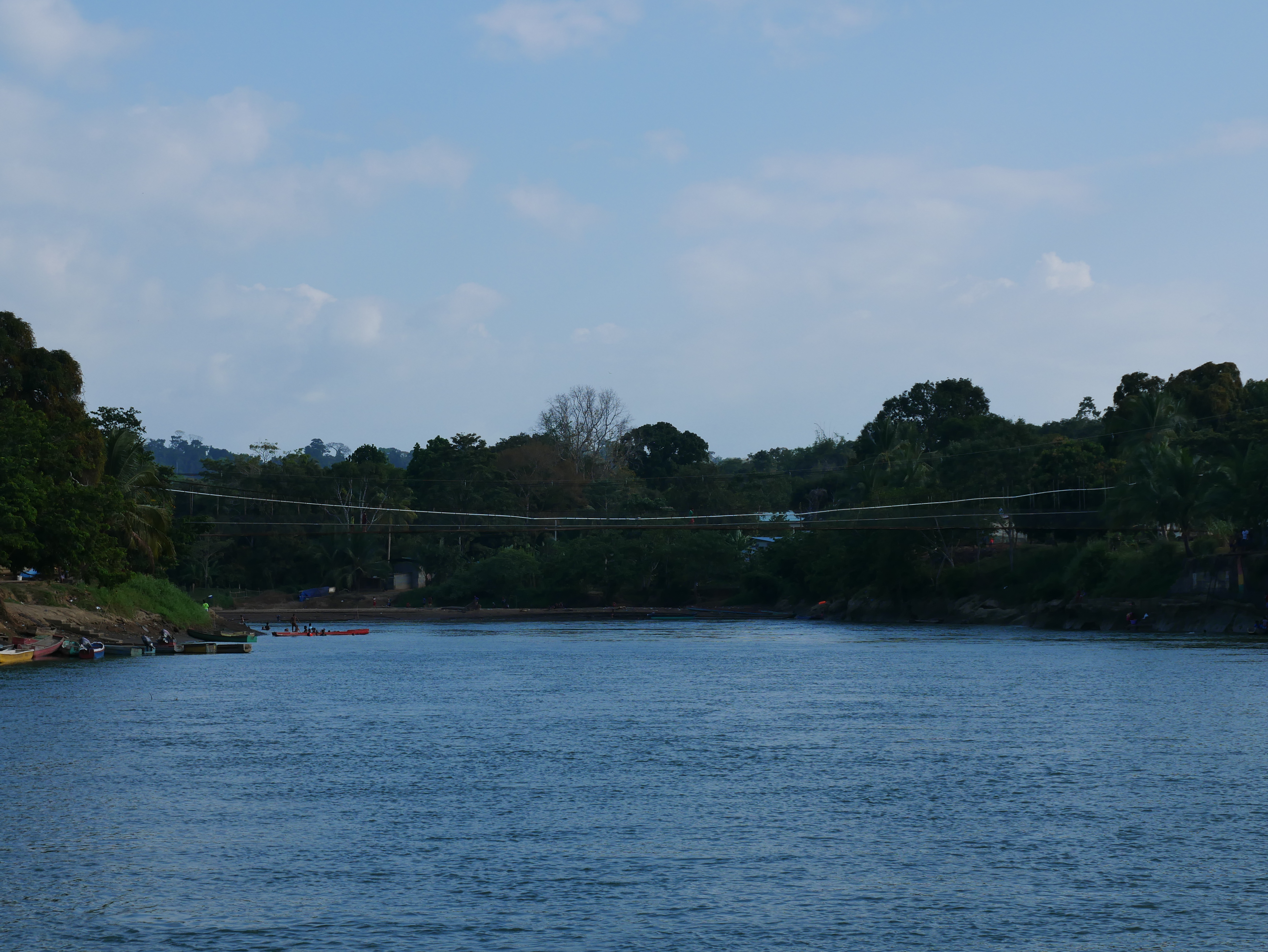 Gerne wäre ich in La Chunga länger geblieben. Sehr gerne würde ich wiederkommen. Aber unsere Zeit ist begrenzt, denn wir haben uns noch viele Reiseziele vorgenommen. Und so mussten wir schon am Freitag wieder in See stechen. In die stürmische See, wohlgemerkt. Der Golf war bei unserer Rückfahrt sehr unruhig. Wir hatten das Gepäck unter großen Planen versteckt, denn von vorne schlugen uns riesige Wellen ins Gesicht. Dazu regnete es, sodass alle Passagiere völlig durchnässt waren und sich frierend aneinander drängten. Trotzdem haben wir Puerto Quimba erreicht, ohne zu kentern, und sind dann mit mehreren kleinen Bussen nach Yaviza gefahren. Da wir unsere Rückreise um drei Uhr morgens begonnen hatten, waren wir bereits um elf Uhr in Yaviza. Dort hatte ich eine Unterkunft für eine Nacht gebucht, so blieb uns also ein halber Tag, um die Stadt zu erkunden. Die Stadt hat eine sonderbare Atmosphäre, soviel steht wohl fest. Es gibt im Prinzip nur eine große Hauptstraße, auf der sich das wichtigste Geschehen abspielt, und ein paar Nebensträßchen mit einfachen, kleinen Häusern. Besonders auf der anderen Flussseite, die über eine Hängebrücke erreicht werden kann, sind die Hütten inzwischen ziemlich baufällig. Überall herrscht geschäftiges Treiben. Im Prinzip ist die wichtigste Funktion dieser Stadt, eine Verbindung zwischen Dschungeldörfern und dem Rest Panamas zu bieten. Obst und Gemüse, das per Langboot von Indigenen aus dem Regenwald herangebracht wird, wird hier auf Transporter geladen. Anwesend sind auch die Soldaten der Senafront, die natürlich genau wissen, dass auch andere Dinge in Yaviza verladen werden. Die Rede ist von Drogen, die von Schmugglern aus Kolumbien durch den Wald transportiert werden. Für mich wirkte die Stadt angespannt – und irgendwie unfertig, so als ob es noch nicht geglückt ist, die geplante Heimat im dichten Wald zu errichten. Es wirkt, als würde die abgelegene Stadt vom Rest des Landes mehr oder weniger vergessen. Für mich war Yaviza ein eindrucksvoller Ort, der durchaus einen kurzen Besuch wert ist.
