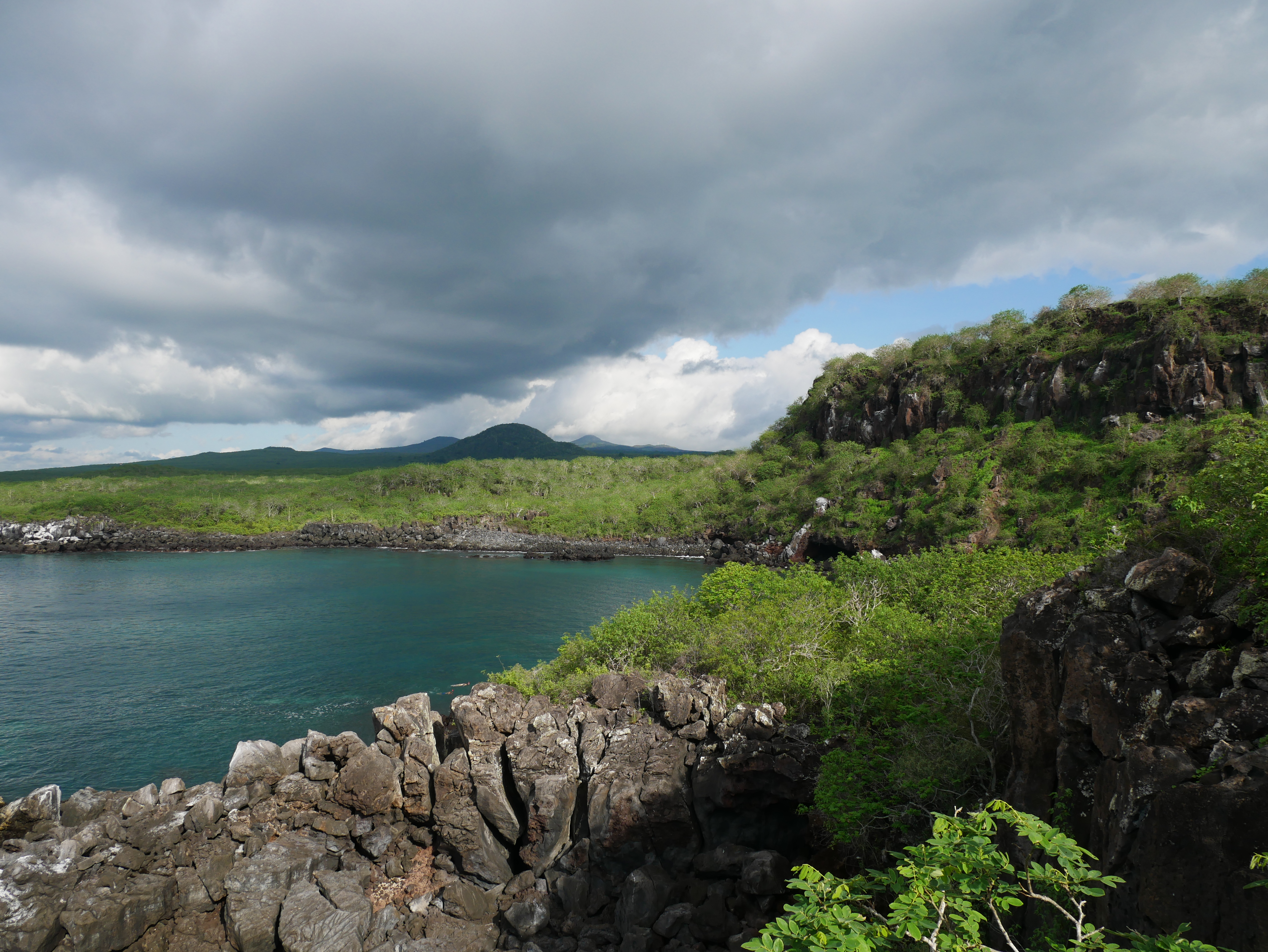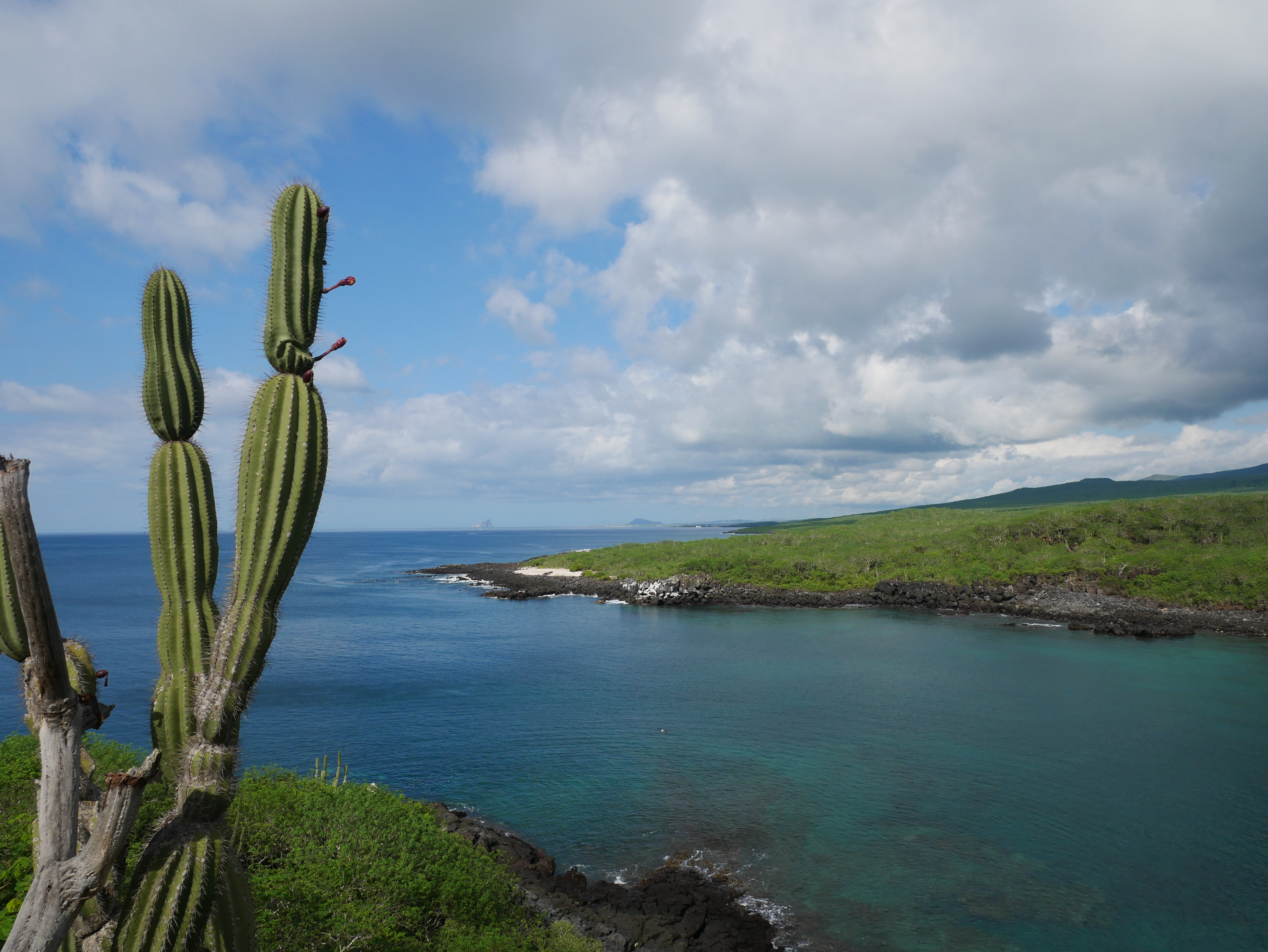 Das Museum liegt direkt vor der Stadt, und von hier aus führen verschiedene Wege in das dichte Buschland der Insel. Man kann mehrere Strände und Buchten erreichen, in denen man schwimmen und schnorcheln kann. Besonders schön fand ich den Aussichtspunkt „Mirador Cerro Tijeretas“ auf der oberen Kante einer Klippe, von dem aus man im Meer sogar den berühmten Kicker Rock erspähen kann. Wir waren zu Füßen dieser Klippe schnorcheln. Das Wasser hier ist sehr klar, und man kann einige Fische, kleine Riffhaie und mit etwas Glück auch Schildkröten und Robben beobachten.