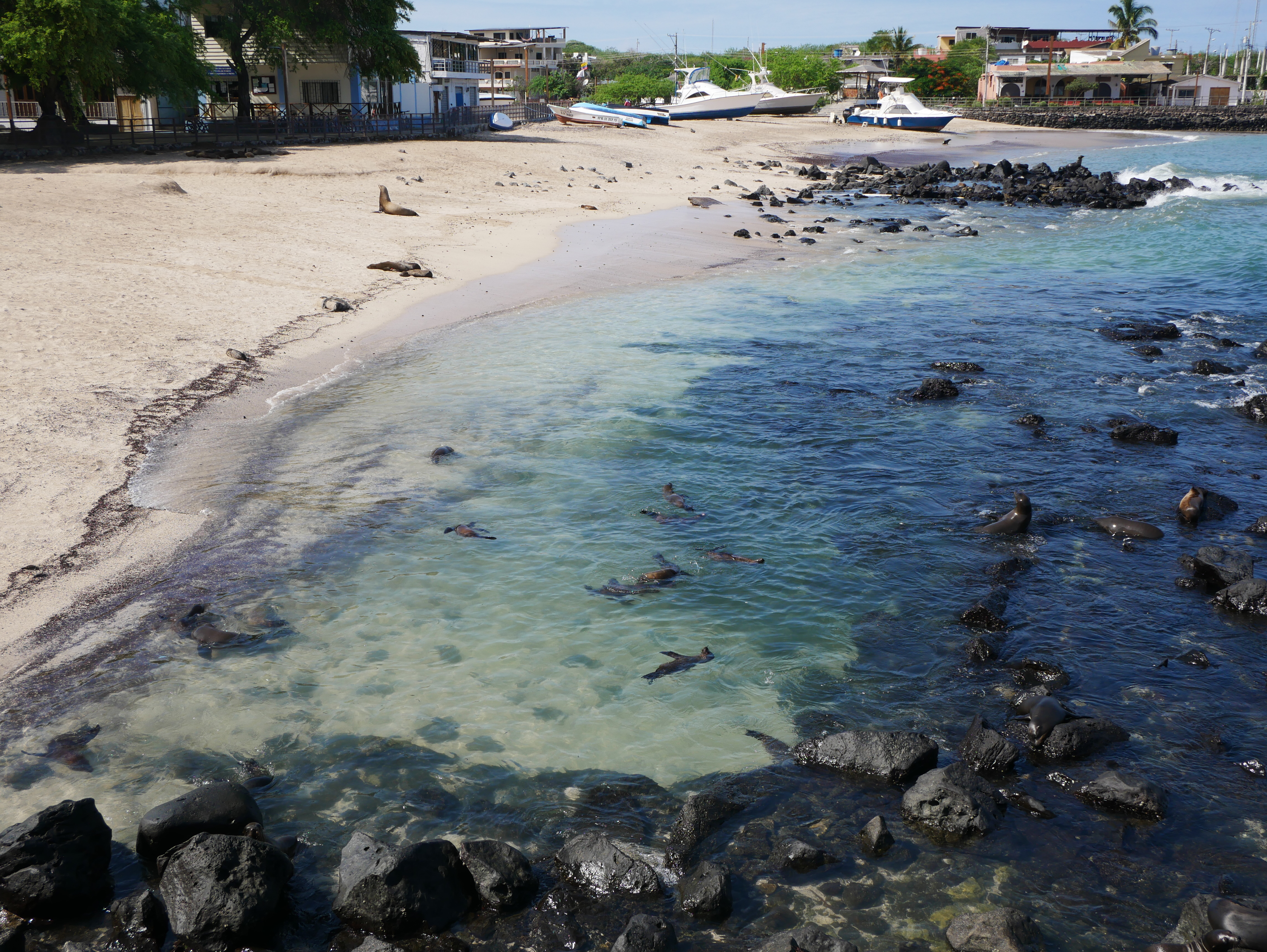 Da wir eine sehr zeitige Fähre von Santa Cruz aus nahmen, erreichten wir Cristóbal schon gegen neun Uhr morgens. Die Stadt, in der wir unterkamen, heißt Puerto Baquerizo Moreno. Der Ort ist die Hauptstadt der Provinz Galapagos, und gut gepflegt und einigermaßen modern, eigentlich genau wie Puerto Ayora. Der große Unterschied ist aber, dass es hier direkt im Ort ein paar Strände gibt, auf denen sehr viele Seelöwen liegen. Es sind sogar deutlich mehr als in Puerto Ayora, hier kann man ganze Großfamilien beobachten. Die Seelöwen liegen aneinander gekuschelt im Sand, während ihre Babys im flachen Wasser erste Schwimmversuche wagen. Die Robben, von uns liebevoll entweder als Robin oder Roberta bezeichnet, sind scheinbar keine besonders schlauen Tiere. Jedenfalls benehmen sie sich ziemlich tollpatschig, sodass man als Beobachter herzlich lachen kann.