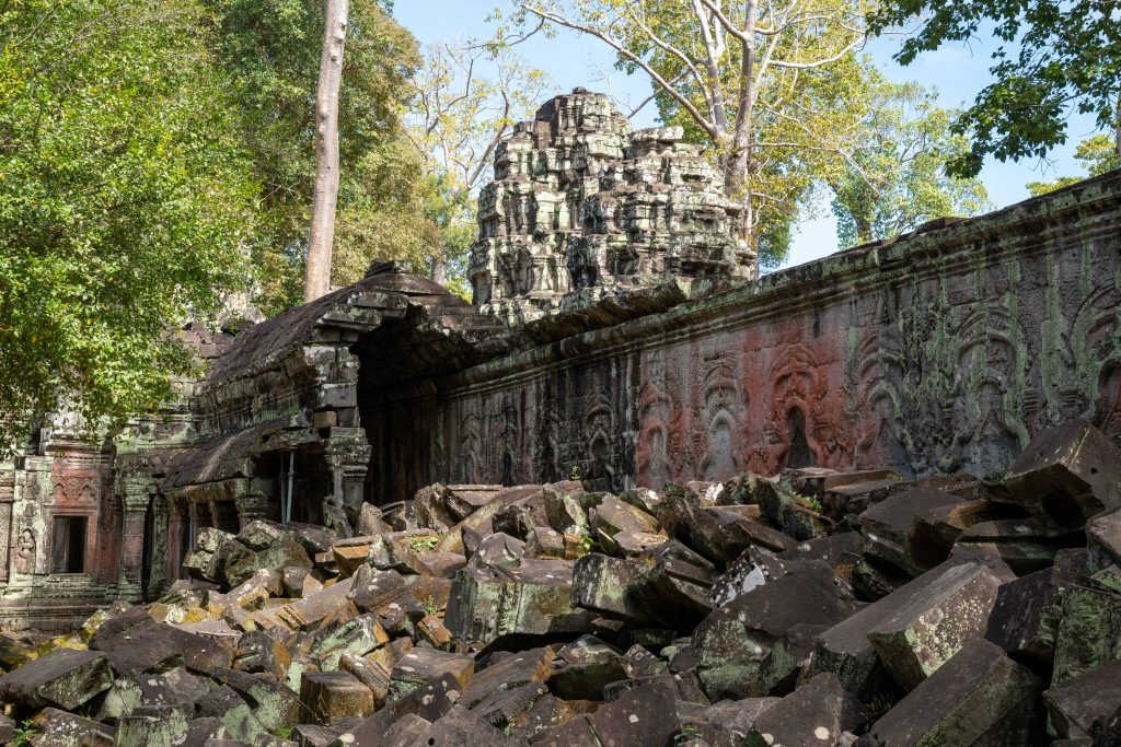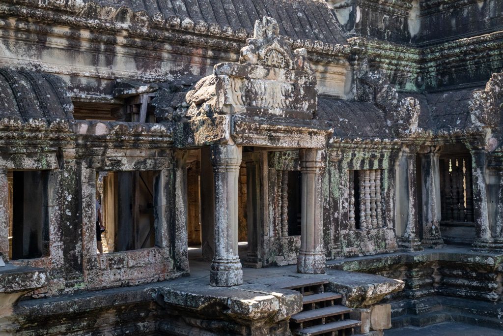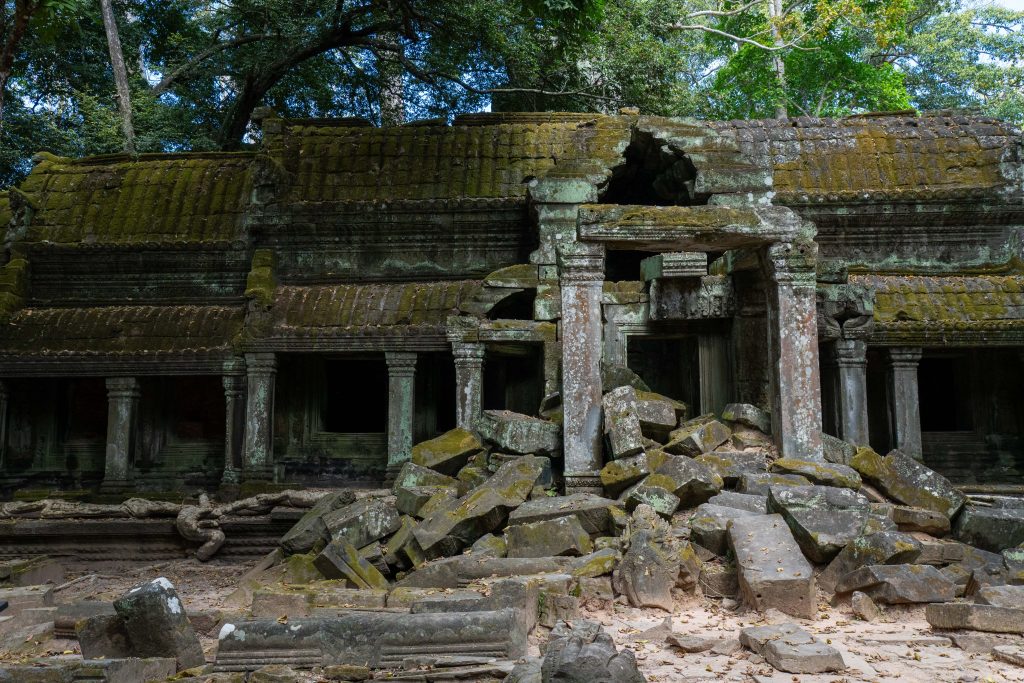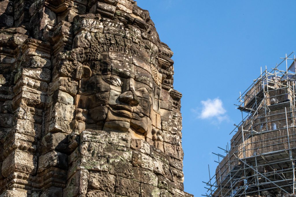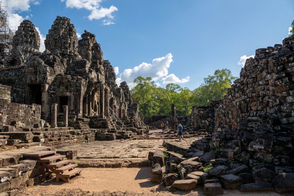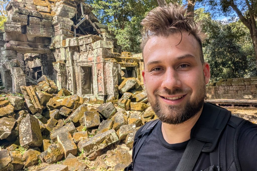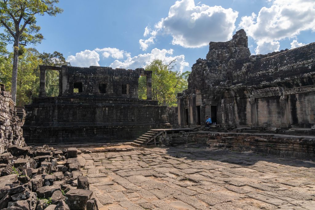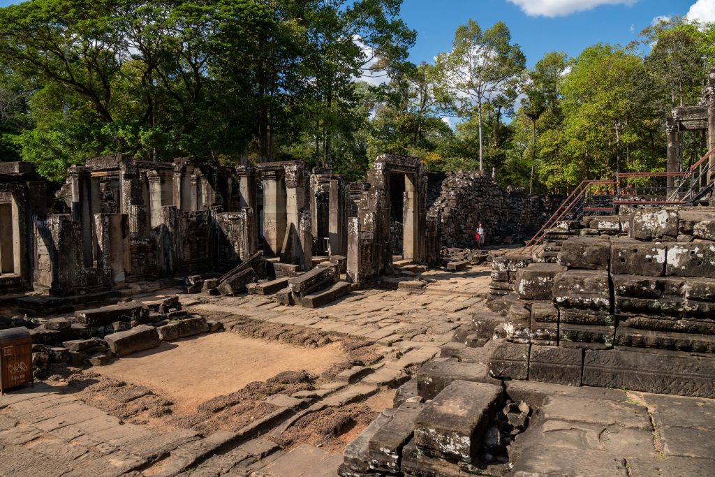 Den Rest des Tages nutzte ich, um weitere Tempel zu besuchen. Ganz in der Nähe befindet sich der Bayon Tempel, der wiederum von weiteren Bauwerken umgeben ist. Die Strukturen hier sind deutlich verfallener. Zwischen den Bäumen stapeln sich Trümmerhaufen eingefallener Mauern und Türme. Doch die einstige Pracht ist nach wie vor erkennbar und man kann Archäologen beobachten, die die Steinhaufen sortieren und wohl nach und nach wieder aufbauen werden.