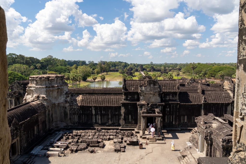 Nach einer Stunde verabschiedete ich mich, und während die beiden noch weitere Wandbilder betrachteten, erkundete ich nun den gesamten Tempel zu Fuß. Es gab viele Höfe, Gänge, Altäre – und steile Treppen führten auf die Türme hinauf. Von oben konnte man auch die gesamte Insel überblicken. Seen, Mauern und ein Wald prägen den Ort. Stundenlang entdeckte ich die verwinkelte Anlage zu Fuß.