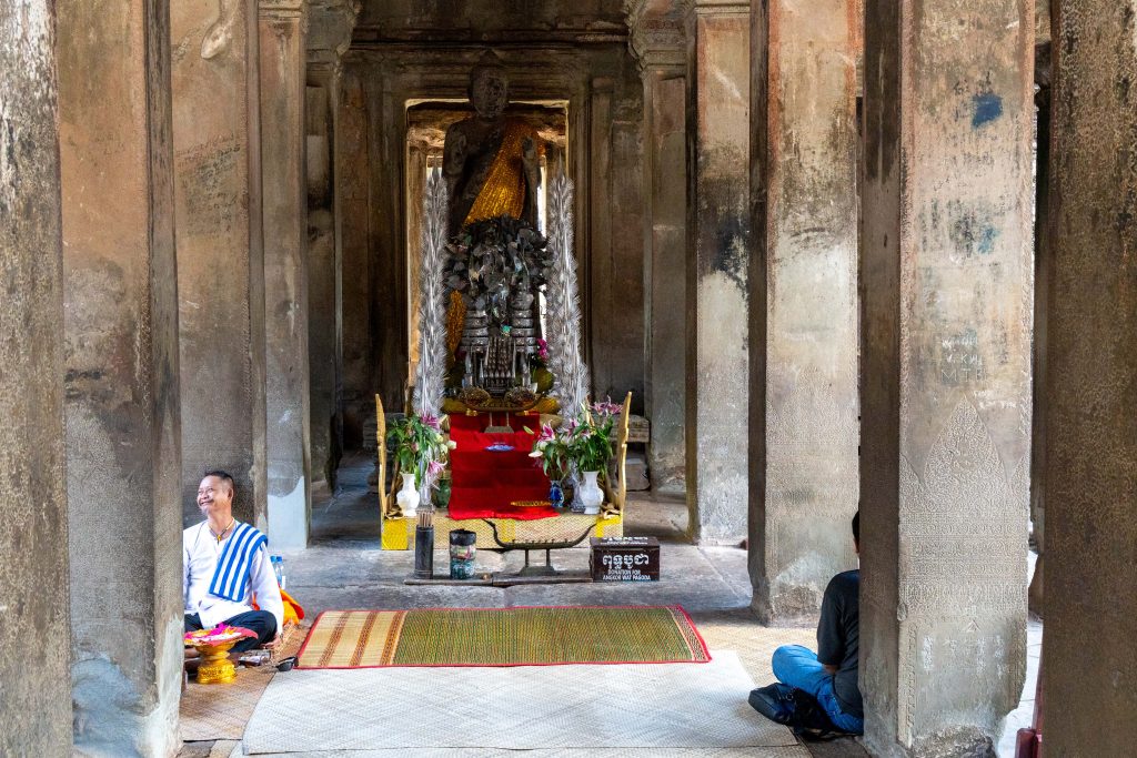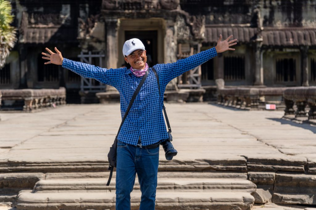 Als ich mich im Schatten ausruhte, sprach mich ein junger Mann an. Er sei Fotograf, ob ich denn Bilder von mir möchte, wolle er wissen. Ich verneinte, weil ich meine Fotos in der Regel selbst mache. Doch ich blieb und beobachtete ihn bei seiner Arbeit. Eifrig dirigierte er die Touristen, die seine Dienste in Anspruch nahmen. Wo sie stehen sollten, wie sie schauen und wie sie gestikulieren könnten… Er wusste es ganz genau. Nach ein paar Minuten hatte er die Fotos beisammen, die er dann für einen Dollar auf das Handy der Kunden schickte. Nun bat er mich, ihn zu fotografieren, denn er hatte meine Kamera entdeckt. Ich schoss einige Bilder, die er sich ganz begeistert anschaute und sofort überspielte. Nun hätten wir einen guten Tausch, dachte ich, und gab ihm meine Kamera. Und tatsächlich schoss er fantastische Bilder von mir. Diese Begegnung zeigte mir auch, wie freundlich und unkompliziert hier viele Menschen sind. Ein Eindruck, der sich weiter verfestigte. Es fiel mir an diesem Tag und auch danach sehr leicht, Verbindungen zu den Kambodschanern aufzubauen.