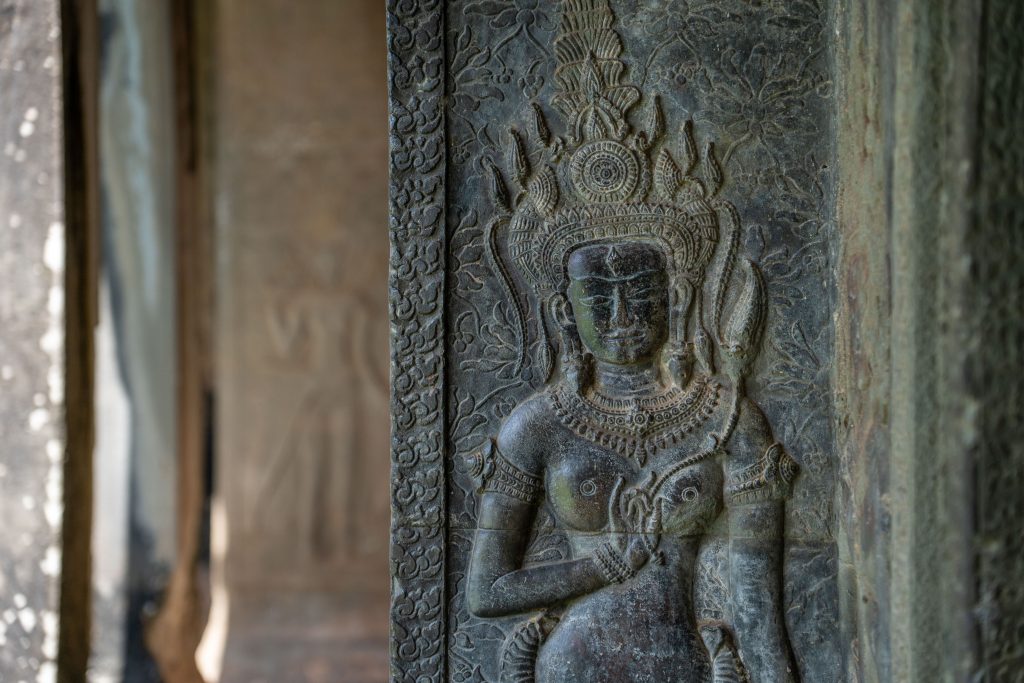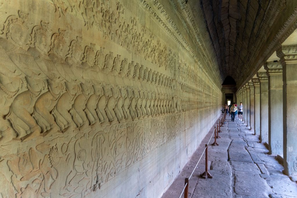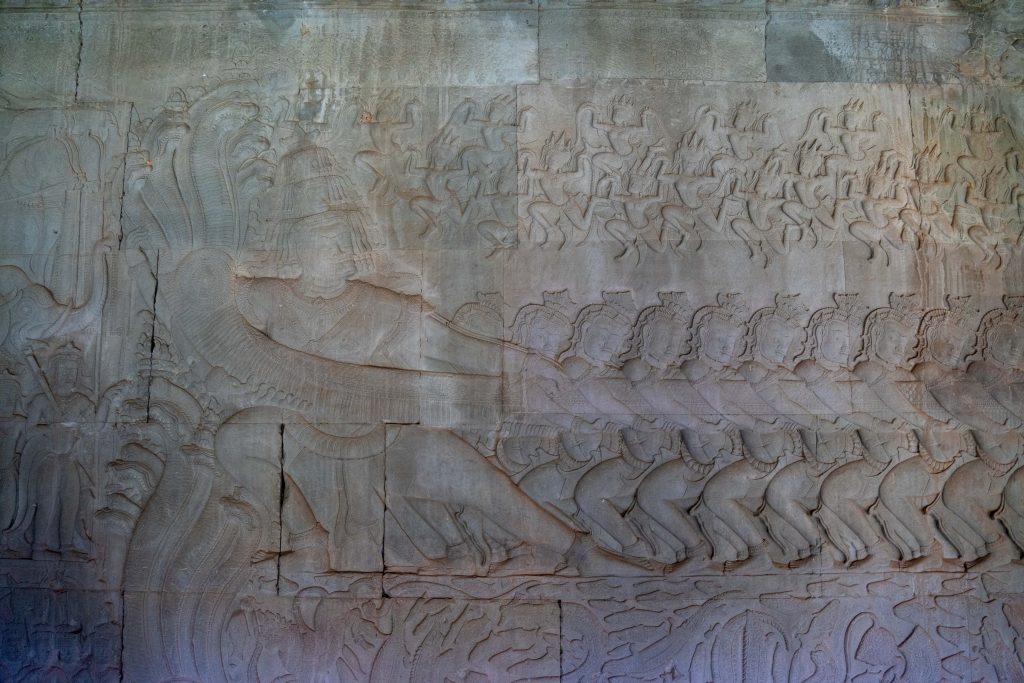Frühmorgens machte ich mich auf den Weg nach Angkor Wat. Es ist ein rund 900 Jahre alter Tempel, der seit seiner Errichtung fast durchgehend religiös genutzt wurde und deshalb außergewöhnlich gut erhalten ist. Die Tempelanlage liegt auf einer rechteckigen, künstlichen Insel von circa zwei Quadratkilometern Größe. Übrigens ist Angkor Wat nicht der einzige monumentale Tempel in der Gegend. Rund um Siem Reap liegen über 70 große Tempel und mehr als 1.000 religiöse Bauwerke. Manche sind gut erhalten. Einige sind von dichtem Dschungel überwachsen und liegen in Trümmern. Archäologen sichern auch heute noch verschollene Bauwerke im Angkor Archaeological Park. Man könnte Tage und Wochen damit verbringen, diese historischen Schätze zu erkunden. Für mich begann es nun mit Angkor Wat. Über einen Damm gelangte ich zur Insel. Der Pfad führte durch ein steinernes Tor, und auf den Stufen unterhielt ich mich kurz mit einem älteren Mann, der mit einem einheimischen Guide unterwegs war. Er stellte sich als Professor und Archäologe vor. Ursprünglich aus Malaysia, wohnt er nun in Australien. Sein Interesse an den historischen Tempeln zieht ihn immer wieder hierher. Der Guide, selbst natürlich mit der Anlage bestens vertraut, bezeichnete ihn voller Respekt als einen Lehrer, der mehr über Angkor Wat wüsste als die allermeisten Menschen hier. Die beiden zogen mal wieder durch das weitläufige Gelände, um zu fachsimpeln und zu philosophieren. Sie luden mich ein, sie zu begleiten. Sehr langsam liefen wir durch die Gänge des Bauwerkes und betrachteten die Wandbilder, die in den weichen Stein gemeißelt waren. Der Professor erklärte mir jedes Detail. Auf einer Wand waren Dämonen und Götter versammelt, die an zwei Seiten einer riesigen Schlange zogen. Diese war um einen Berg gewickelt. Durch das Hin- und Herreißen quirlte dieser den kosmischen Milchozean auf. Nur so könne man Amrita, das Getränk der Unsterblichkeit, erlangen. Götter und Dämonen mussten gemeinsame Sache machen, so wichtig war ihre Aufgabe. Und Vishnu trug den gewaltigen Berg im Ozean auf seinem Rücken – er hatte sich in eine Schildkröte verwandelt. Als das begehrte Getränk schließlich gewonnen war, wollten es die Dämonen nur für sich behalten. Nun war es abermals Vishnu, der eingreifen musste. In Form einer schönen Frau verführte er die Dämonen, und die Götter konnten den Unsterblichkeitstrank an sich nehmen, während die liebeskranken Dämonen abgelenkt waren. Der Professor war begeistert und suchte eifrig all die kleinen Details der Geschichte auf dem riesigen Relief.