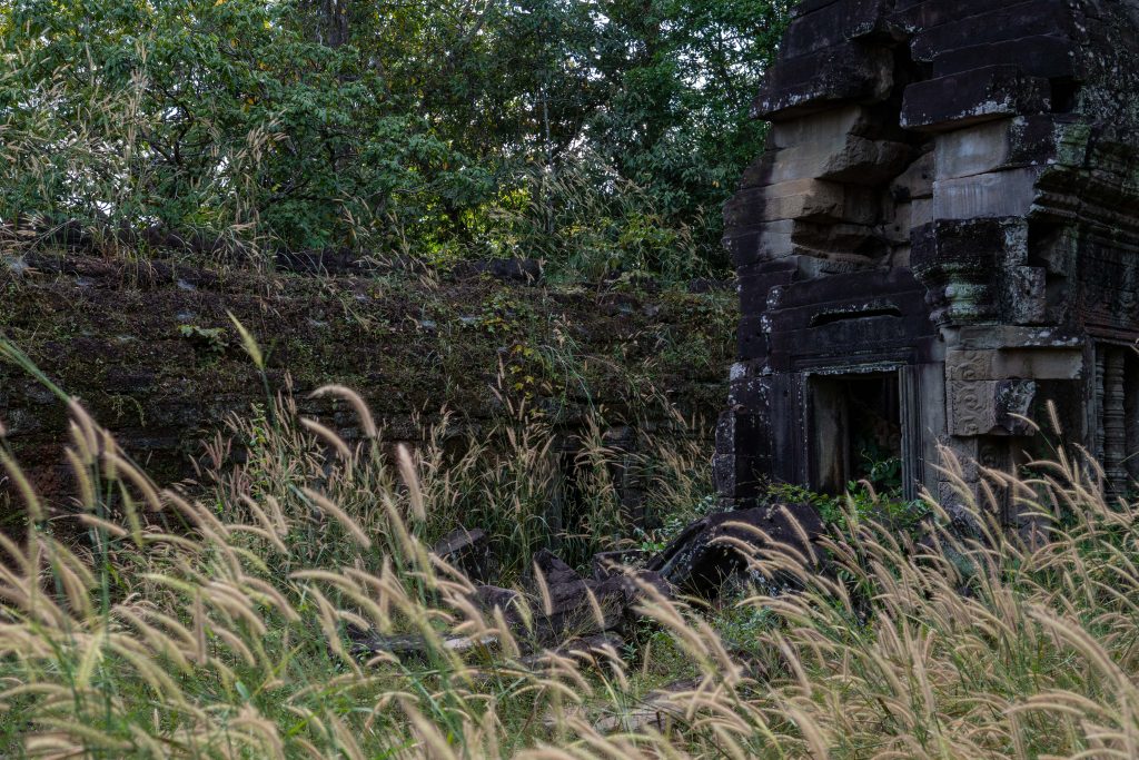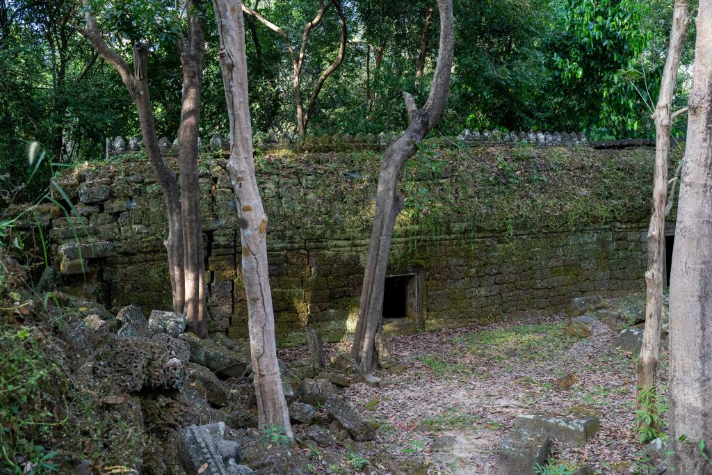 Zum Schluss besuchte ich noch den Banteay Thom Tempel. Der liegt tief im Wald und ist nur über einen zerfurchten Feldweg zu erreichen, der durch einige Dörfer und den Dschungel führt. Kein Mensch war dort, weder Besucher noch Tempelwächter. Die Anreise ist einfach zu beschwerlich. Für mich war es ein besonderes Erlebnis, denn ich konnte den Tempel ganz allein erkunden. Bäume und hohes Gras hatten das Bauwerk schon halb verschlungen.