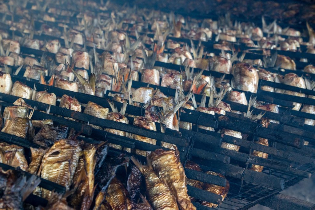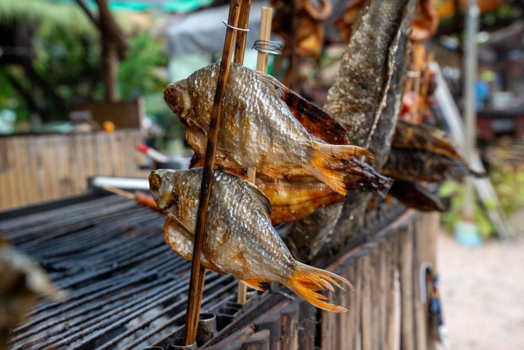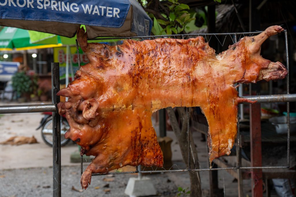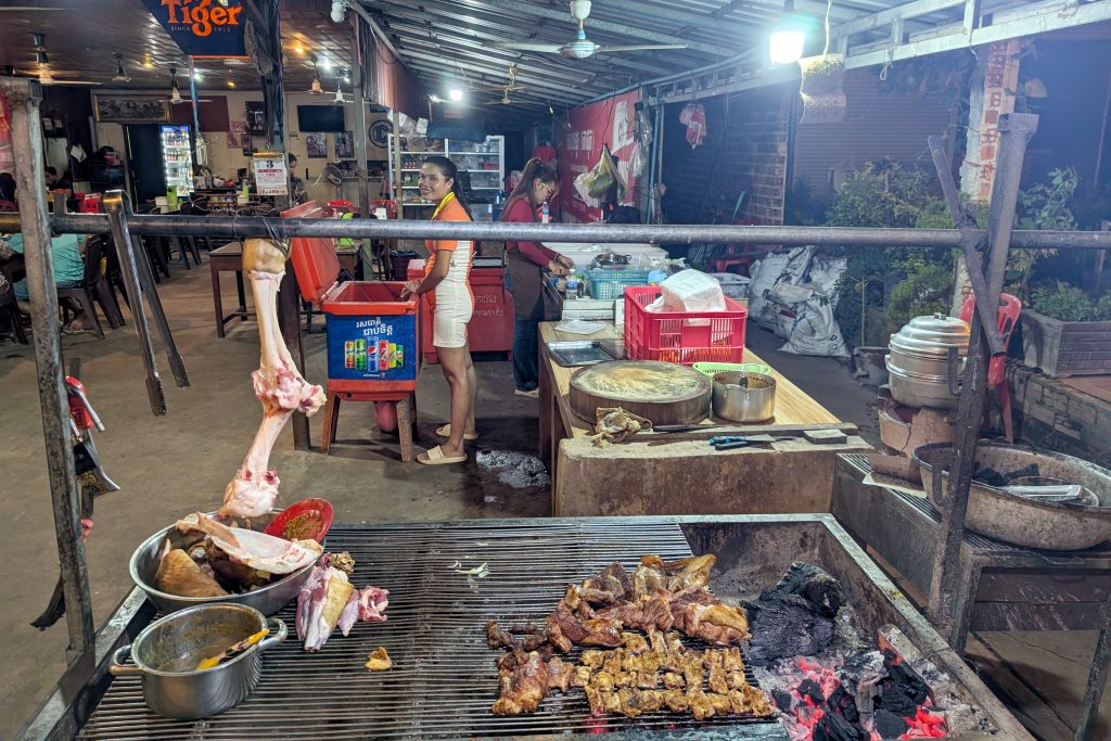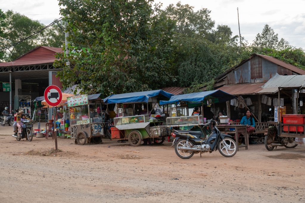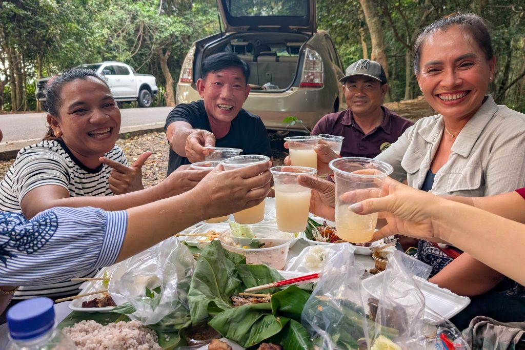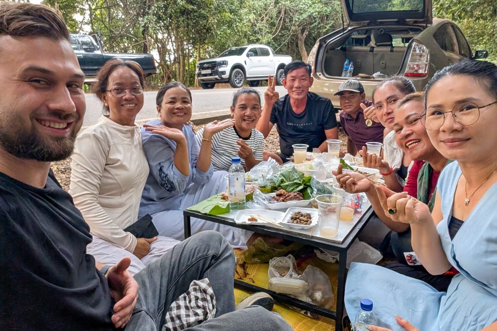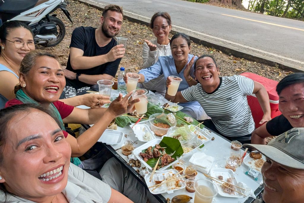 Auf dem Rückweg fuhr ich durch viele kleine Dörfer. Am Straßenrand lagen Schweine, Hühner, Frösche und Fische auf großen Grills. Warum, das erfuhr ich gleich: Ich lernte die kambodschanische Picknick-Kultur kennen. Als ich mit dem Roller durch den Wald fuhr, sah ich eine kleine Gruppe von Menschen. Sie saßen am Straßenrand vor einem gedeckten Tisch. Ich lächelte. Sie lächelten und winkten. Ich hielt an und wurde mit lautem Gelächter begrüßt. Ich setzte mich an den Tisch. Bisher hatten wir nicht gesprochen, nur Blicke ausgetauscht. Nun sprach mich eine Frau auf Englisch an. Sie freue sich über meinen Besuch und ich müsse von ihrem Picknick probieren. Obwohl sie die Einzige war, die Englisch sprach, waren nun alle um meine Versorgung bemüht. Vor mir stapelten sich plötzlich gegrillte Schweinestücke, Fische, Reis, Erdnüsse, Palmwein und Saft. Ich genoss die Mahlzeit und sprach mit der Frau, die für die Gruppe übersetzte. Es war eine tolle, ausgelassene Runde und ich fühlte mich herzlich willkommen. Nach einer Stunde machte ich mich auf den Weg. Wieder war ich ganz einfach mit freundlichen Menschen in Kontakt gekommen. Das freute mich.