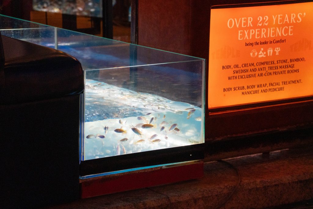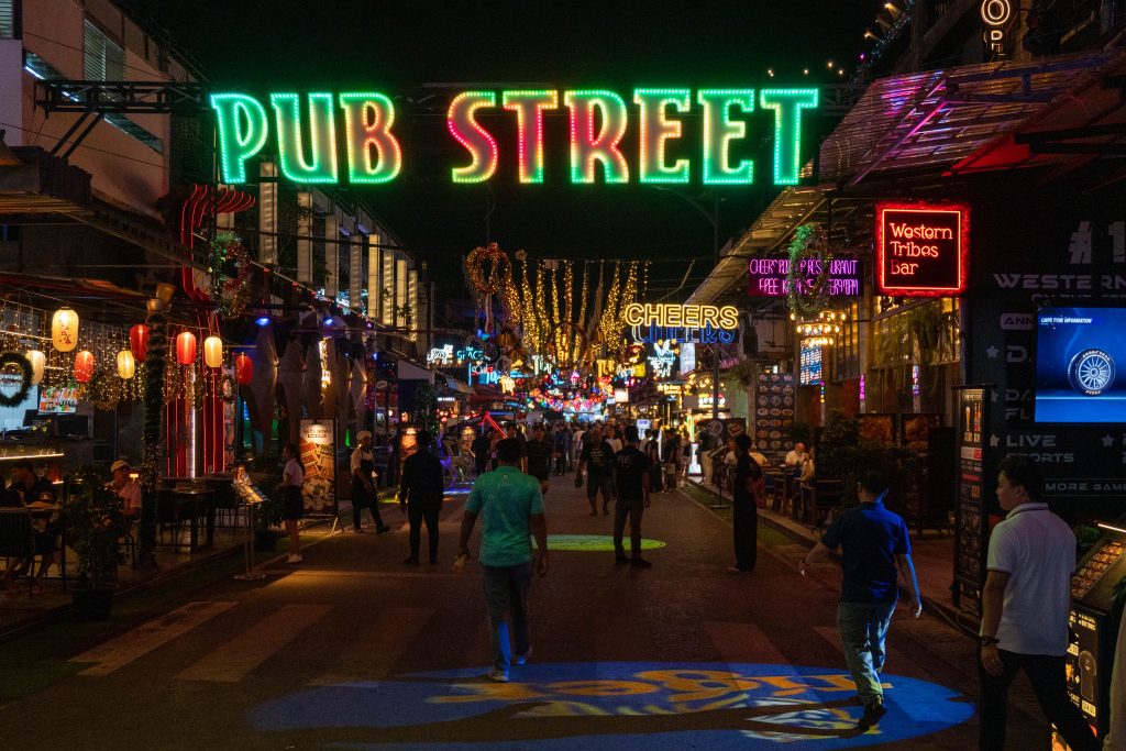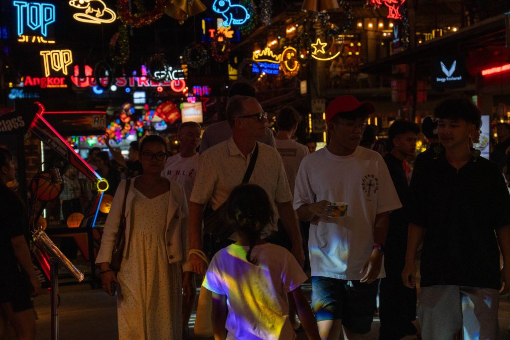 Am Abend konnte ich erste Eindrücke von Siem Reap sammeln. Dort, wo ich wohnte, gab es kaum Touristen. Ich bekam mein Abendessen in einer kleinen Cafeteria serviert, wo die Damen Rindfleisch von einem Knochen sägten. Dann fuhr ich in das Zentrum der Stadt. Dort zeichnete sich ein anderes Bild. Eine bunte, laute Flaniermeile namens Pub Street erschreckte mich schon von weitem. Die Musik war viel zu laut, um noch klare Gedanken zu fassen. Bunte Lichter, Souvenirstände und Dutzende Kellnerinnen und Kellner, die mit ihren Menüs winkten. Zwischen Fußmassage-Fischtanks und Boxautomaten saß ganz verloren eine kleine Musikergruppe. Den meisten Instrumentalisten fehlten die Beine. Sie spielten traditionelle kambodschanische Musik, die vom westlichen Clubtechno verschluckt wurde.
