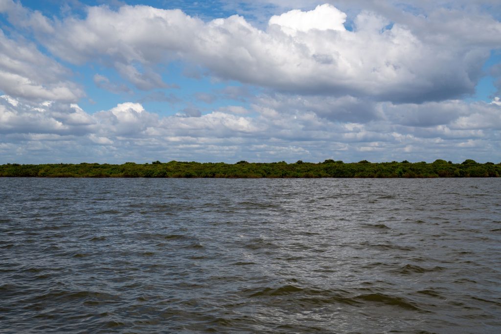 Der Tonle Sap ist der größte See Südostasiens. Zur Regenzeit ist er rund 10.400 Quadratkilometer weit. Während der nun herrschenden Trockenzeit verringert sich die Fläche auf ein Drittel der Größe. Übrigens kann man hier ein einzigartiges Naturschauspiel beobachten. Der Abfluss des Tonle Sap in den Mekong wechselt jedes Jahr im Juni für einige Wochen seine Flussrichtung – immer dann, wenn der Mekong nach Taifunregenfällen und Schmelzwasserabfluss aus dem Himalaya anschwillt. Einen solchen Richtungswechsel findet man sonst nirgendwo bei einem Fluss dieser Größe. Zu jeder Jahreszeit ist der Tonle Sap für seinen Fischreichtum bekannt. Und so fuhr ich nun mit dem Motorroller in ein Fischerdorf, weit abgelegen von den touristisch überlaufenen Dörfern nahe Siem Reap. Mein Ziel war der Ort Kompong Khleang. Nach fast zwei Stunden Fahrt erreichte ich einen Damm, der in den See führte. Links und rechts lagen Fischerhäuser auf Stelzen, die so hoch waren, dass die Häuser auch bei Flut über Wasser blieben. Vor den Häusern trockneten Fische in der Sonne oder über dem Feuer, und einige Frauen kochten Wasserschnecken. Die Straße duckte sich nach wenigen hundert Metern in die Fluten des wasserreichen Sees. Je später die Trockenzeit, desto größere Teile des Dorfes kann man erreichen. Doch noch standen bestimmt neunzig Prozent der Häuser im Wasser. Ich musste auf ein Boot umsteigen. Für 25 Dollar schipperte mich ein Kapitän durch das Dorf, auf einem Schiff, das sicher 30 Menschen fassen könnte. Ich sah Häuser und Boote an mir vorbeiziehen. Dann fuhren wir durch einen Mangrovenwald und vorbei an Fischernetzen. Nach rund einer Stunde erreichten wir den offenen See. Man kann das Ufer nicht sehen, und so fühlt es sich an, als blicke man auf einen Ozean. Auf dem Rückweg legte der Kapitän am Marktplatz an und ich konnte das Zentrum des Ortes zu Fuß erkunden. Hier, auf der augenscheinlich einzigen Insel, drängten sich einige Tempel und die lokale Schule nebeneinander. Ansonsten besteht der Ort aus hunderten Häusern, die nur mit dem Boot erreicht werden können. Besonders ortskundige Menschen fahren manchmal auch mit dem Scooter durch die überflutete Landschaft, aber da muss man sehr genau wissen, an welchen Stellen die Straße nicht zu tief unter Wasser liegt.