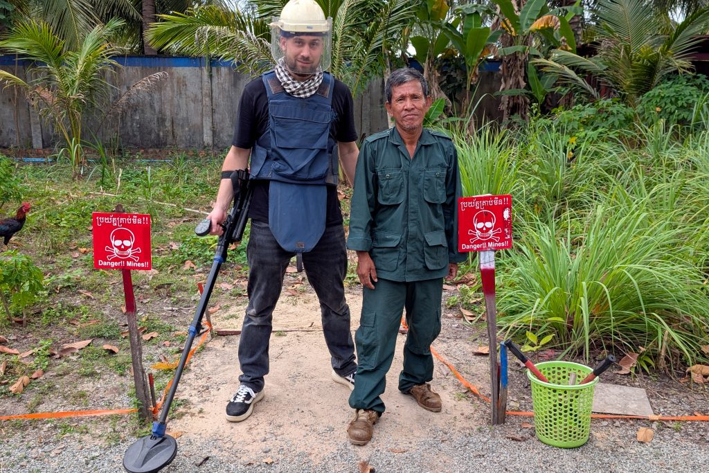 Aki Ras Bruder brachte mir bei, wie man Minen sucht und entschärft. Mit Aki Ra schlenderte ich anschließend über seine Farm. Auch das war spannend, denn hier bekam ich einen authentischen Einblick ins kambodschanische Landleben. Auf dem Feuer brodelte ein Kessel mit toten Ratten und Fröschen, die er in Fallen gefangen hatte. So stellen die Bauern hier Schweinefutter her.