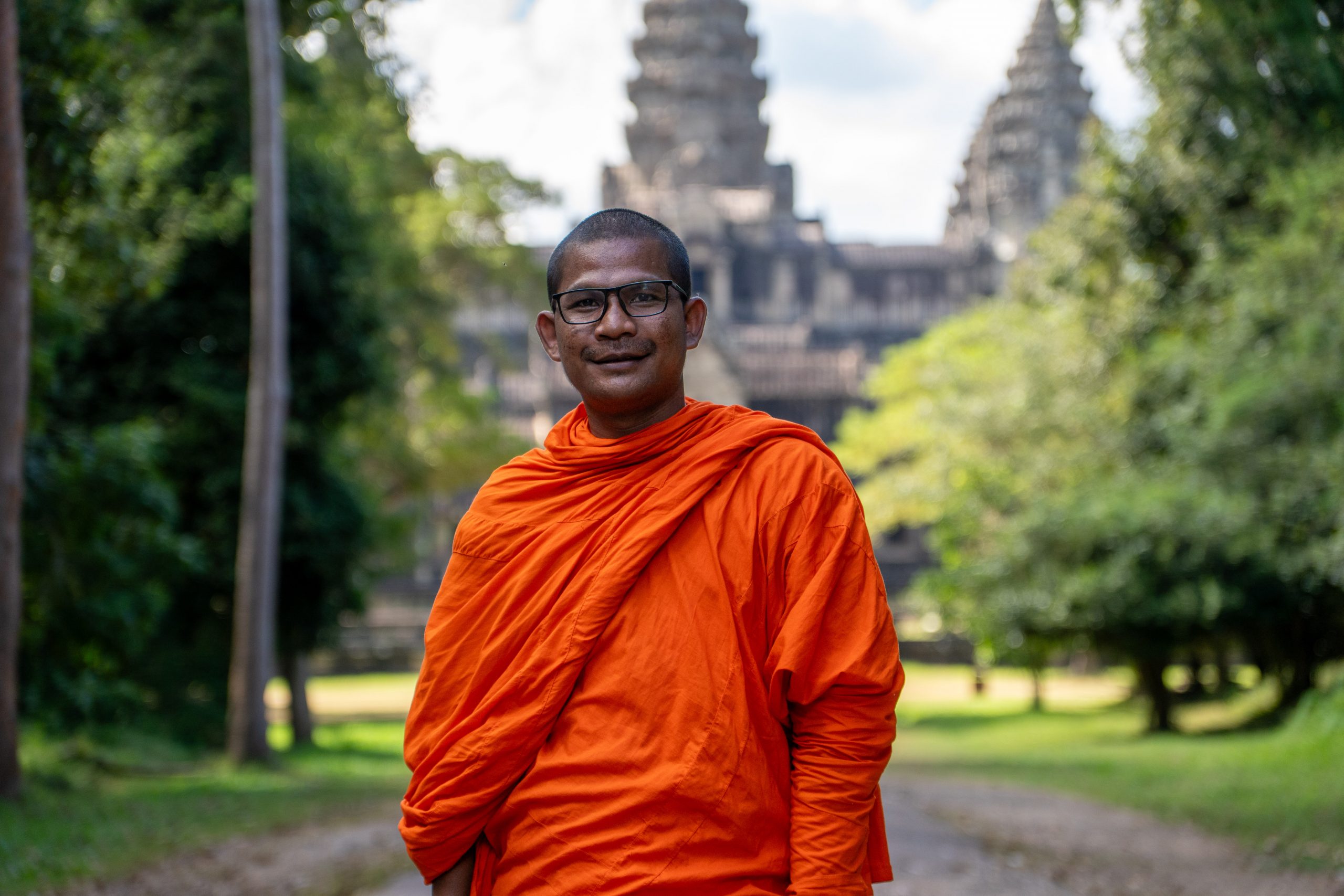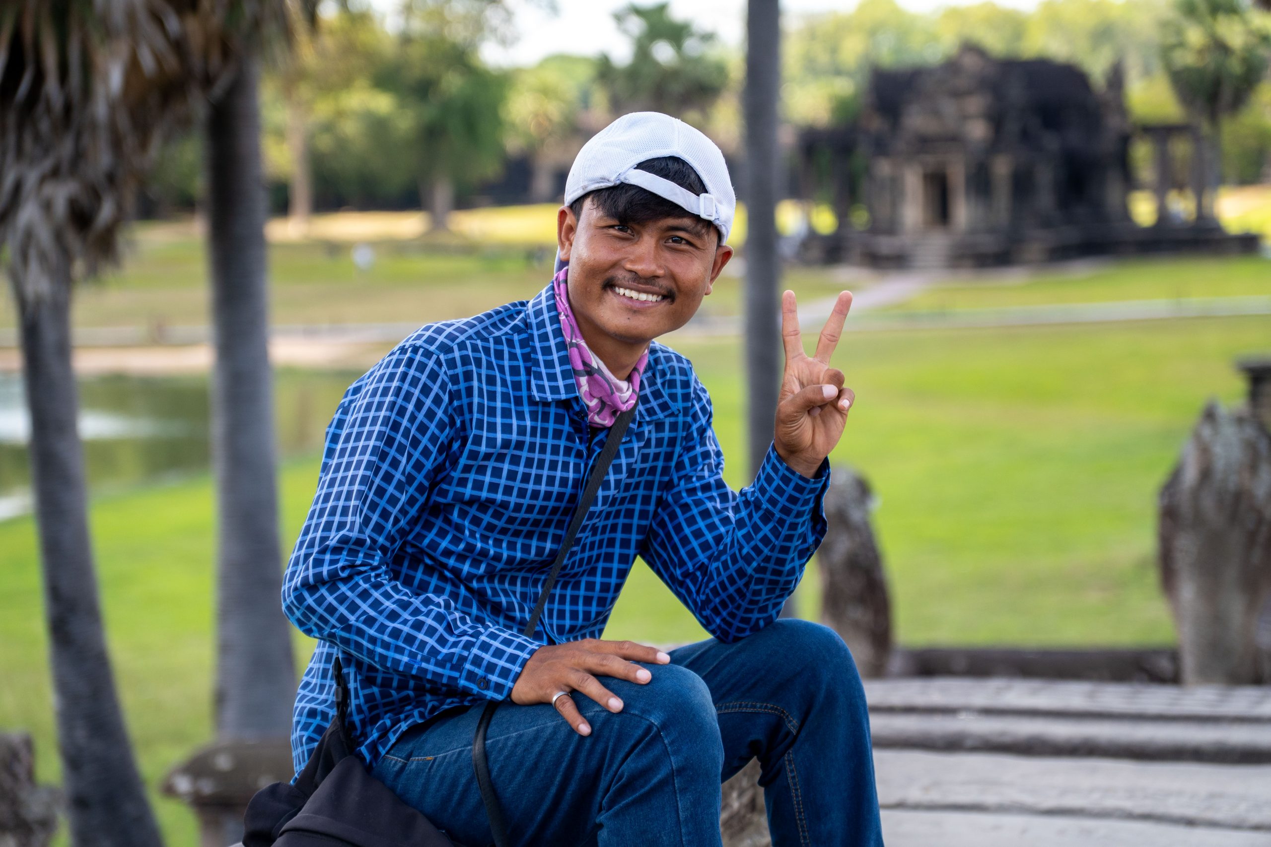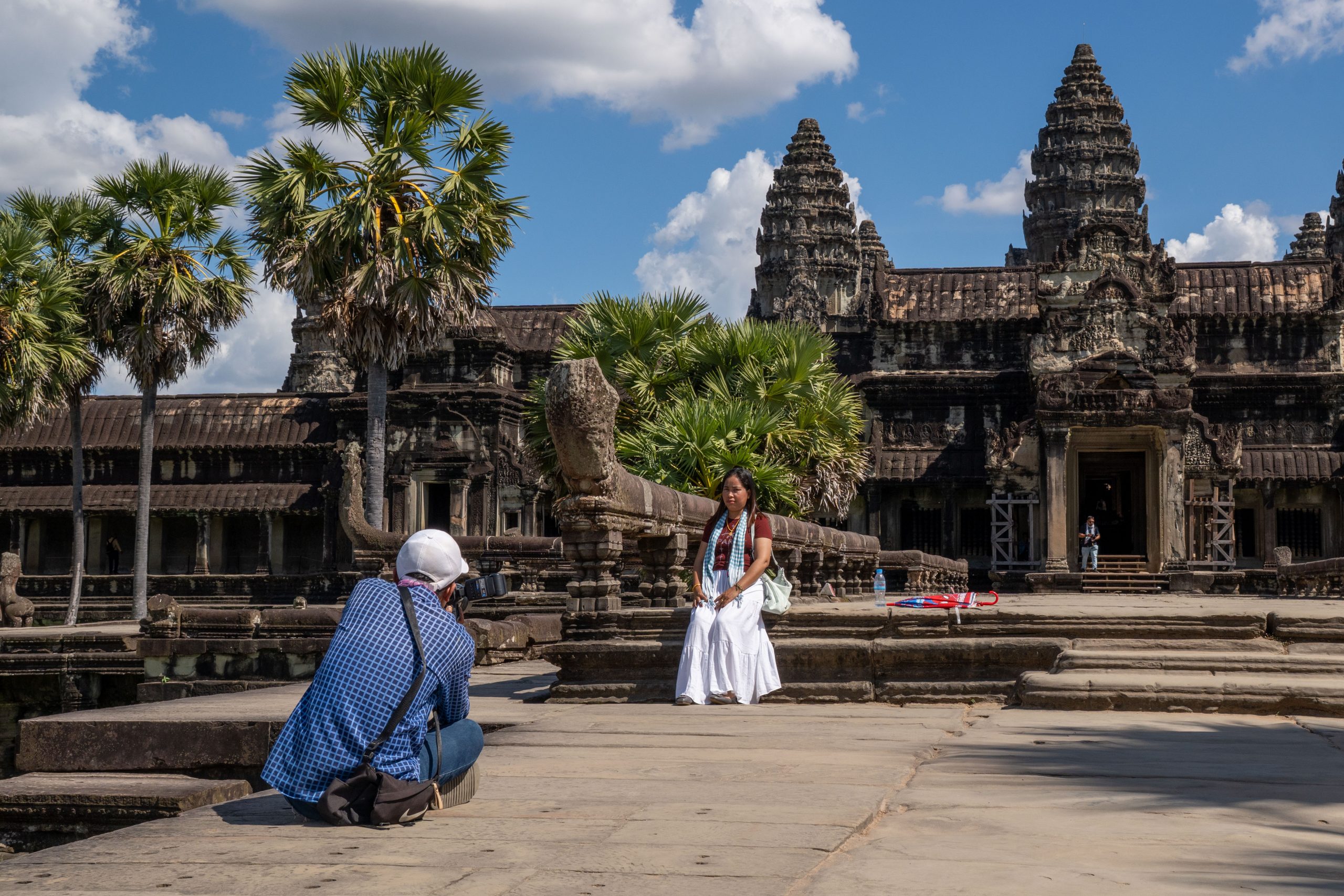 Als ich mich im Schatten ausruhte, sprach mich ein junger Mann an. Er sei Fotograf, ob ich denn Bilder von mir möchte, wolle er wissen. Ich verneinte, weil ich meine Fotos in der Regel selbst mache. Doch ich blieb und beobachtete ihn bei seiner Arbeit. Eifrig dirigierte er die Touristen, die seine Dienste in Anspruch nahmen. Wo sie stehen sollten, wie sie schauen und wie sie gestikulieren könnten… Er wusste es ganz genau. Nach ein paar Minuten hatte er die Fotos beisammen, die er dann für einen Dollar auf das Handy der Kunden schickte. Nun bat er mich, ihn zu fotografieren, denn er hatte meine Kamera entdeckt. Ich schoss einige Bilder, die er sich ganz begeistert anschaute und sofort überspielte. Nun hätten wir einen guten Tausch, dachte ich, und gab ihm meine Kamera. Und tatsächlich schoss er fantastische Bilder von mir. Diese Begegnung zeigte mir auch, wie freundlich und unkompliziert hier viele Menschen sind. Ein Eindruck, der sich weiter verfestigte. Es fiel mir an diesem Tag und auch danach sehr leicht, Verbindungen zu den Kambodschanern aufzubauen.