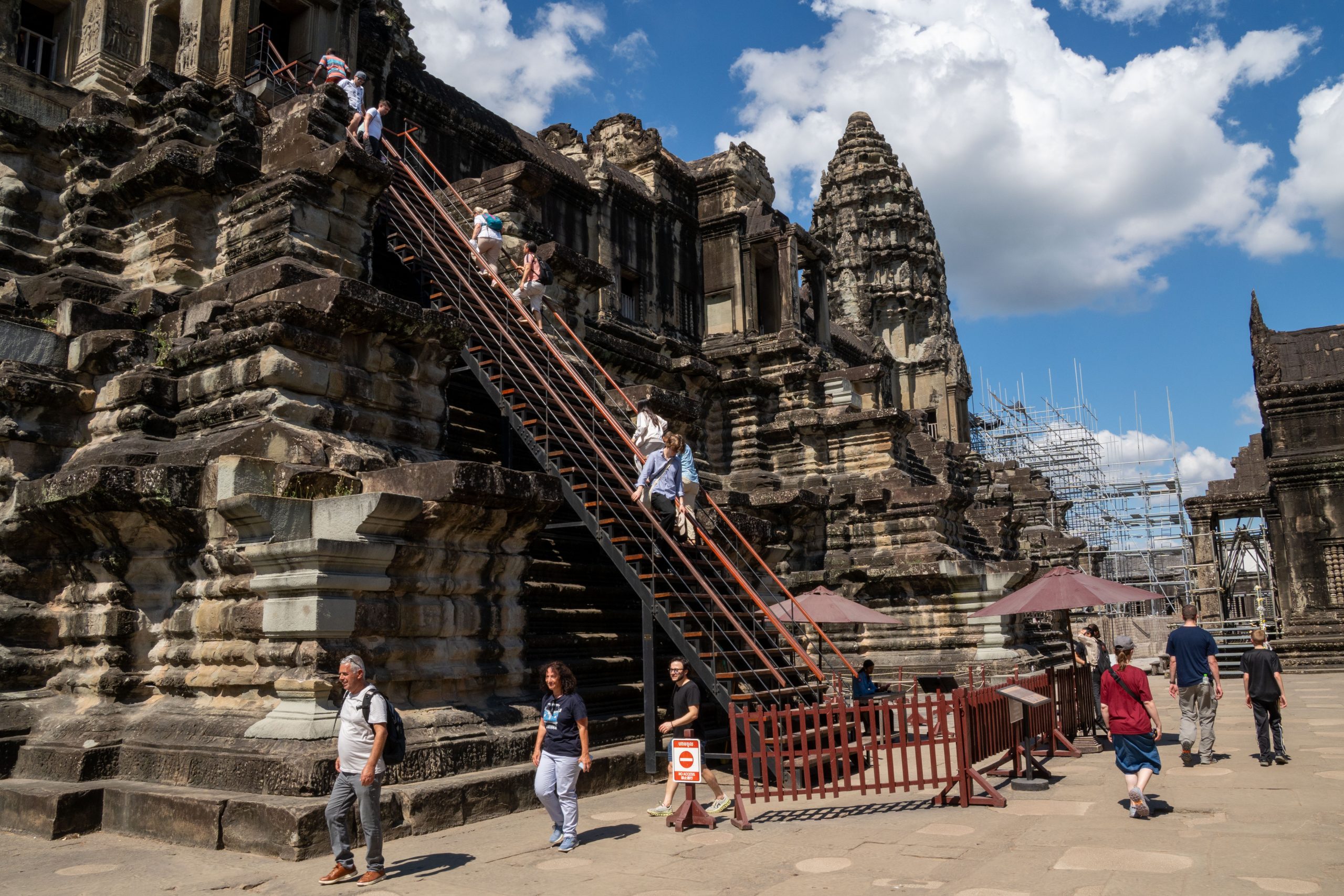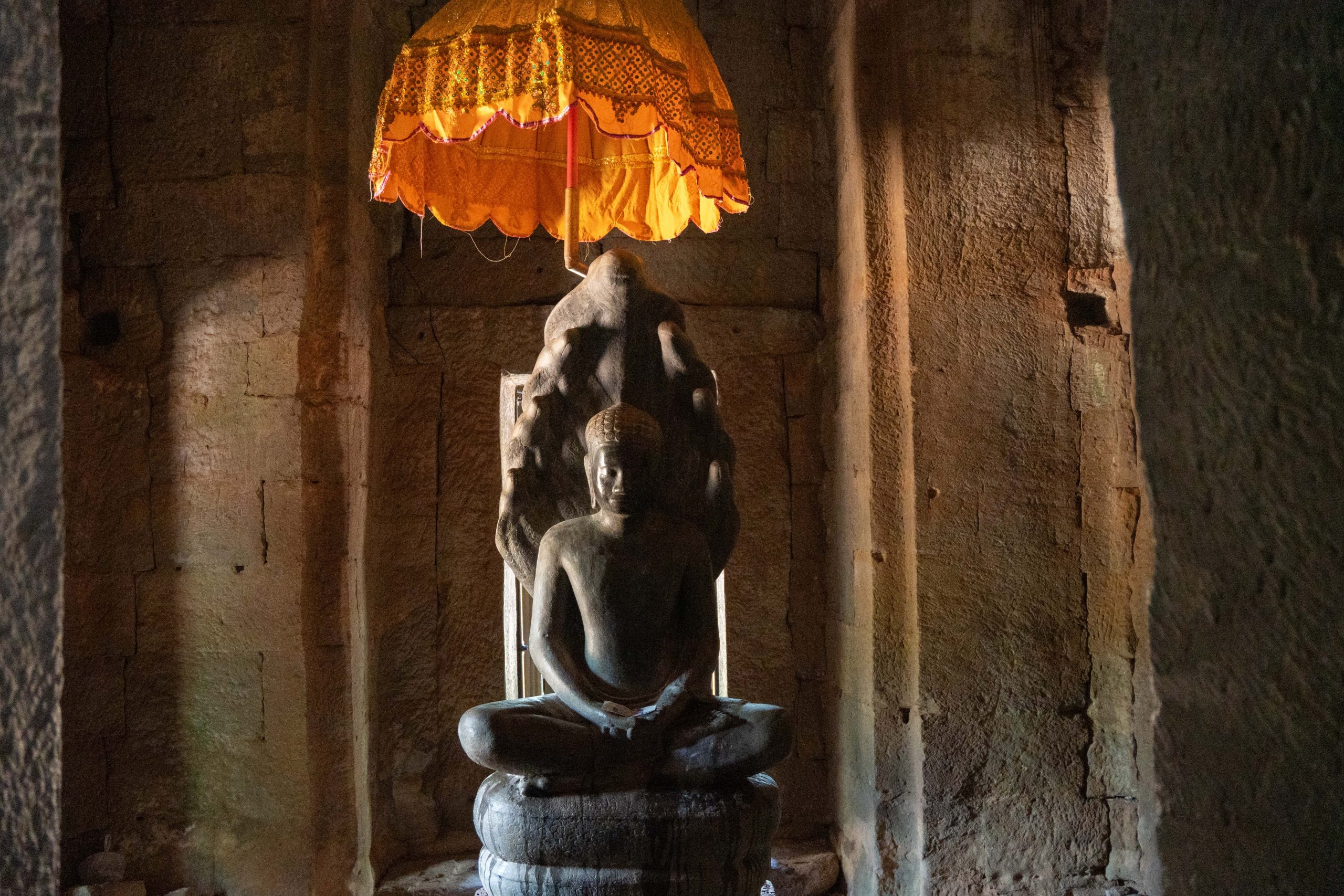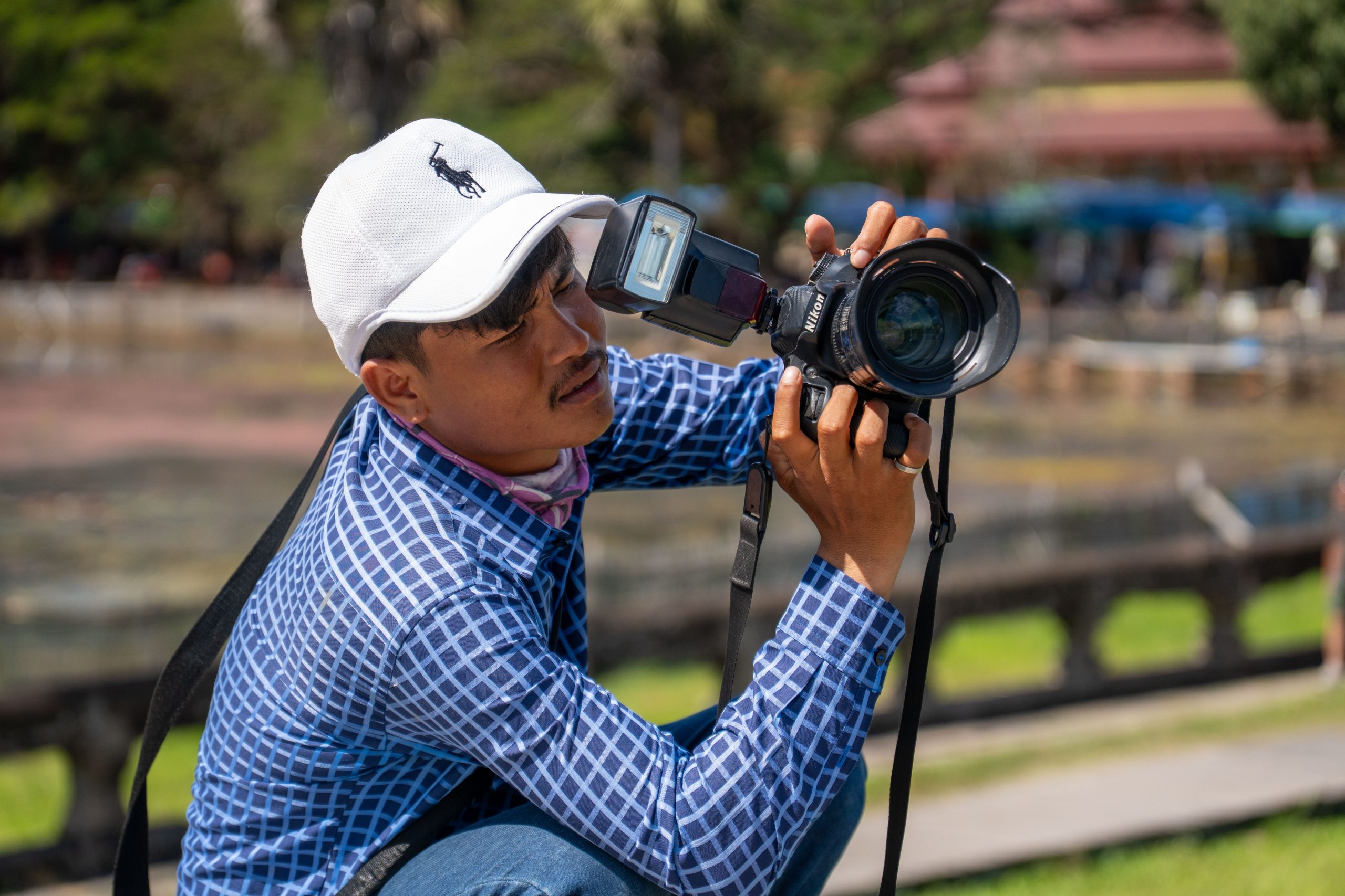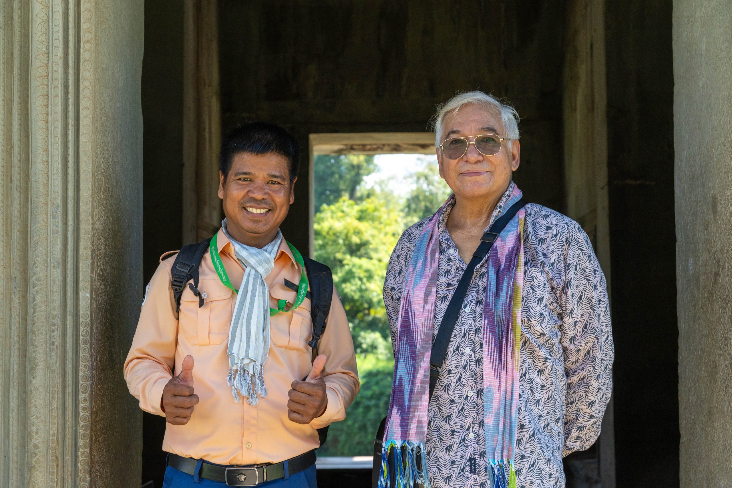 Als ich mich im Schatten ausruhte, sprach mich ein junger Mann an. Er sei Fotograf, ob ich denn Bilder von mir möchte, wolle er wissen. Ich verneinte, weil ich meine Fotos in der Regel selbst mache. Doch ich blieb und beobachtete ihn bei seiner Arbeit. Eifrig dirigierte er die Touristen, die seine Dienste in Anspruch nahmen. Wo sie stehen sollten, wie sie schauen und wie sie gestikulieren könnten… Er wusste es ganz genau. Nach ein paar Minuten hatte er die Fotos beisammen, die er dann für einen Dollar auf das Handy der Kunden schickte. Nun bat er mich, ihn zu fotografieren, denn er hatte meine Kamera entdeckt. Ich schoss einige Bilder, die er sich ganz begeistert anschaute und sofort überspielte. Nun hätten wir einen guten Tausch, dachte ich, und gab ihm meine Kamera. Und tatsächlich schoss er fantastische Bilder von mir. Diese Begegnung zeigte mir auch, wie freundlich und unkompliziert hier viele Menschen sind. Ein Eindruck, der sich weiter verfestigte. Es fiel mir an diesem Tag und auch danach sehr leicht, Verbindungen zu den Kambodschanern aufzubauen.