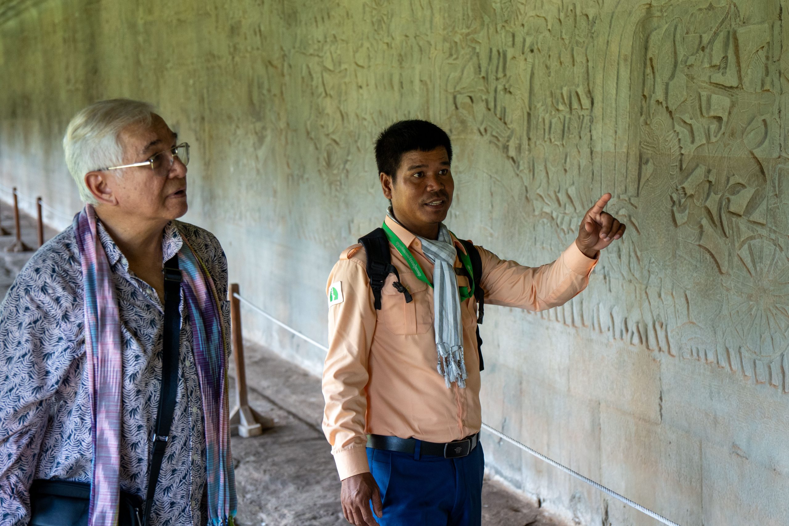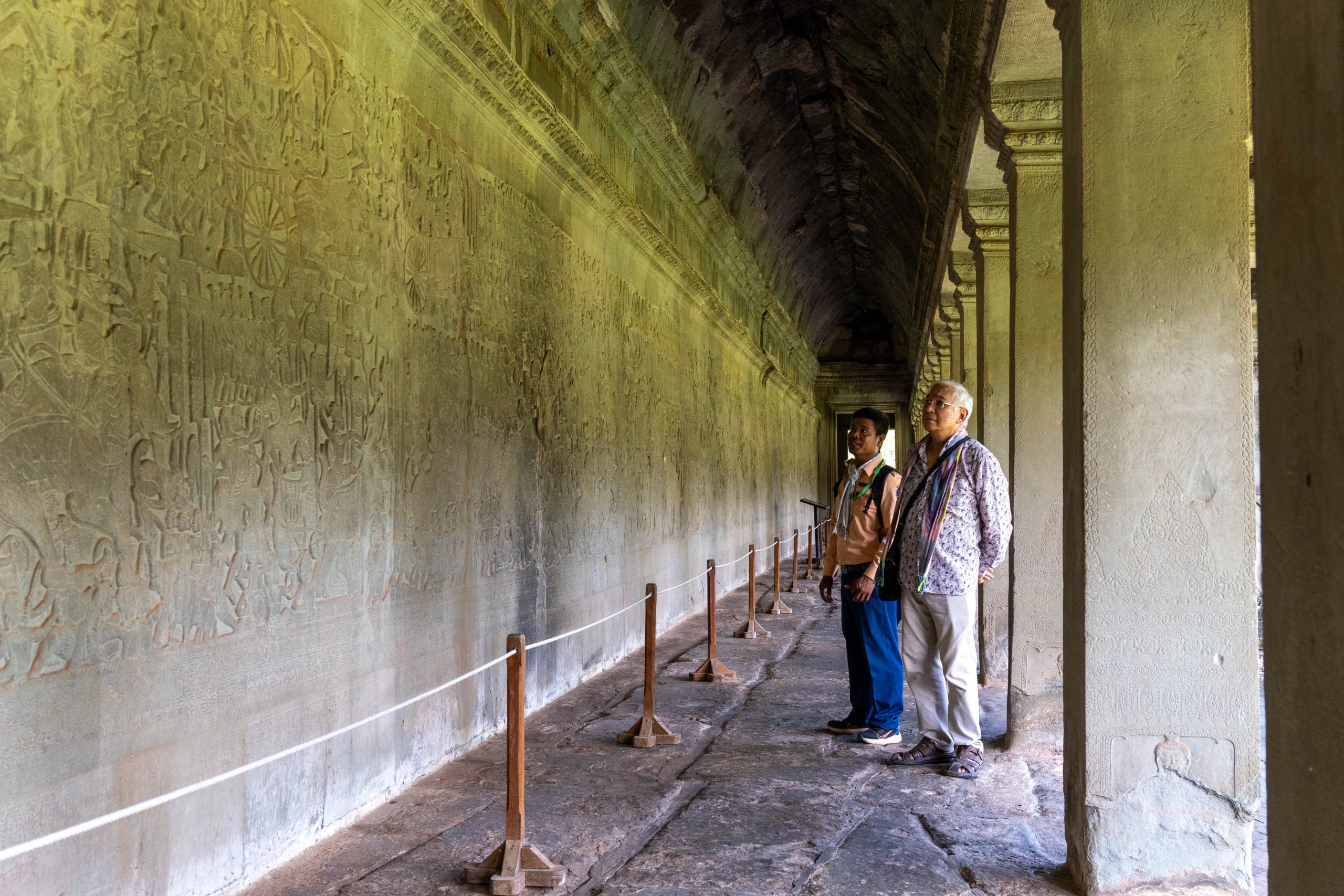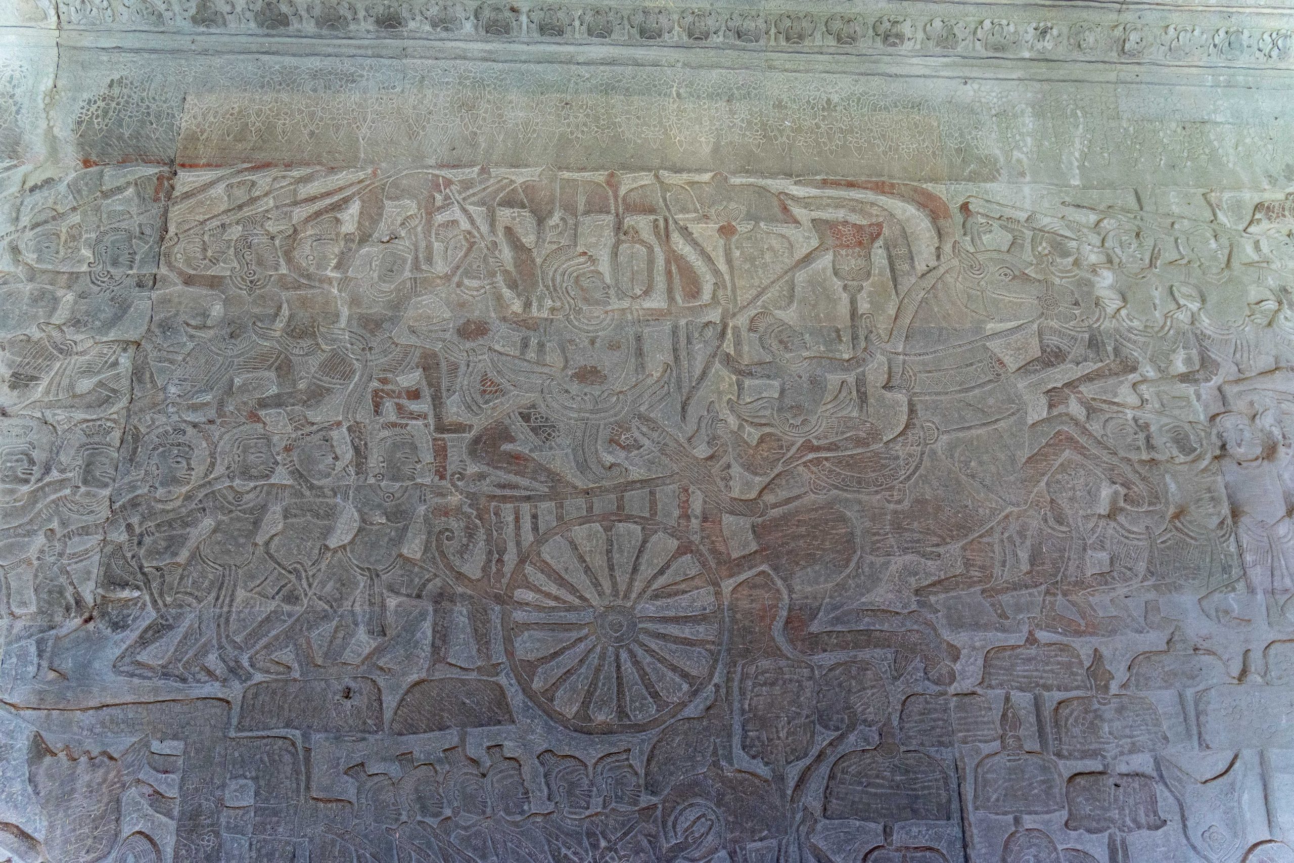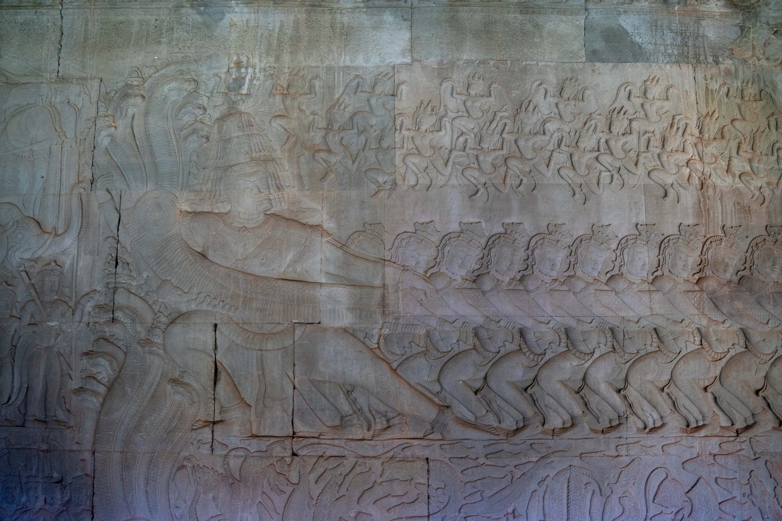 Frühmorgens machte ich mich auf den Weg nach Angkor Wat. Es ist ein rund 900 Jahre alter Tempel, der seit seiner Errichtung fast durchgehend religiös genutzt wurde und deshalb außergewöhnlich gut erhalten ist. Die Tempelanlage liegt auf einer rechteckigen, künstlichen Insel von circa zwei Quadratkilometern Größe. Übrigens ist Angkor Wat nicht der einzige monumentale Tempel in der Gegend. Rund um Siem Reap liegen über 70 große Tempel und mehr als 1.000 religiöse Bauwerke. Manche sind gut erhalten. Einige sind von dichtem Dschungel überwachsen und liegen in Trümmern. Archäologen sichern auch heute noch verschollene Bauwerke im Angkor Archaeological Park. Man könnte Tage und Wochen damit verbringen, diese historischen Schätze zu erkunden. Für mich begann es nun mit Angkor Wat. Über einen Damm gelangte ich zur Insel. Der Pfad führte durch ein steinernes Tor, und auf den Stufen unterhielt ich mich kurz mit einem älteren Mann, der mit einem einheimischen Guide unterwegs war. Er stellte sich als Professor und Archäologe vor. Ursprünglich aus Malaysia, wohnt er nun in Australien. Sein Interesse an den historischen Tempeln zieht ihn immer wieder hierher. Der Guide, selbst natürlich mit der Anlage bestens vertraut, bezeichnete ihn voller Respekt als einen Lehrer, der mehr über Angkor Wat wüsste als die allermeisten Menschen hier. Die beiden zogen mal wieder durch das weitläufige Gelände, um zu fachsimpeln und zu philosophieren. Sie luden mich ein, sie zu begleiten. Sehr langsam liefen wir durch die Gänge des Bauwerkes und betrachteten die Wandbilder, die in den weichen Stein gemeißelt waren. Der Professor erklärte mir jedes Detail. Auf einer Wand waren Dämonen und Götter versammelt, die an zwei Seiten einer riesigen Schlange zogen. Diese war um einen Berg gewickelt. Durch das Hin- und Herreißen quirlte dieser den kosmischen Milchozean auf. Nur so könne man Amrita, das Getränk der Unsterblichkeit, erlangen. Götter und Dämonen mussten gemeinsame Sache machen, so wichtig war ihre Aufgabe. Und Vishnu trug den gewaltigen Berg im Ozean auf seinem Rücken – er hatte sich in eine Schildkröte verwandelt. Als das begehrte Getränk schließlich gewonnen war, wollten es die Dämonen nur für sich behalten. Nun war es abermals Vishnu, der eingreifen musste. In Form einer schönen Frau verführte er die Dämonen, und die Götter konnten den Unsterblichkeitstrank an sich nehmen, während die liebeskranken Dämonen abgelenkt waren. Der Professor war begeistert und suchte eifrig all die kleinen Details der Geschichte auf dem riesigen Relief.