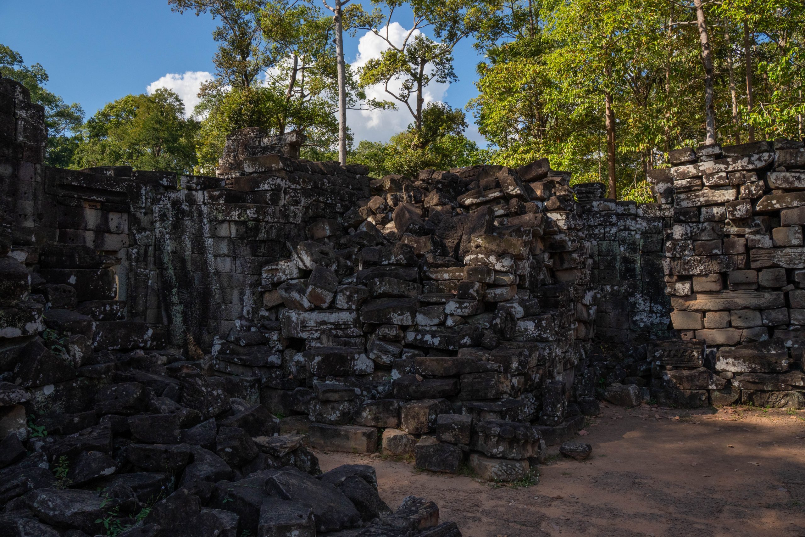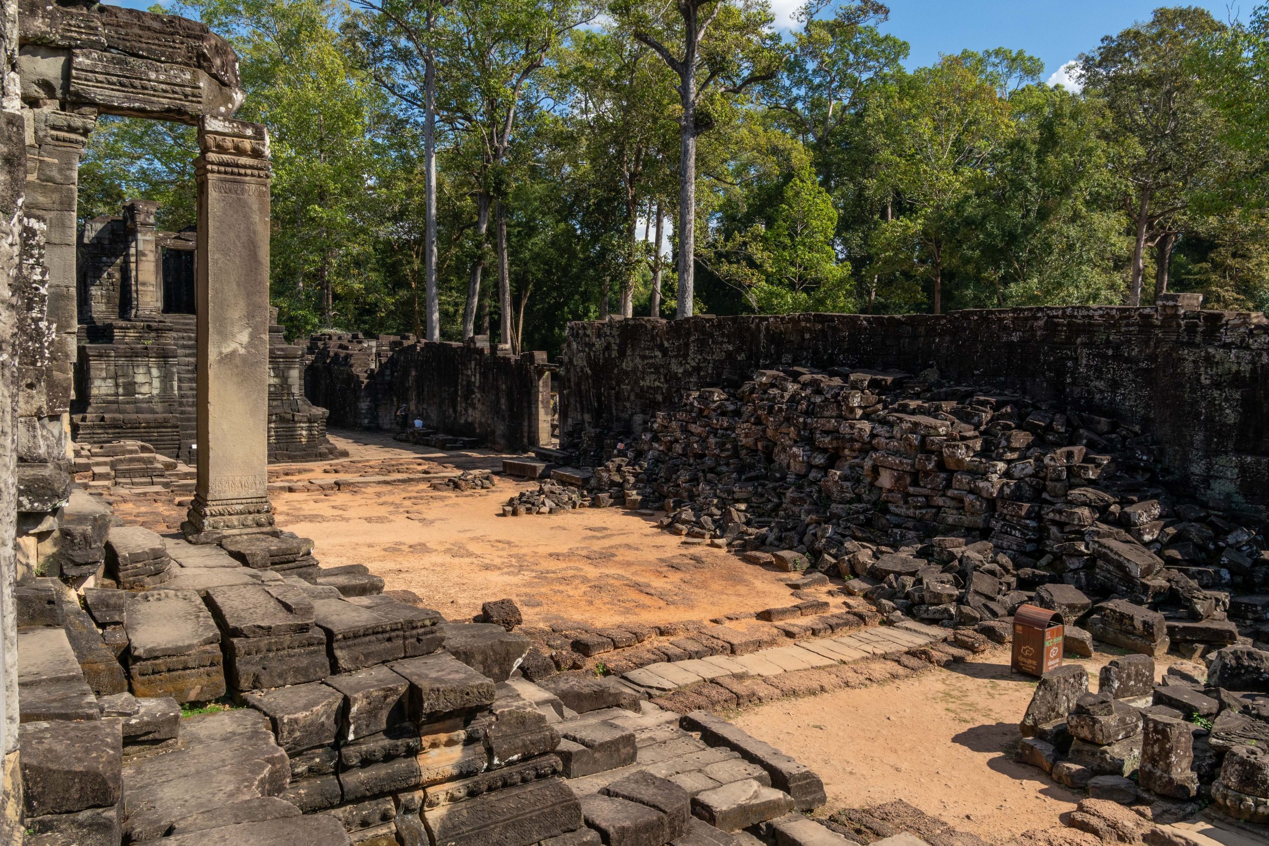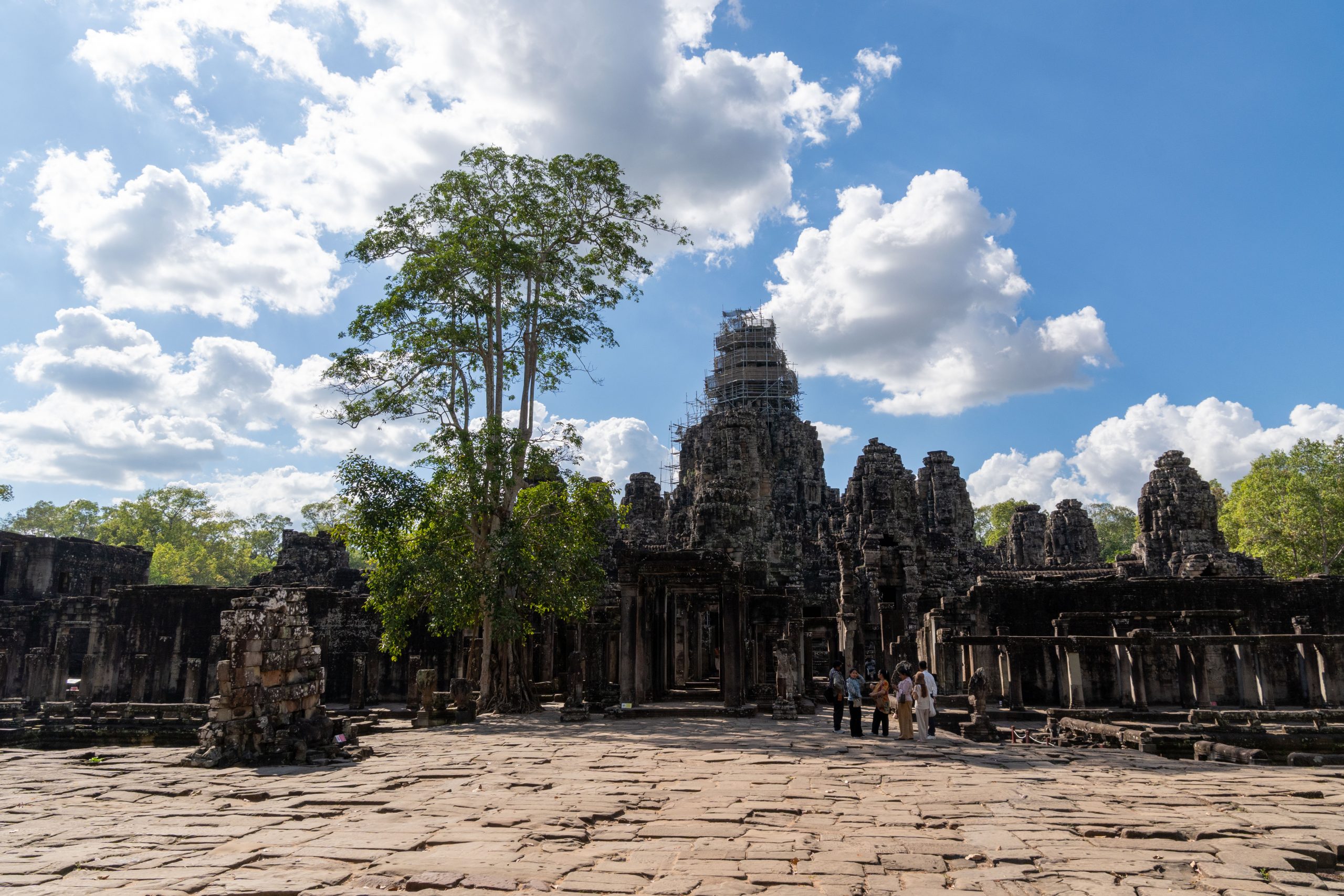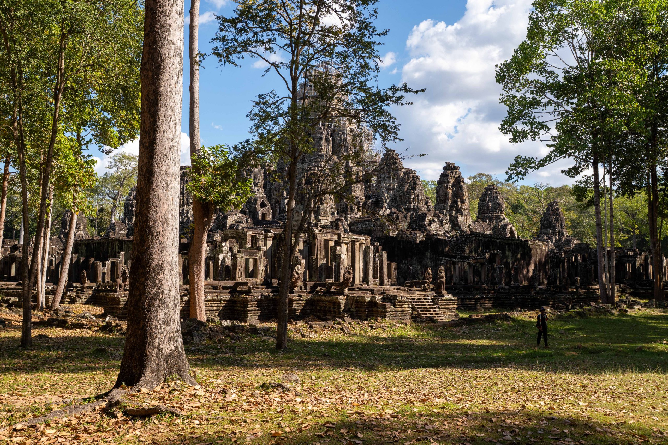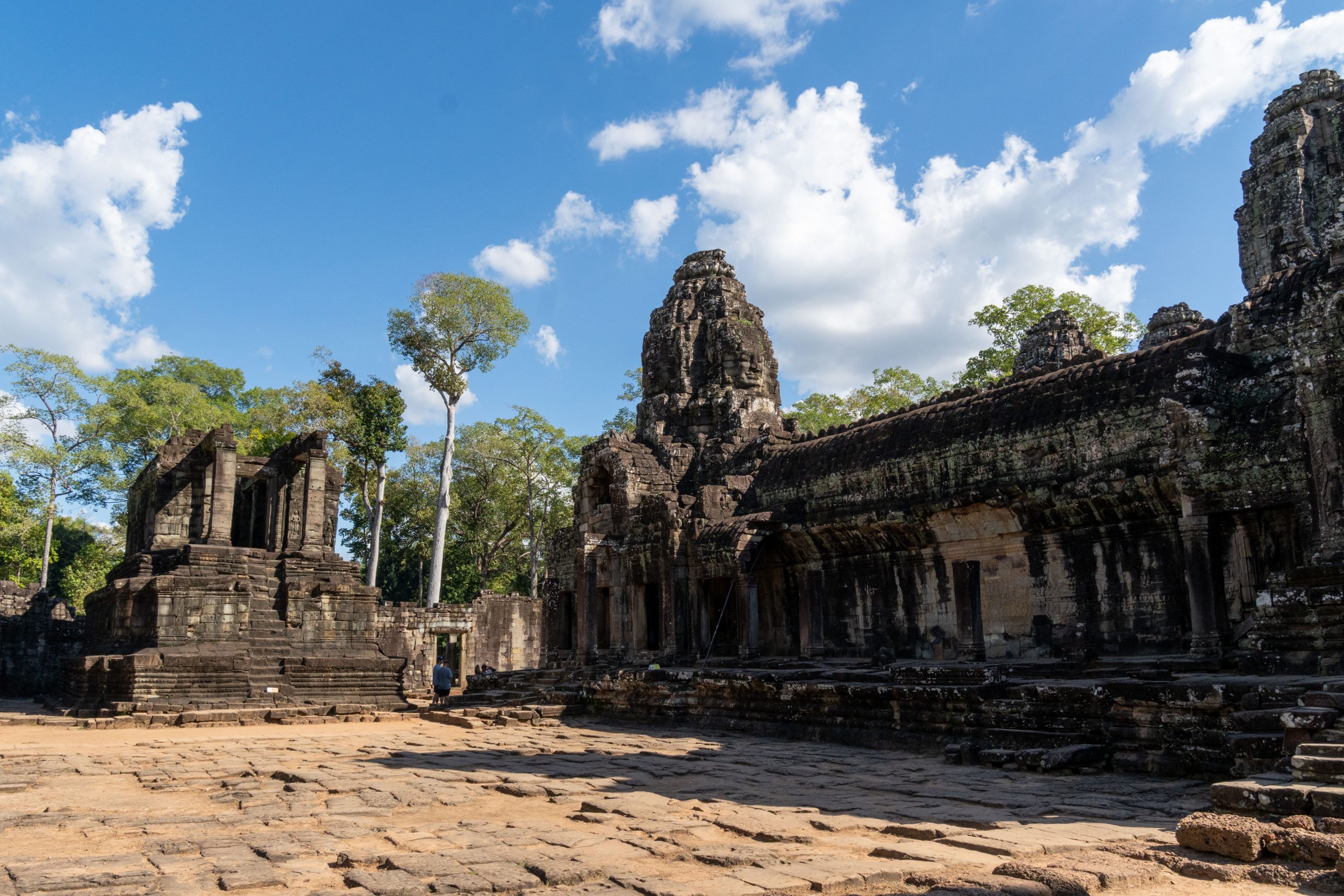 Den Rest des Tages nutzte ich, um weitere Tempel zu besuchen. Ganz in der Nähe befindet sich der Bayon Tempel, der wiederum von weiteren Bauwerken umgeben ist. Die Strukturen hier sind deutlich verfallener. Zwischen den Bäumen stapeln sich Trümmerhaufen eingefallener Mauern und Türme. Doch die einstige Pracht ist nach wie vor erkennbar und man kann Archäologen beobachten, die die Steinhaufen sortieren und wohl nach und nach wieder aufbauen werden.