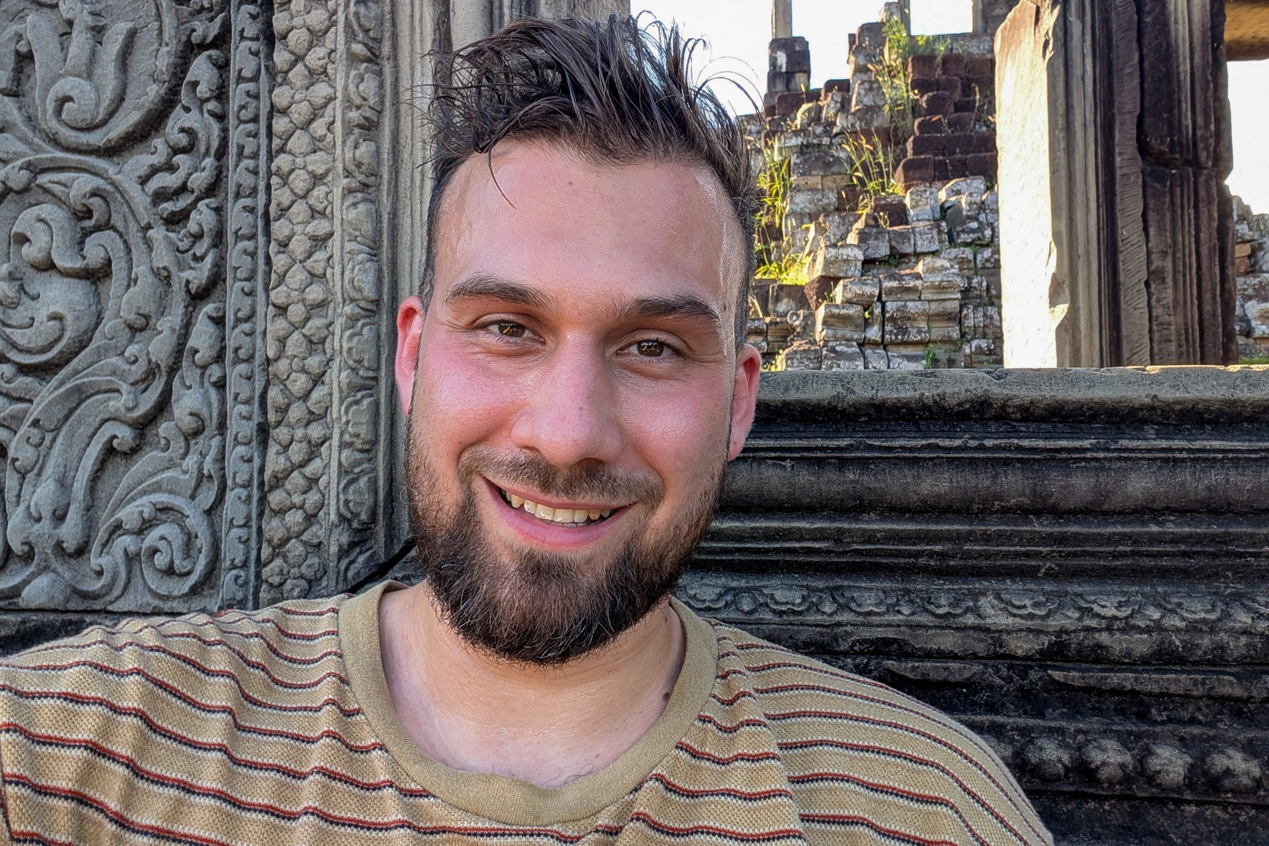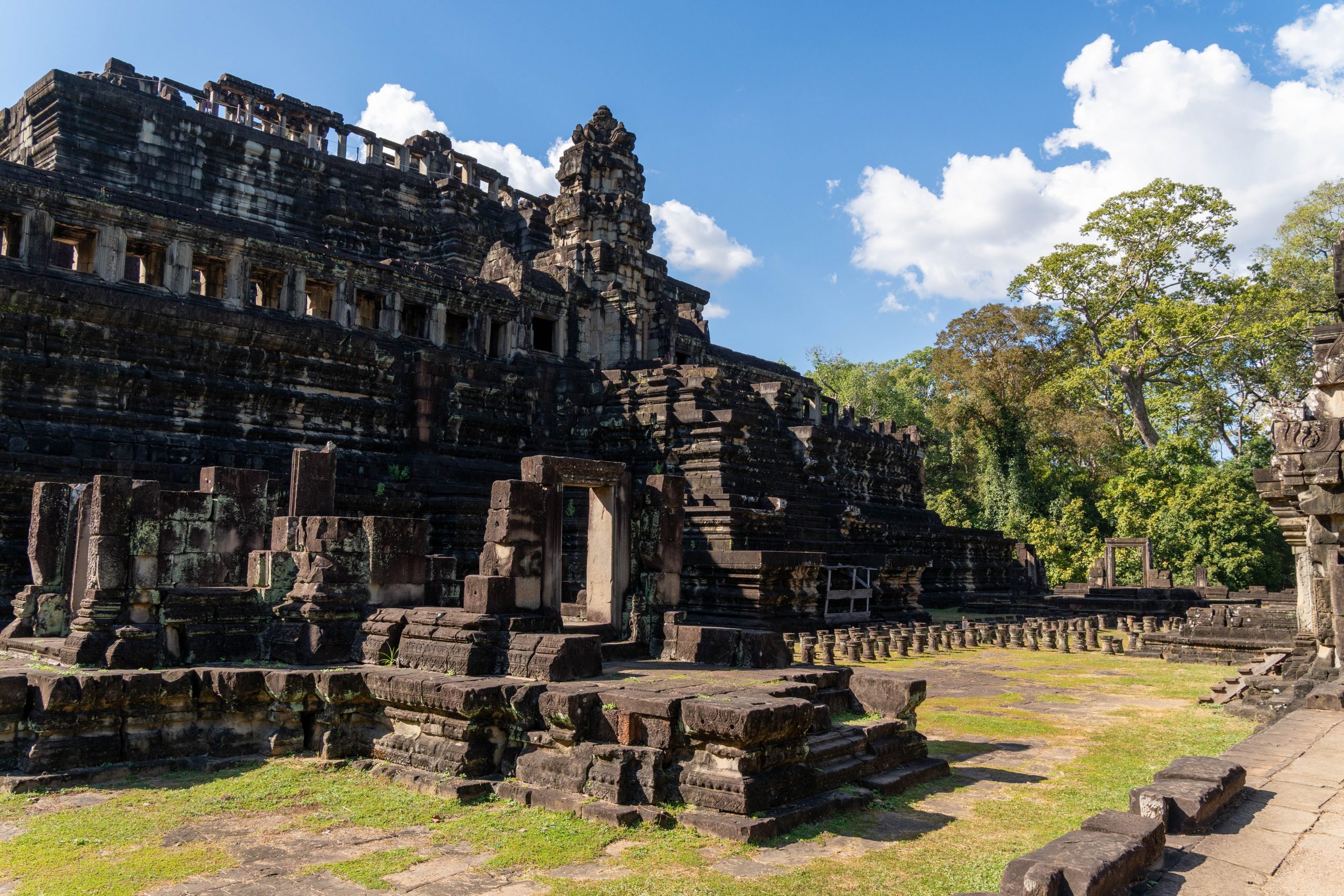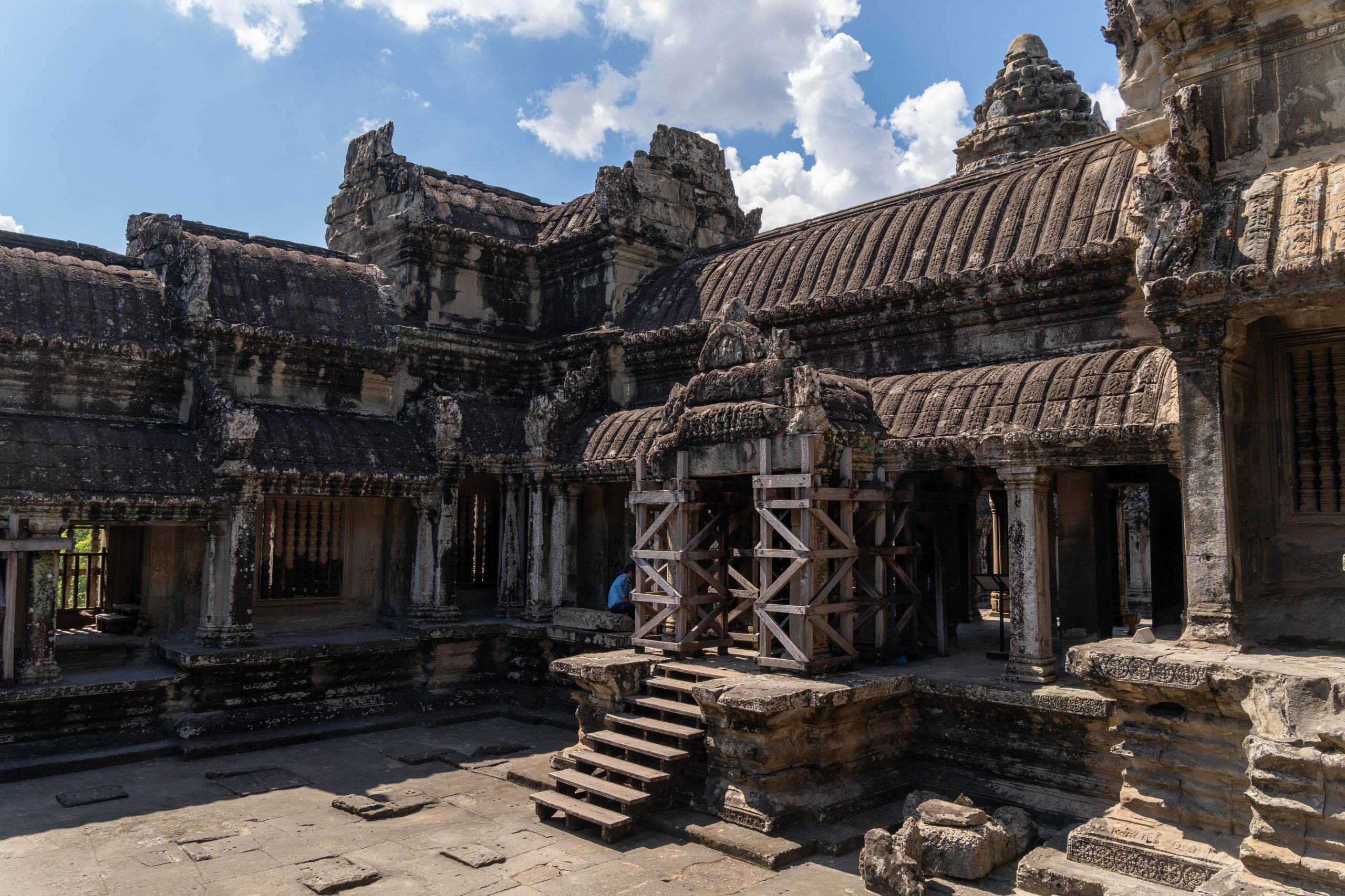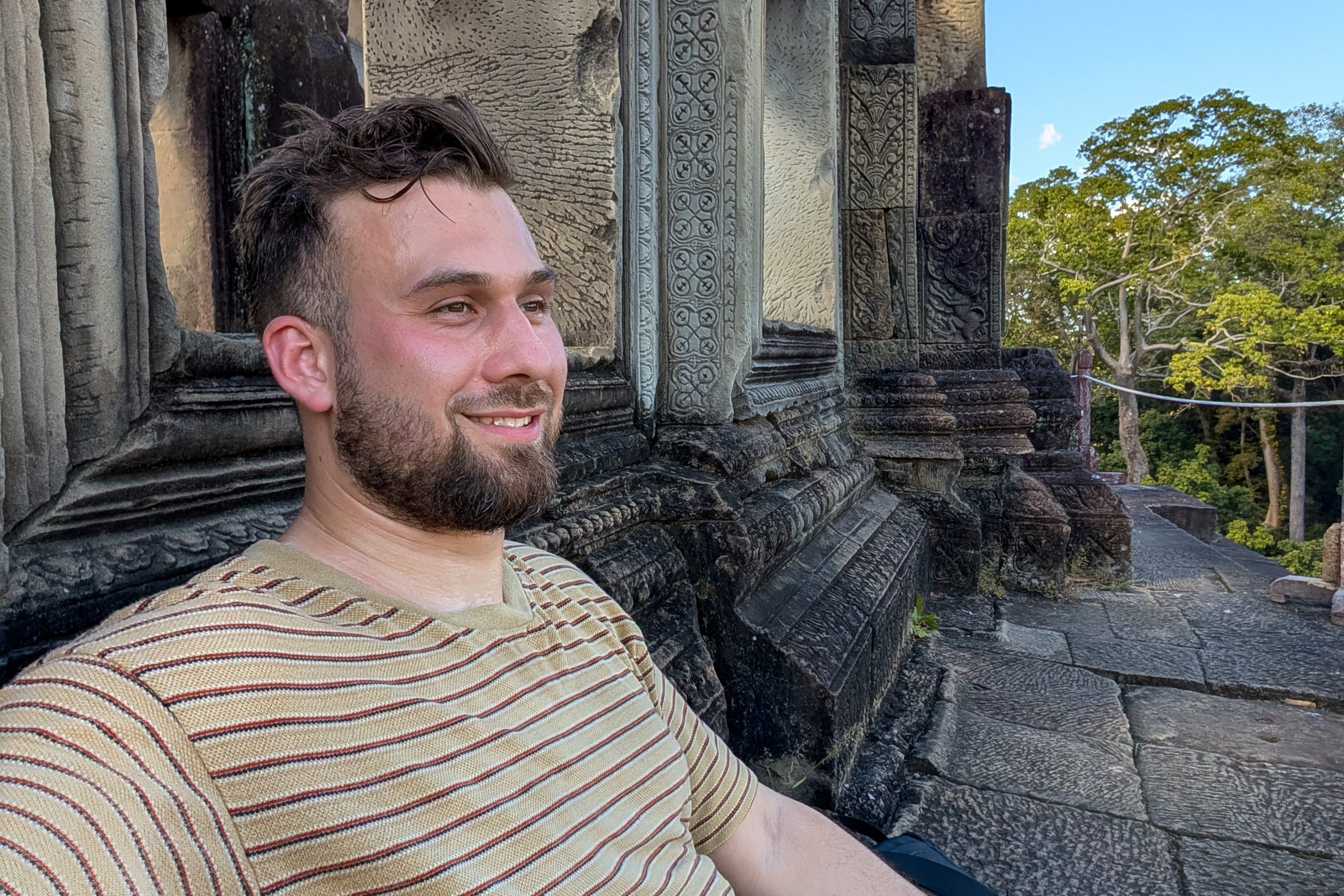 Den Rest des Tages nutzte ich, um weitere Tempel zu besuchen. Ganz in der Nähe befindet sich der Bayon Tempel, der wiederum von weiteren Bauwerken umgeben ist. Die Strukturen hier sind deutlich verfallener. Zwischen den Bäumen stapeln sich Trümmerhaufen eingefallener Mauern und Türme. Doch die einstige Pracht ist nach wie vor erkennbar und man kann Archäologen beobachten, die die Steinhaufen sortieren und wohl nach und nach wieder aufbauen werden.