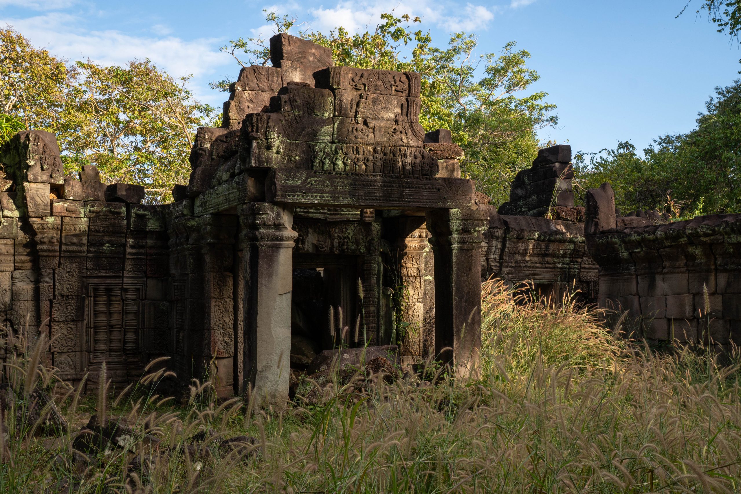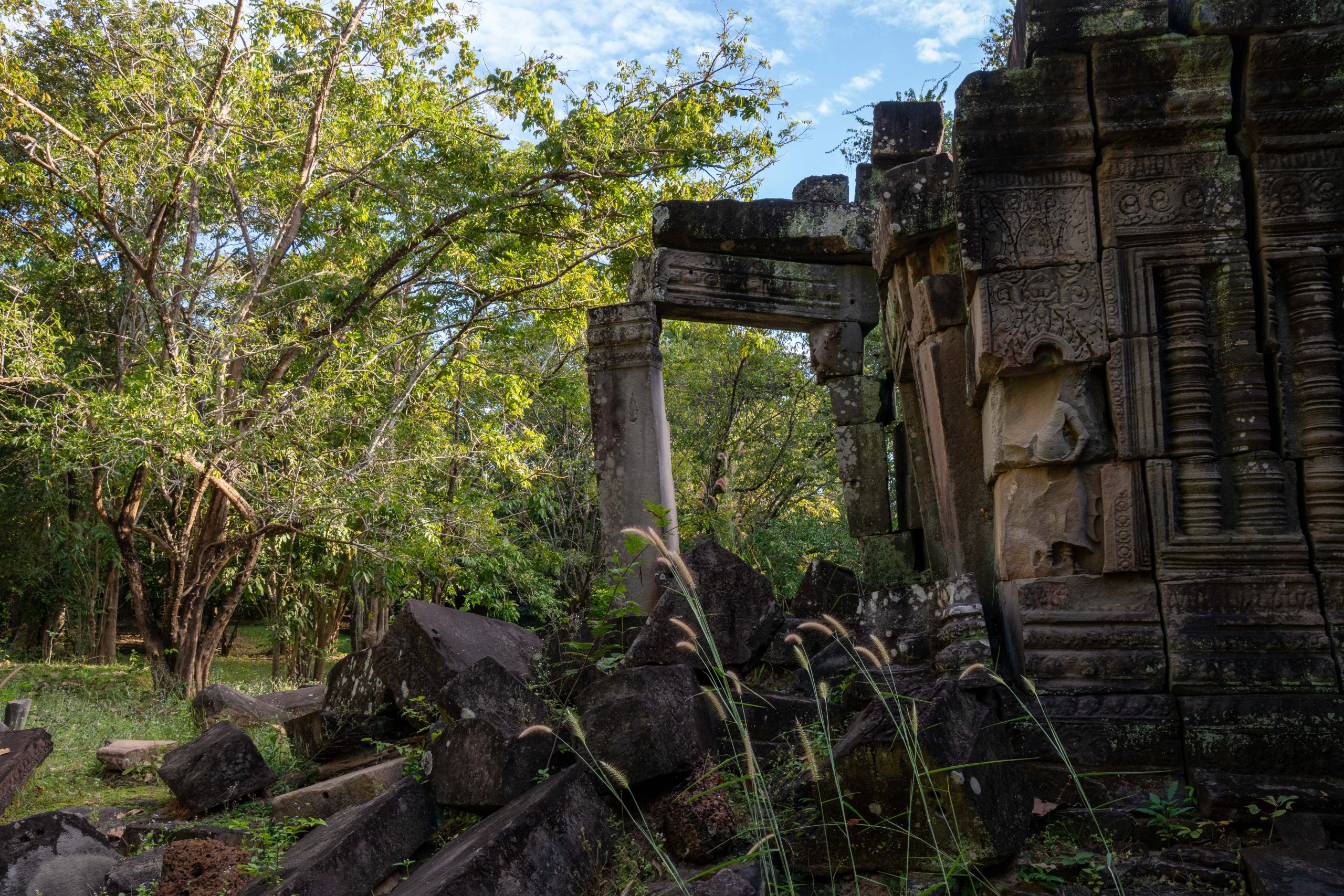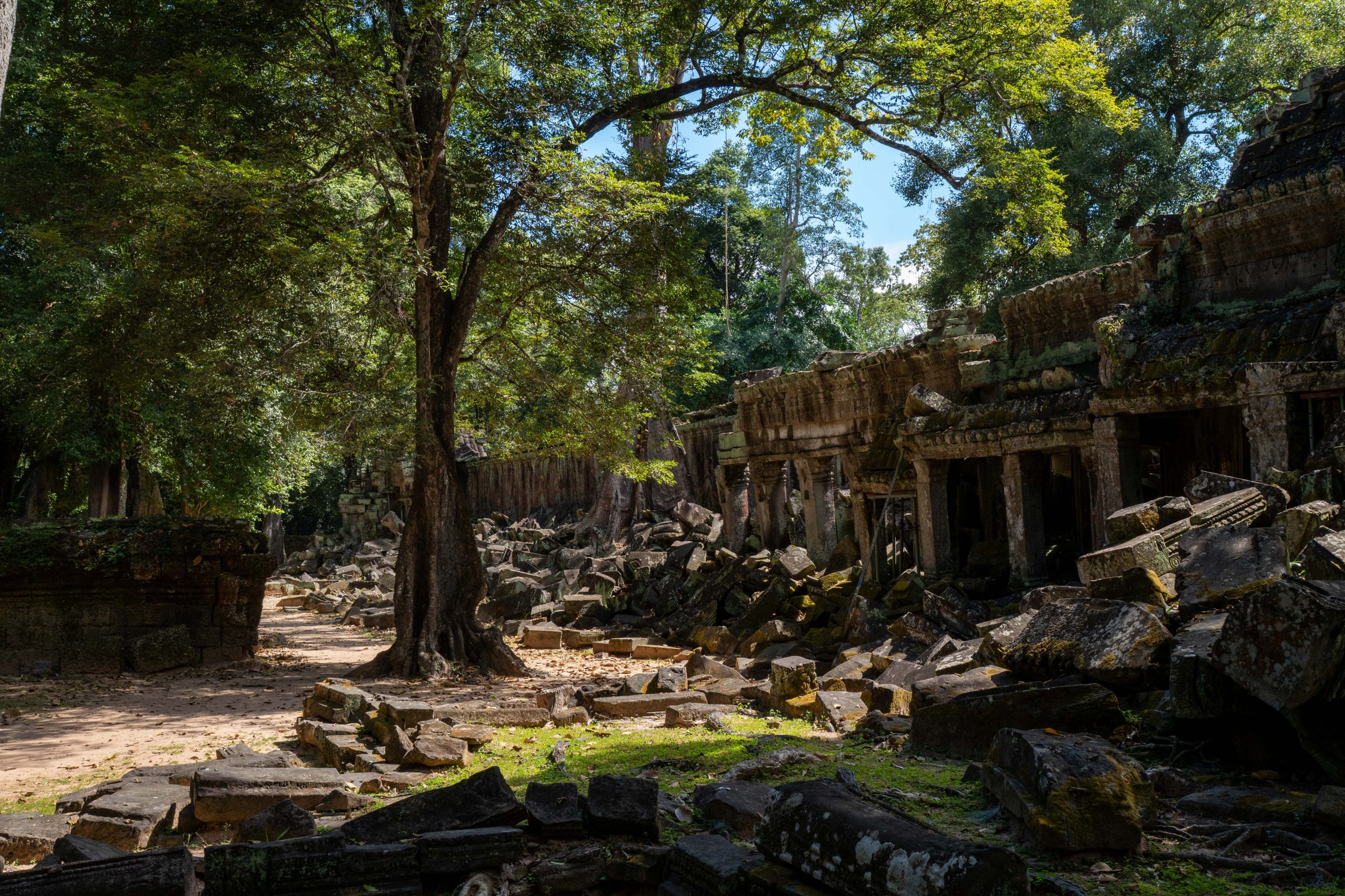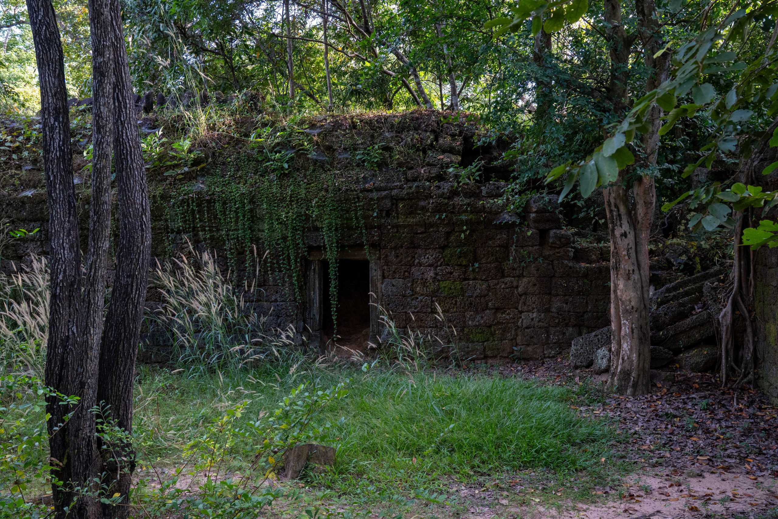 Zum Schluss besuchte ich noch den Banteay Thom Tempel. Der liegt tief im Wald und ist nur über einen zerfurchten Feldweg zu erreichen, der durch einige Dörfer und den Dschungel führt. Kein Mensch war dort, weder Besucher noch Tempelwächter. Die Anreise ist einfach zu beschwerlich. Für mich war es ein besonderes Erlebnis, denn ich konnte den Tempel ganz allein erkunden. Bäume und hohes Gras hatten das Bauwerk schon halb verschlungen.