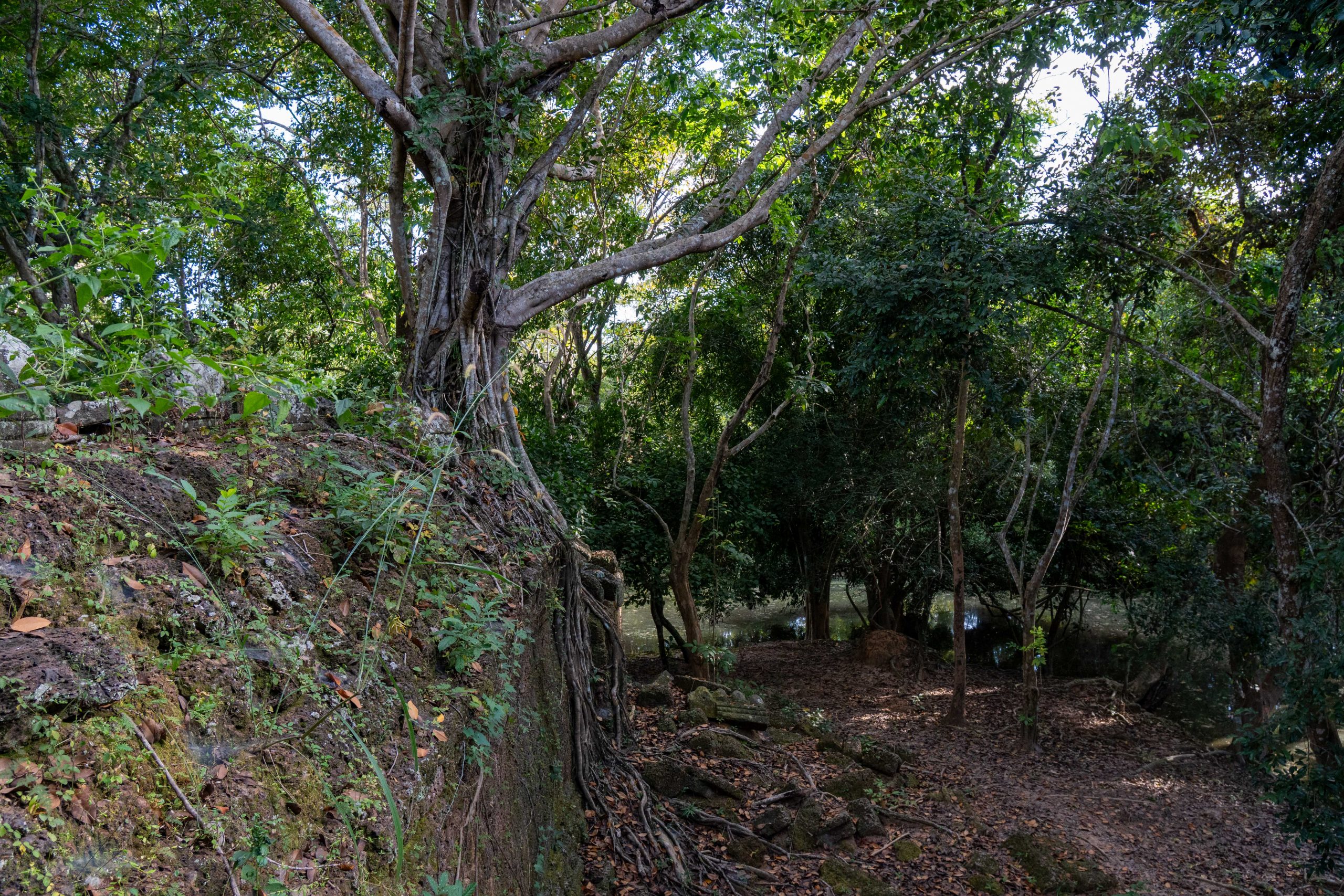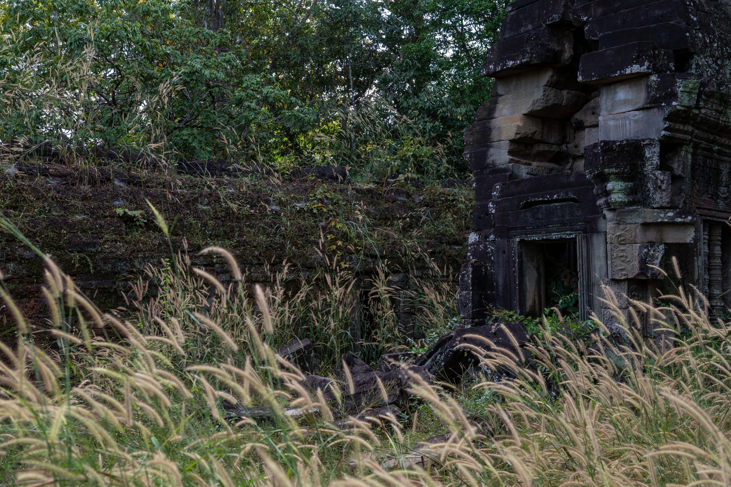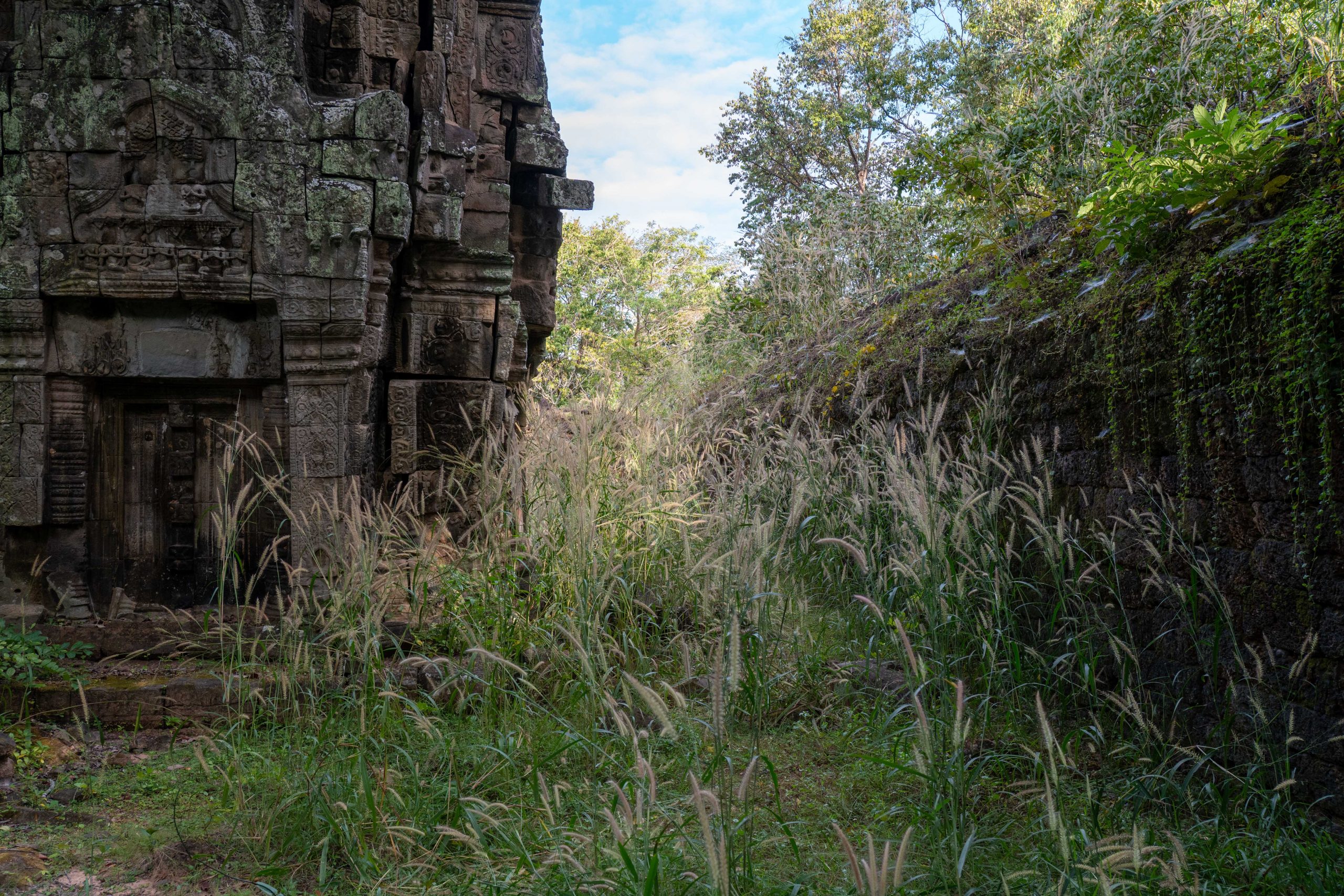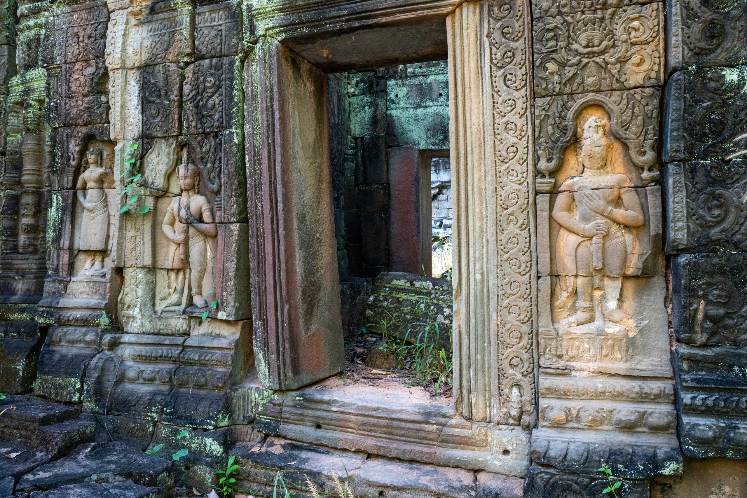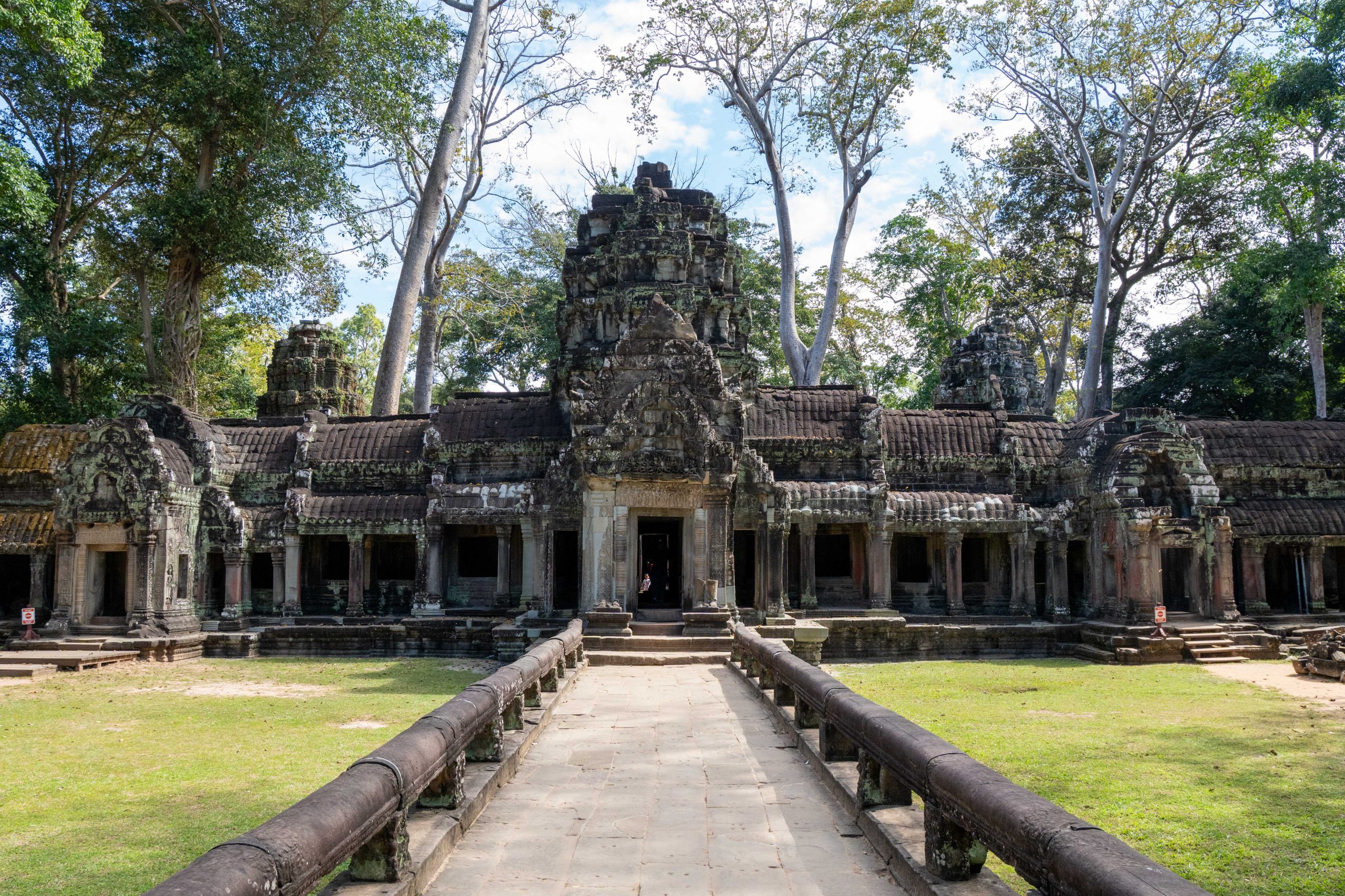 Zum Schluss besuchte ich noch den Banteay Thom Tempel. Der liegt tief im Wald und ist nur über einen zerfurchten Feldweg zu erreichen, der durch einige Dörfer und den Dschungel führt. Kein Mensch war dort, weder Besucher noch Tempelwächter. Die Anreise ist einfach zu beschwerlich. Für mich war es ein besonderes Erlebnis, denn ich konnte den Tempel ganz allein erkunden. Bäume und hohes Gras hatten das Bauwerk schon halb verschlungen.