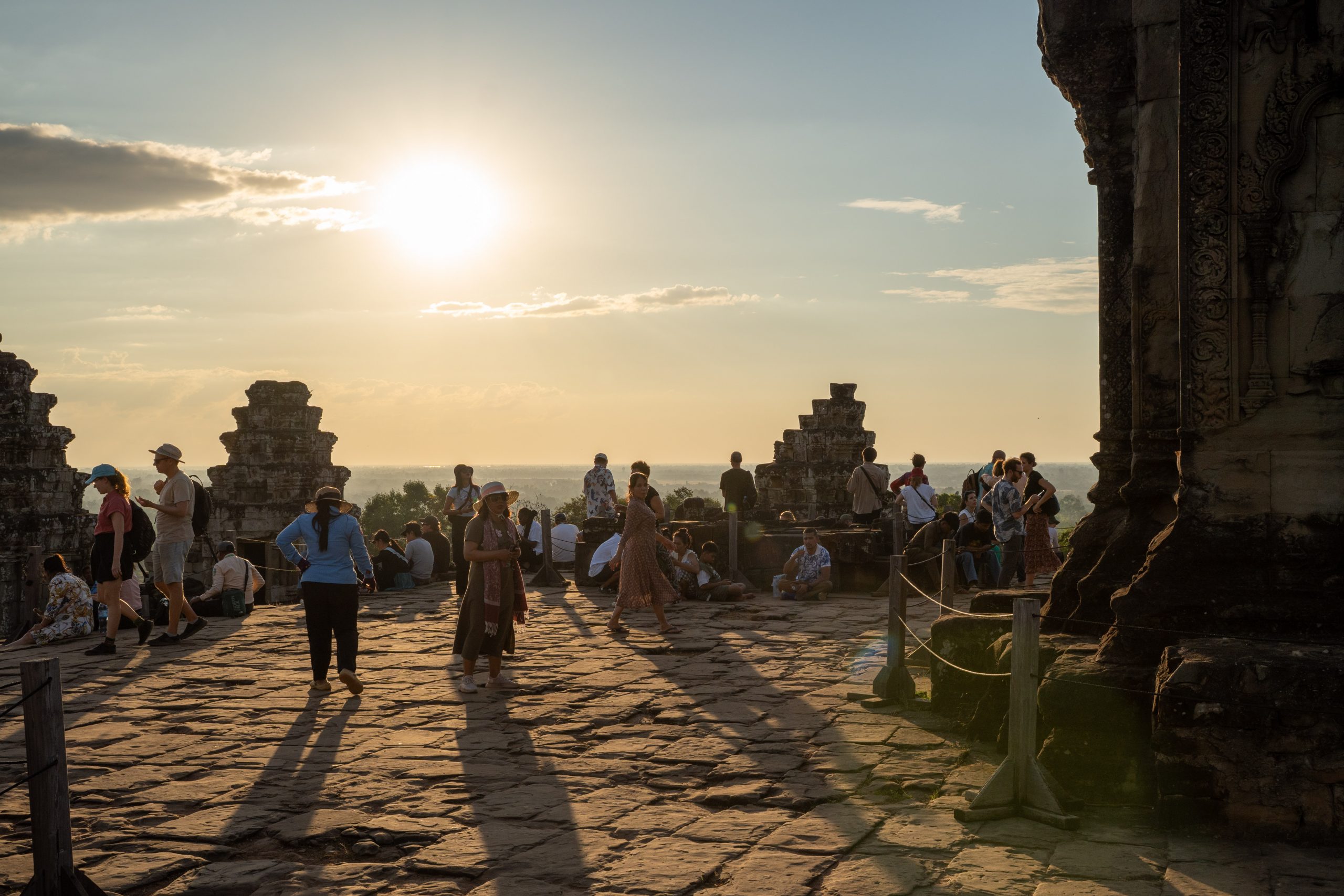Zum Sonnenuntergang ließ ich mich dann von den Massen mitreißen und kletterte, so wie dutzende andere Menschen, auf den Phnom Bakheng. Es ist der wohl bekannteste Sunset Point in Siem Reap. Doch es waren so viele Menschen versammelt, dass ich nach drei Minuten umkehrte und mir das goldene Abendlicht stattdessen in einem einsamen Reisfeld ansah. Zurück ging es bei Dämmerung durch kleine Dörfer Richtung Siem Reap. Es war ein wundervoller erster Tag. Mich begeisterten nicht nur die Tempel, sondern auch die schönen Begegnungen mit den Menschen.