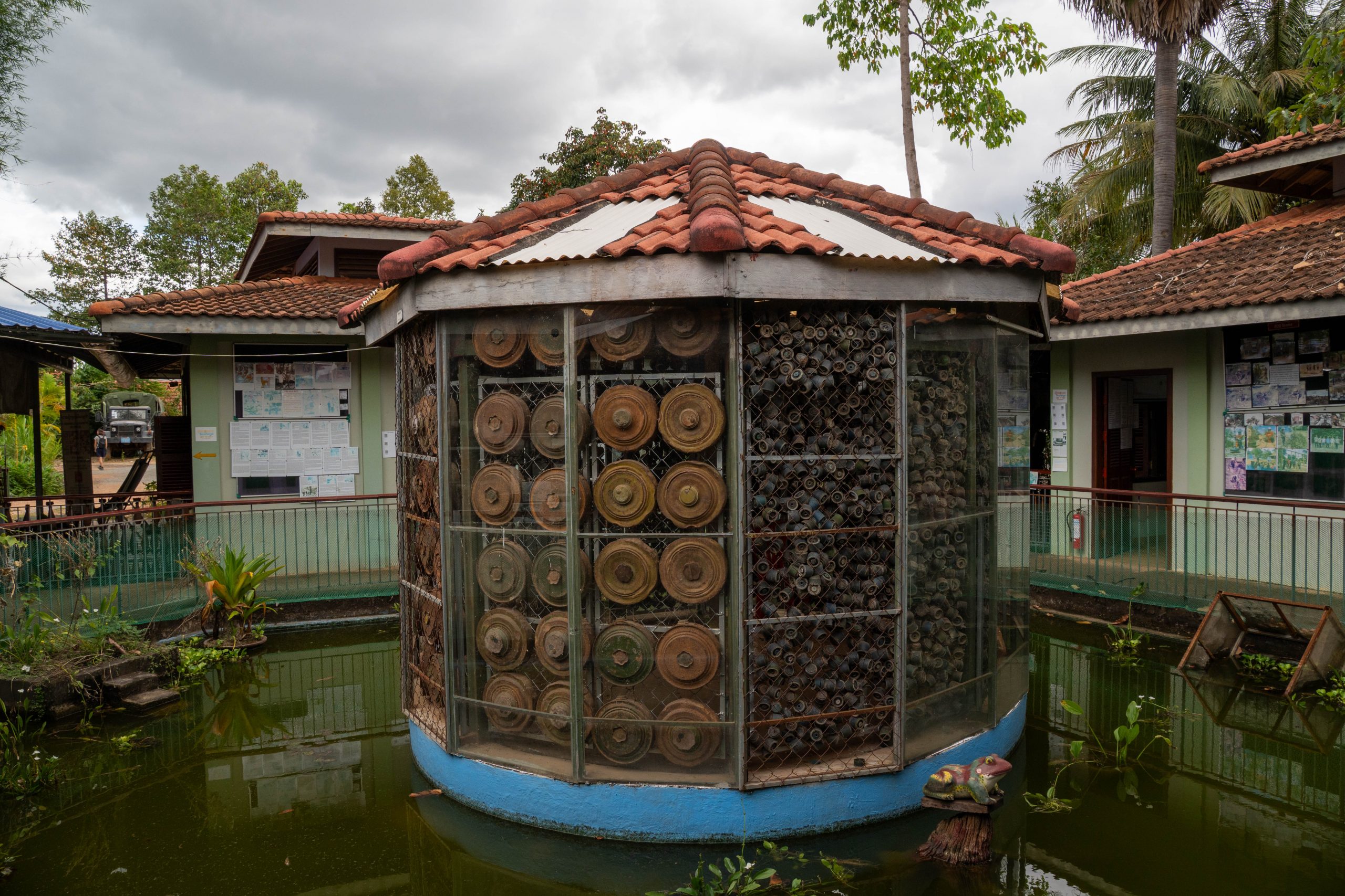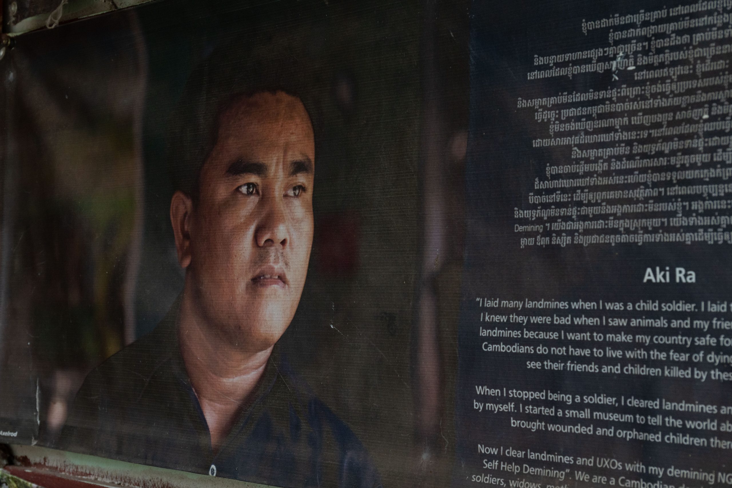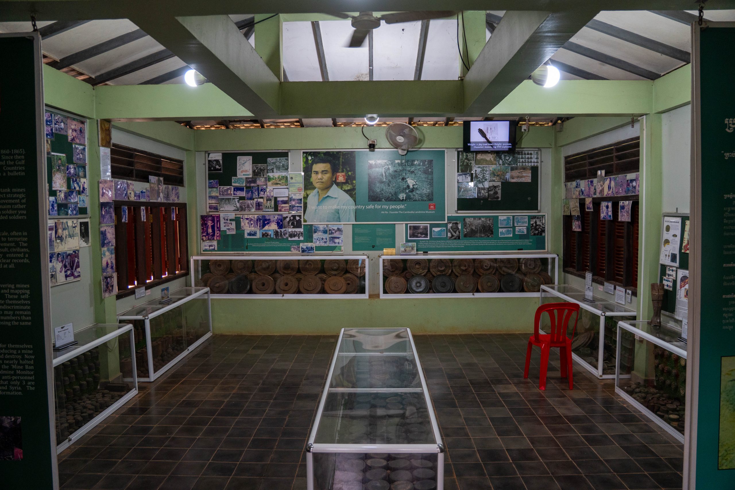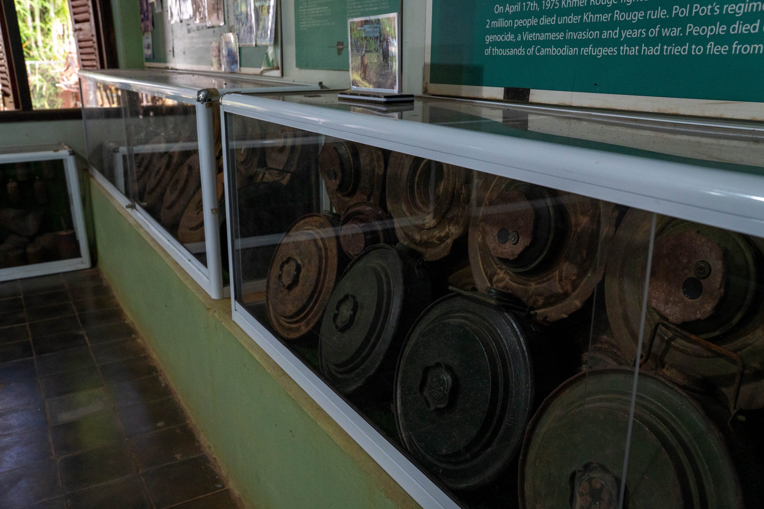 Das Landminenmuseum wurde von Aki Ra errichtet. Seine Geschichte verdeutlicht den Schrecken von damals. Er ist circa 1970 geboren, aber ganz genau weiß er es nicht. Als er noch ein Kind war, kamen in Kambodscha die Roten Khmer an die Macht. Khmer, so heißt die größte Bevölkerungsgruppe des Landes. Rot, denn die Rebellen wollten einen kommunistischen Bauernstaat errichten und erklärten Intellektuelle, Stadtbewohner, Brillenträger, Weitgereiste und Menschen mit weichen Händen zum Feindbild. Jeder, der nicht dem Ideal eines bildungslosen und folgsamen Bauern entsprach, war verdächtig. In grausamen Vernichtungslagern wurden zwischen 1975 und 1979 fast zwei Millionen Menschen getötet, rund ein Viertel der Bevölkerung. So auch die Eltern von Aki Ra. Er selbst wurde in ein Camp der Rebellen verschleppt, die ihn zwangen, an den Landesgrenzen Minen zu vergraben. Die Roten Khmer kämpften gegen die vietnamesische Armee. Tatsächlich wurde Aki Ra wenig später vom Gegner gefangen genommen, jedoch nicht umgebracht, da er immer noch sehr jung war. Aber auch die Vietnamesen zwangen ihn, Minen zu vergraben. Im Alter zwischen 10 und 20 Jahren schlug er sich durch den dichten Dschungel und verlegte tausende Sprengfallen. Heute ist er eine wichtige Figur in der Minenräumung des Landes. Denn 1991 wechselte er die Seiten und begann, die Minen wieder auszugraben. Anfangs unbezahlt und im kleinen Stil, doch inzwischen leitet er eine NGO, die großflächig betroffene Gebiete bereinigt. Noch heute liegen nach seiner Schätzung rund sechs Millionen Landminen in Kambodscha. Immer noch werden Menschen Opfer der grausamen Sprengfallen. Das Museum erzählt Aki Ras Geschichte. Und ich traf ihn sogar selbst. Aufgrund einer Erkrankung hat er seine Einsätze bis Anfang 2026 unterbrochen. Sehr lange unterhielt ich mich mit ihm. Aki Ra ist ein Mann, der sein Schicksal akzeptiert hat. Ich glaube, dass ein solcher Horror in jedem Menschen tiefe Spuren hinterlässt. Er schreibt in einem Buch, dass er auch heute noch unter Albträumen leidet. Als Kind gehorchte er den Zwängen der Mörder seiner Eltern. Irgendwann glaubte er die Propaganda der Roten Khmer sogar selbst. Minen wurden seine Freunde, so sagt er. Aki Ra benutzte sie auch zum Fischen oder Jagen. Doch er beobachtete ebenfalls, wie unschuldige Dorfbewohner den Tod erlitten. Diese Begegnungen lösten in ihm Schuldgefühle aus, die schließlich zur Motivation seiner heutigen Arbeit wurden. Die ersten Minen grub er einfach mit dem Taschenmesser und Stöcken aus. Dabei kam ihm die Ortskenntnis zugute. Er wusste genau, wo er die Minen finden würde. Er sammelte sie und verbrannte sie jeden Abend im Lagerfeuer, so sagte er mir. Die Regierung stoppte ihn im Jahr 2007 und forderte, dass er Sicherheitsstandards umsetzt. Das tut er nun, wenngleich er feststellt, dass er jetzt sehr viel langsamer vorankommt. Die größte Angst in seinem Leben, so sagte er mir im Gespräch, verspürt er bei der Bearbeitung all der Dokumente, die er täglich ausfüllen muss. Als ich ihn traf, saß er am Laptop, übte Lesen und Schreiben.
