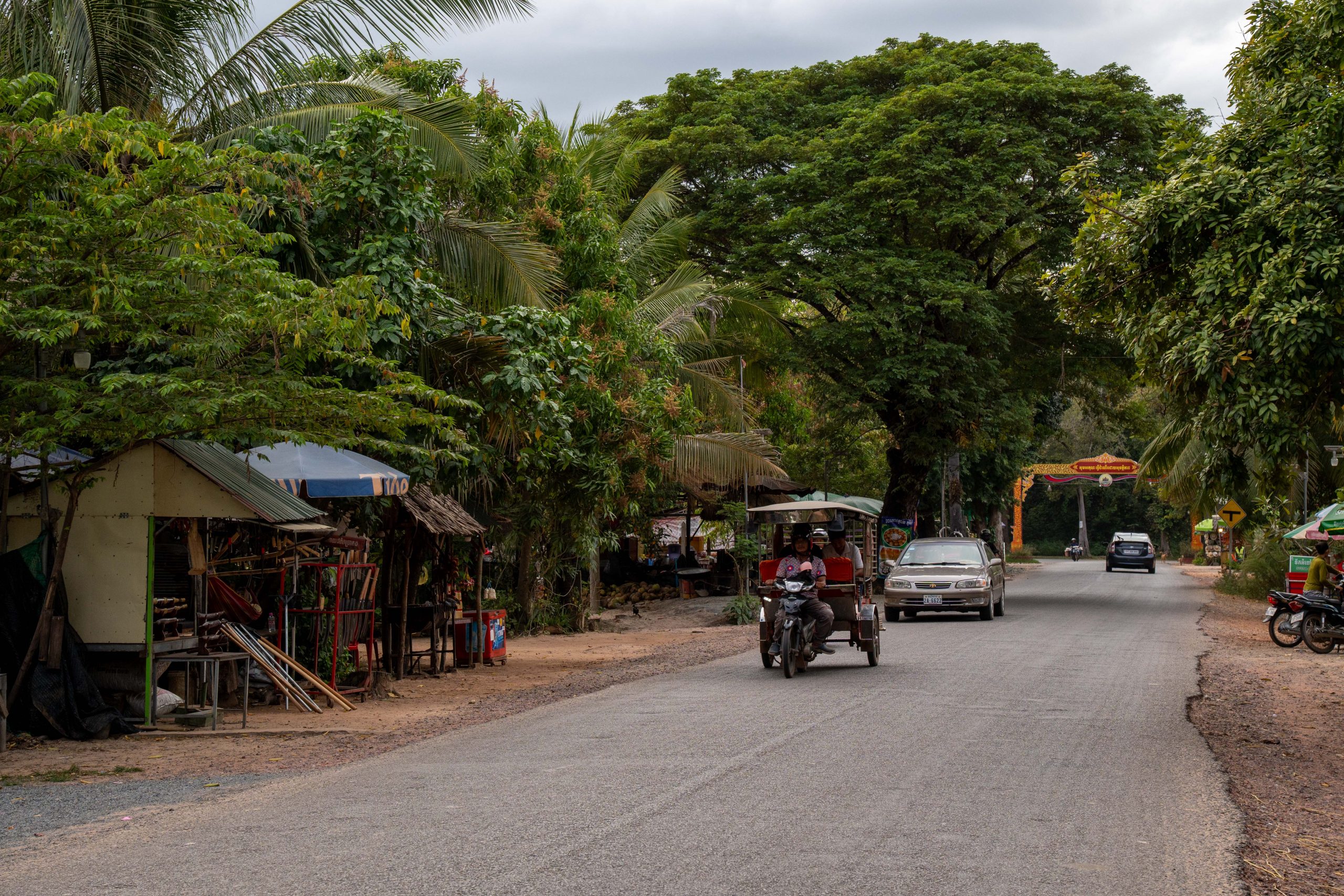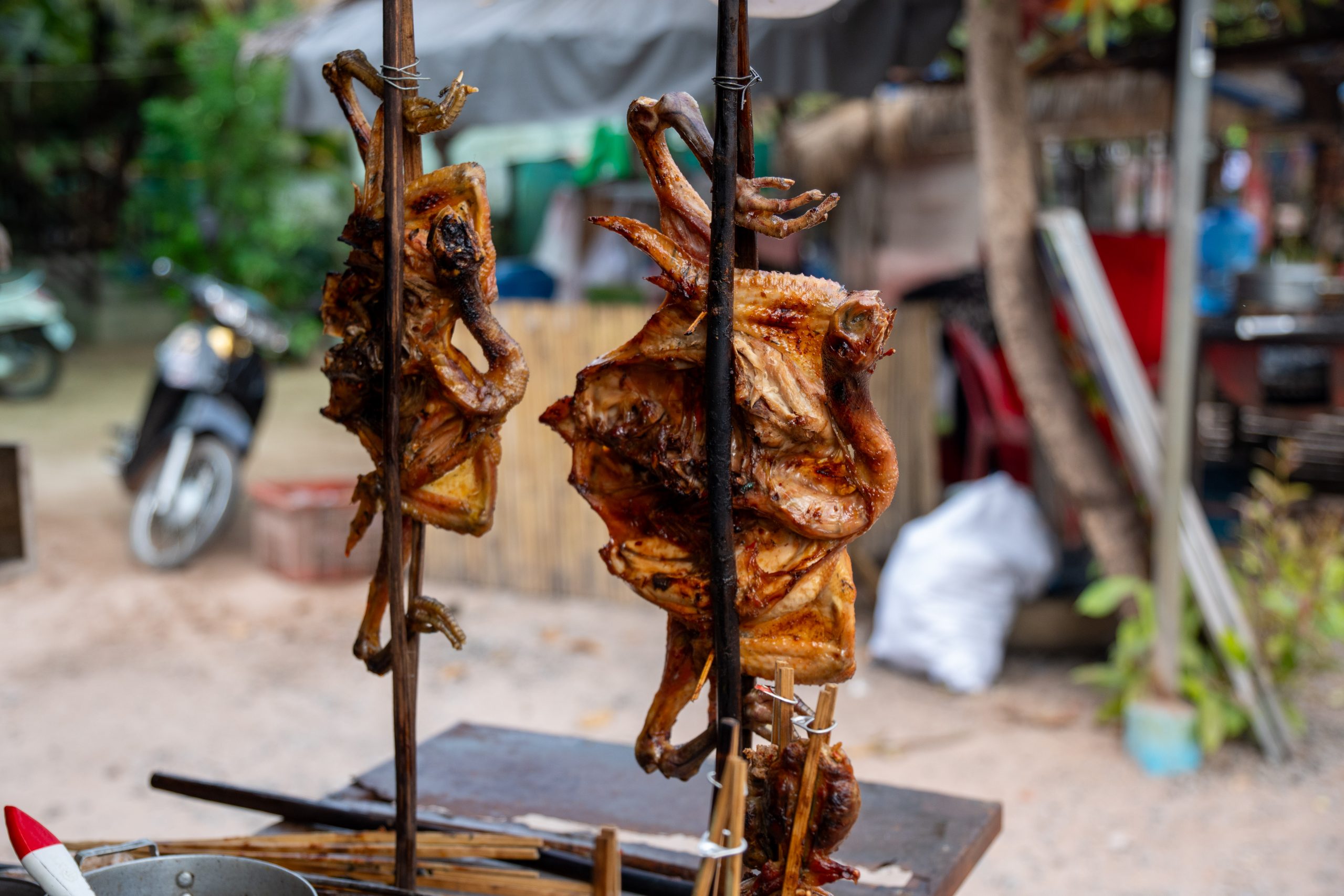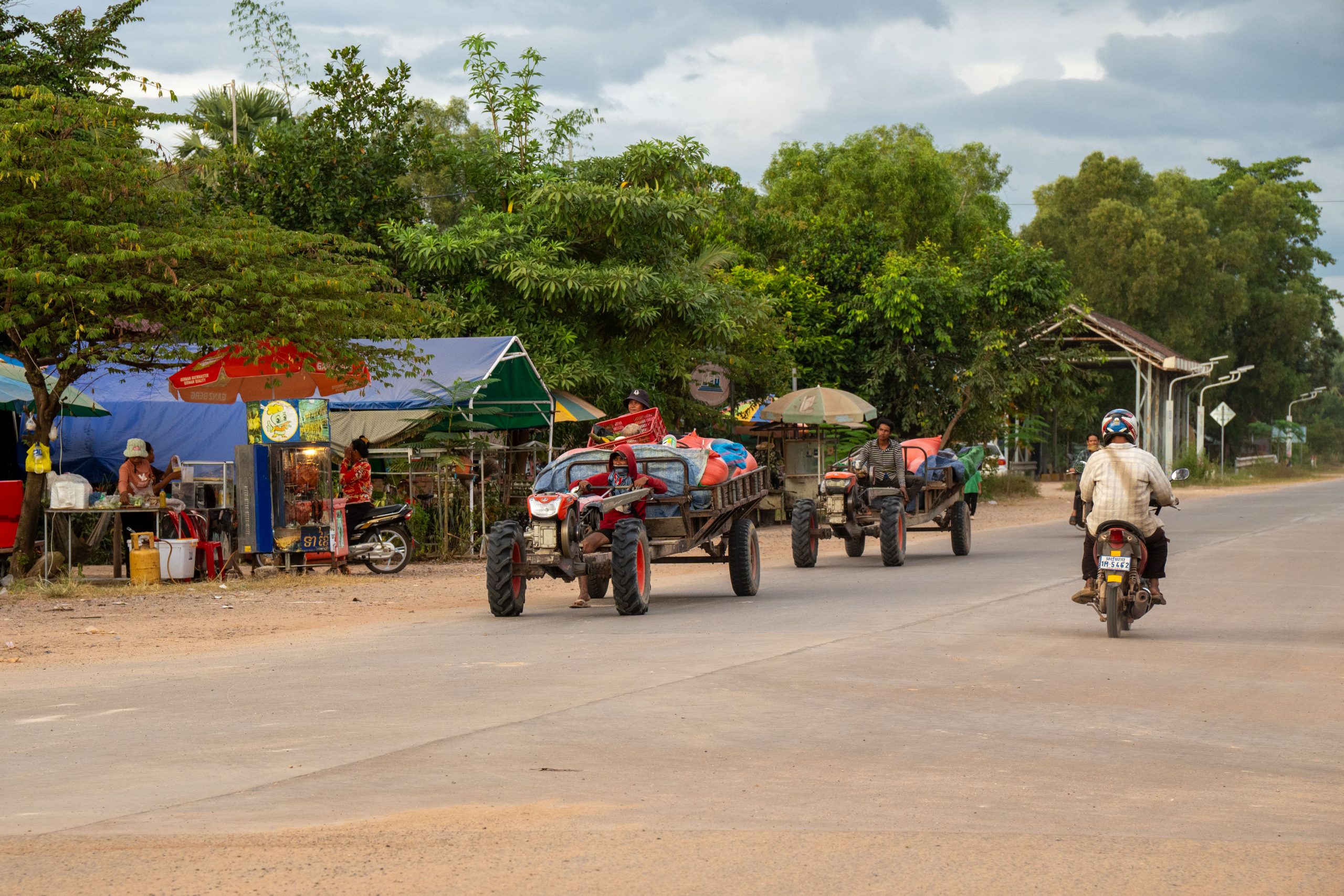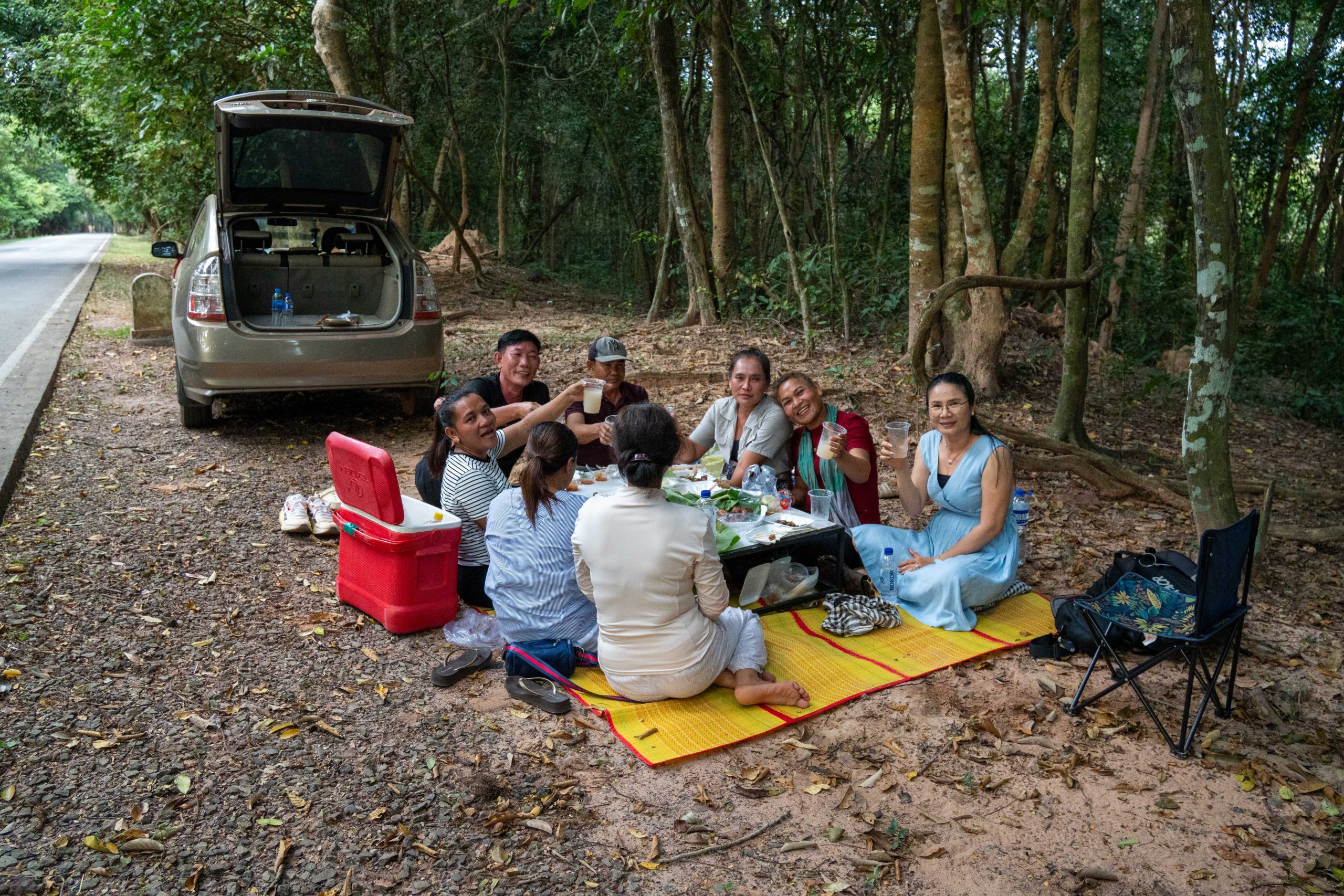 Auf dem Rückweg fuhr ich durch viele kleine Dörfer. Am Straßenrand lagen Schweine, Hühner, Frösche und Fische auf großen Grills. Warum, das erfuhr ich gleich: Ich lernte die kambodschanische Picknick-Kultur kennen. Als ich mit dem Roller durch den Wald fuhr, sah ich eine kleine Gruppe von Menschen. Sie saßen am Straßenrand vor einem gedeckten Tisch. Ich lächelte. Sie lächelten und winkten. Ich hielt an und wurde mit lautem Gelächter begrüßt. Ich setzte mich an den Tisch. Bisher hatten wir nicht gesprochen, nur Blicke ausgetauscht. Nun sprach mich eine Frau auf Englisch an. Sie freue sich über meinen Besuch und ich müsse von ihrem Picknick probieren. Obwohl sie die Einzige war, die Englisch sprach, waren nun alle um meine Versorgung bemüht. Vor mir stapelten sich plötzlich gegrillte Schweinestücke, Fische, Reis, Erdnüsse, Palmwein und Saft. Ich genoss die Mahlzeit und sprach mit der Frau, die für die Gruppe übersetzte. Es war eine tolle, ausgelassene Runde und ich fühlte mich herzlich willkommen. Nach einer Stunde machte ich mich auf den Weg. Wieder war ich ganz einfach mit freundlichen Menschen in Kontakt gekommen. Das freute mich.